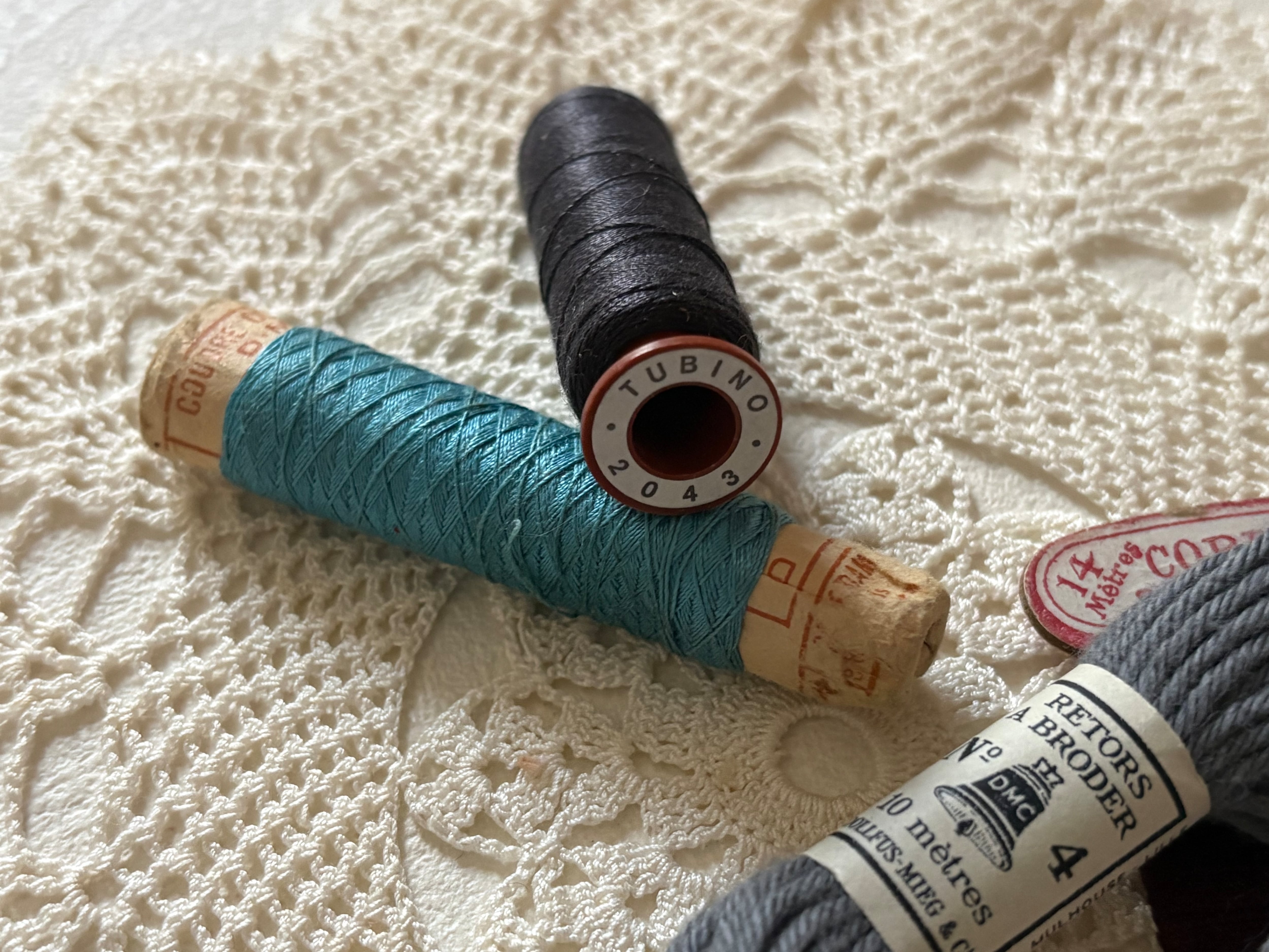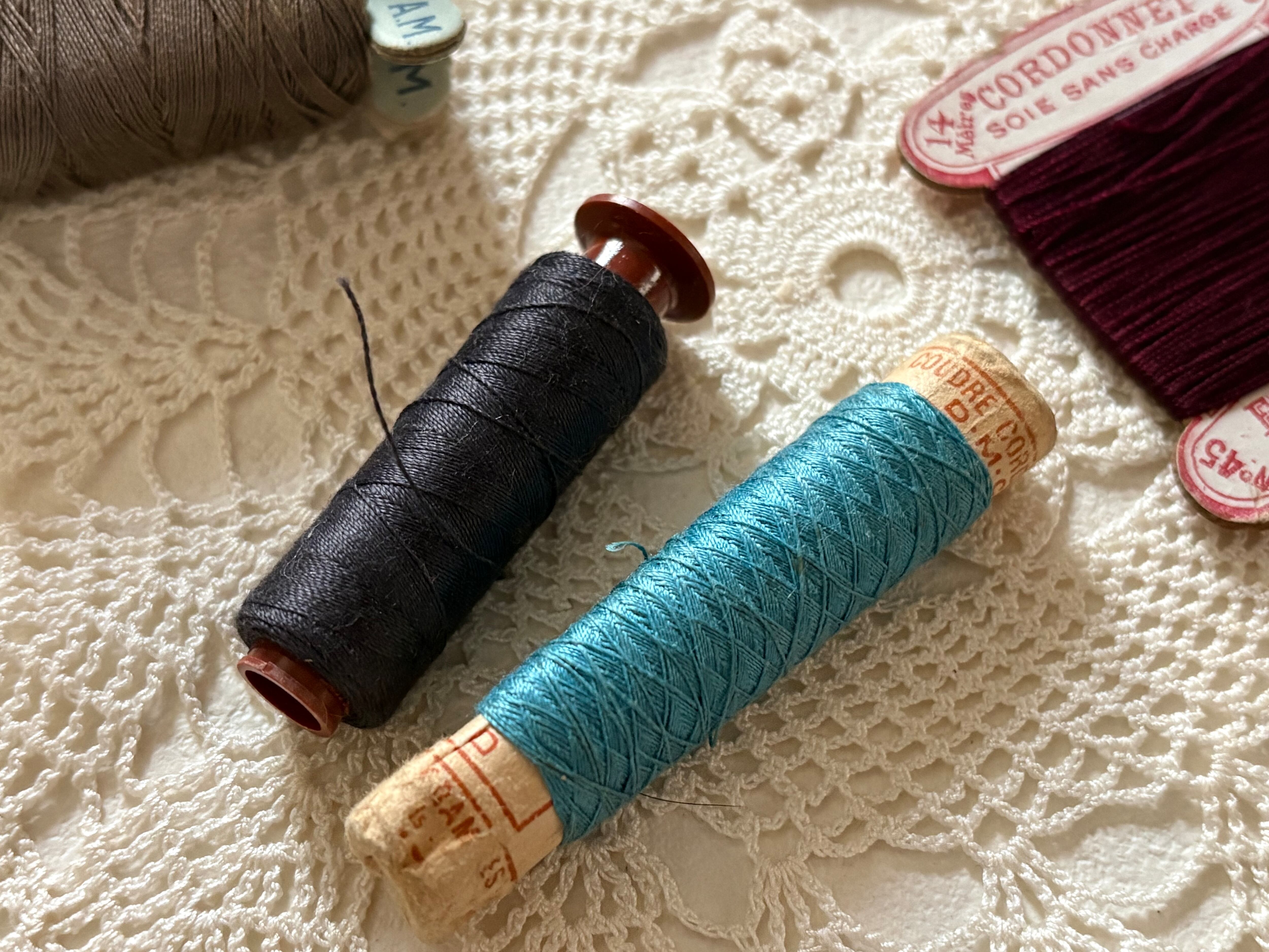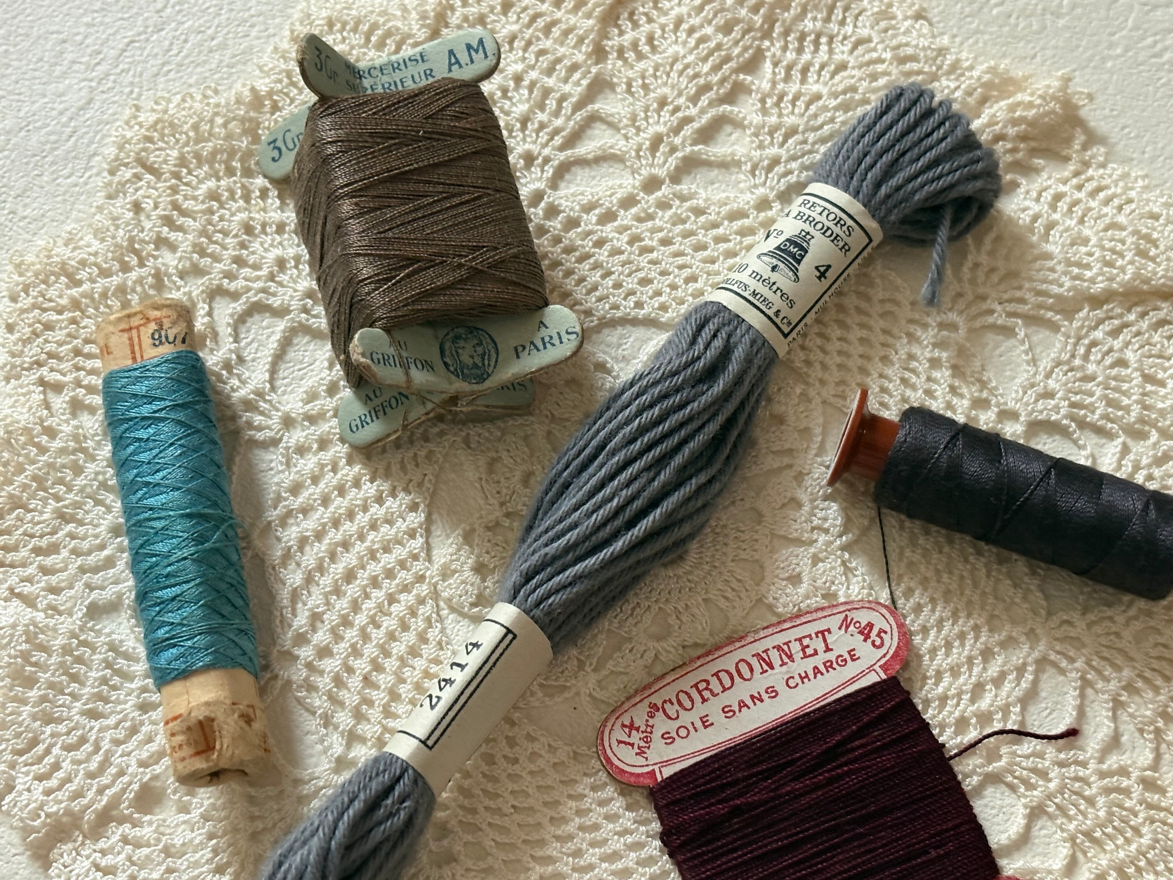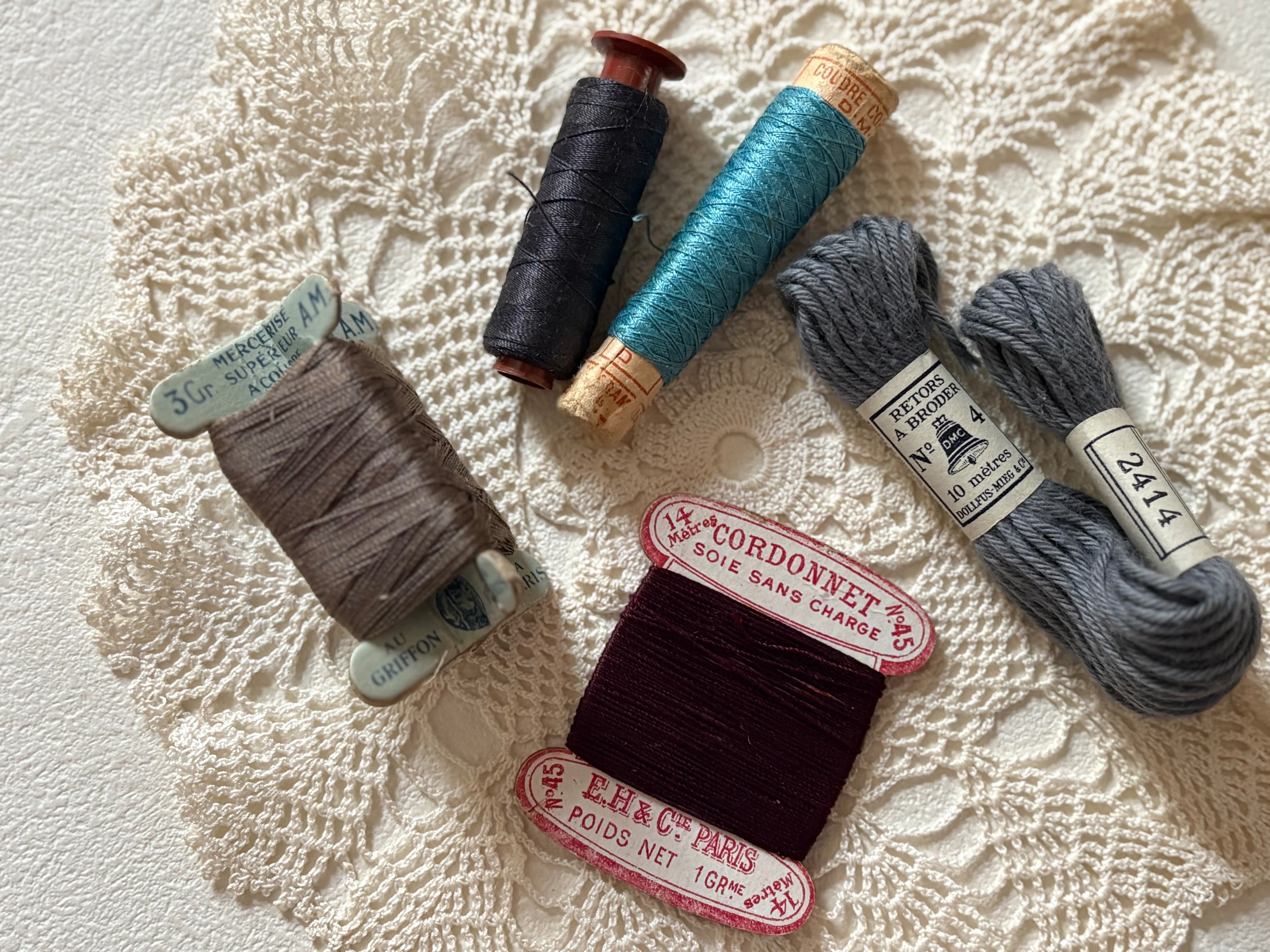 画像にございますアンティーク、ヴィンテージの糸巻きや、刺繍糸など5点のメルスリーセットになります。