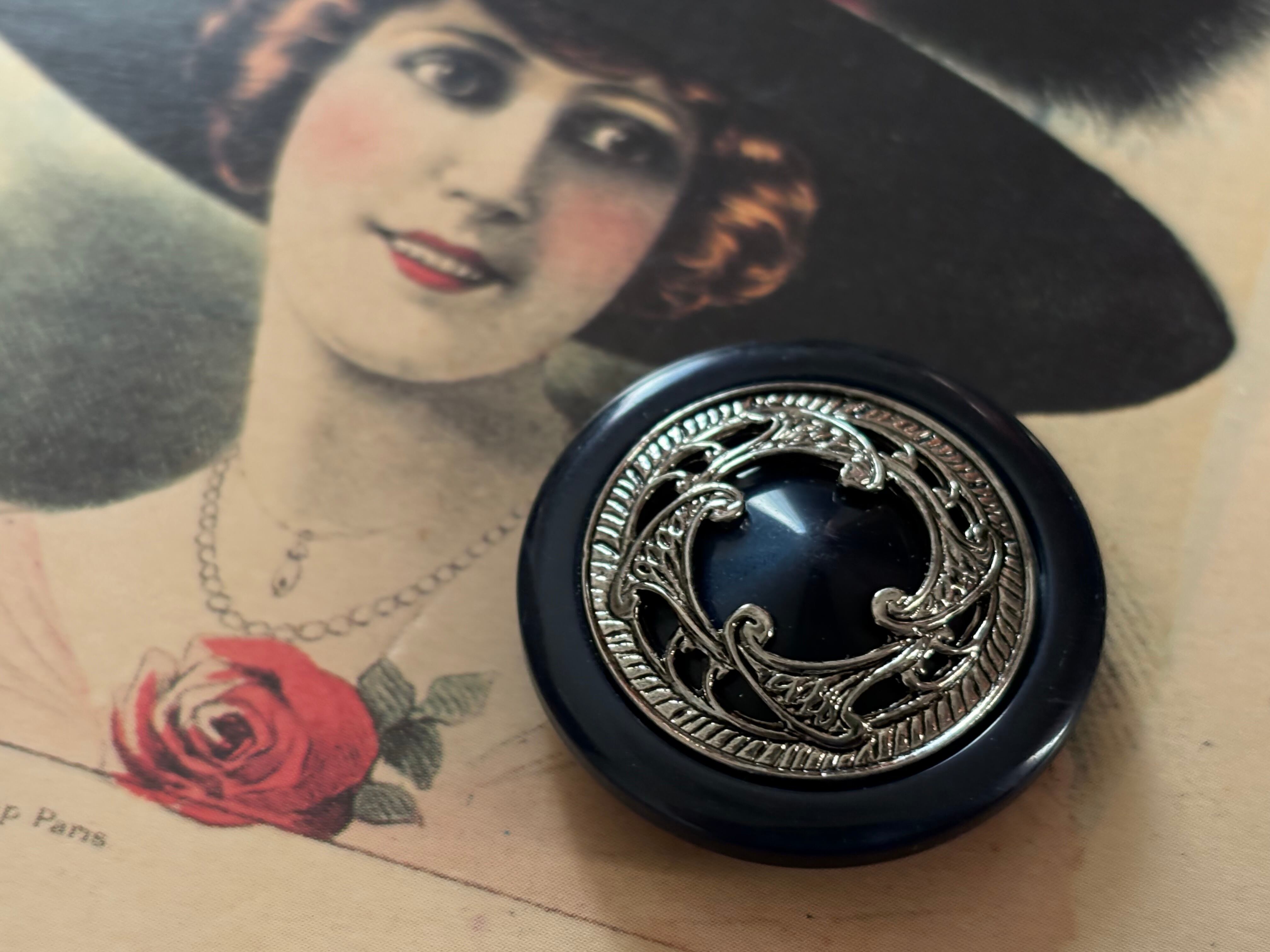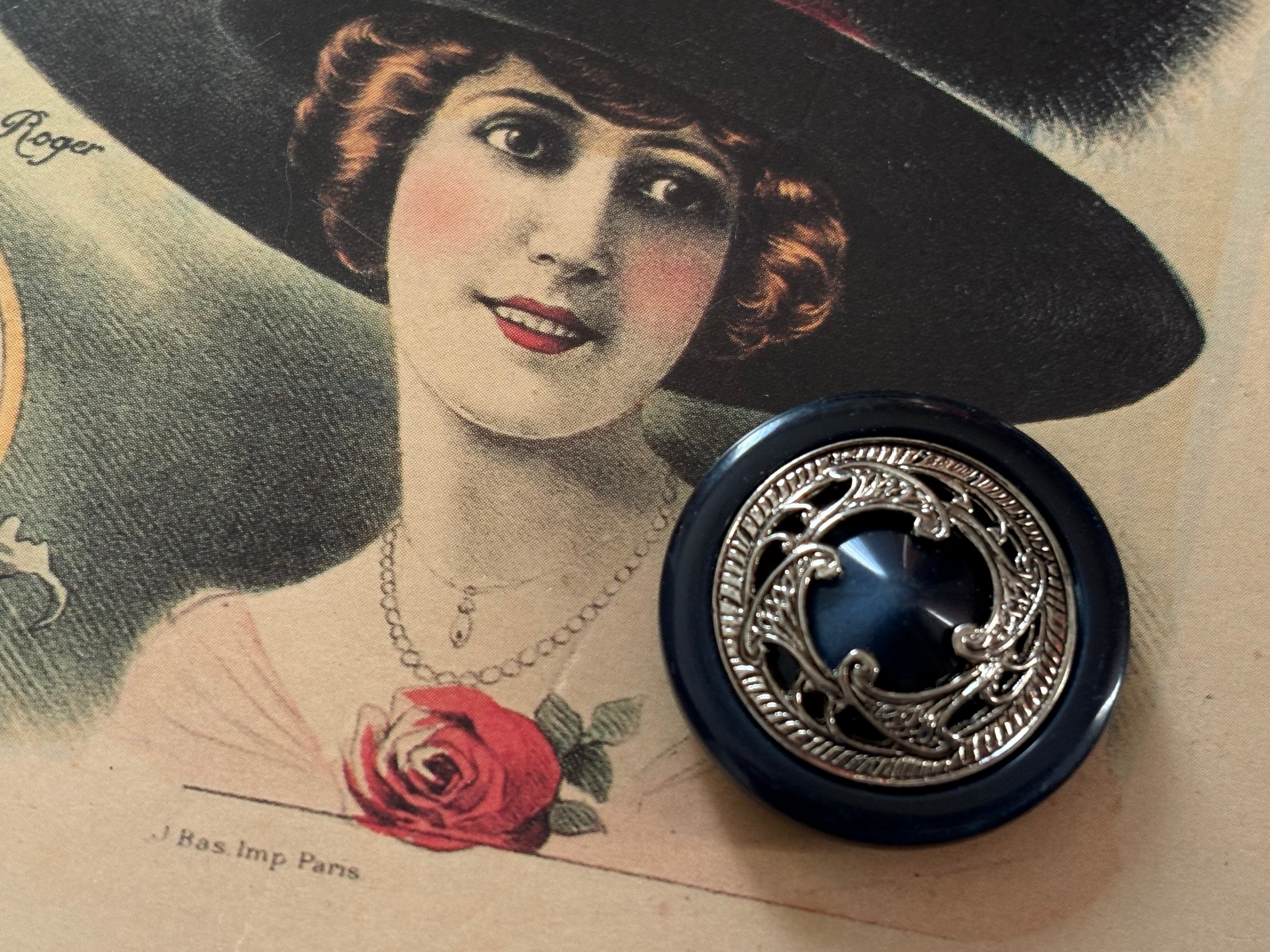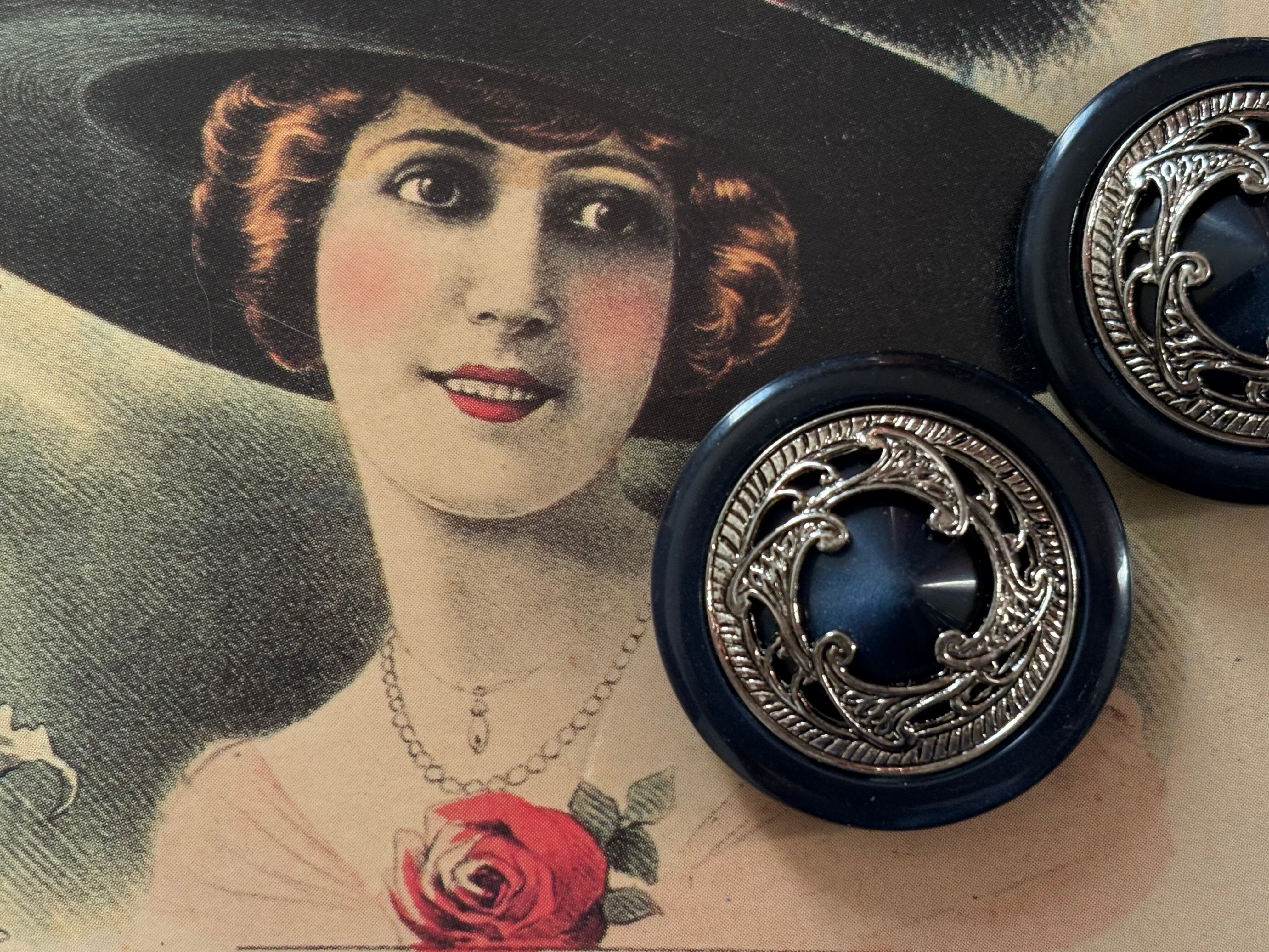 30mm Japanese Vintage ボタン ネイビー×シルバー メダリオン レトロ アクセサリーパーツ カルトナージュ デコレーション