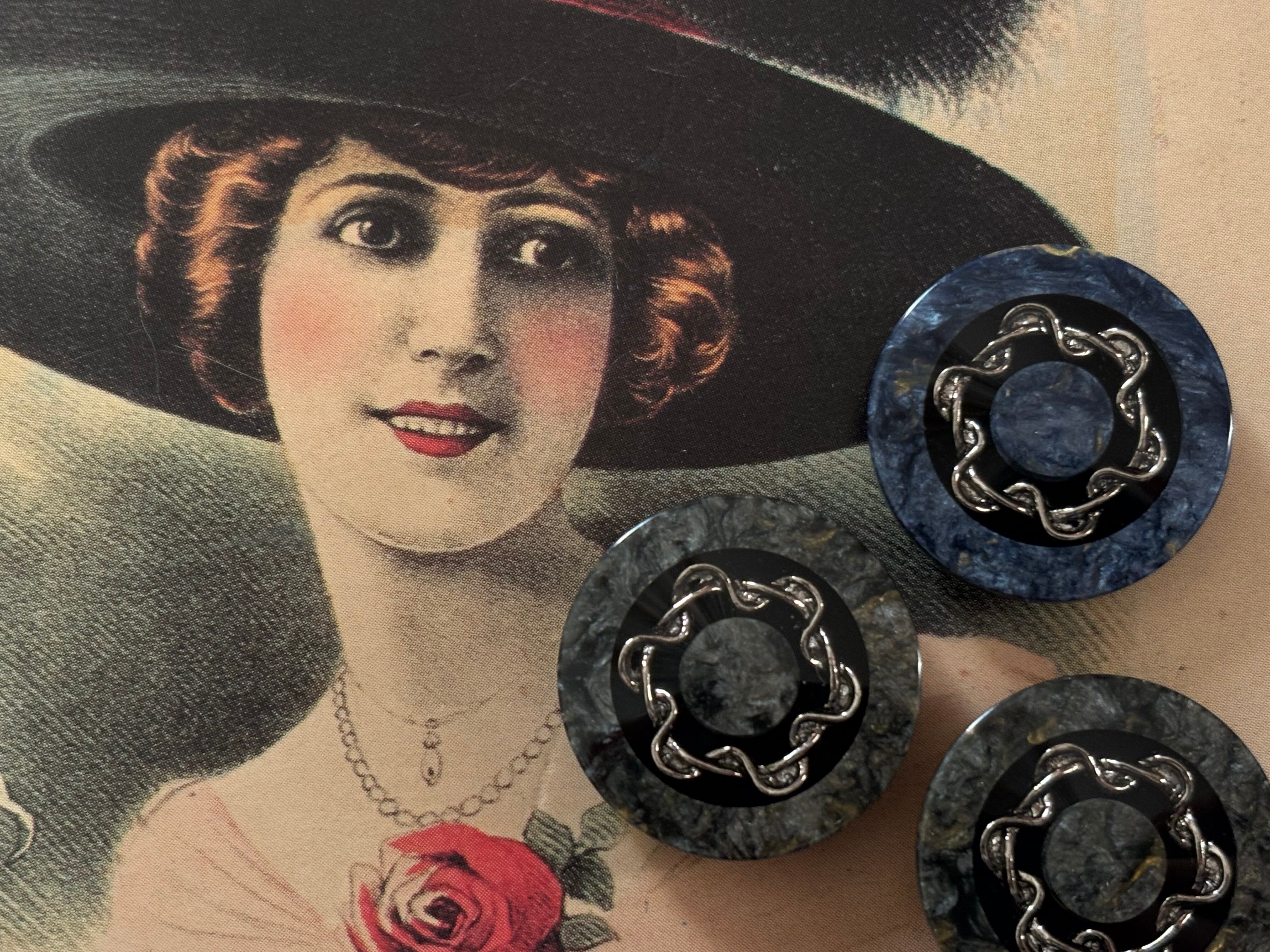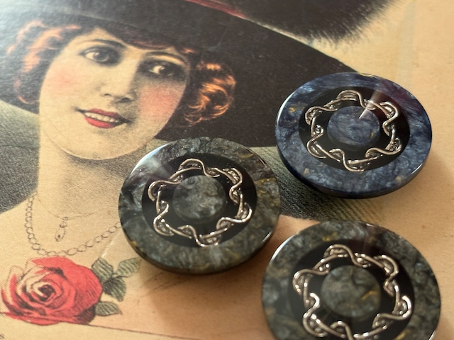 22mm Japanese ヴィンテージボタン マーブル調 ブルー/グレー×シルバー アクセサリーパーツ 装飾材