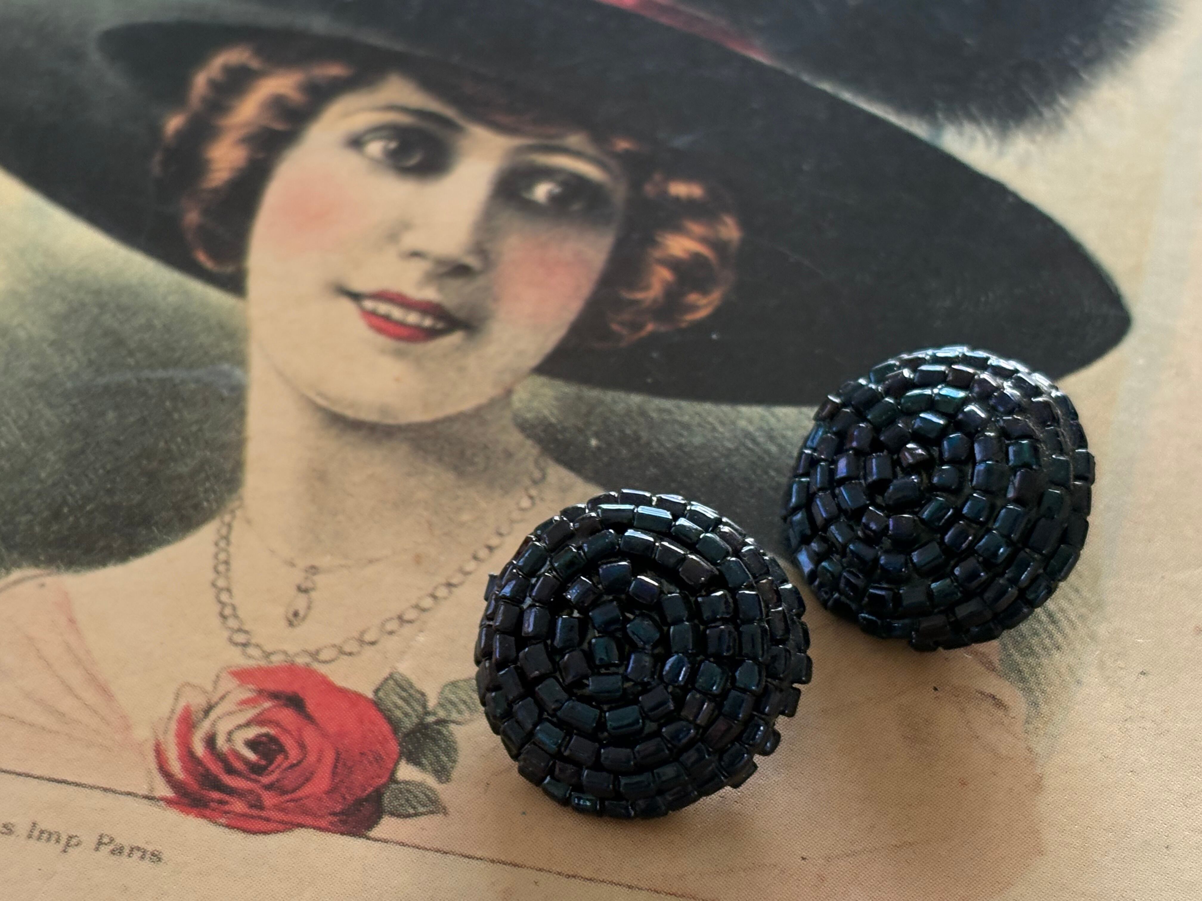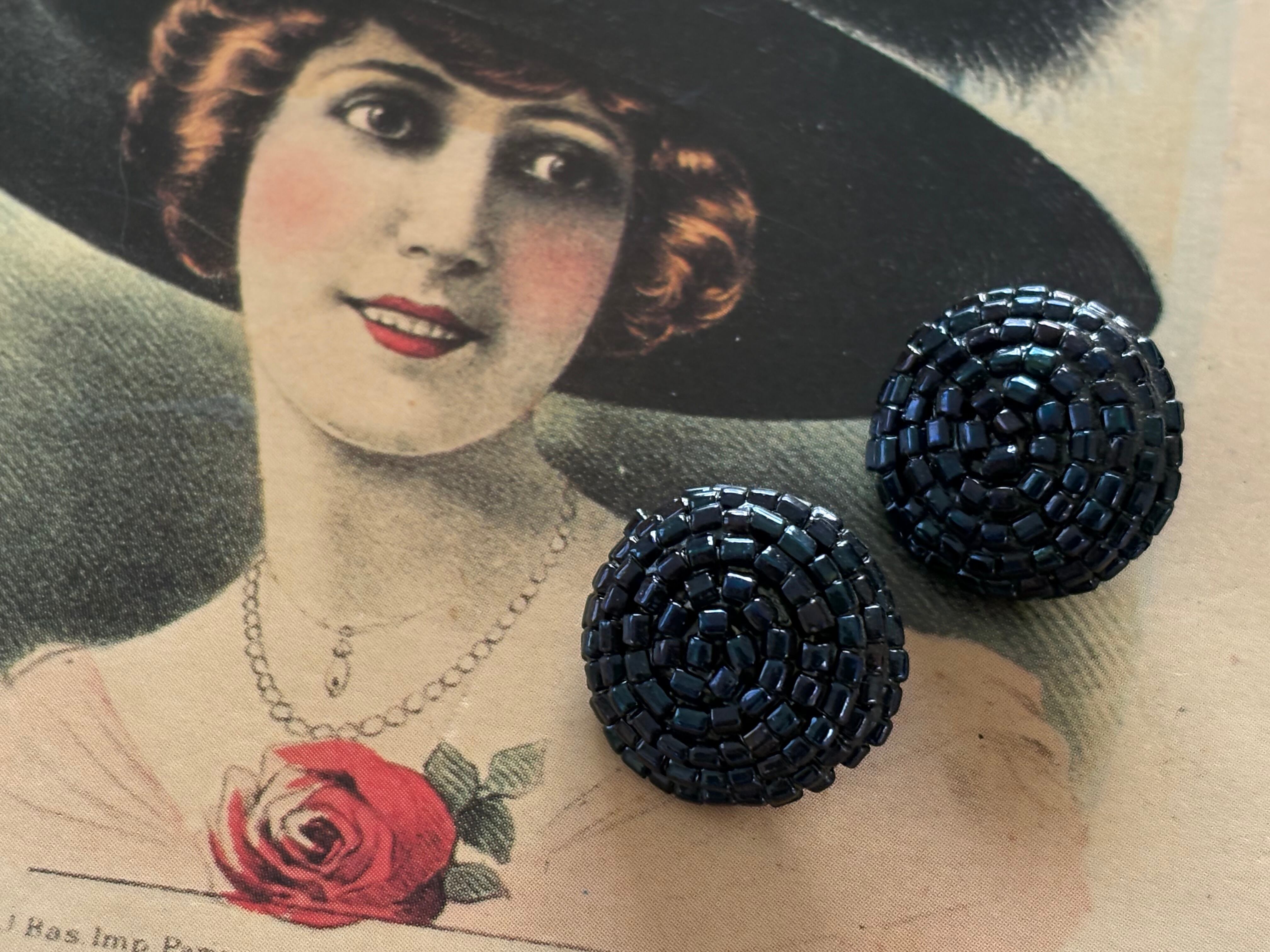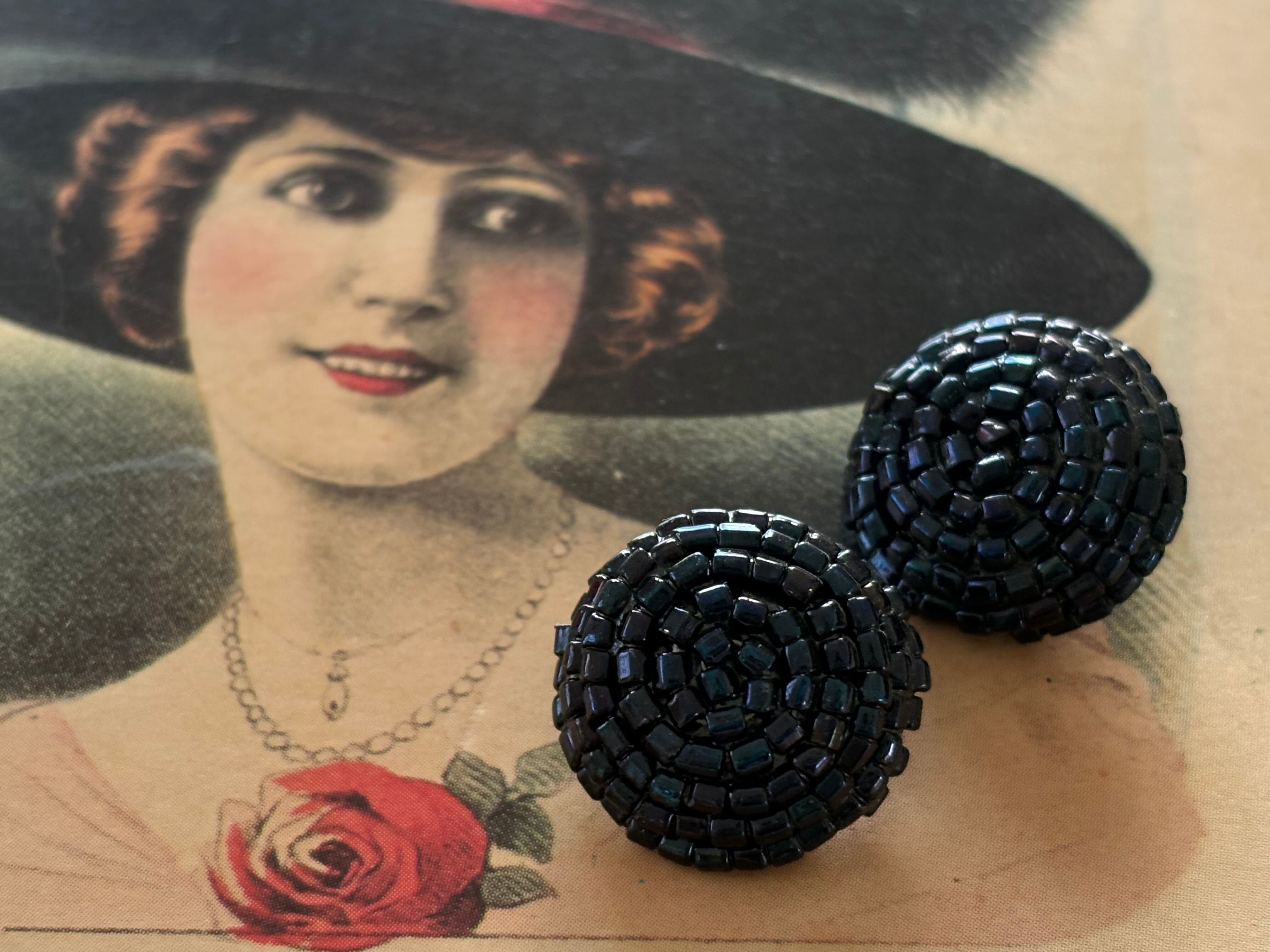 表面全体的にビーズが巻きつけられ固められたドーム型のレトロボタンです。