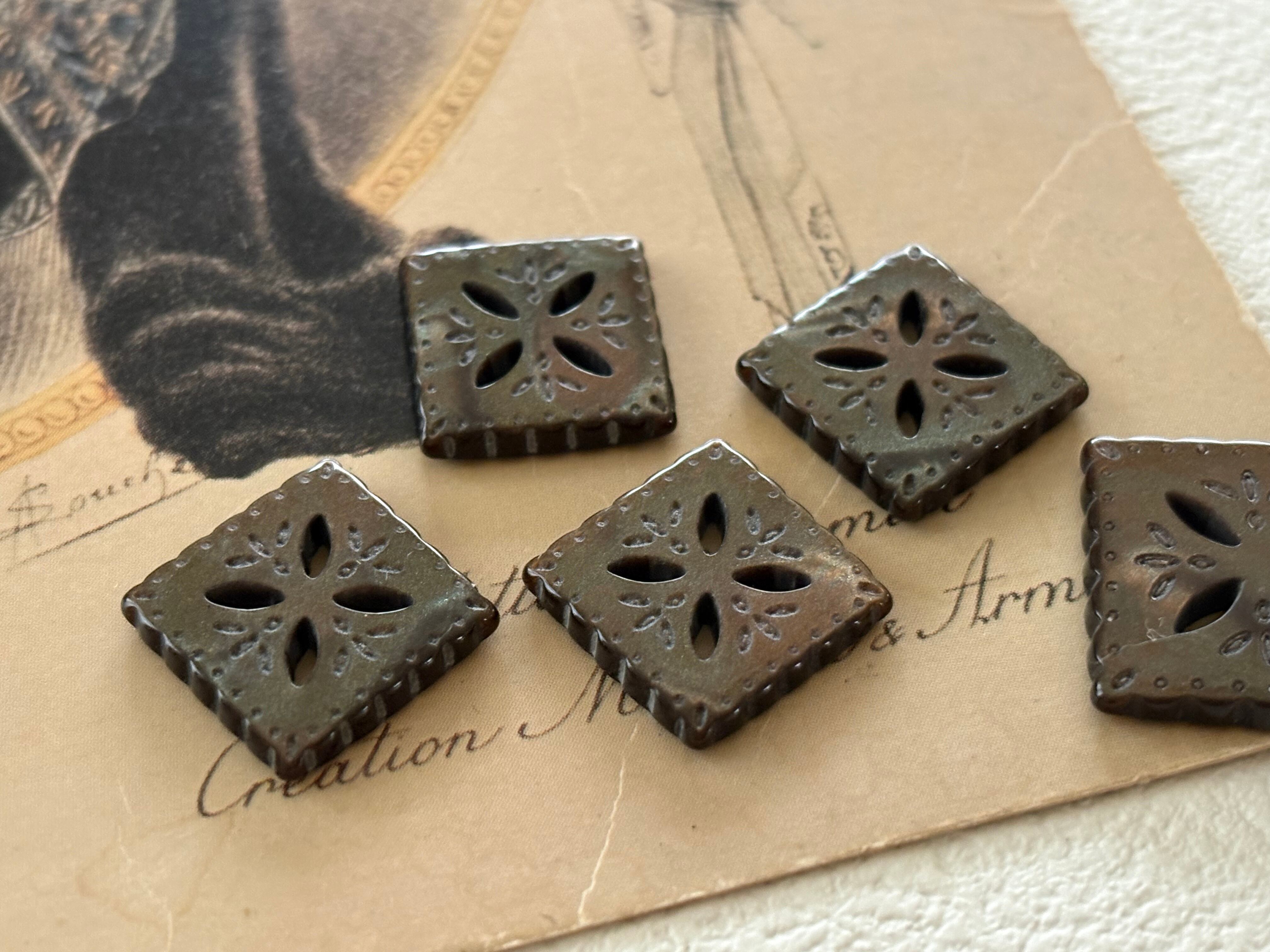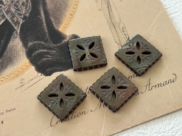 縁がスカラップのデザインになったドイリーのような可愛いスクウェア型のシェルボタンです。