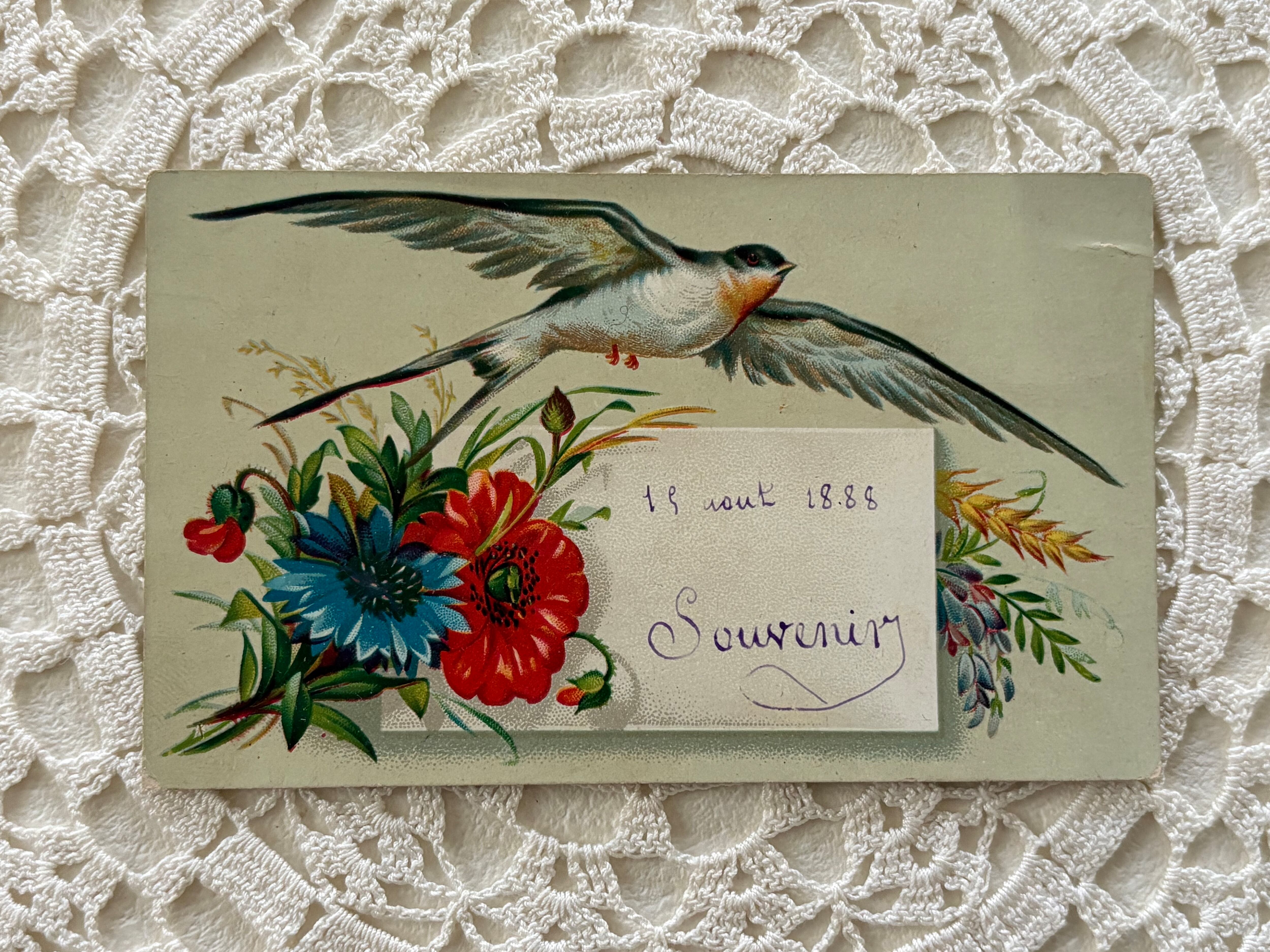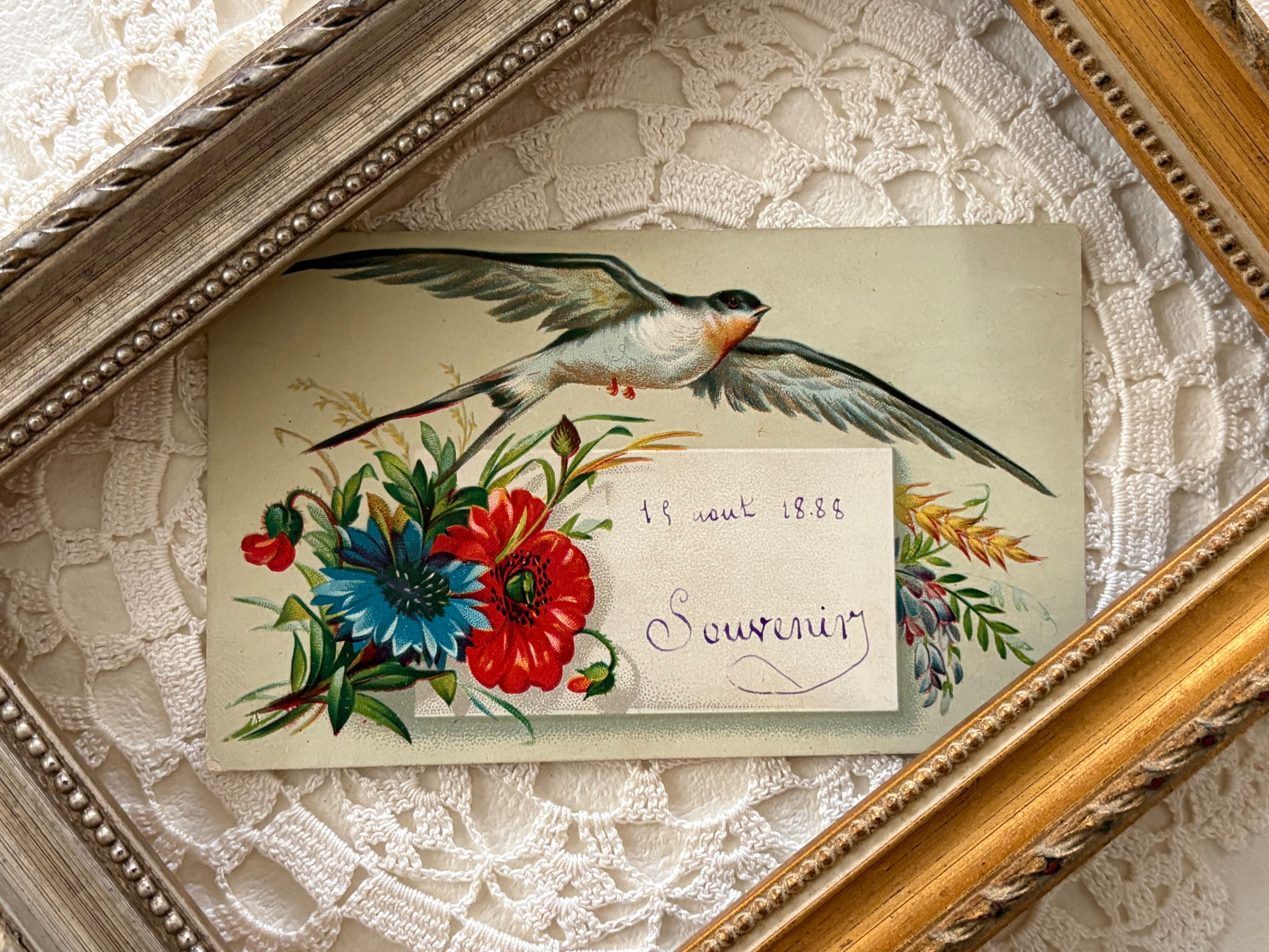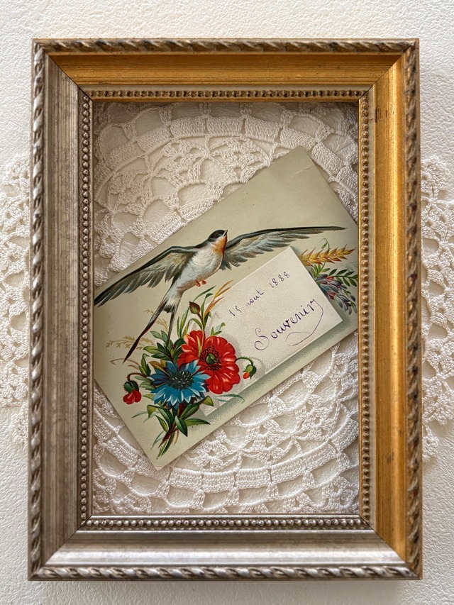 フランス アンティーク 小さなメッセージカード つばめ フラワー 額装 インテリア小物 撮影小物