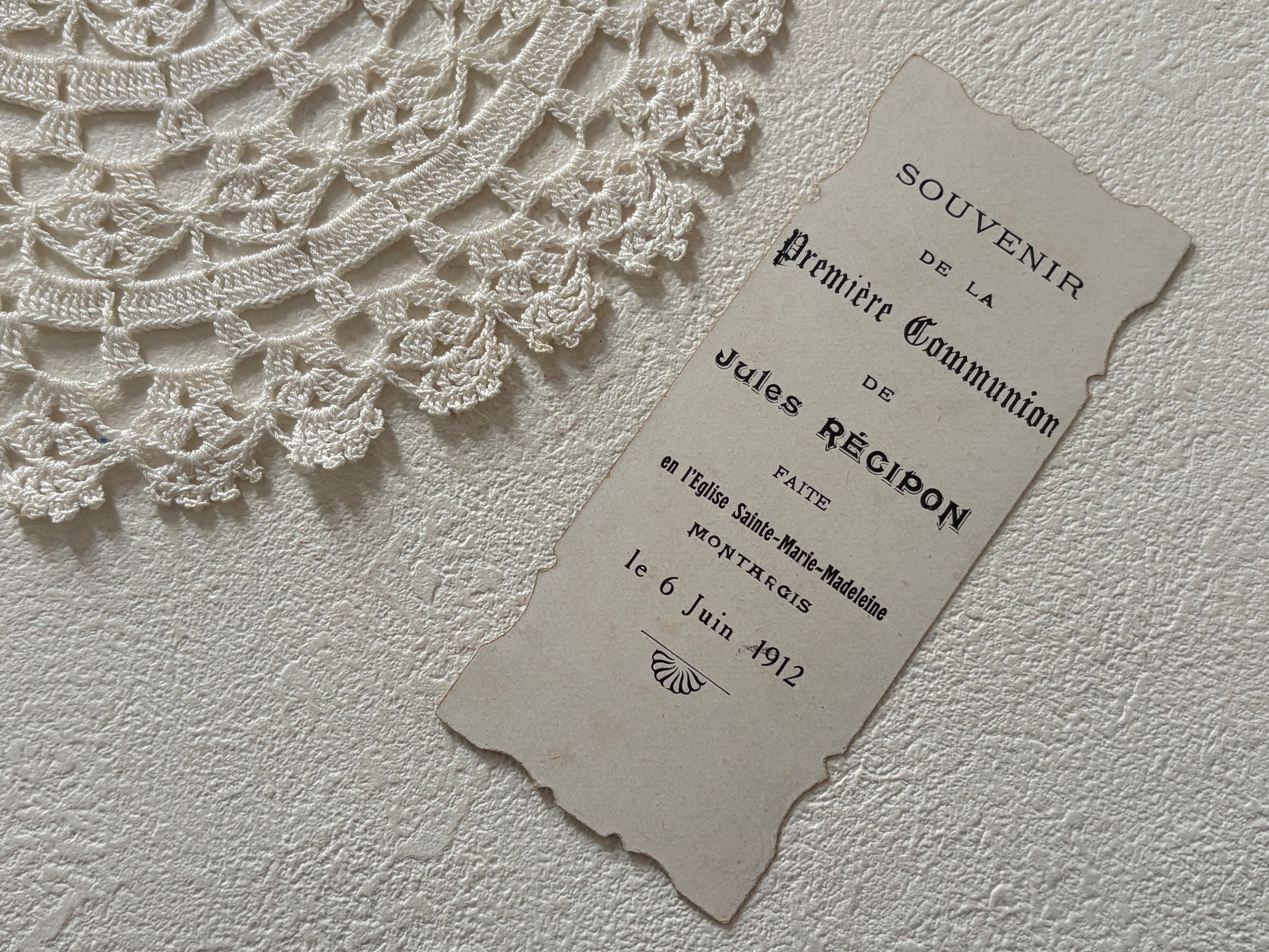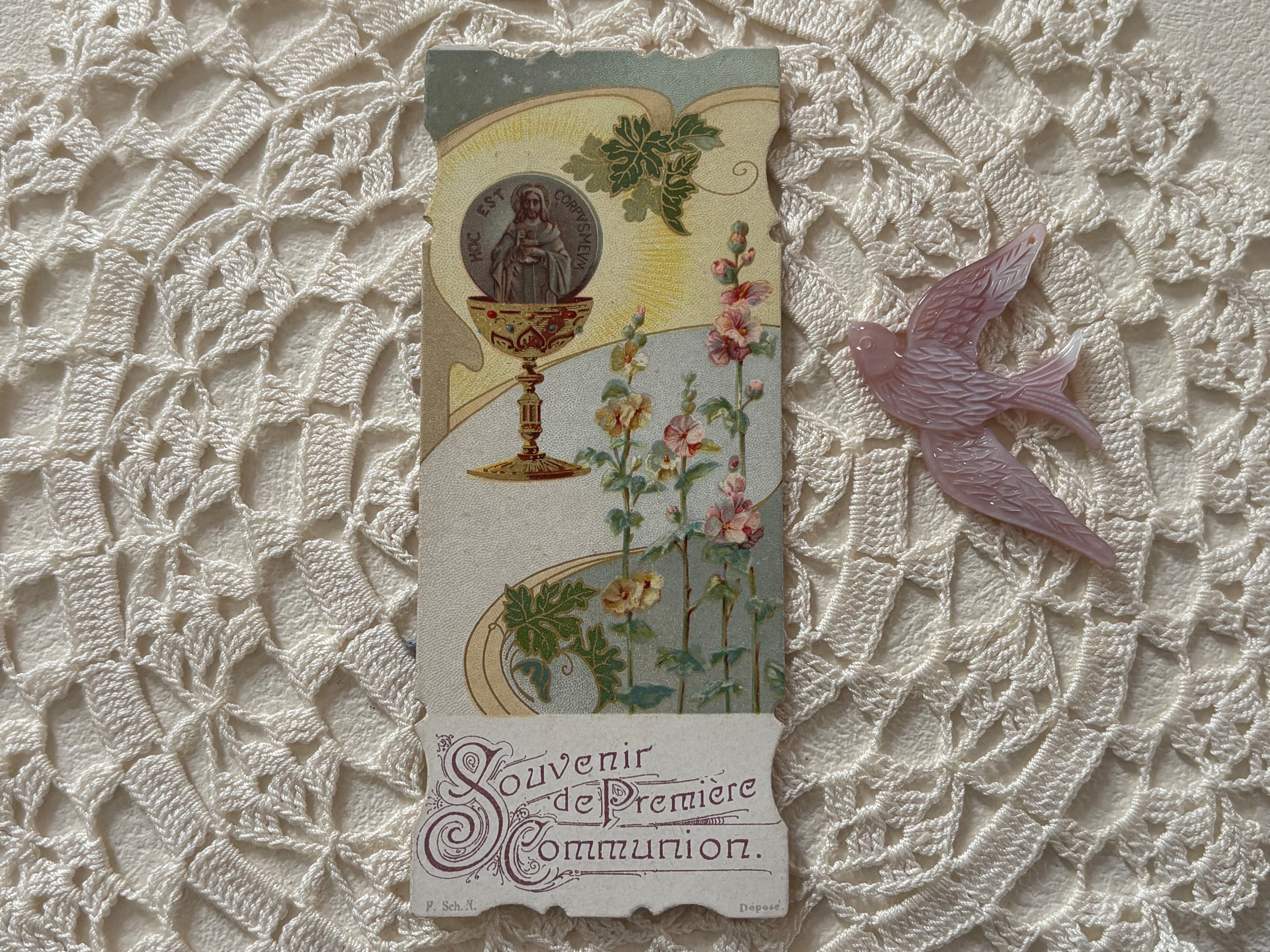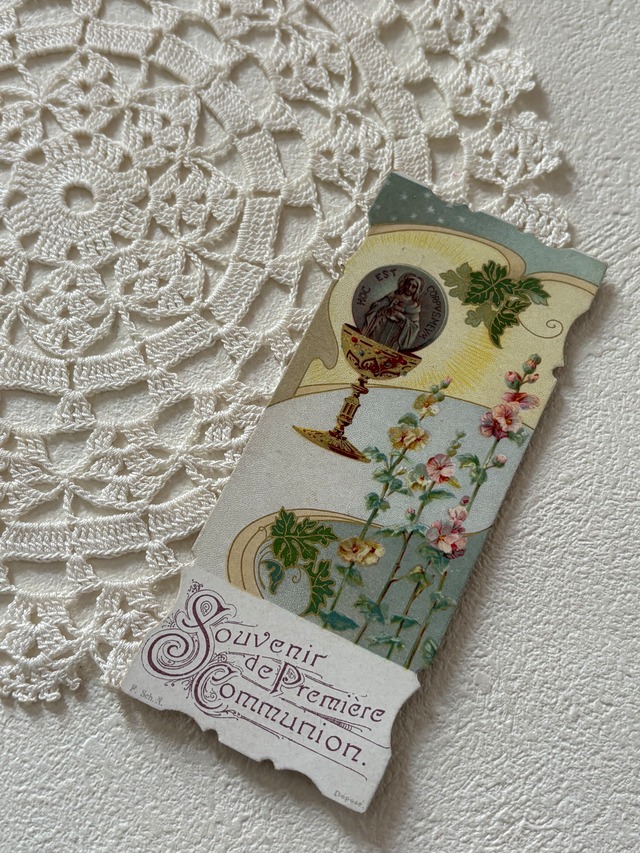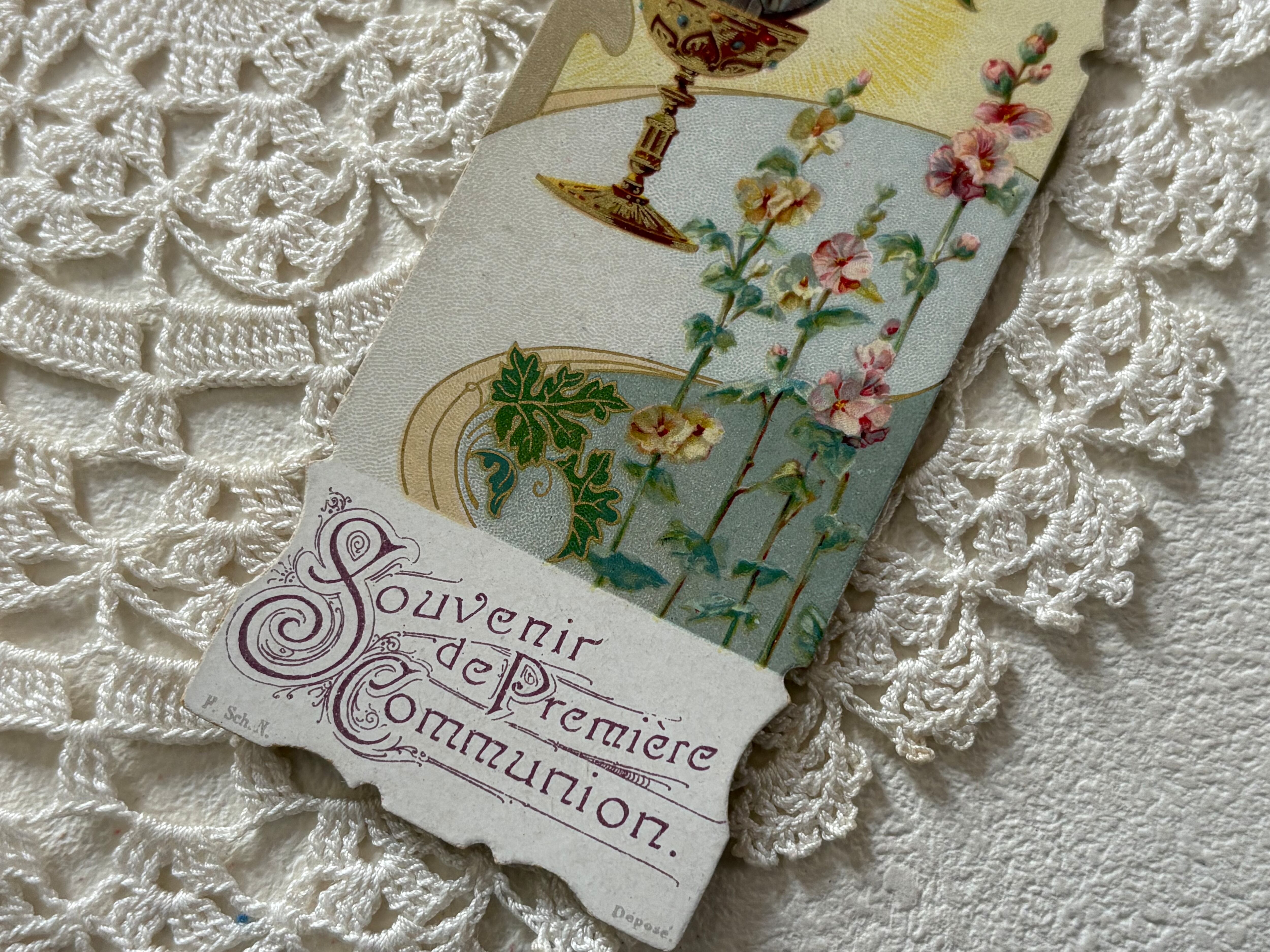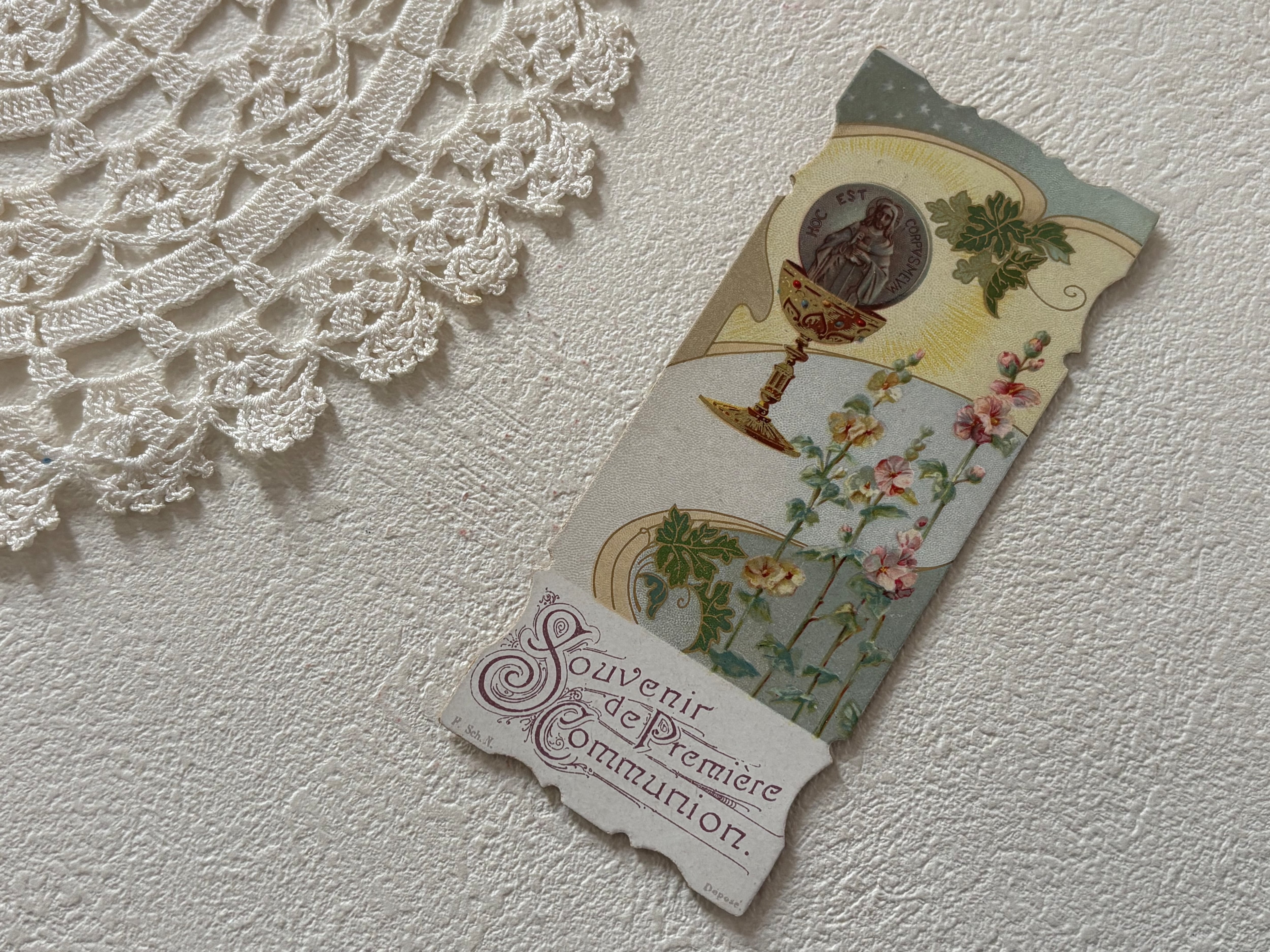 フランスアンティーク Holy Card ホーリーカード プルミエール コミュニオン 聖杯 フラワー 1912年 額装 撮影小物 インテリア