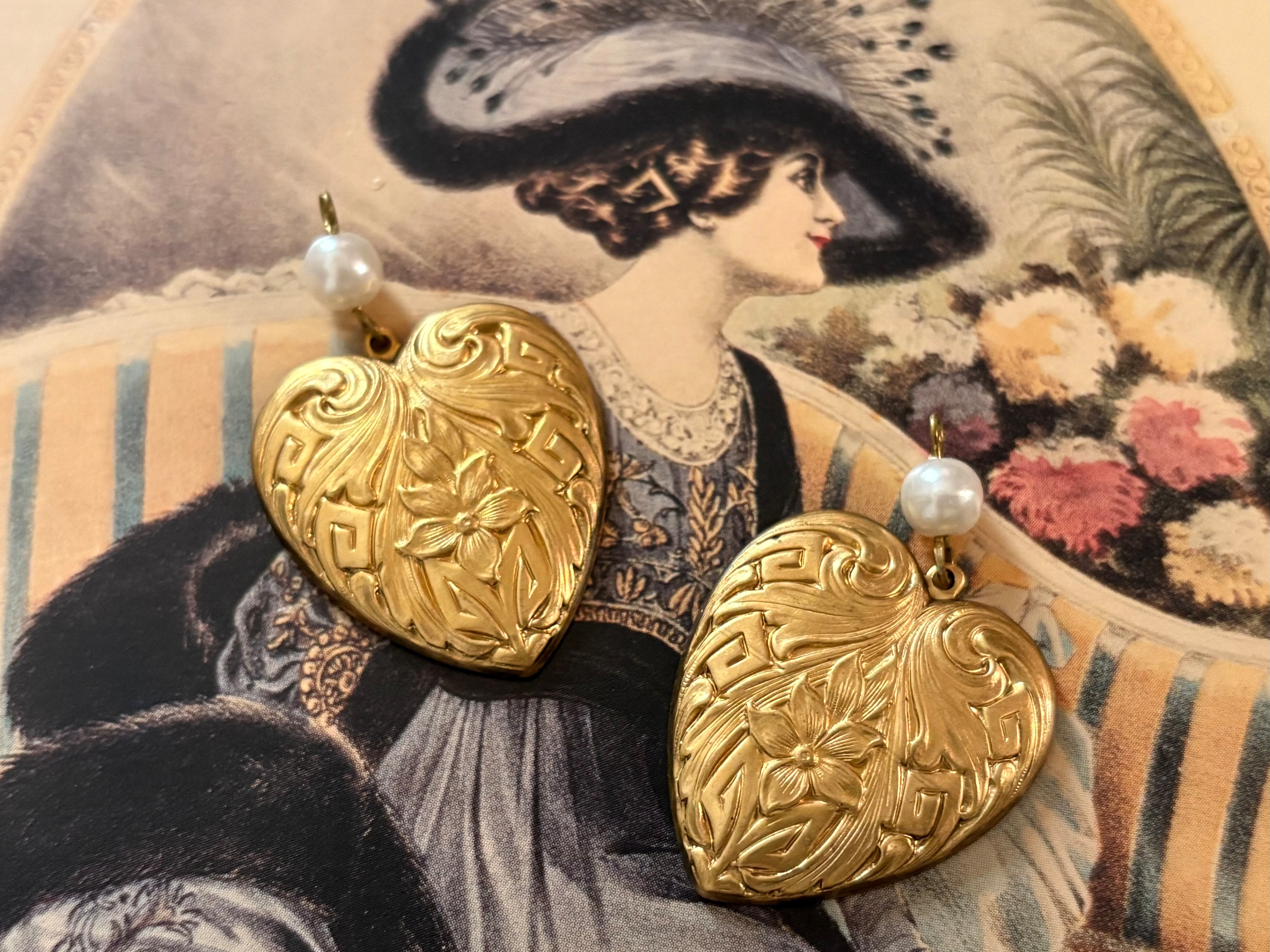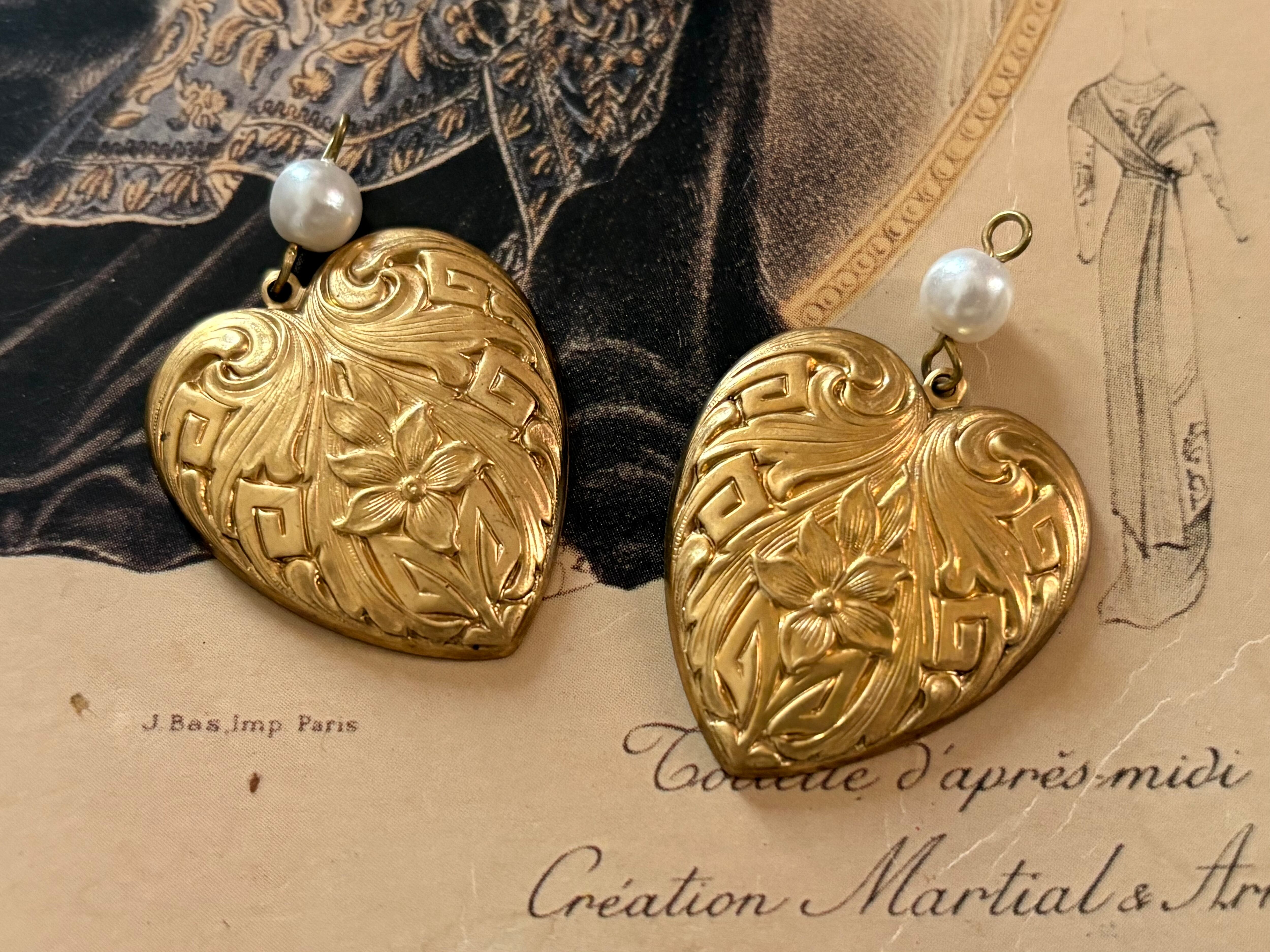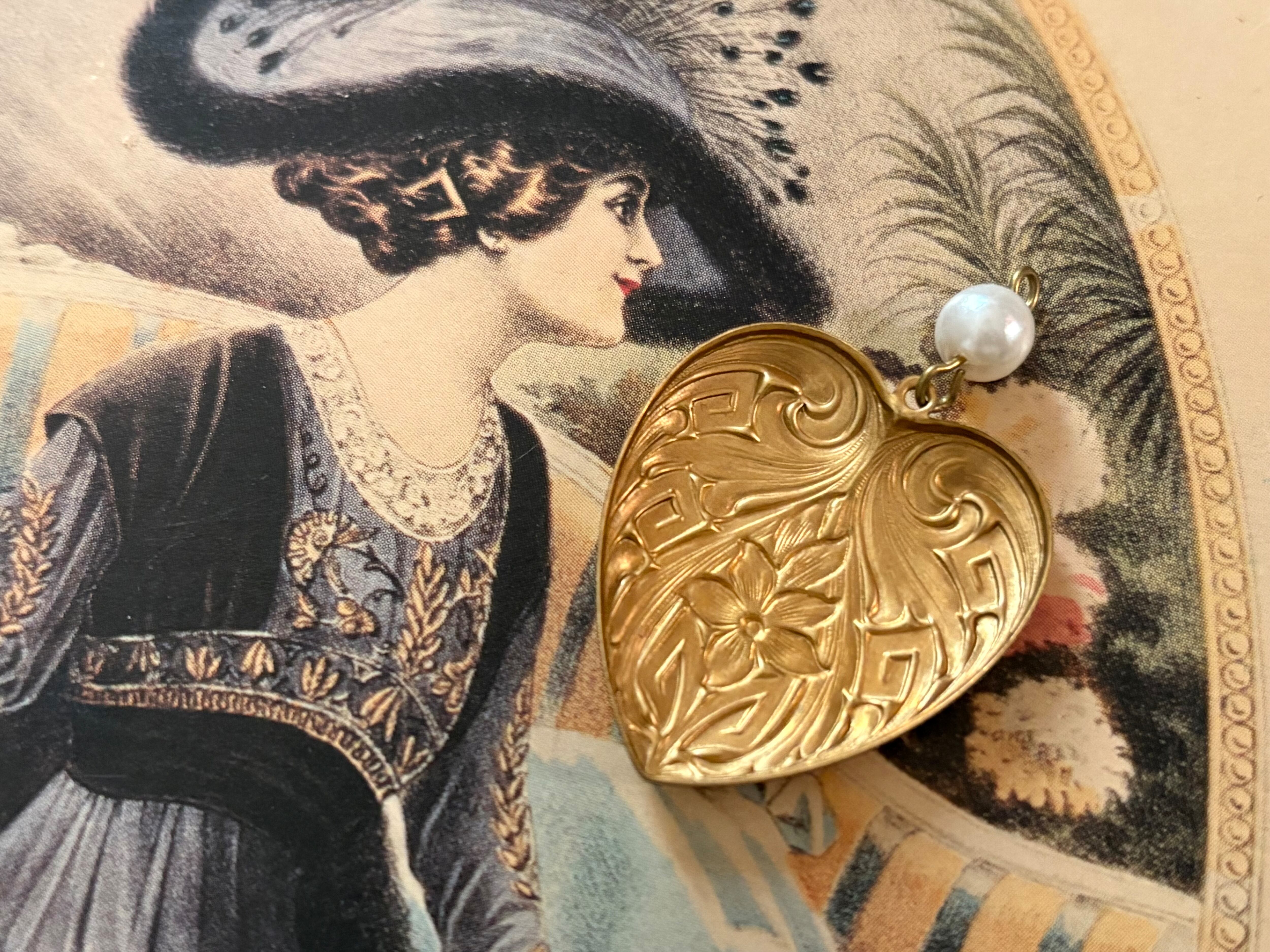 USA ヴィンテージ ブラス製パーツ お花のエンボス柄ヴィクトリアンハート 真鍮 パール調ビーズ アクセサリーパーツ デコレーション材 撮影小物