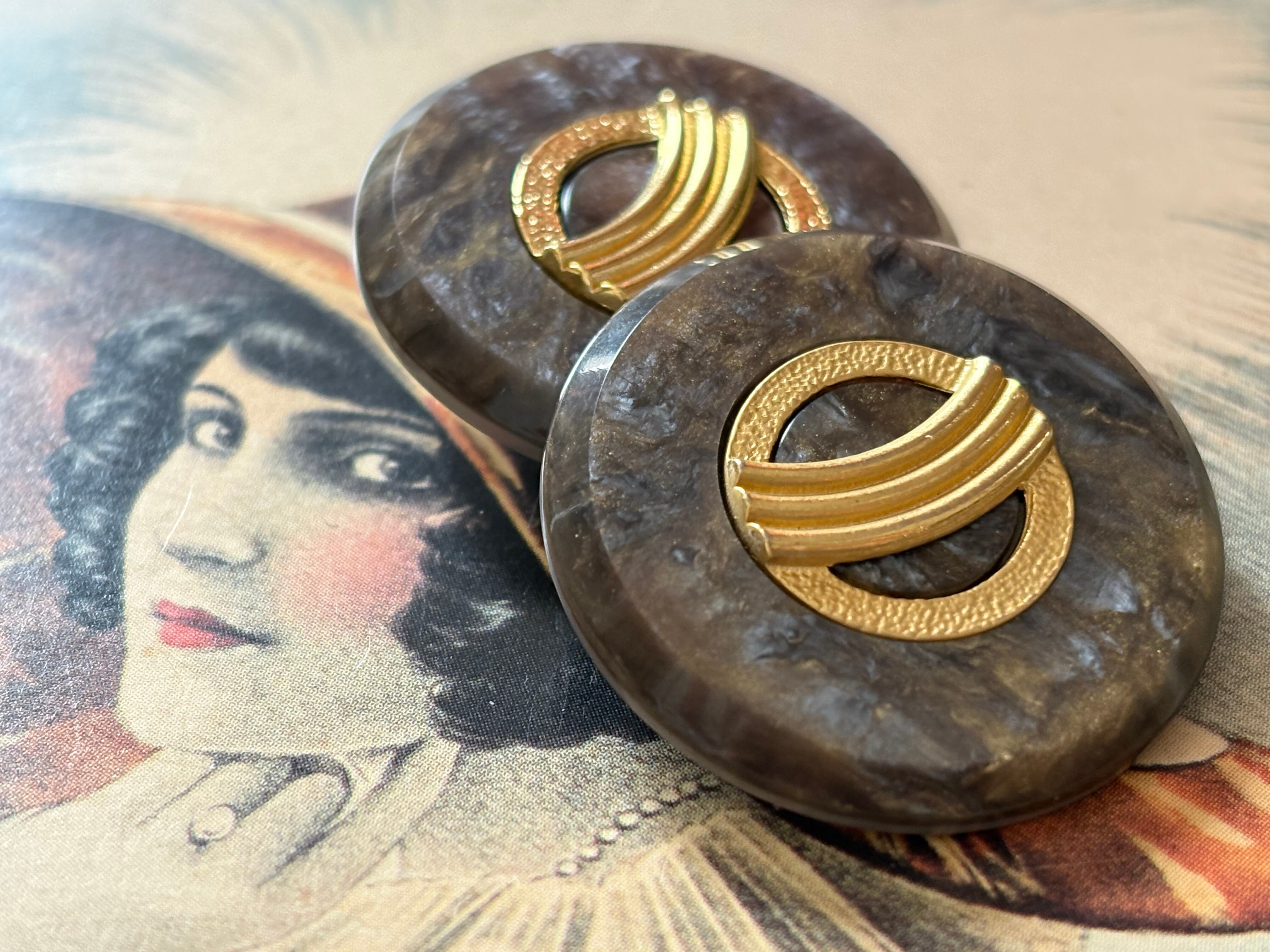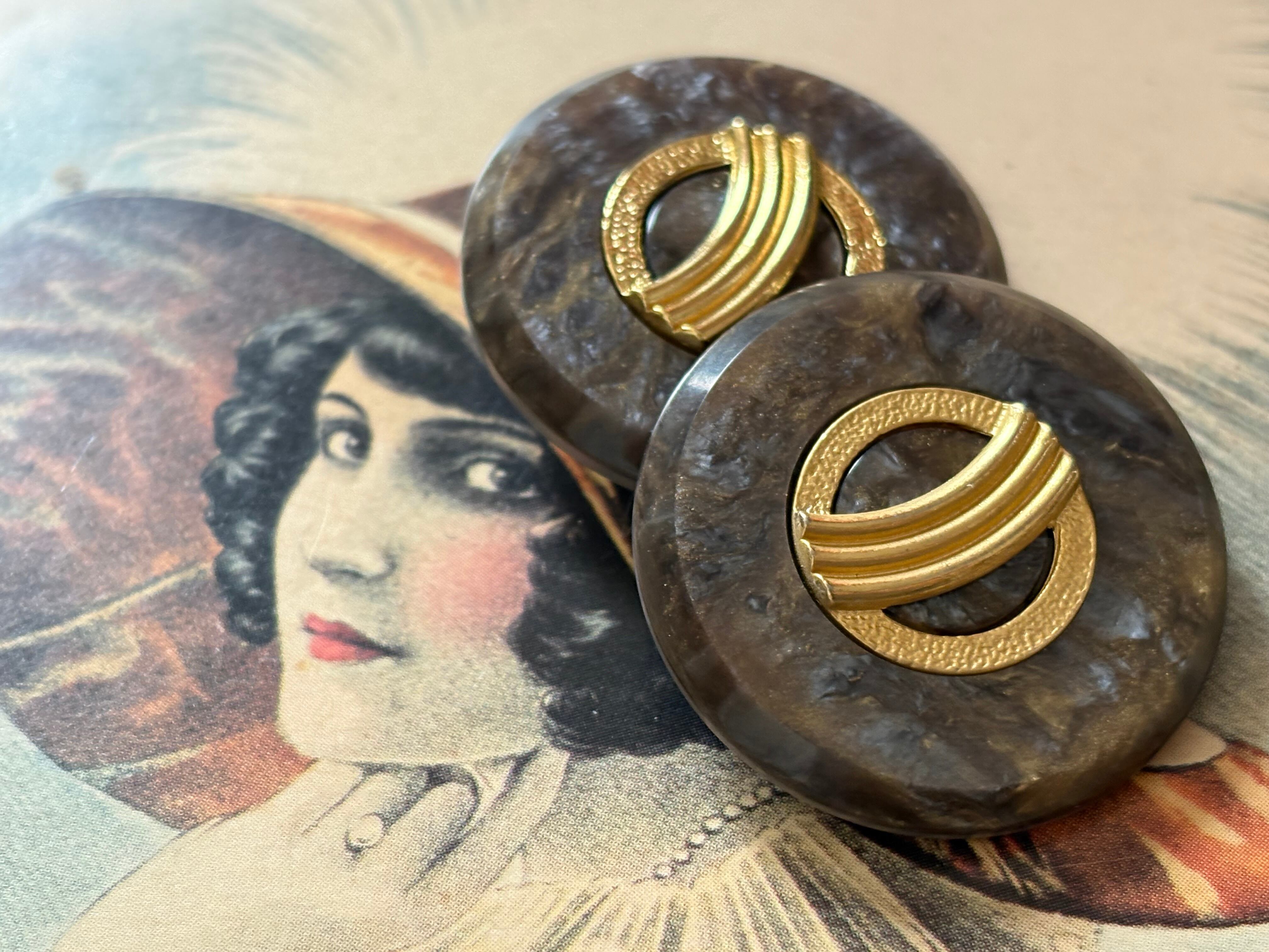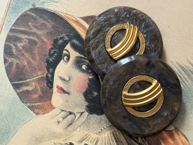 30mm Japanese ヴィンテージボタン マーブル調 ブラウン系×ゴールド プラスチックボタン 大型 デッドストック アクセサリーパーツ