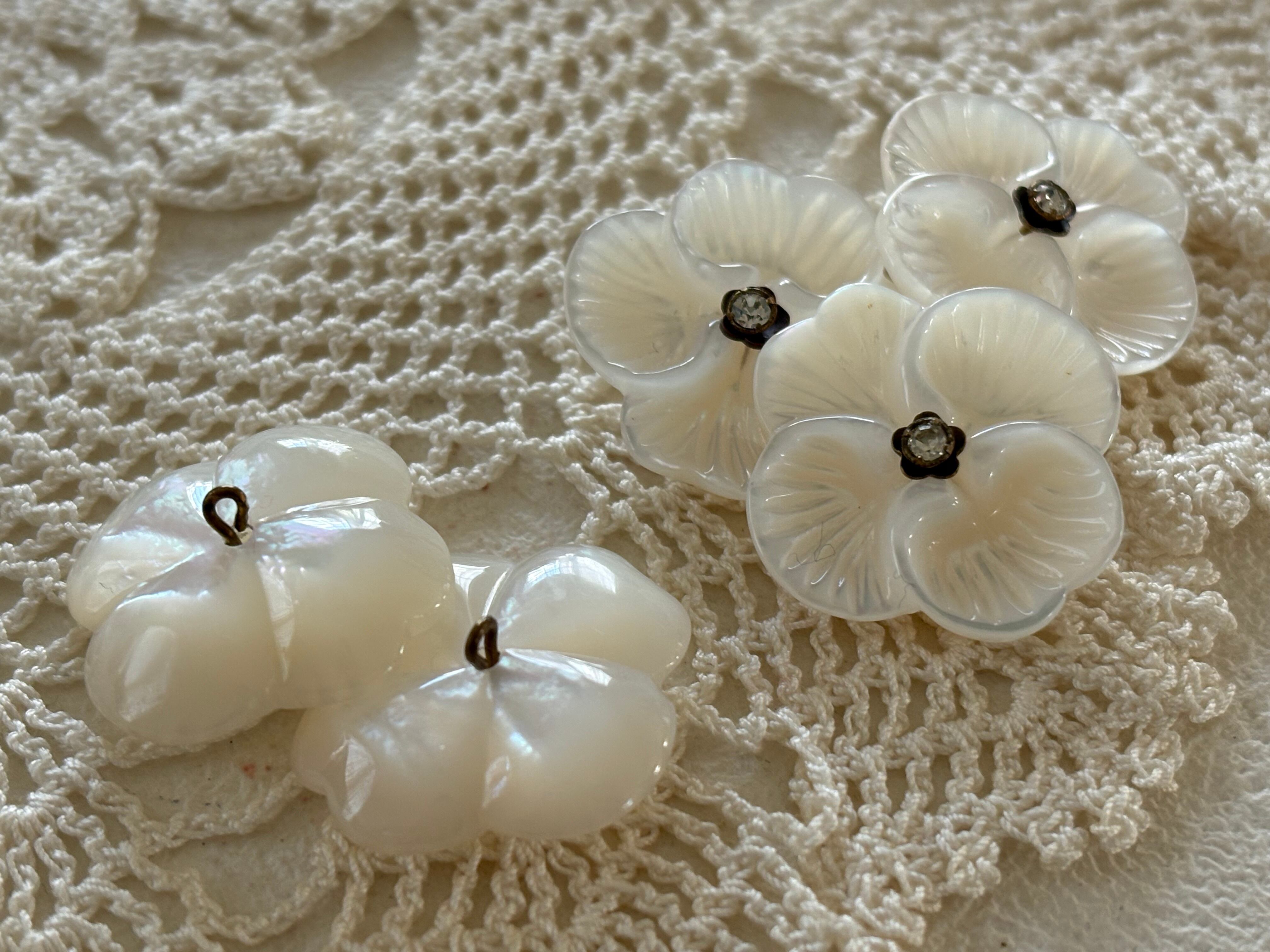 マザーオブパールのパンジーの花芯に美しく輝くストーンが一粒設置されています。
