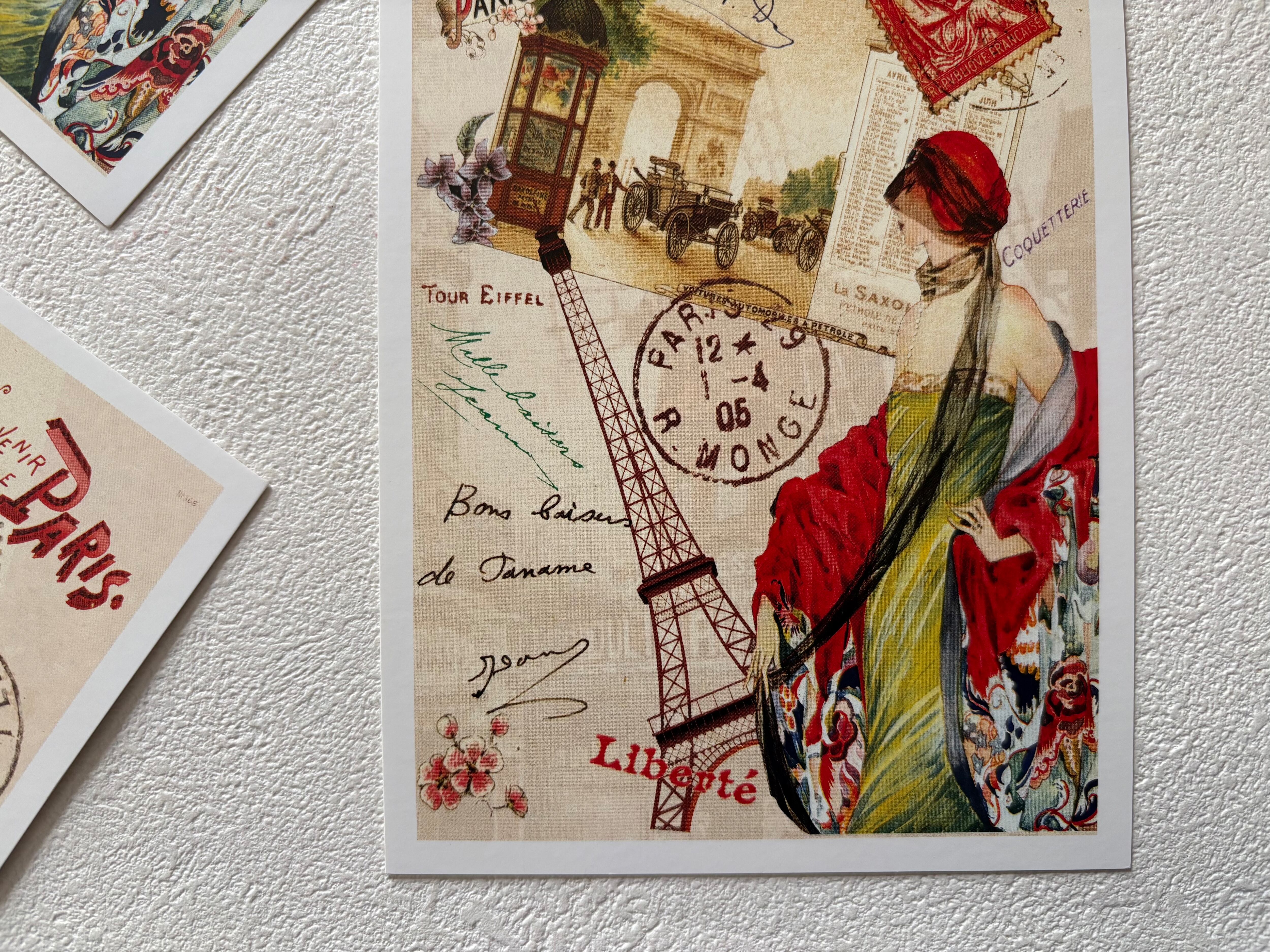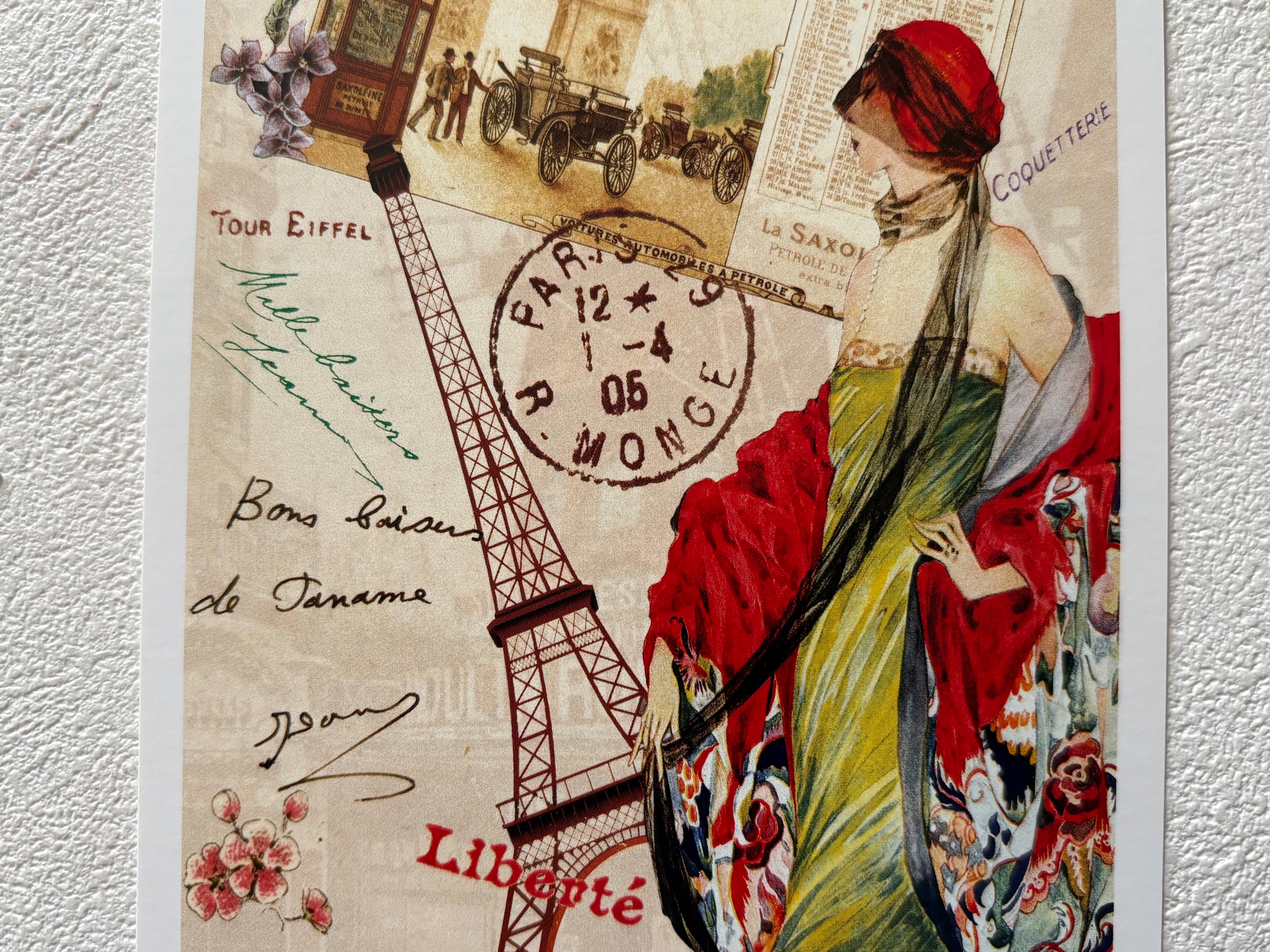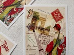 エッフェル塔、凱旋門などParisの名所、またおしゃれなマダム、すみれ、天使など素敵なアイテムが詰まった1枚です。