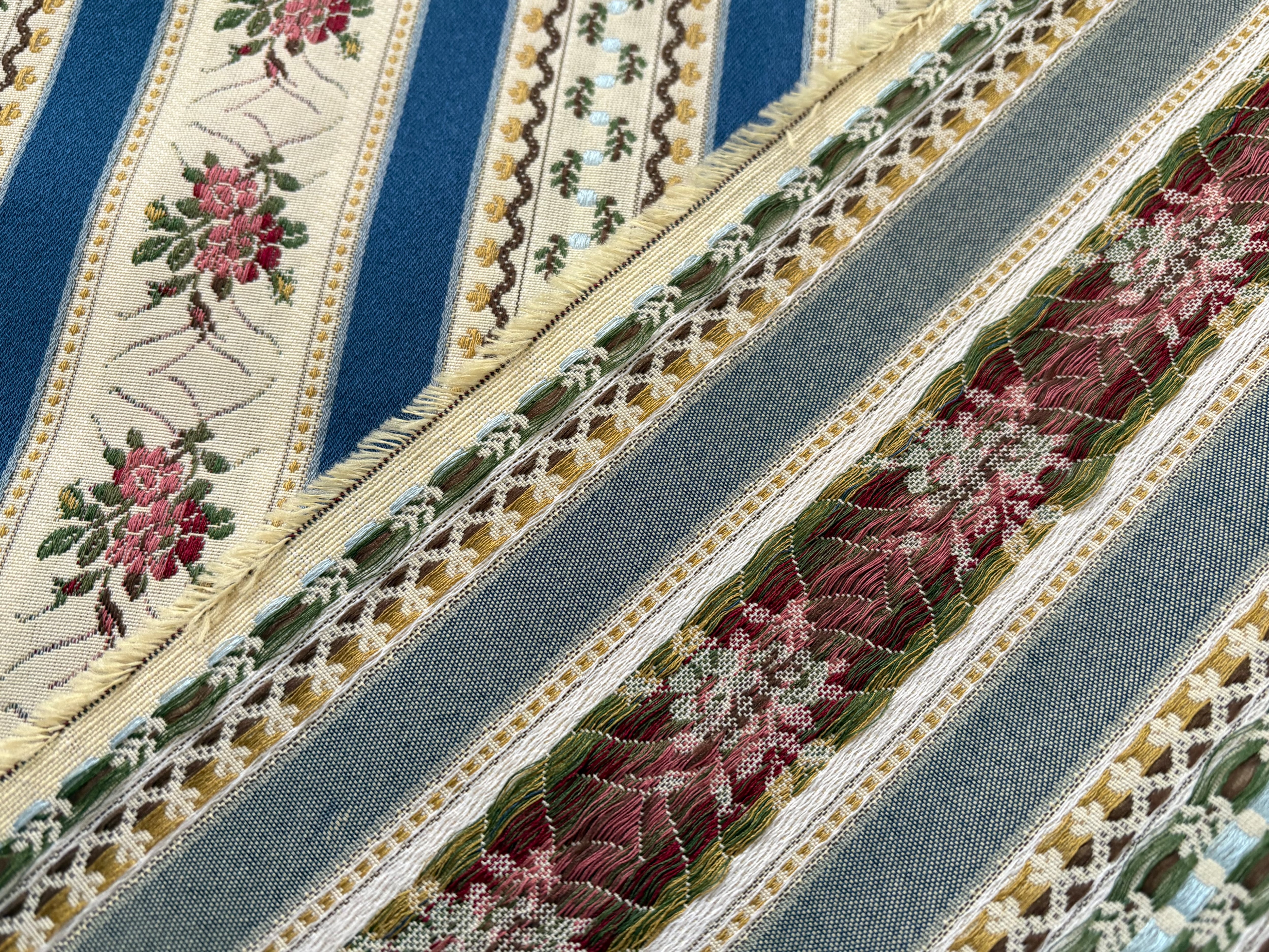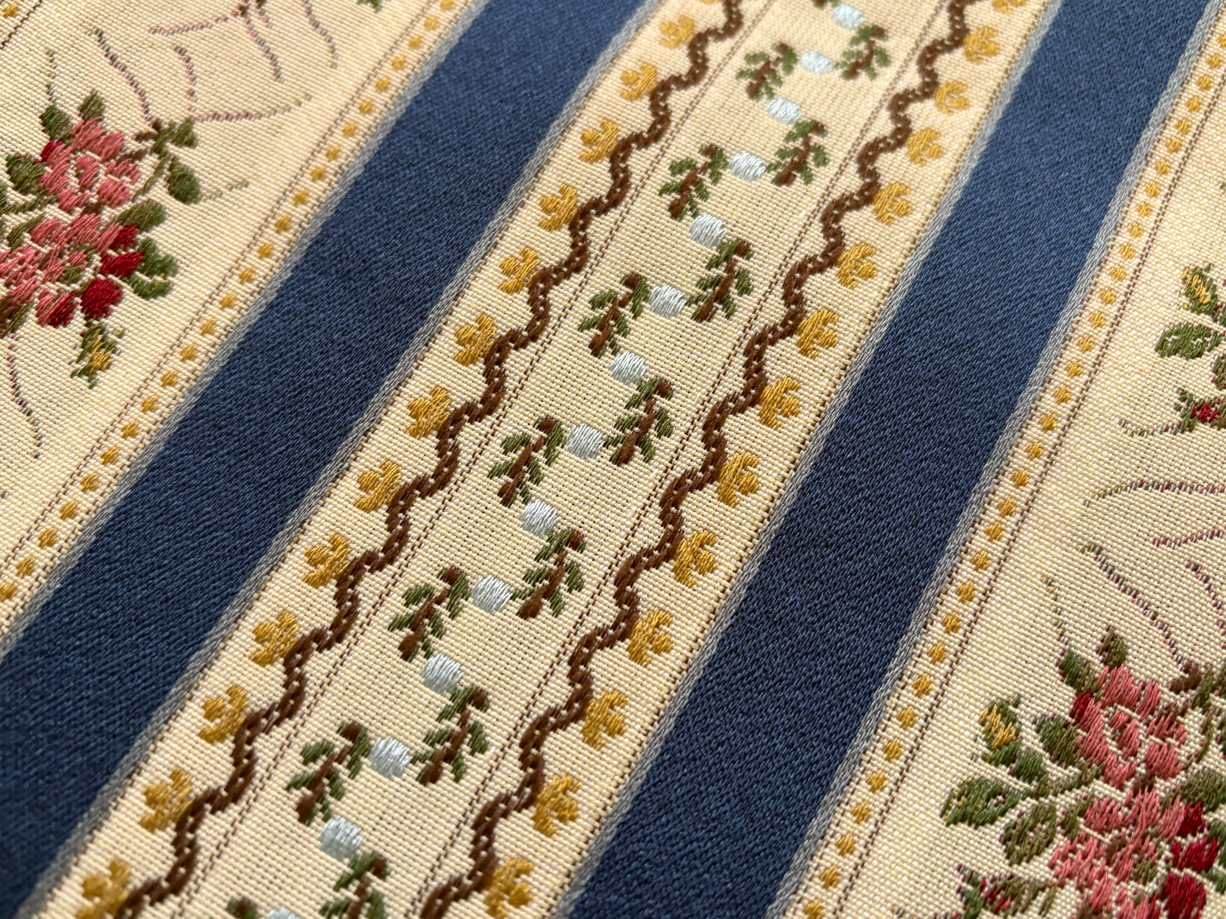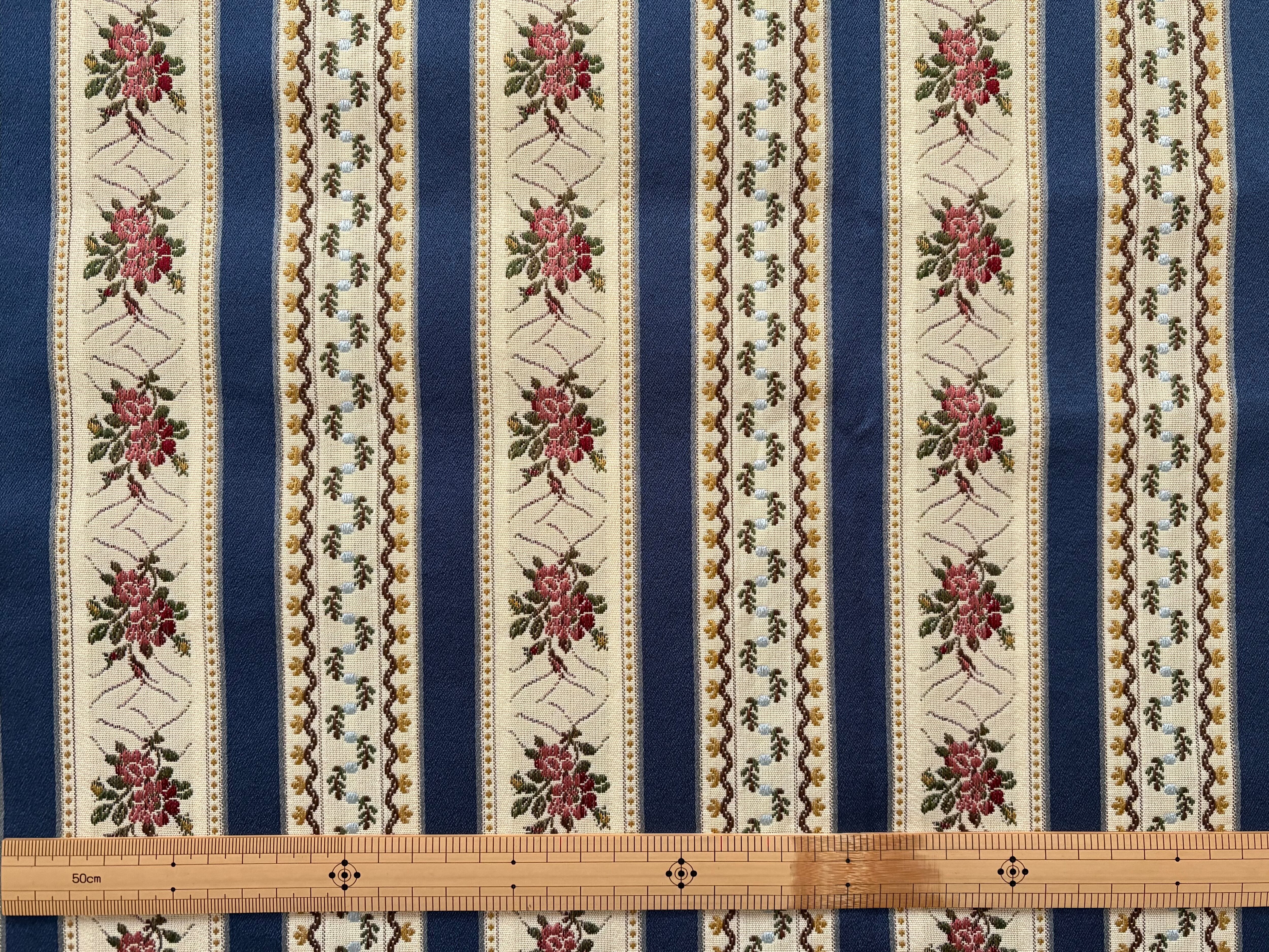 画像のようなエレガントでクラシカルな植物の織模様がストライプ状に並んだデザイン。高級感のあるファブリックです。