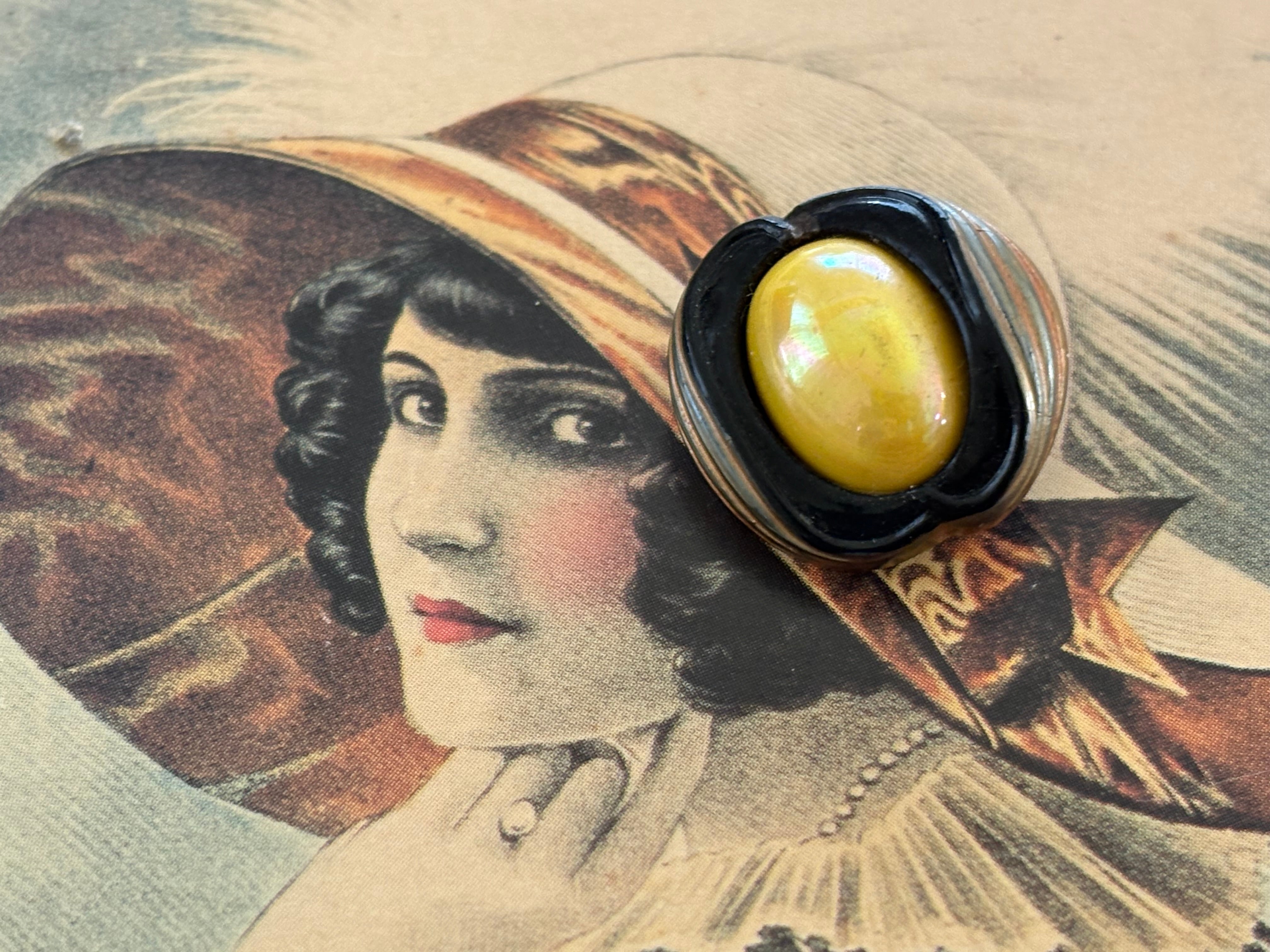艶ややかでオーロラがかった光沢を放つ特徴的なカボションが印象的なデザイン。