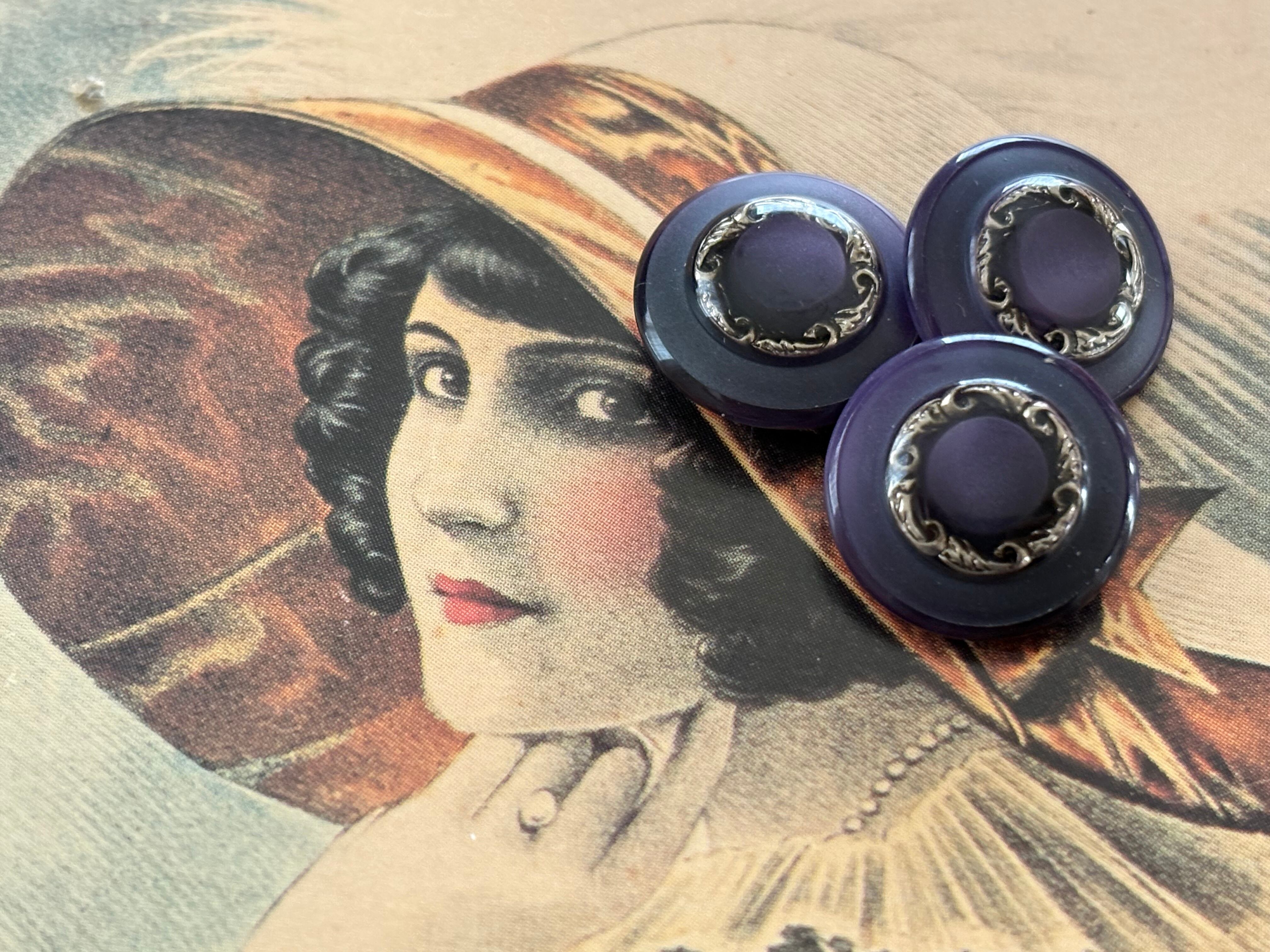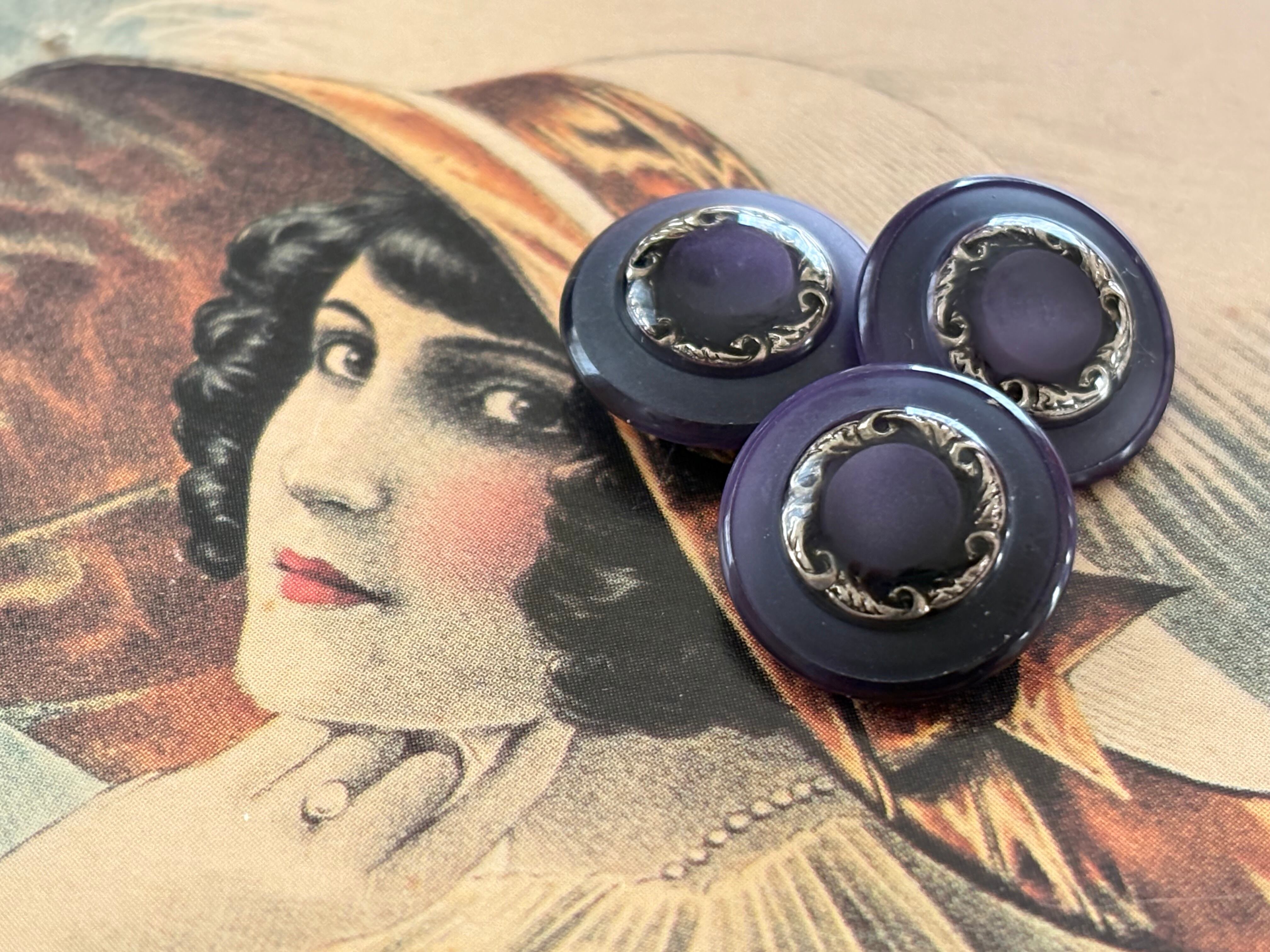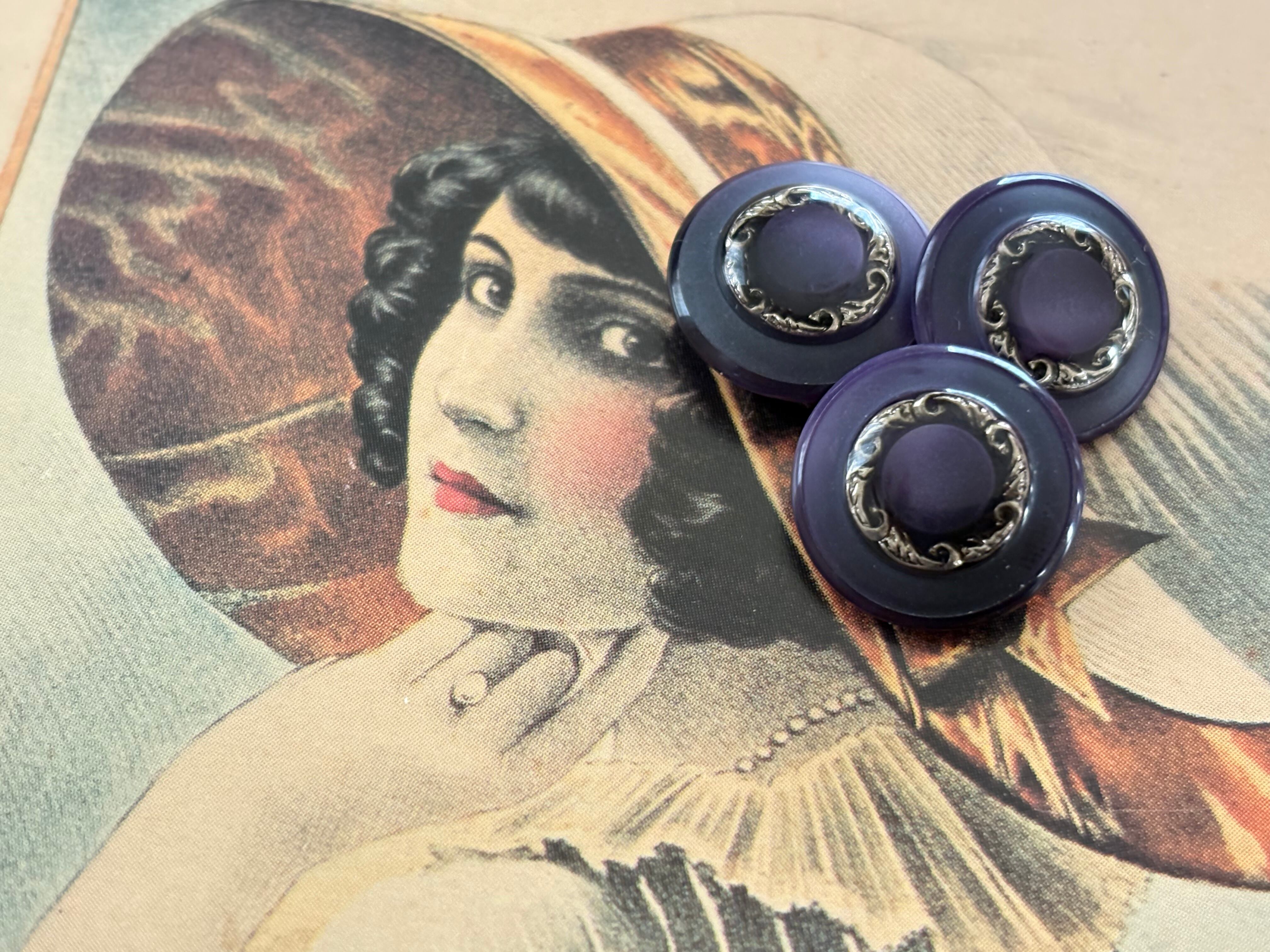 15mm Japanese ヴィンテージボタン パープル×シルバー 樹脂ボタン 昭和レトロ アクセサリーパーツ 装飾材 カルトナージュ