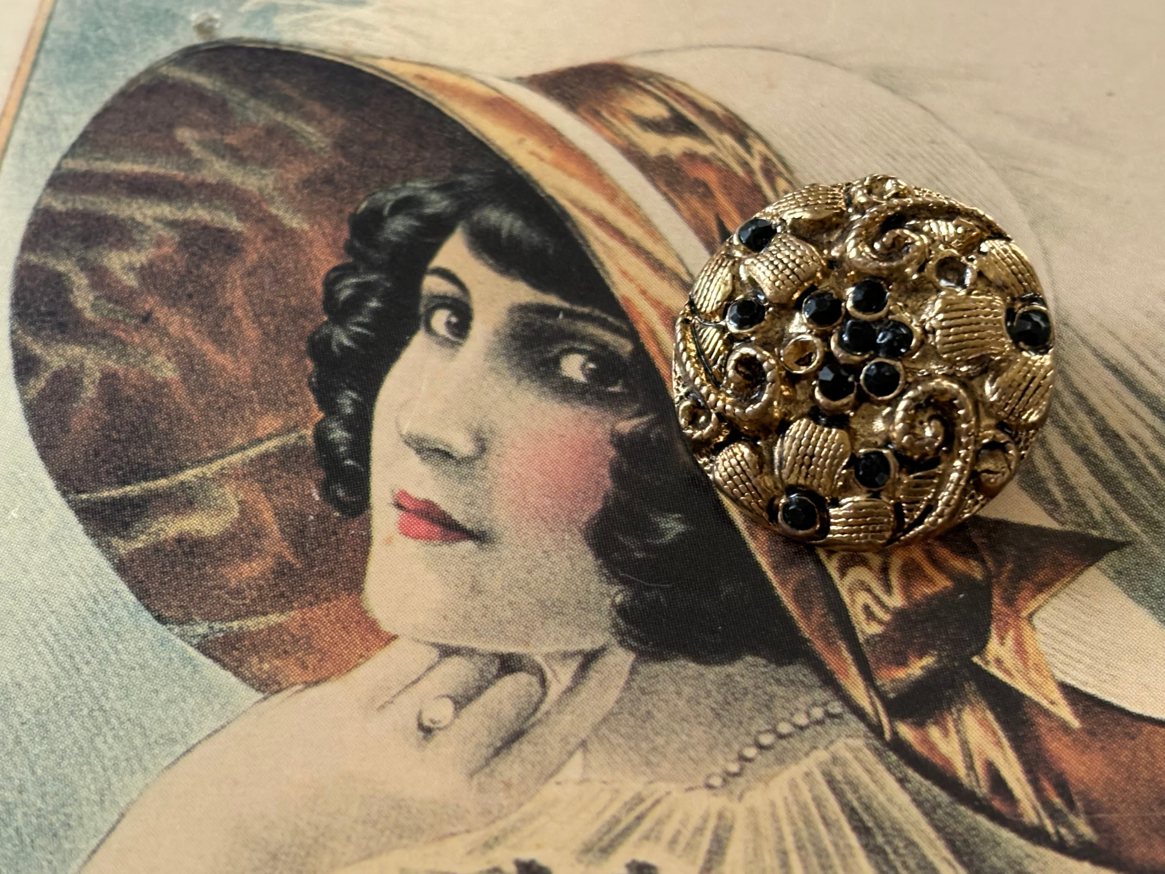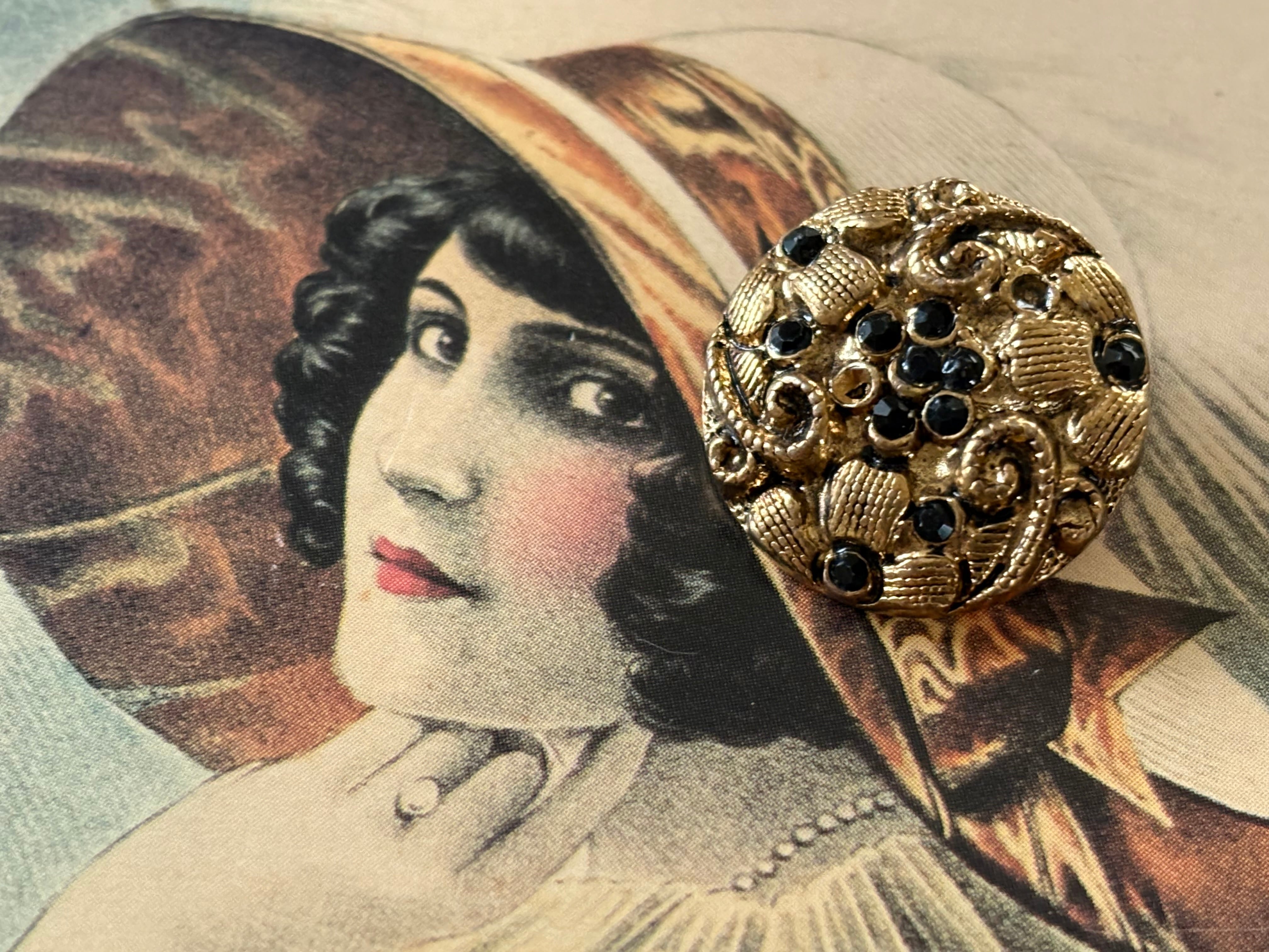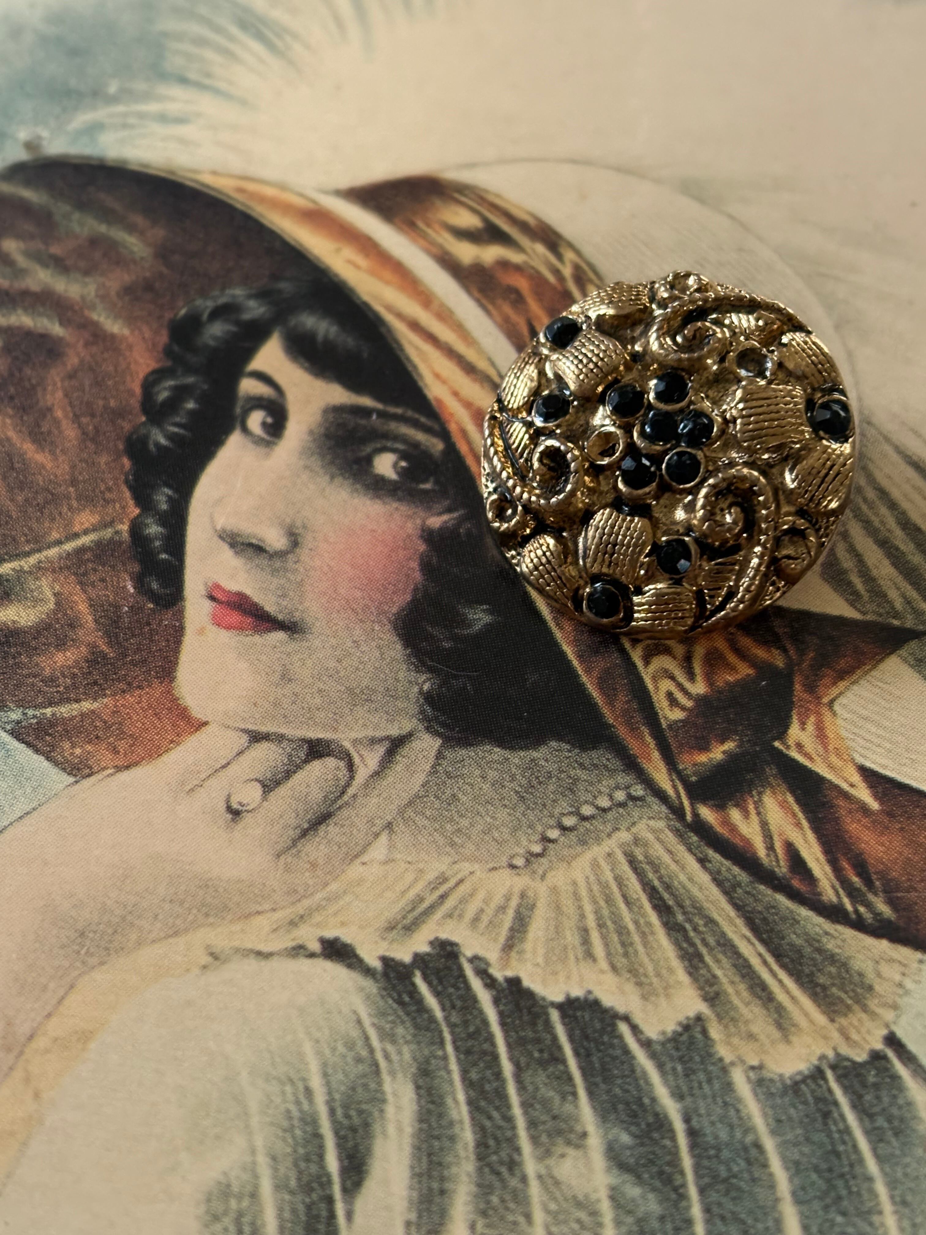 20mm 輸入デザインボタン メタル×ストーン ゴールド×ブラック アクセサリーパーツ デコレーション材 フラワーモチーフ