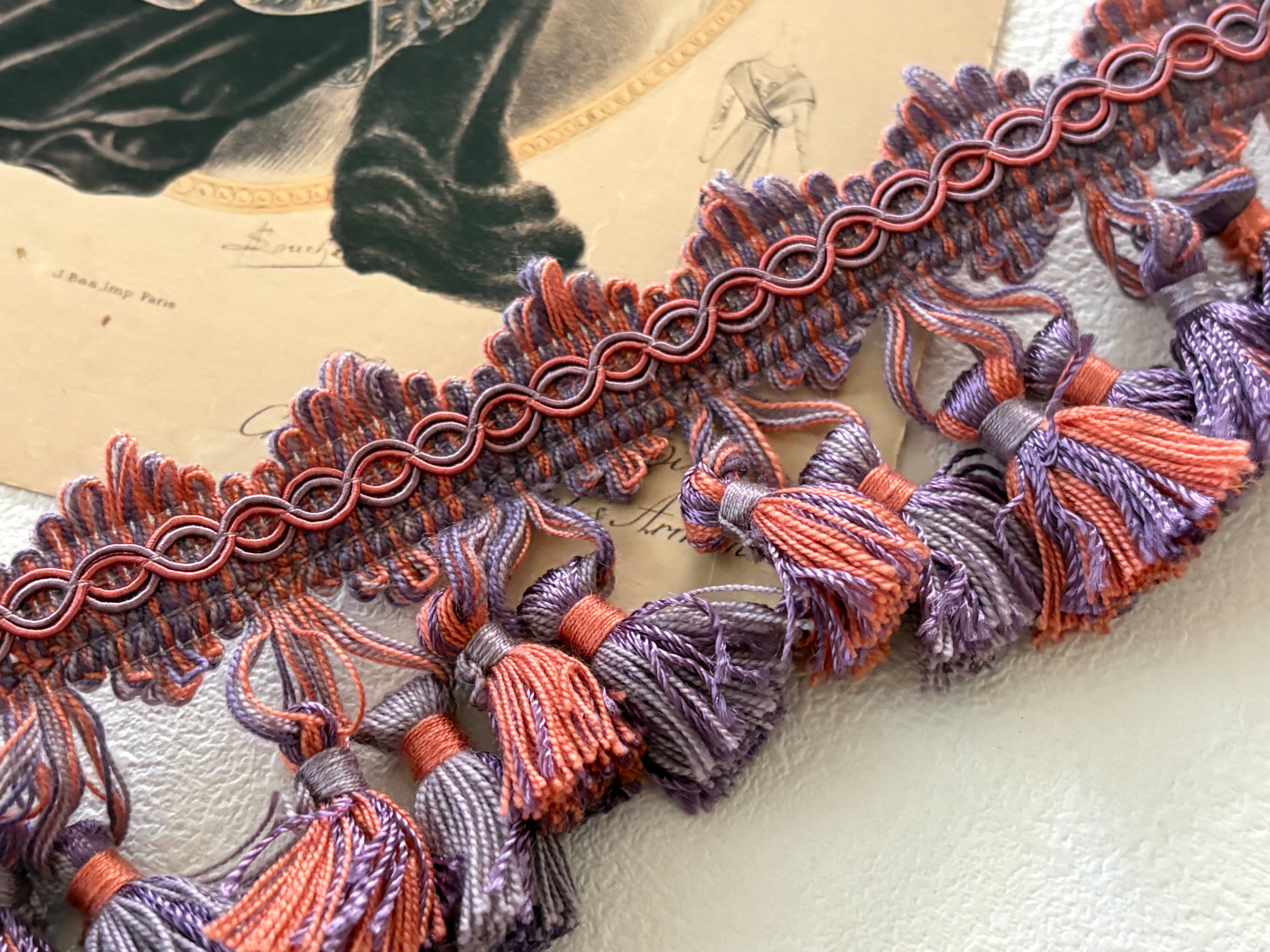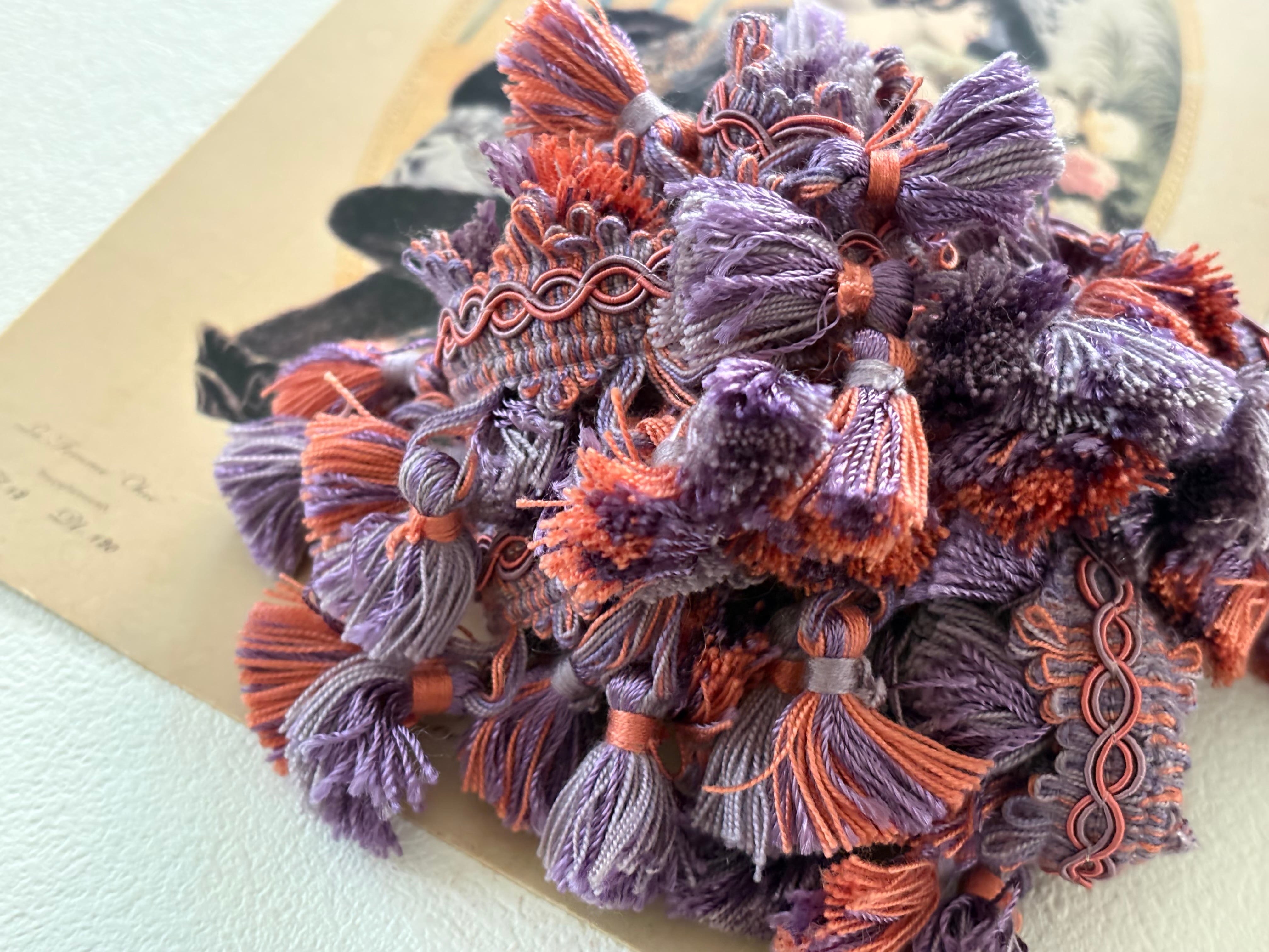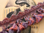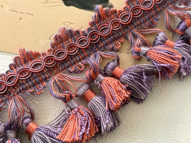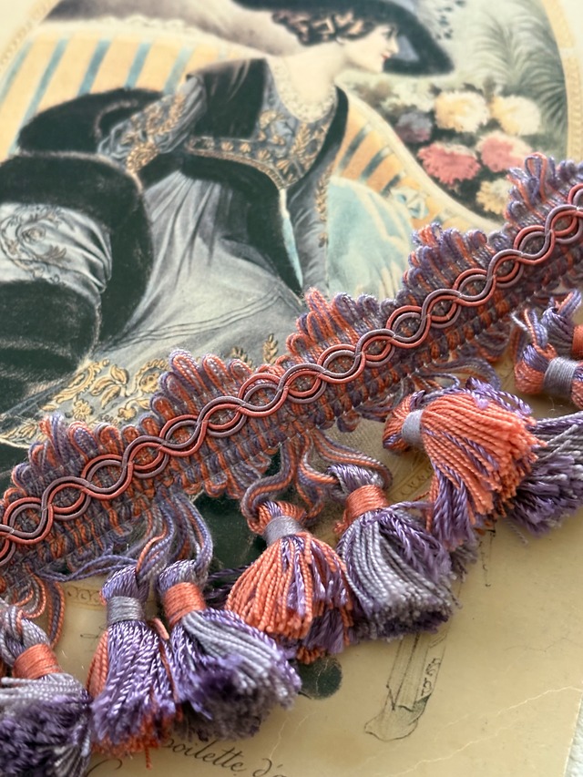 パープル×ピンク系のMIXカラー。 カルトナージュをはじめ様々な作品のデコレーションに。 作品に華やかさを添えます。 カラー: パープル×ピンク系 画像をご参照くださいませ カット: 68cm ブレード幅: 約25mm(最大幅) 最大幅: 約55mm(ブレード〜タッセル) こちらは68cmのカットブレードになります。
