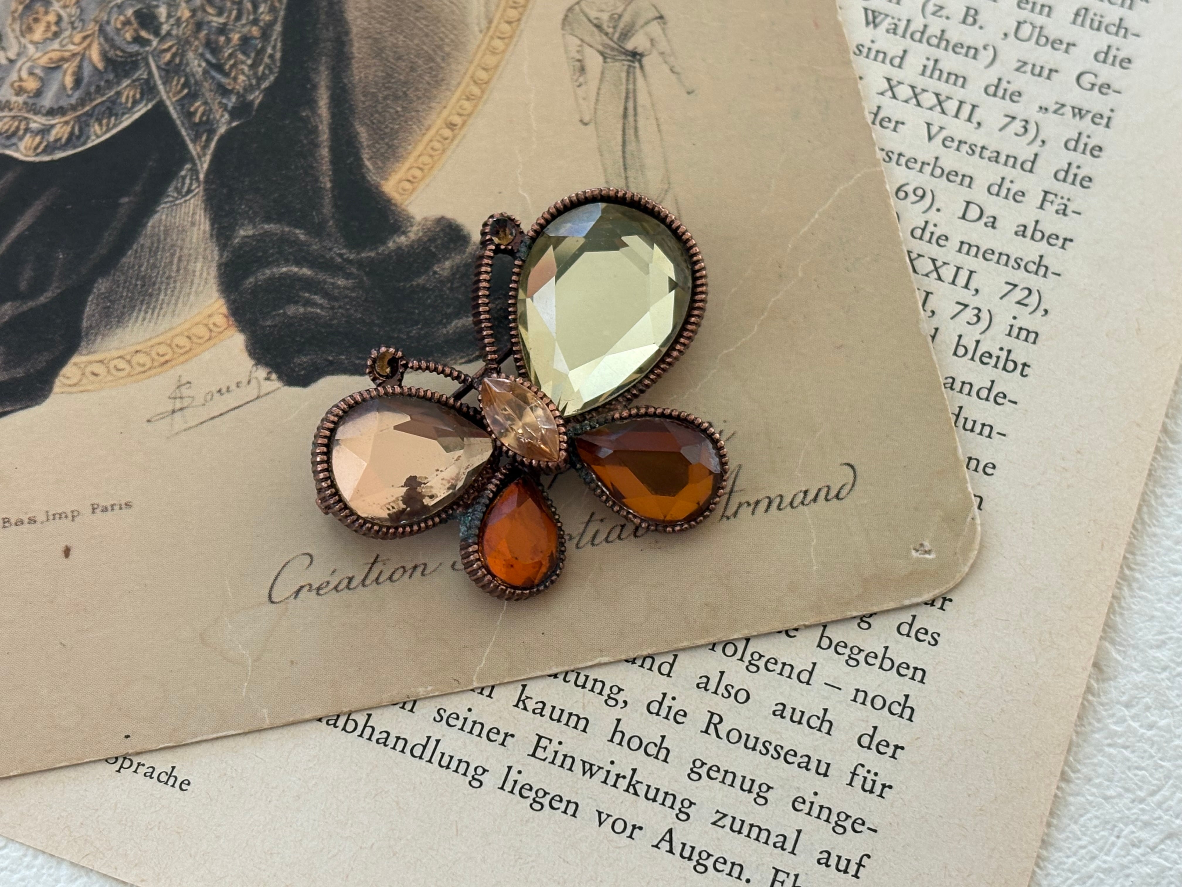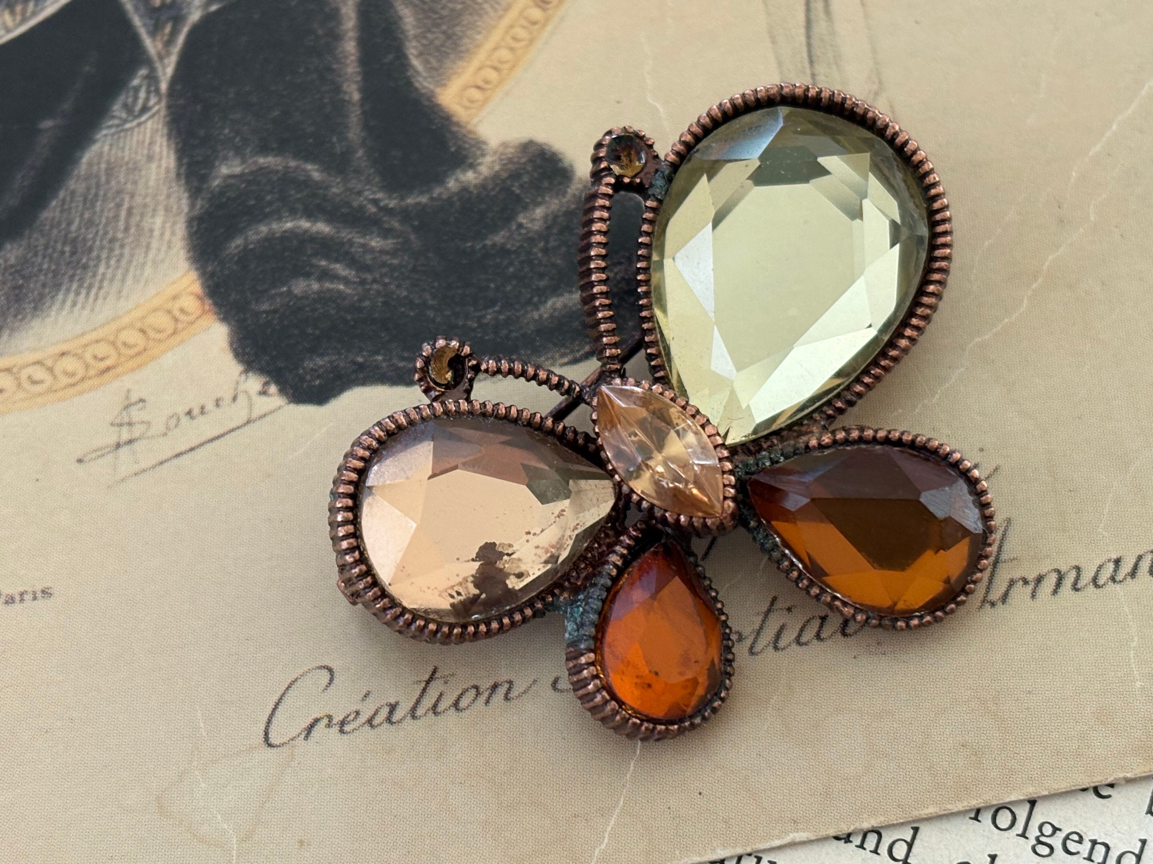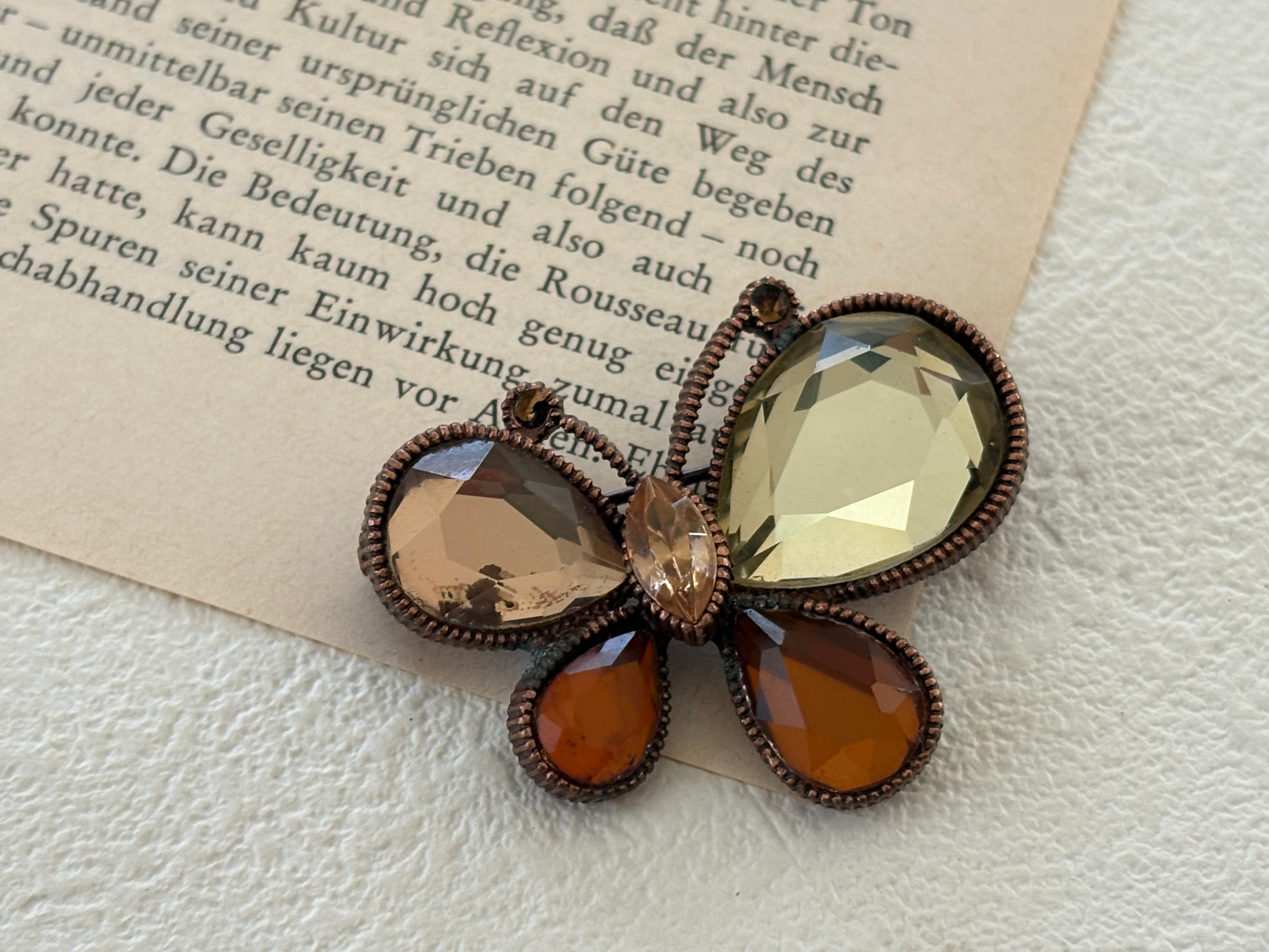 フランス Vintageブローチ パピヨン 蝶々 カットガラス ブラウン系 アクセサリー デコレーション材