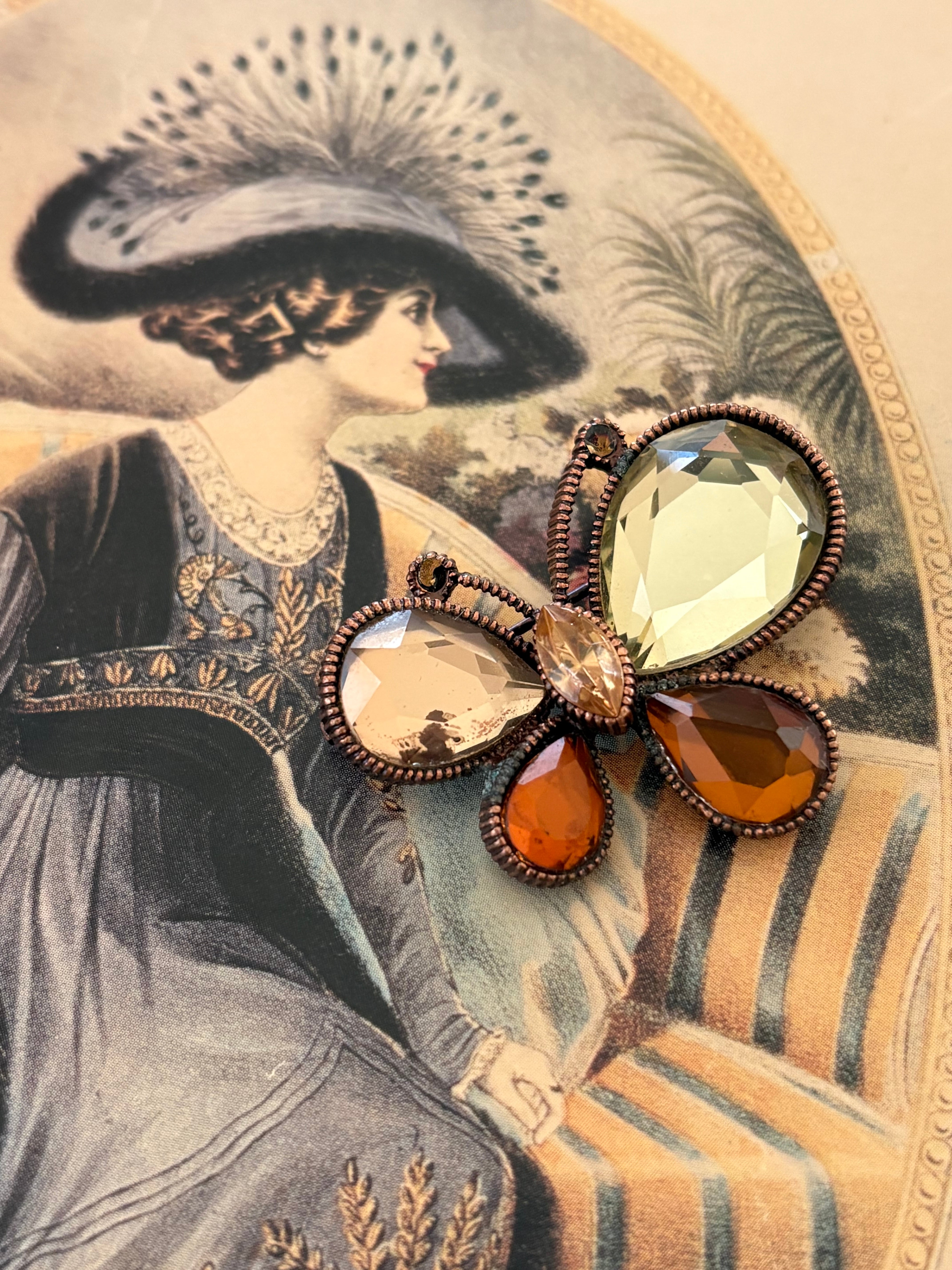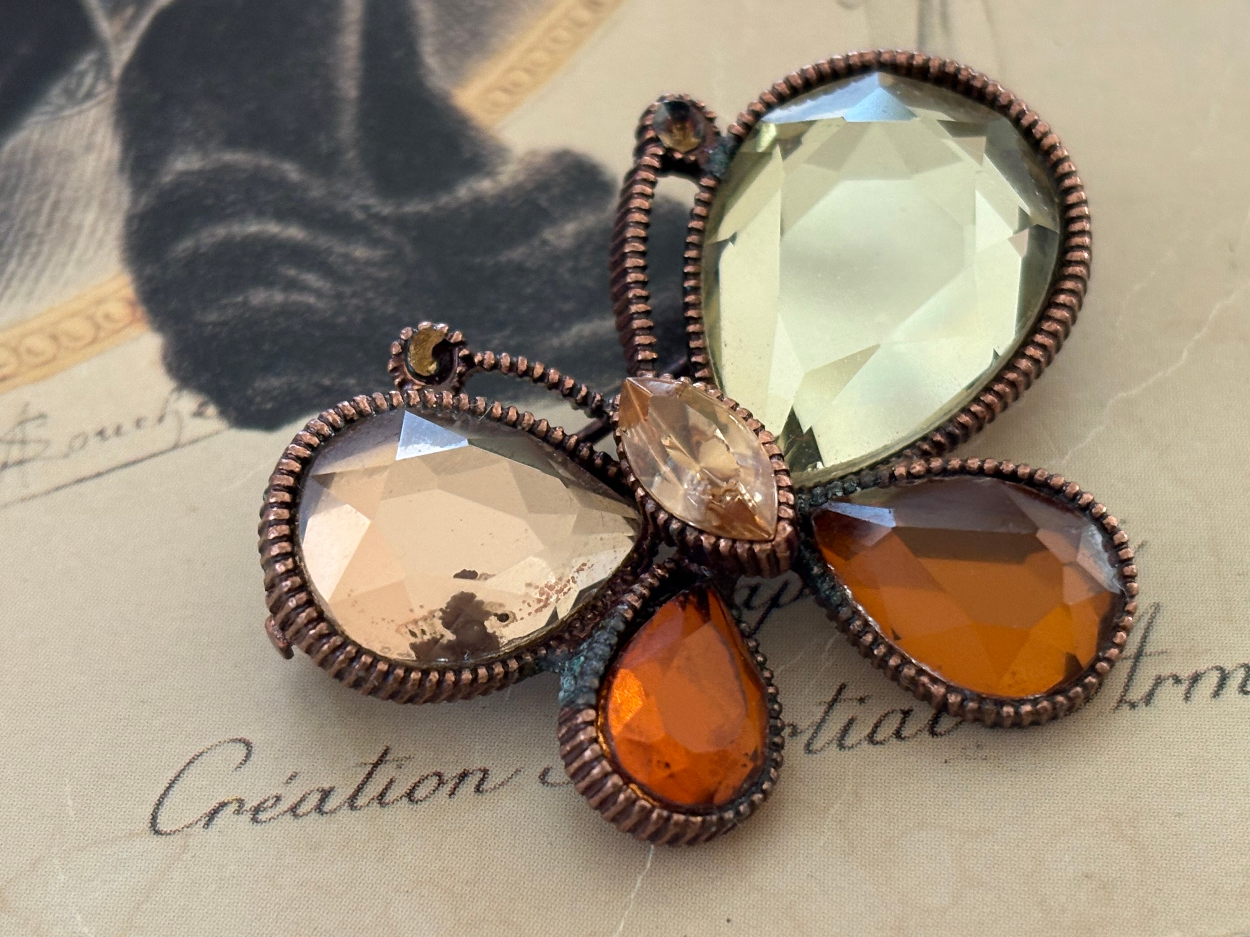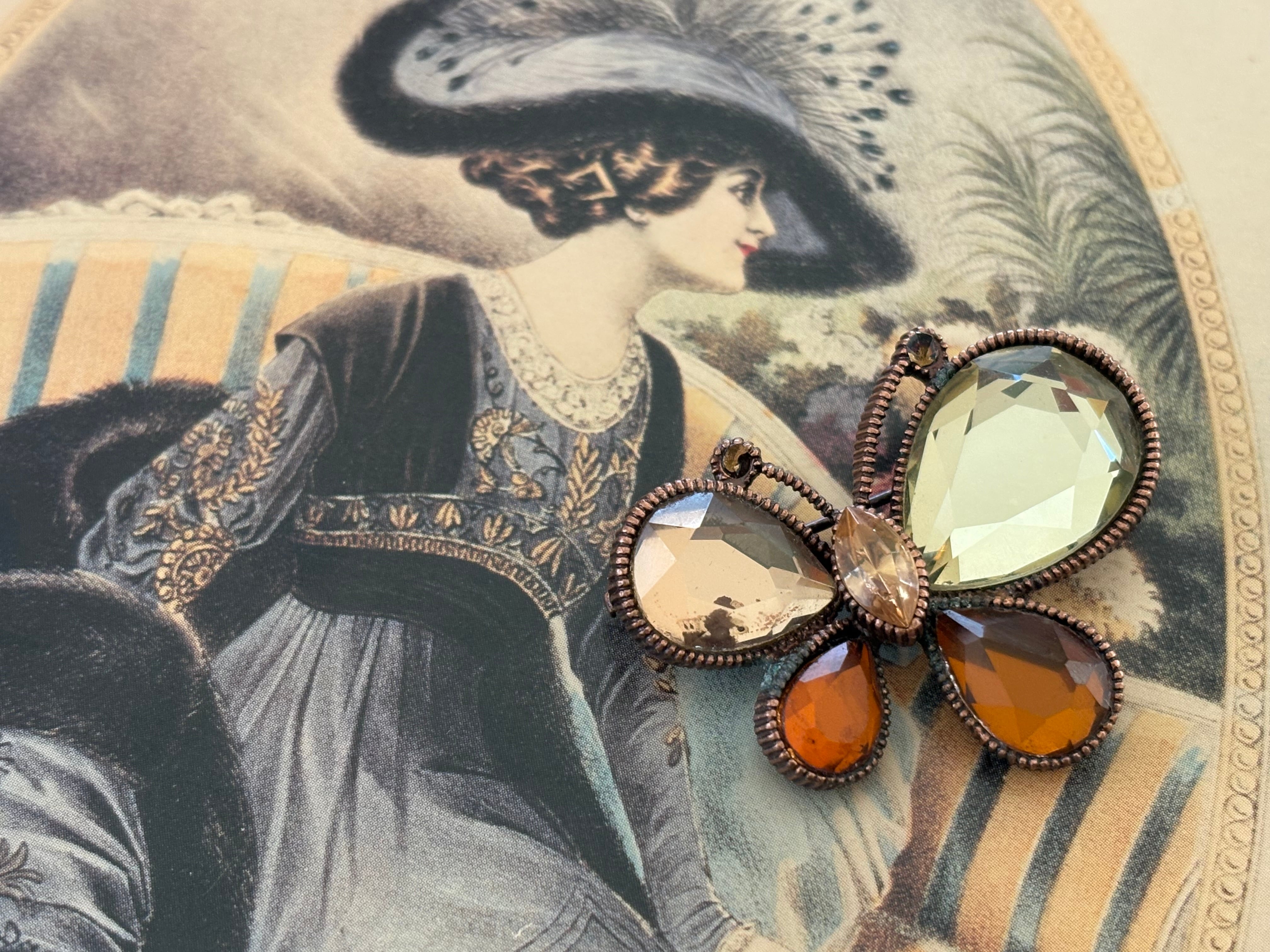 フランス Vintageブローチ パピヨン 蝶々 カットガラス ブラウン系 アクセサリー デコレーション材