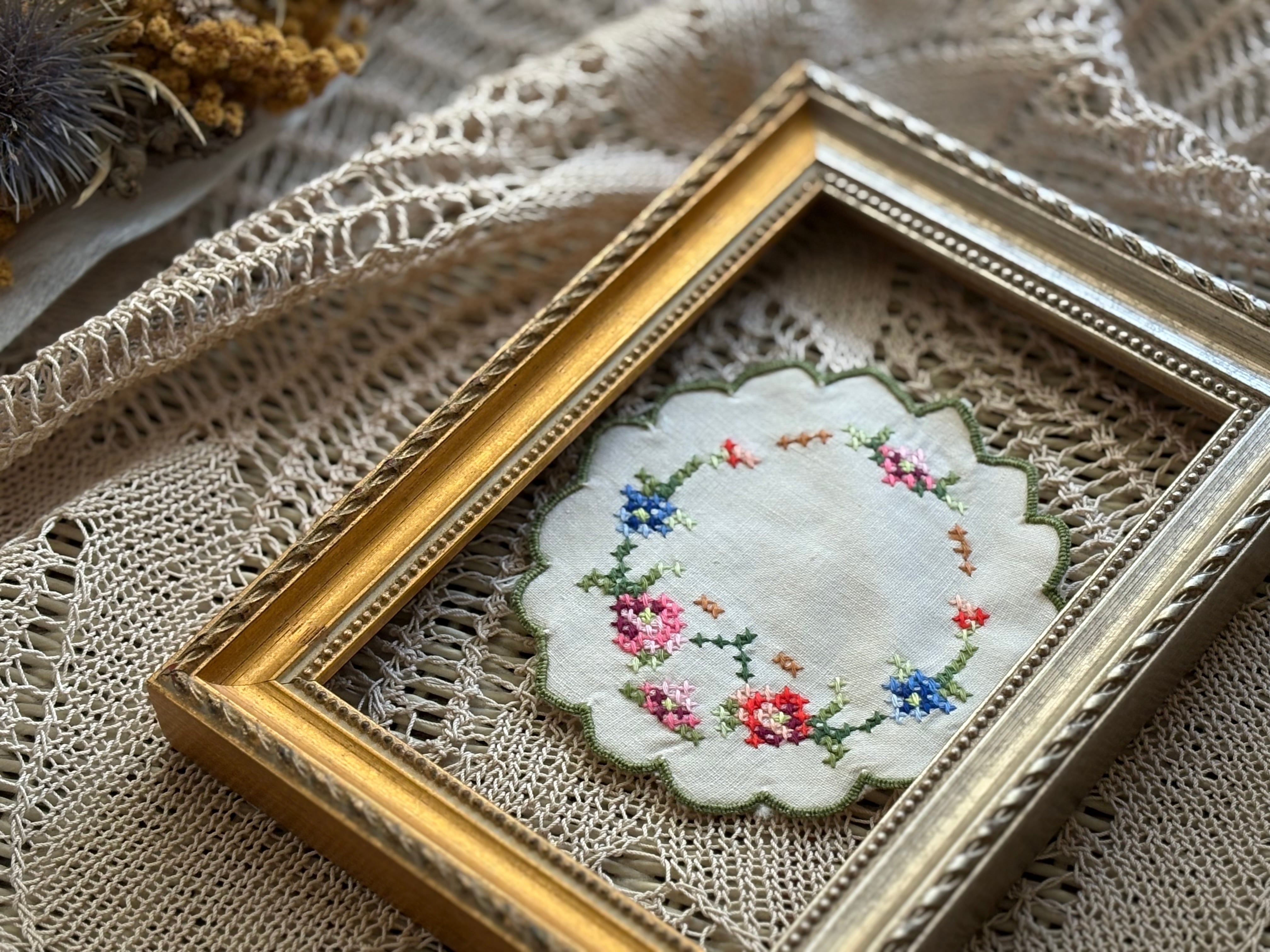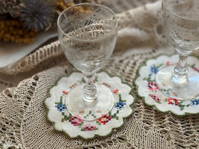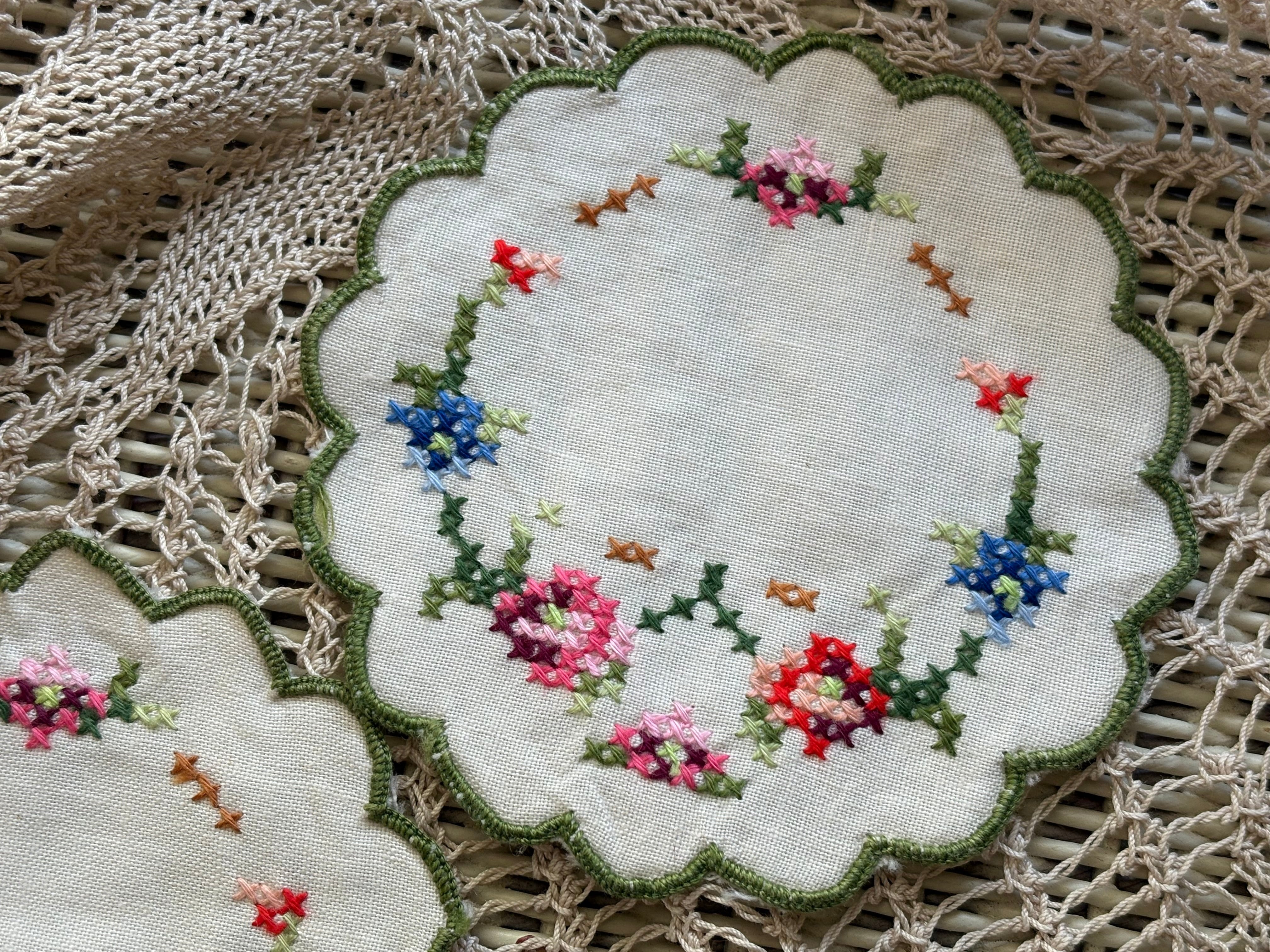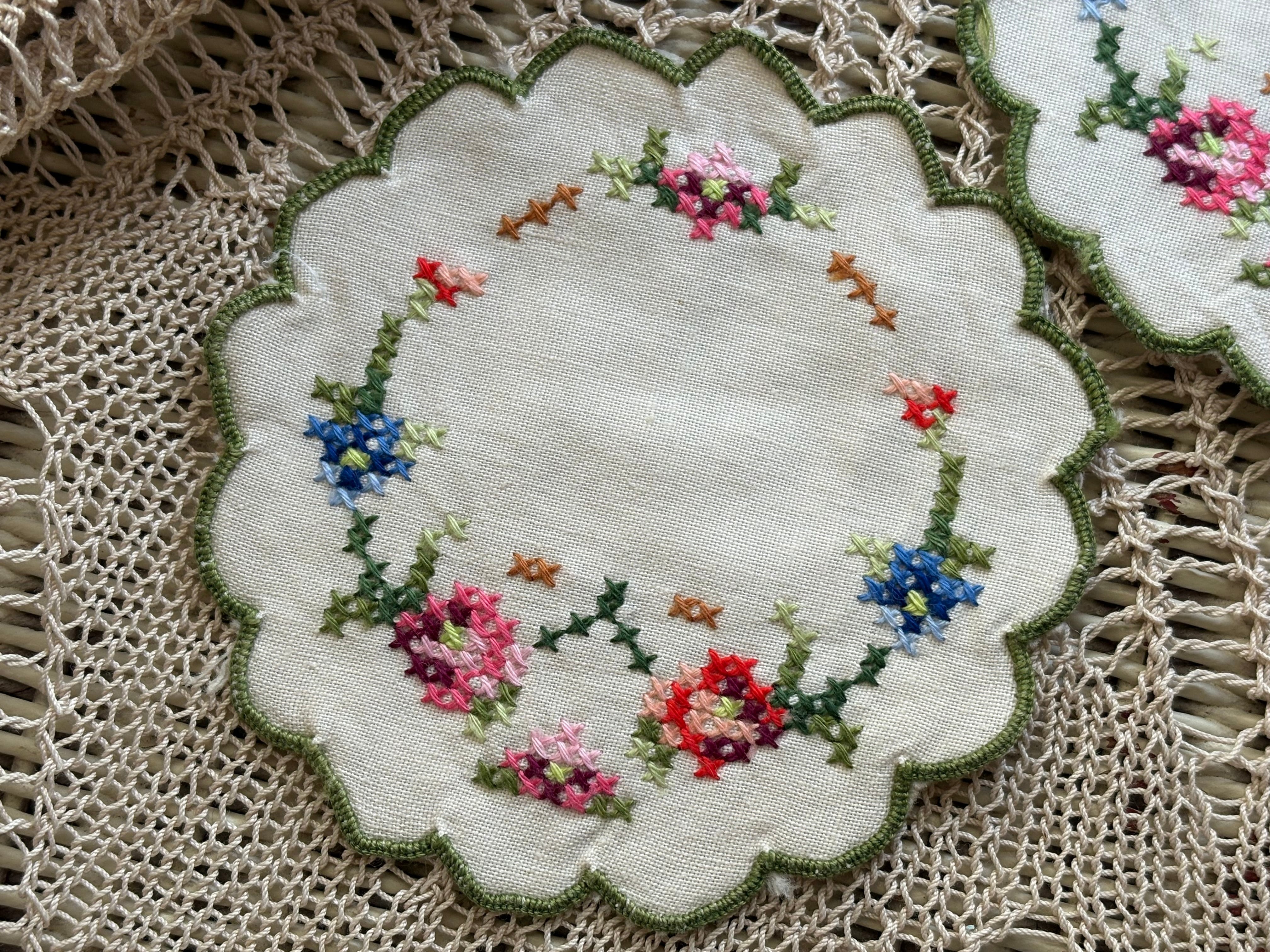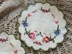 手仕事の小さなドイリーです。スカラップ、お花のクロスステッチが可愛く素朴で素敵です。