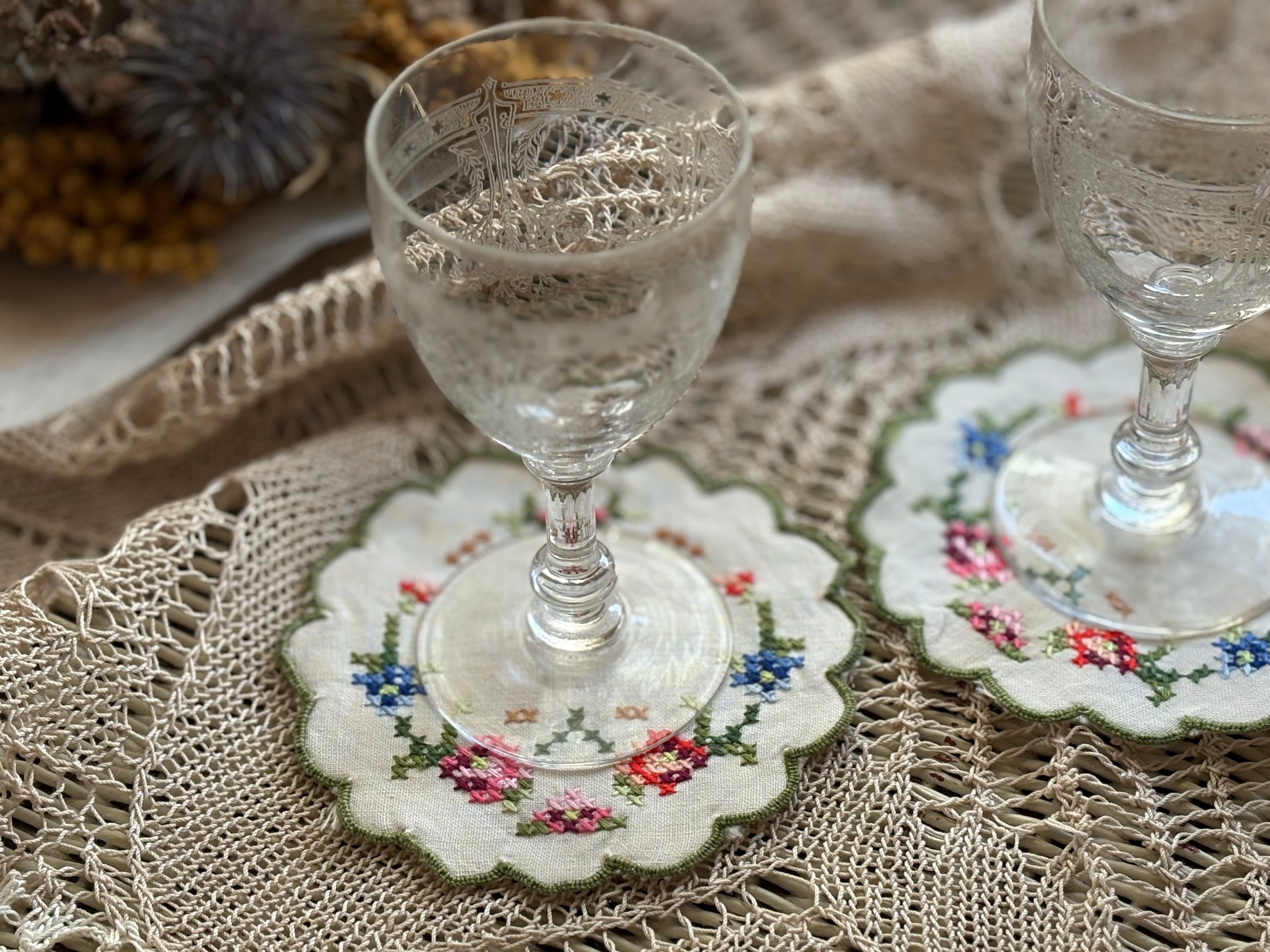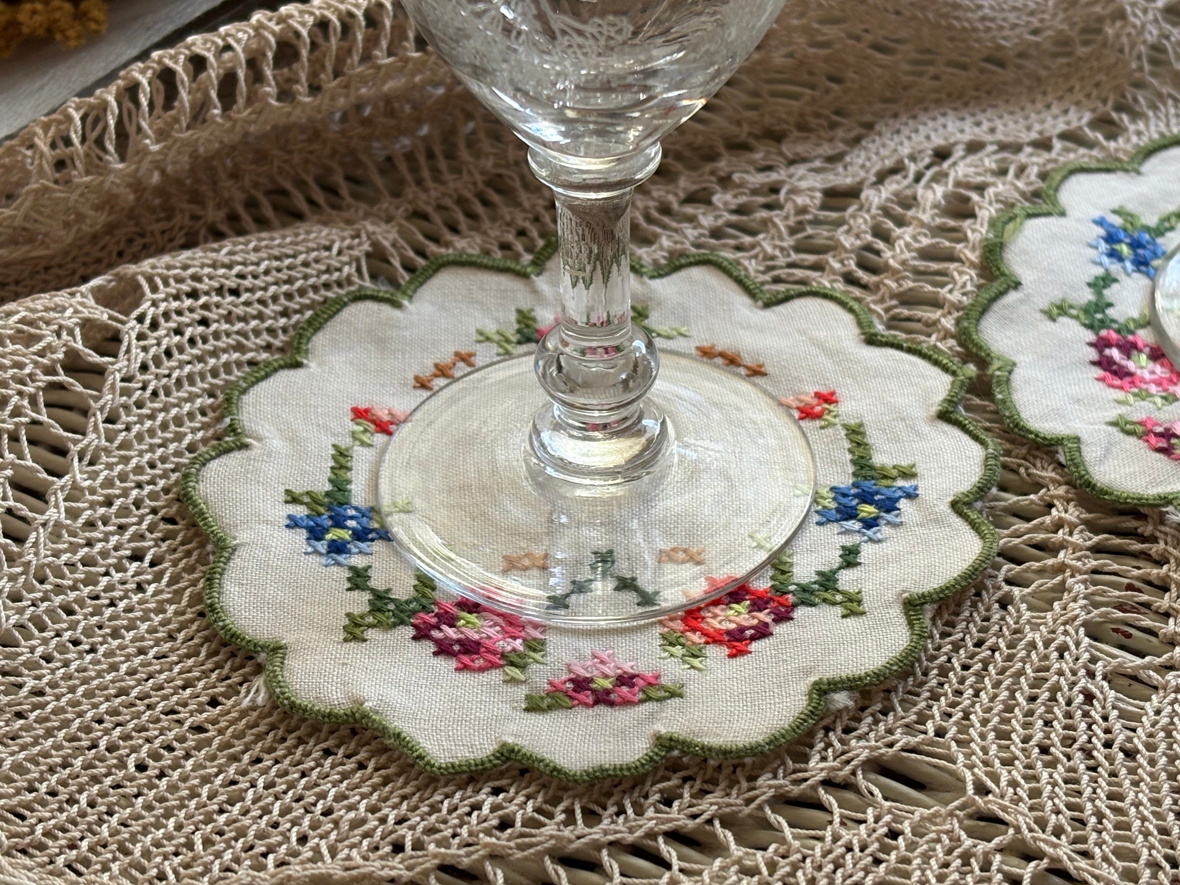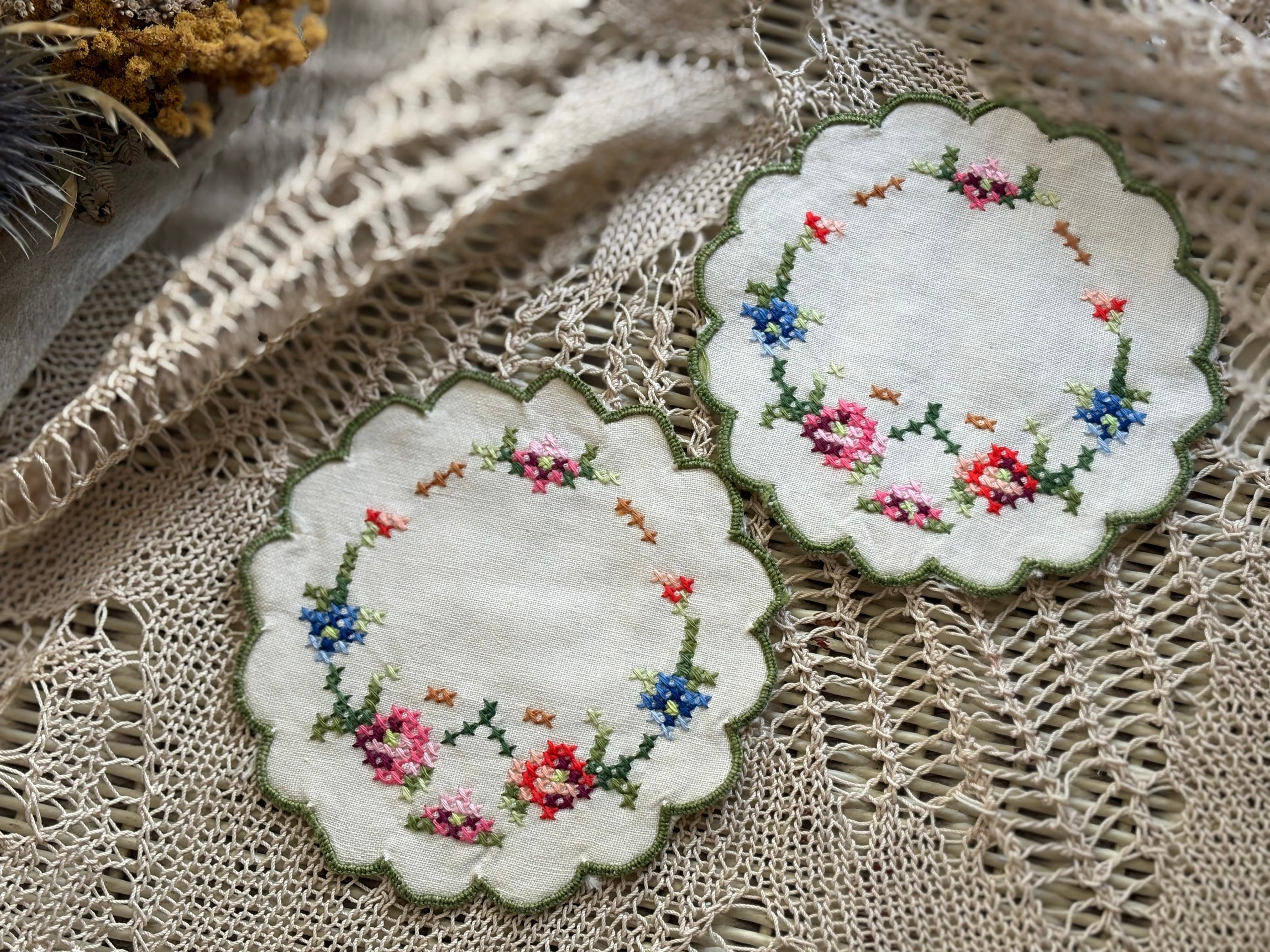 手仕事の小さなドイリーです。スカラップ、お花のクロスステッチが可愛く素朴で素敵です。