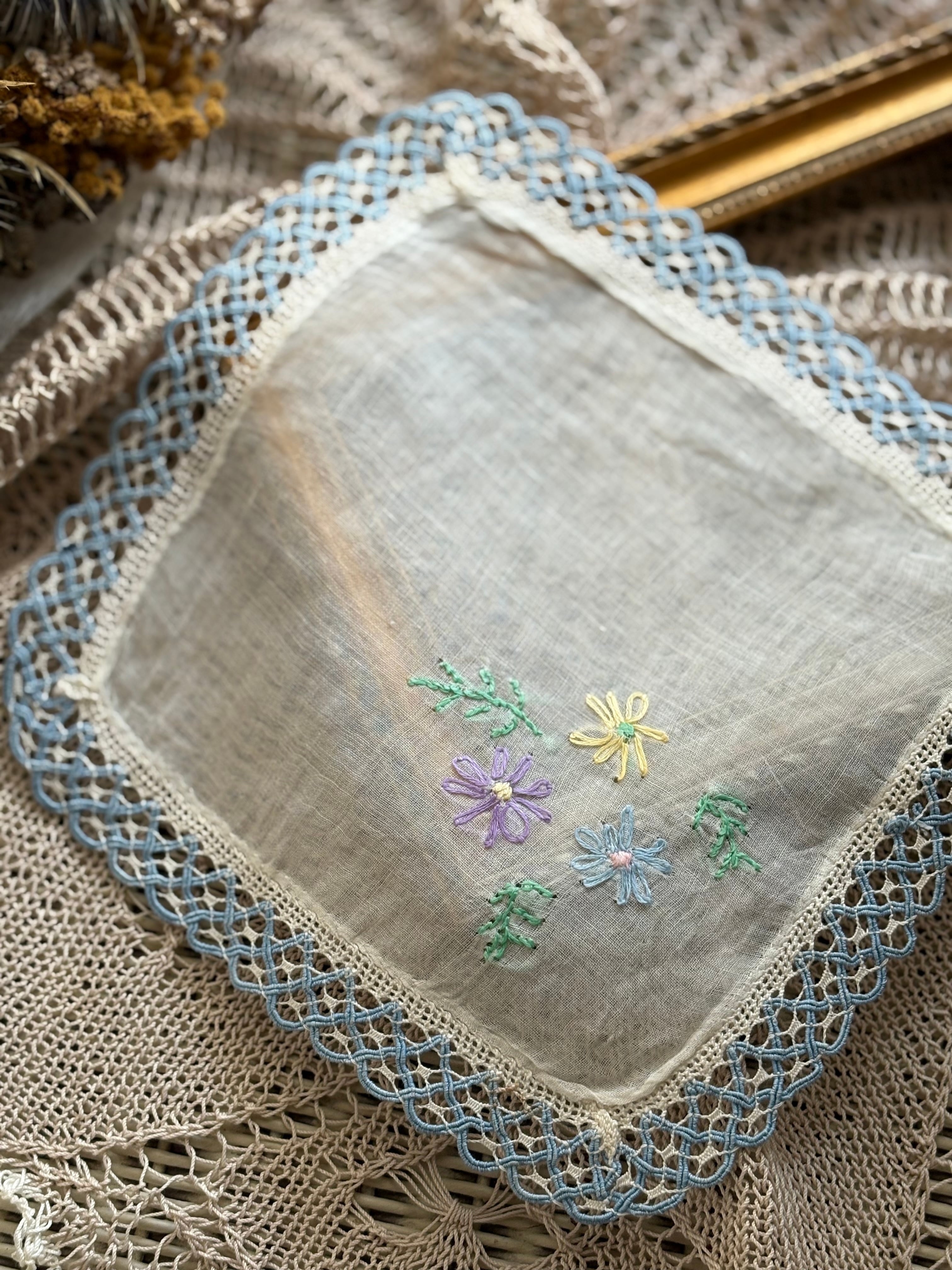 フランスVintageドイリー 小花 刺繍 敷物 17.5cm ライトブルー インテリア小物 ハンドメイド素材 撮影小物