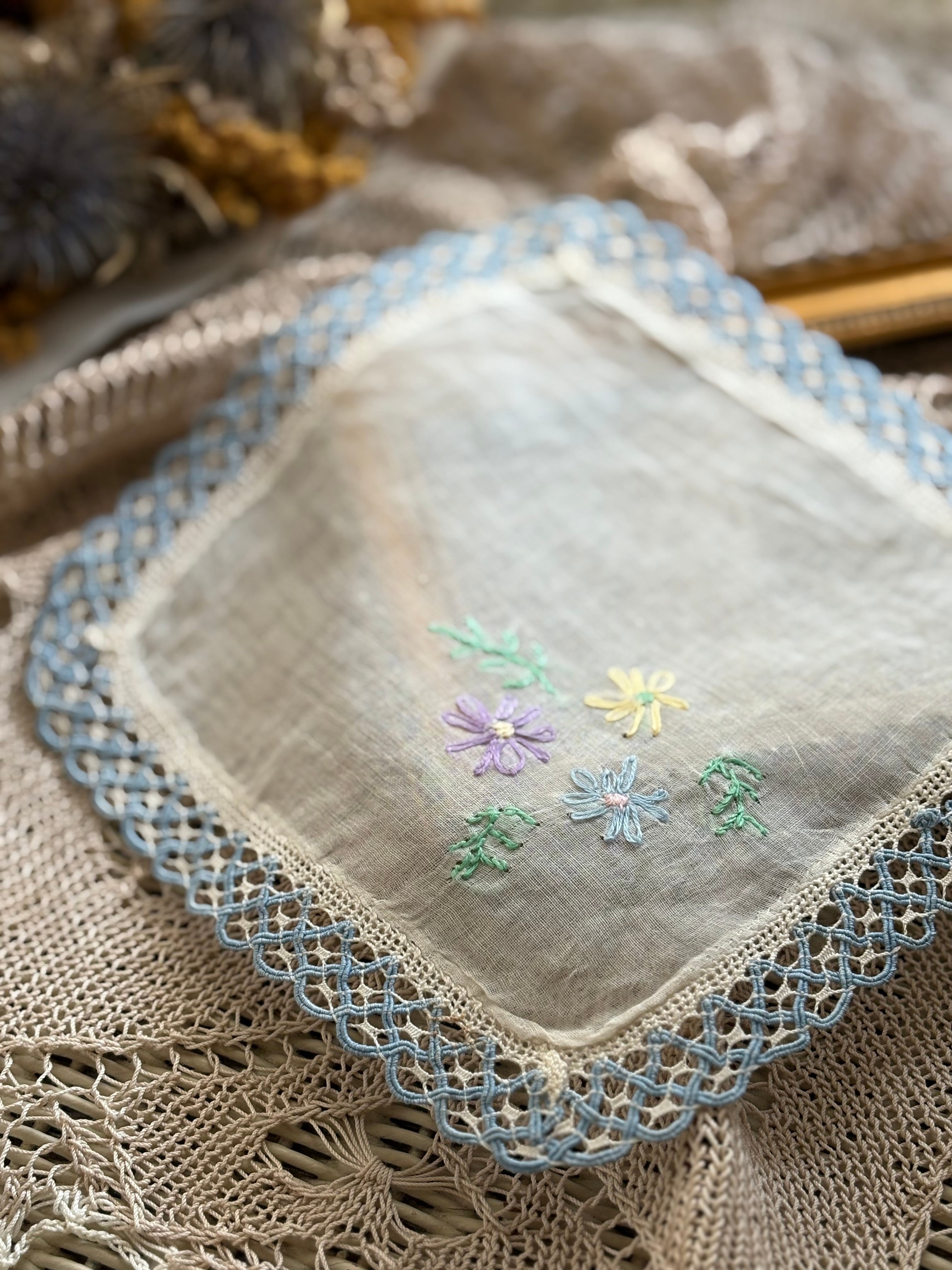 薄い生地に淡いライトブルー、イエロー、パープルの小花が刺繍されています。