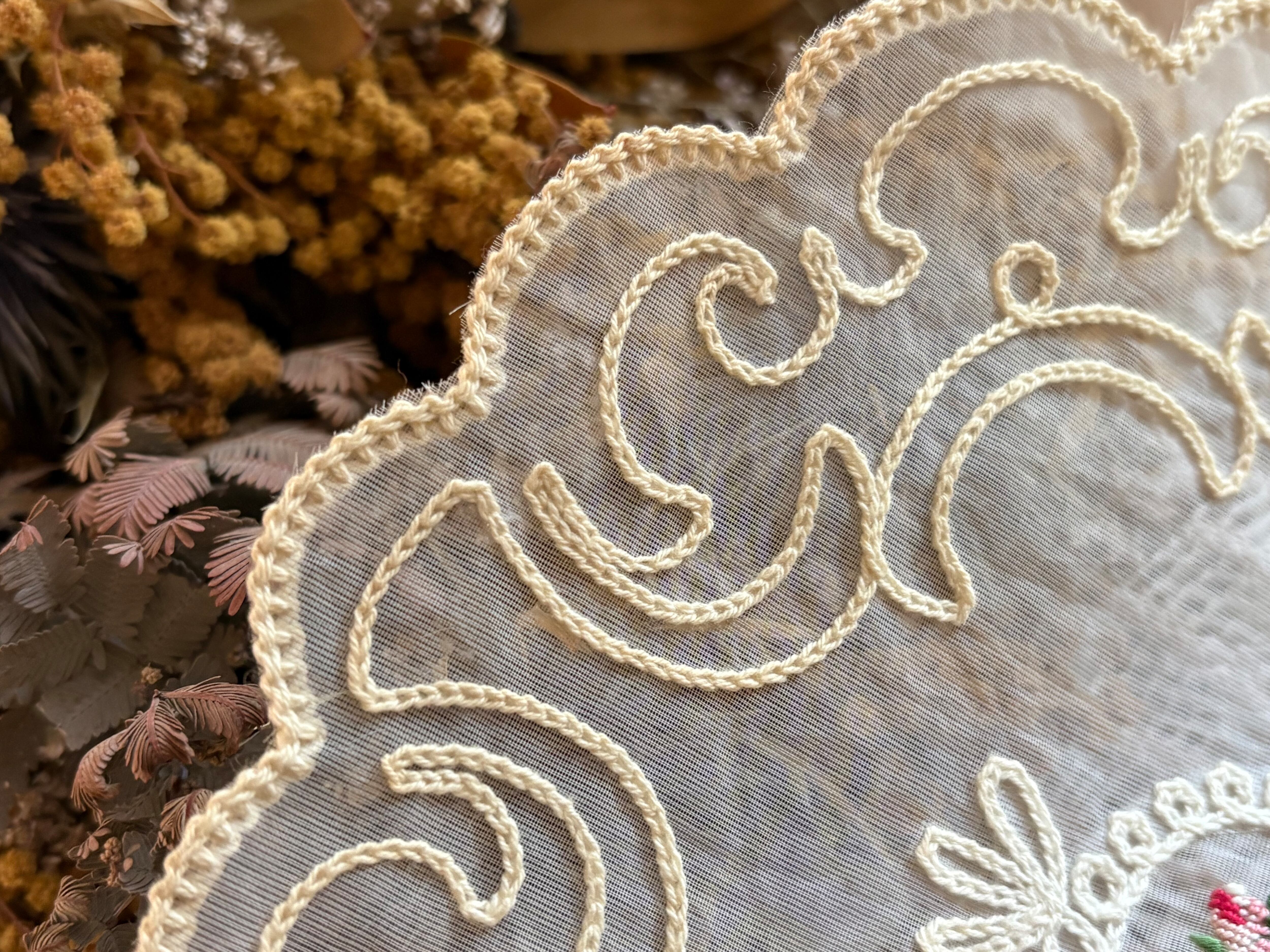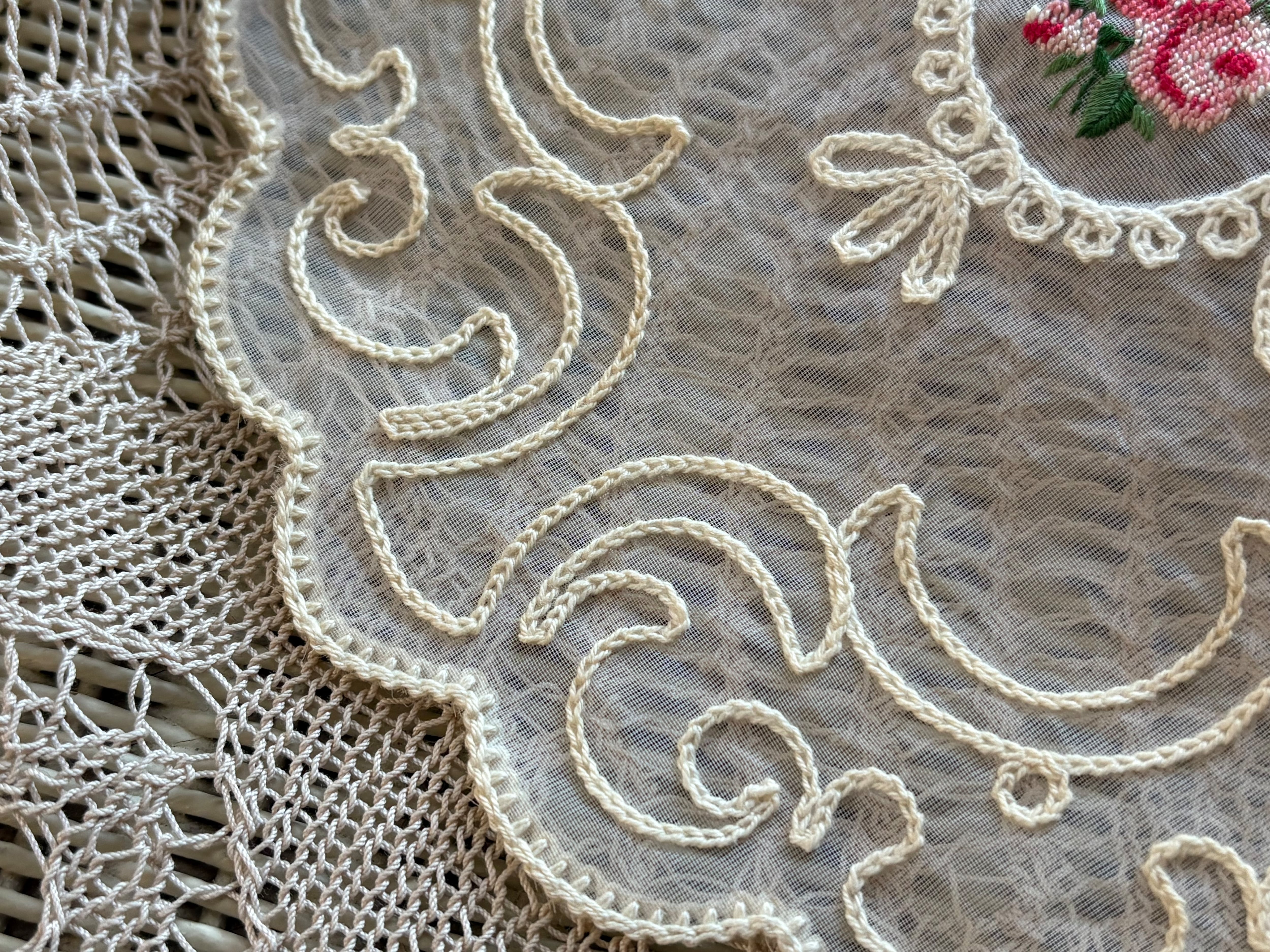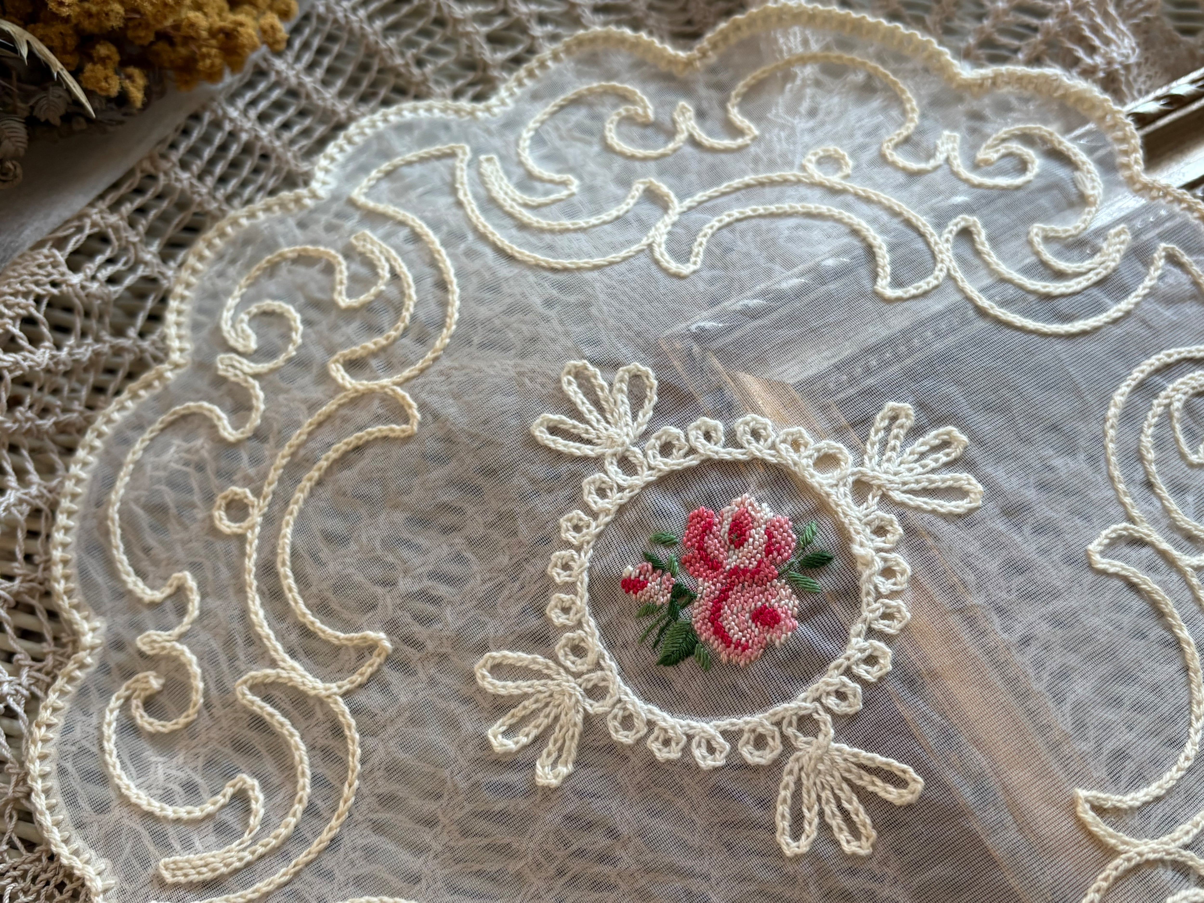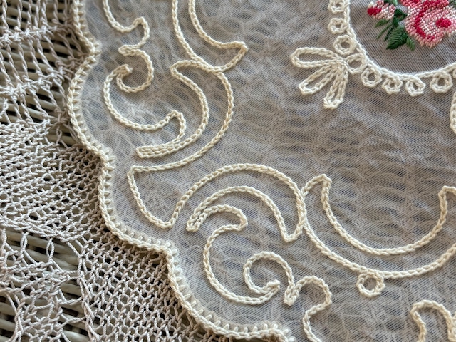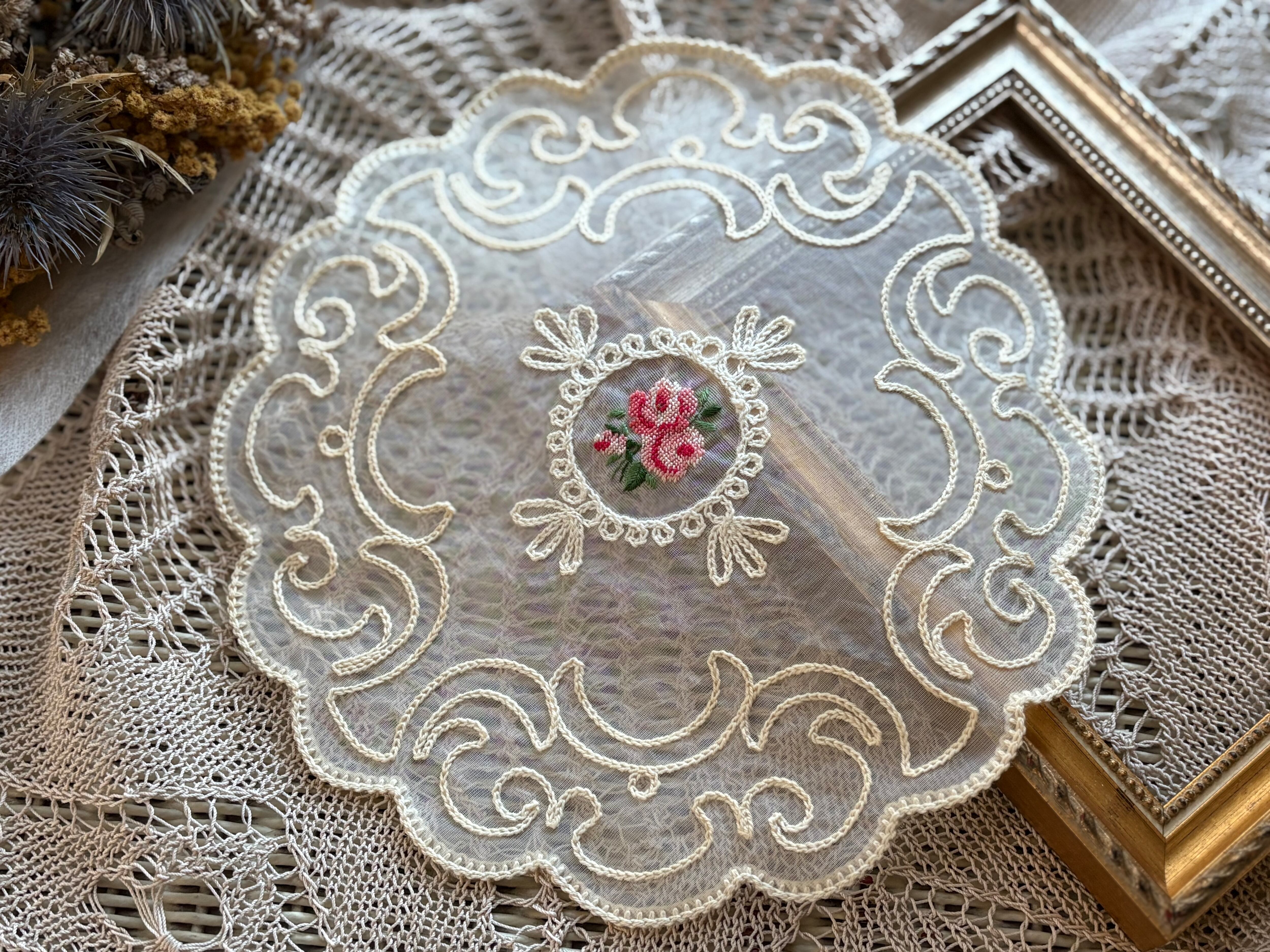 フランス Vintage ヴィンテージ Roseの刺繍 ドイリー プチポワン 敷物 ハンドメイド素材 インテリア小物 カットワーク