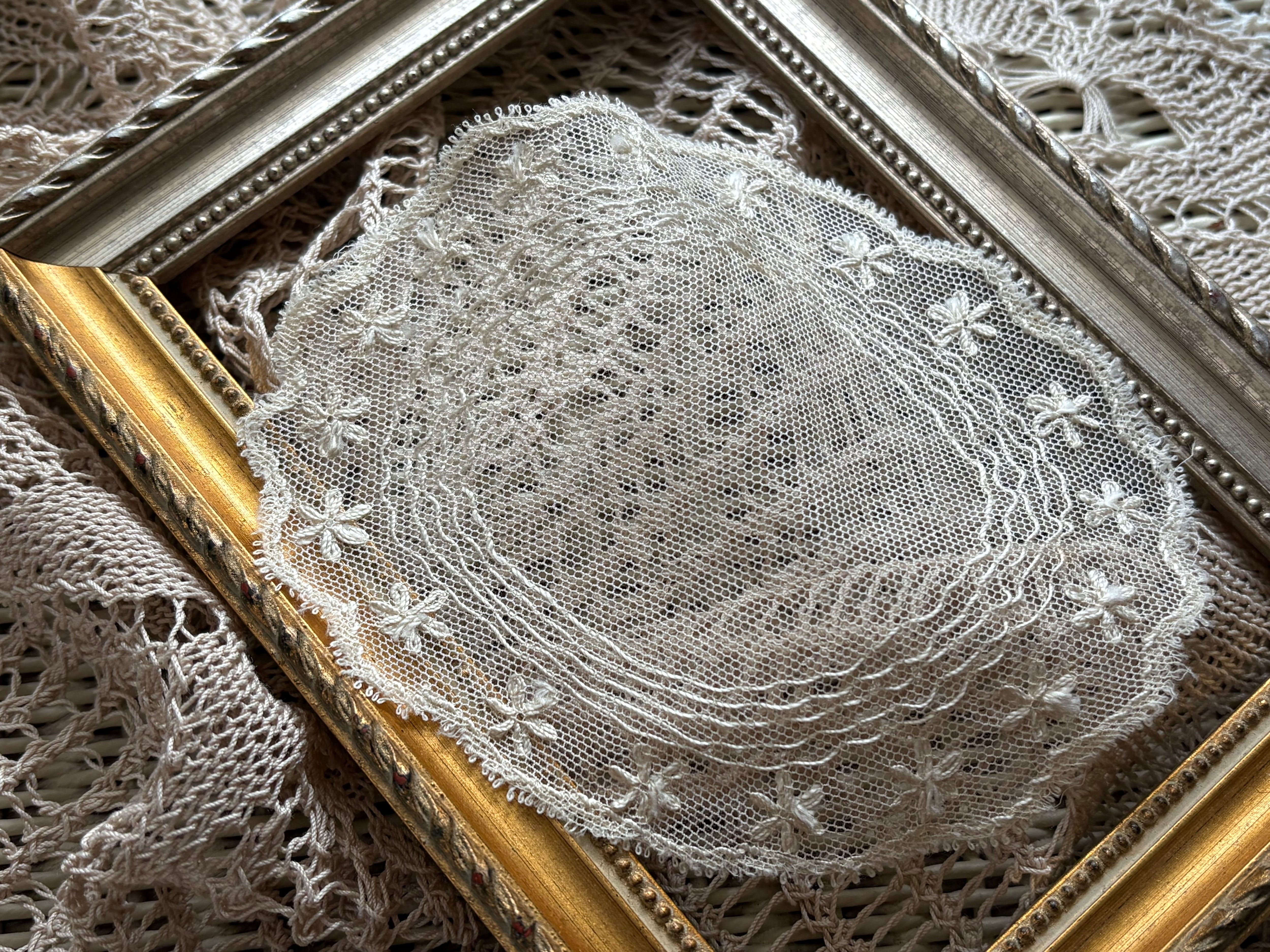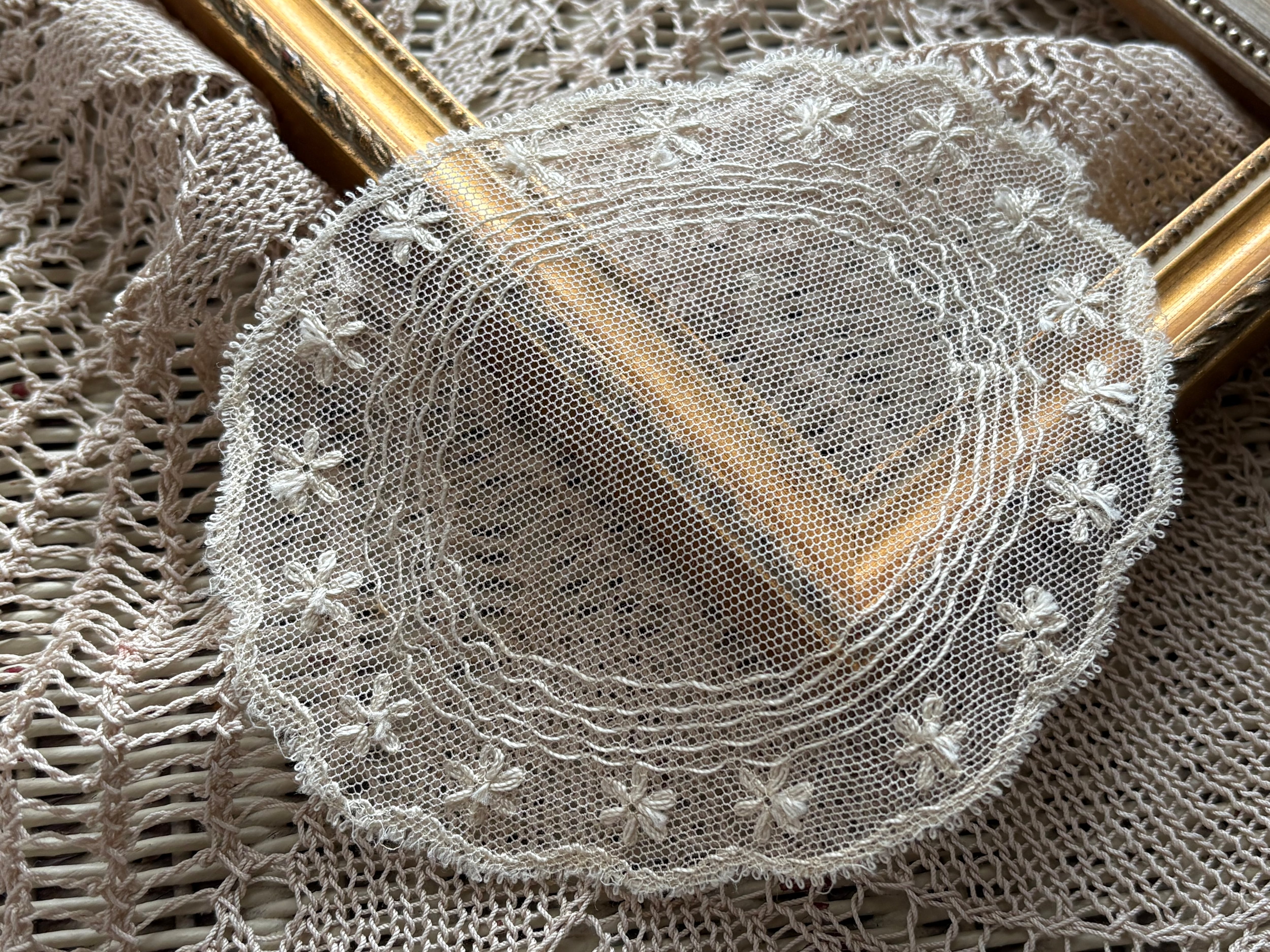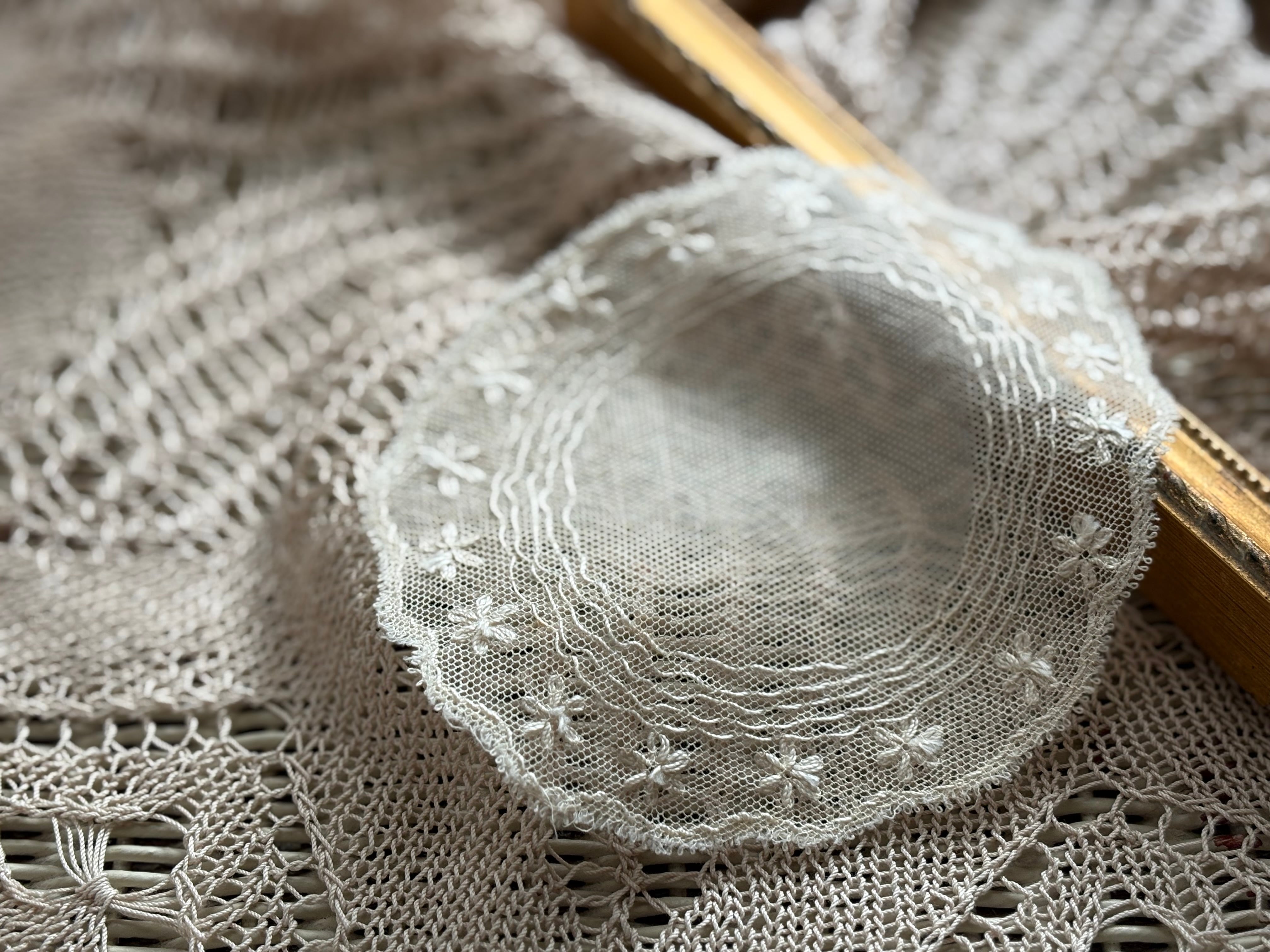 フランスVintage 小さなチュールレースドイリー エクリュ フラワー モチーフ 敷物 インテリア ハンドメイド素材