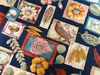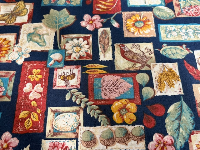 蜜蜂、鳥、蝶々、トンボ、シャンピニオン、どんぐりその他様々な自然の動植物がプリントされています。