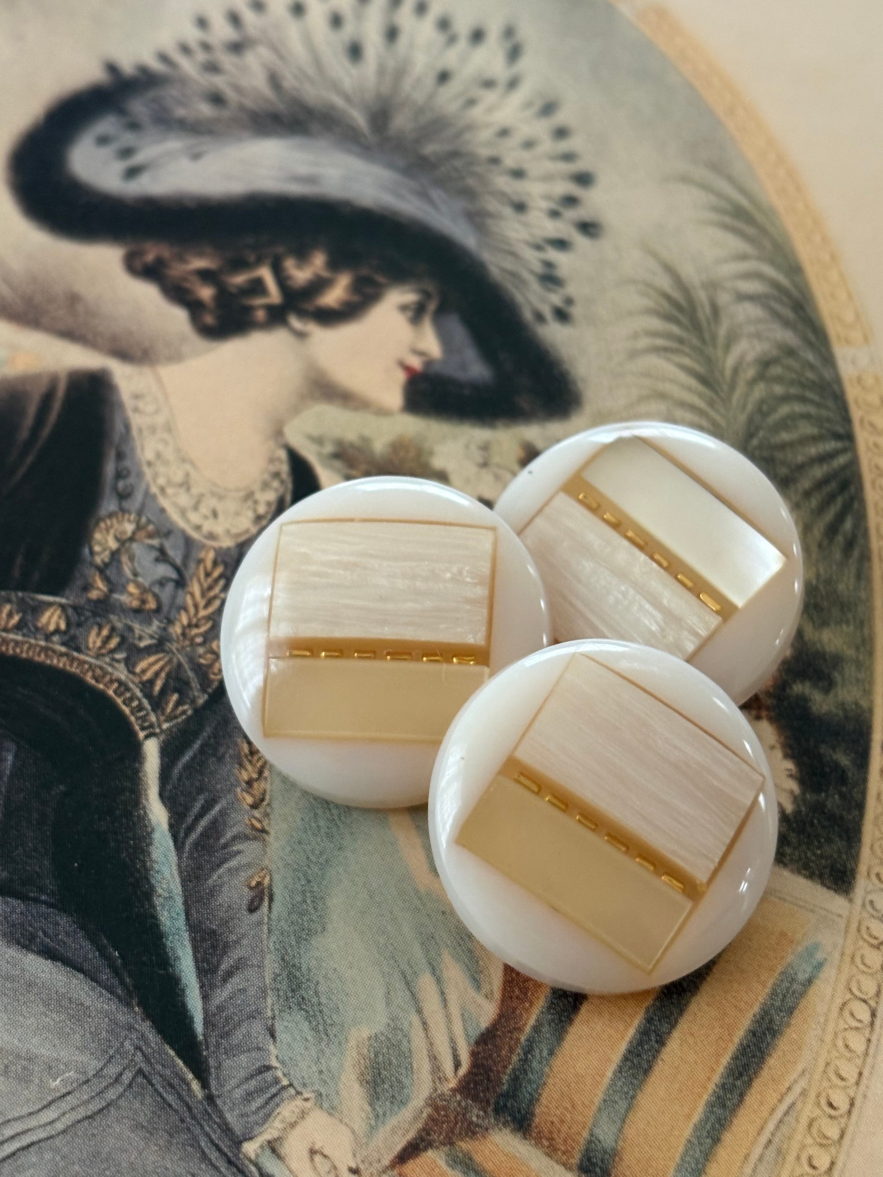 ミルキーなホワイトカラーの樹脂ボタンの内側にエレガントなシェル、ゴールドのパーツ、同系色のカボションが閉じ込められています。