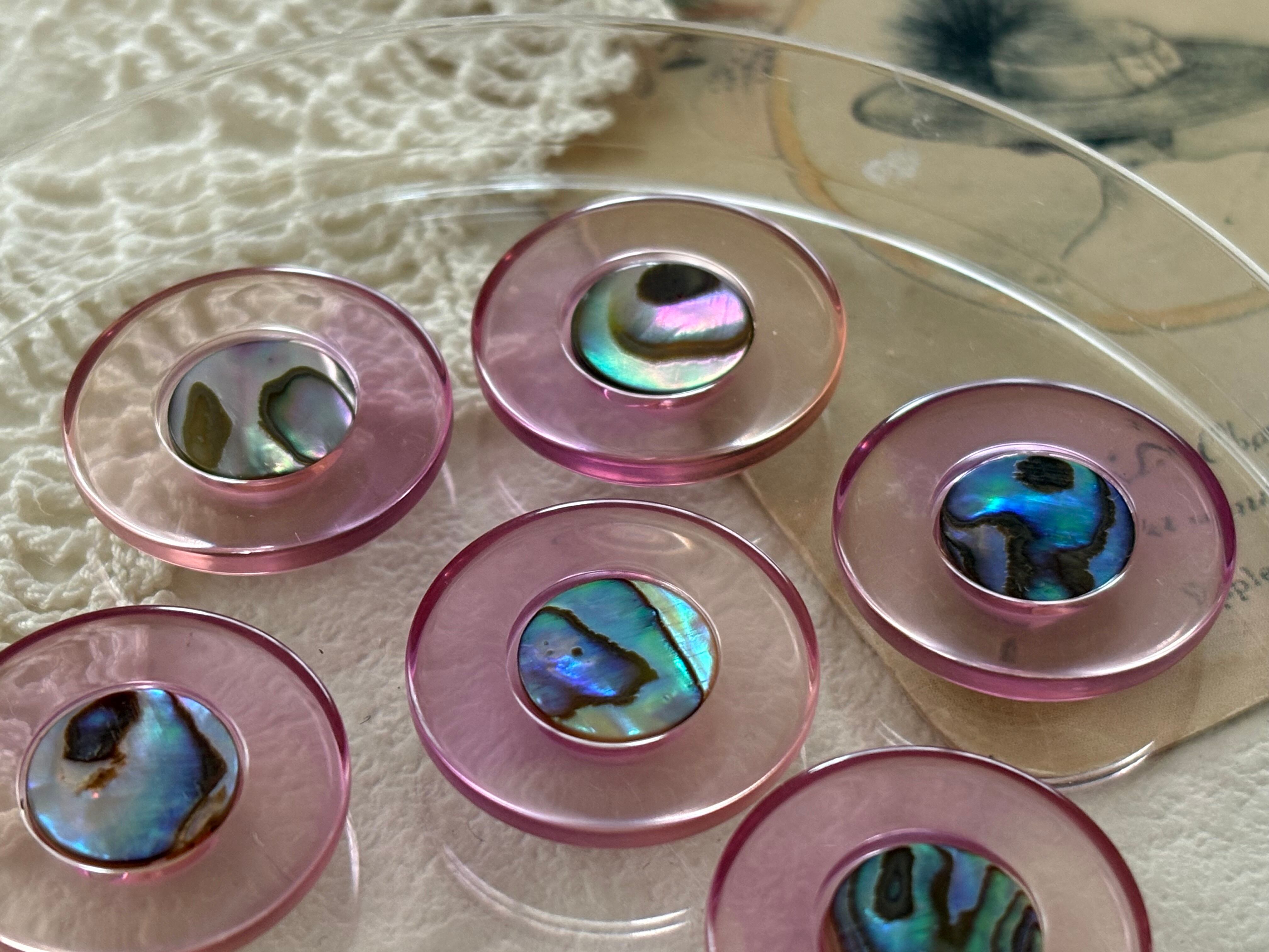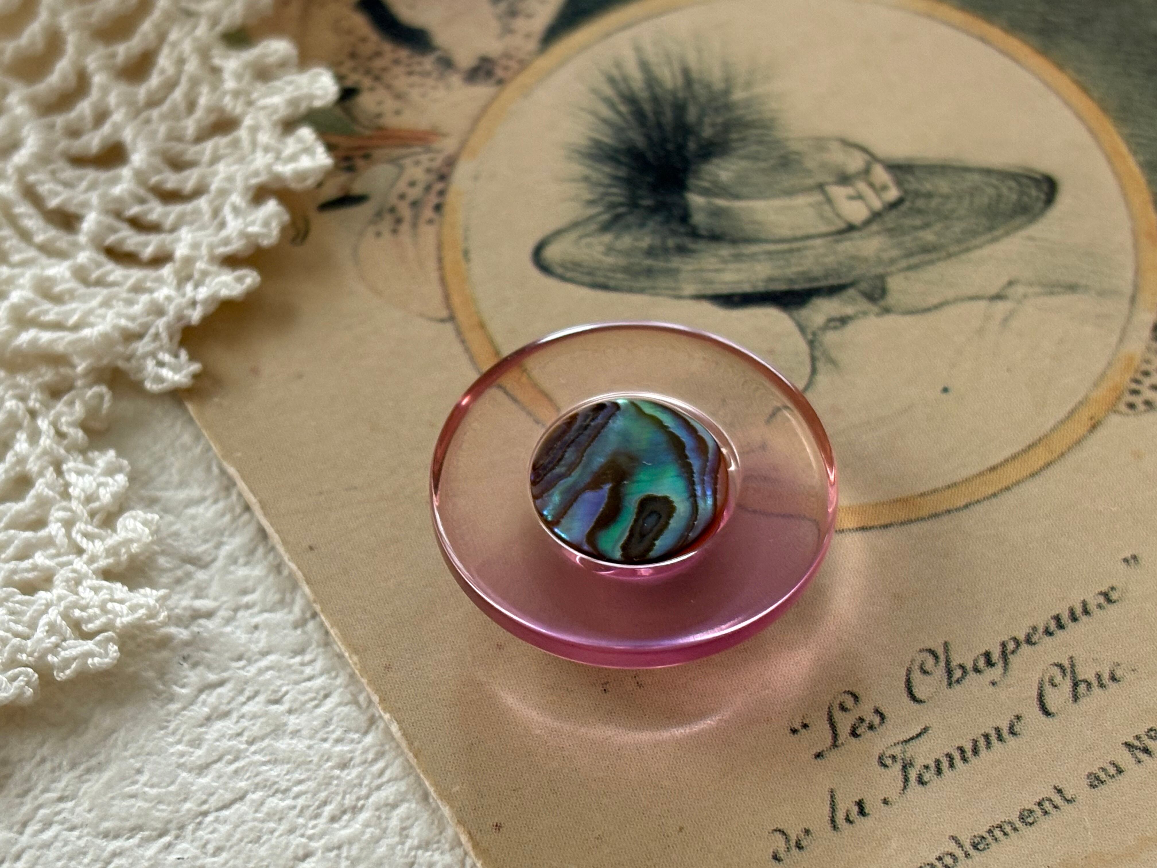 クリアピンクの樹脂ボタンの中央に美しく輝くシェルの装飾。