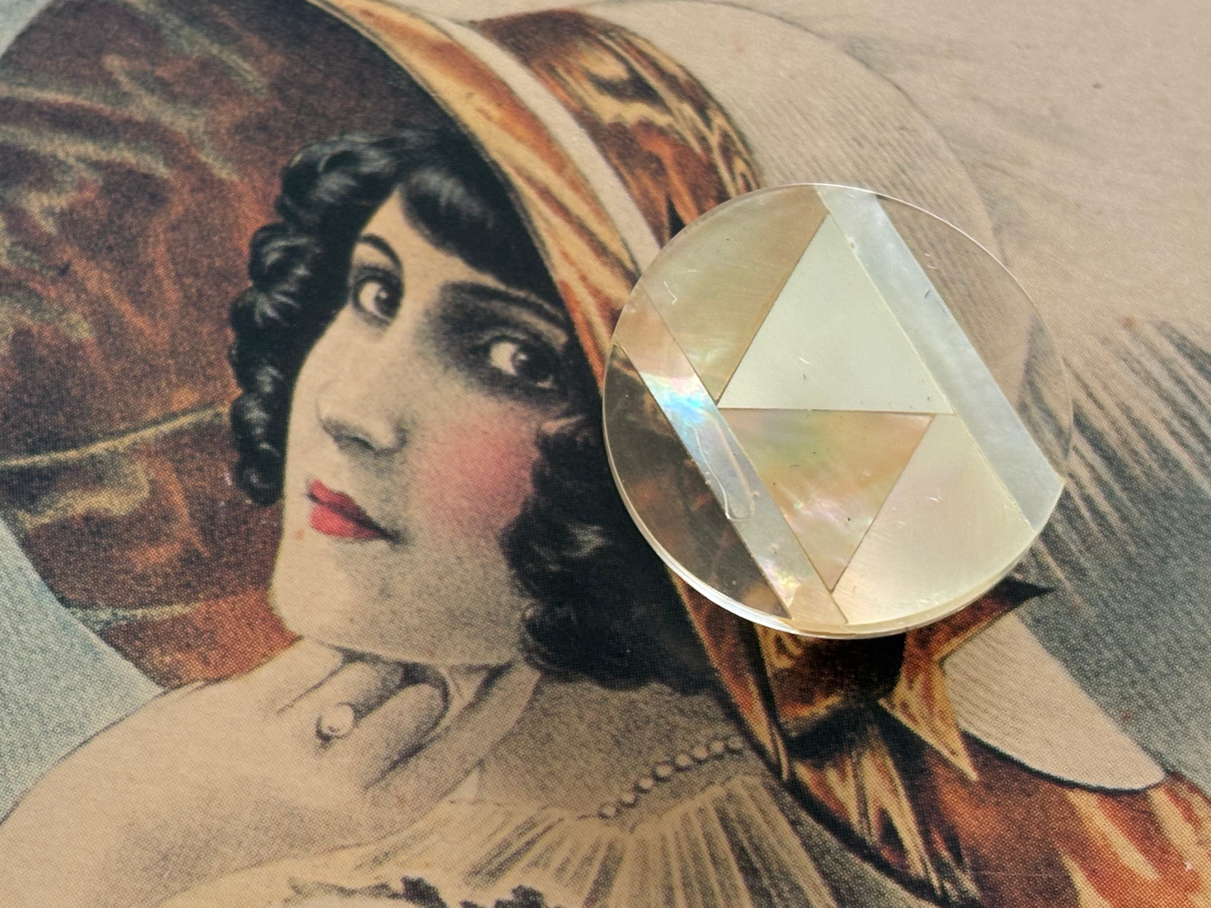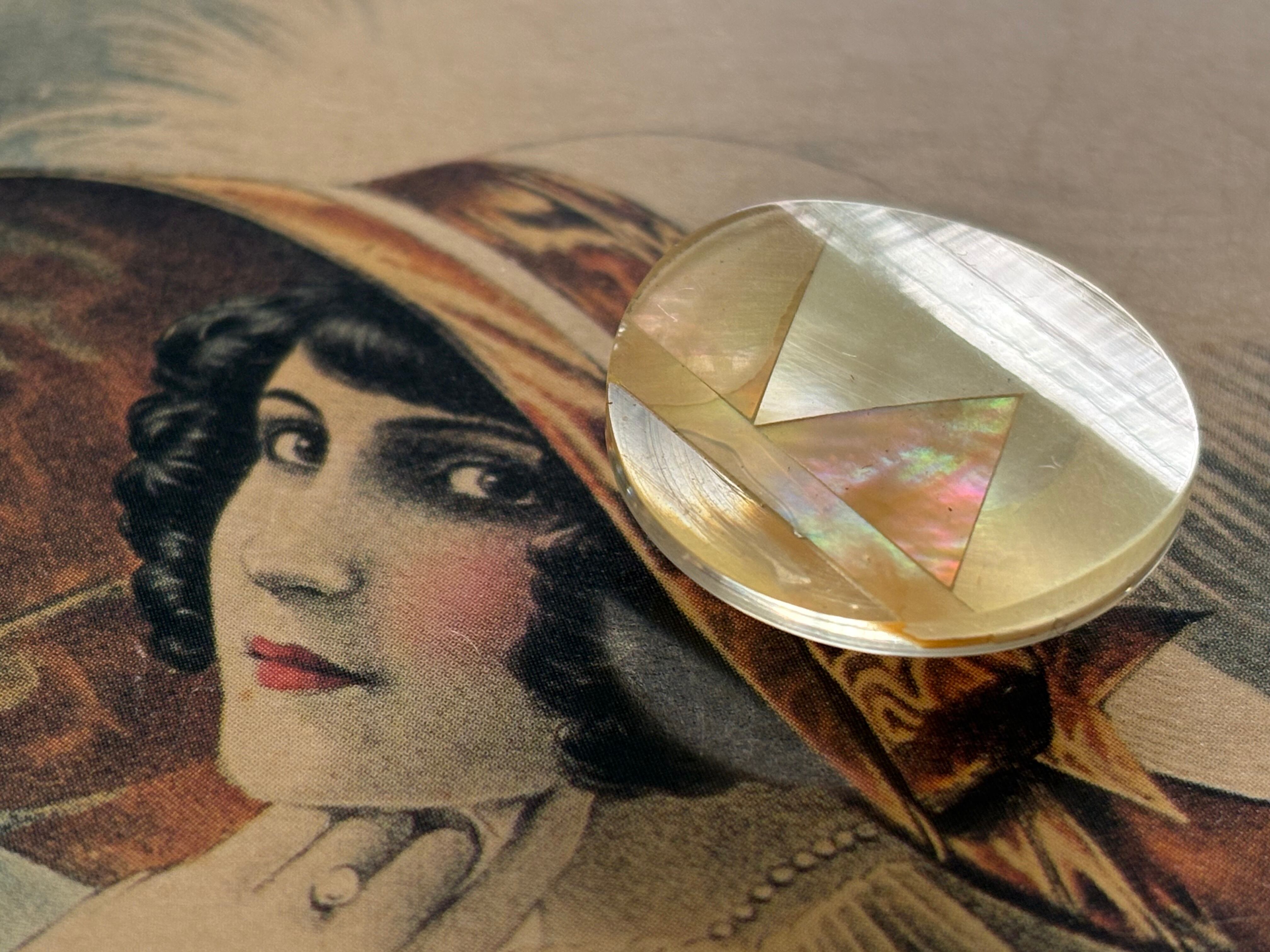 クリアな樹脂ボタンに上品で存在感のあるシェルの輝きがエレガントで美しいボタンです。