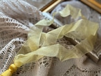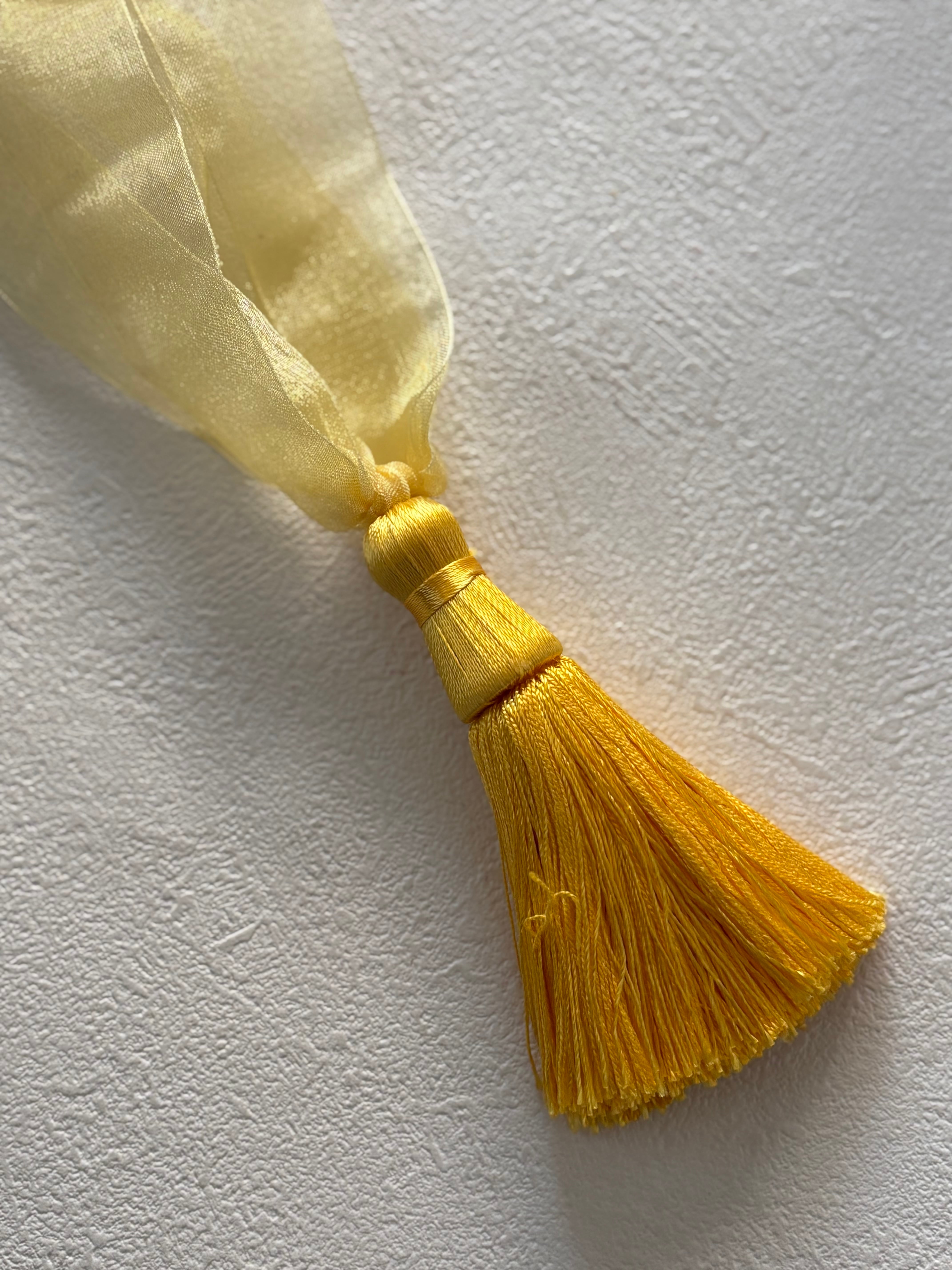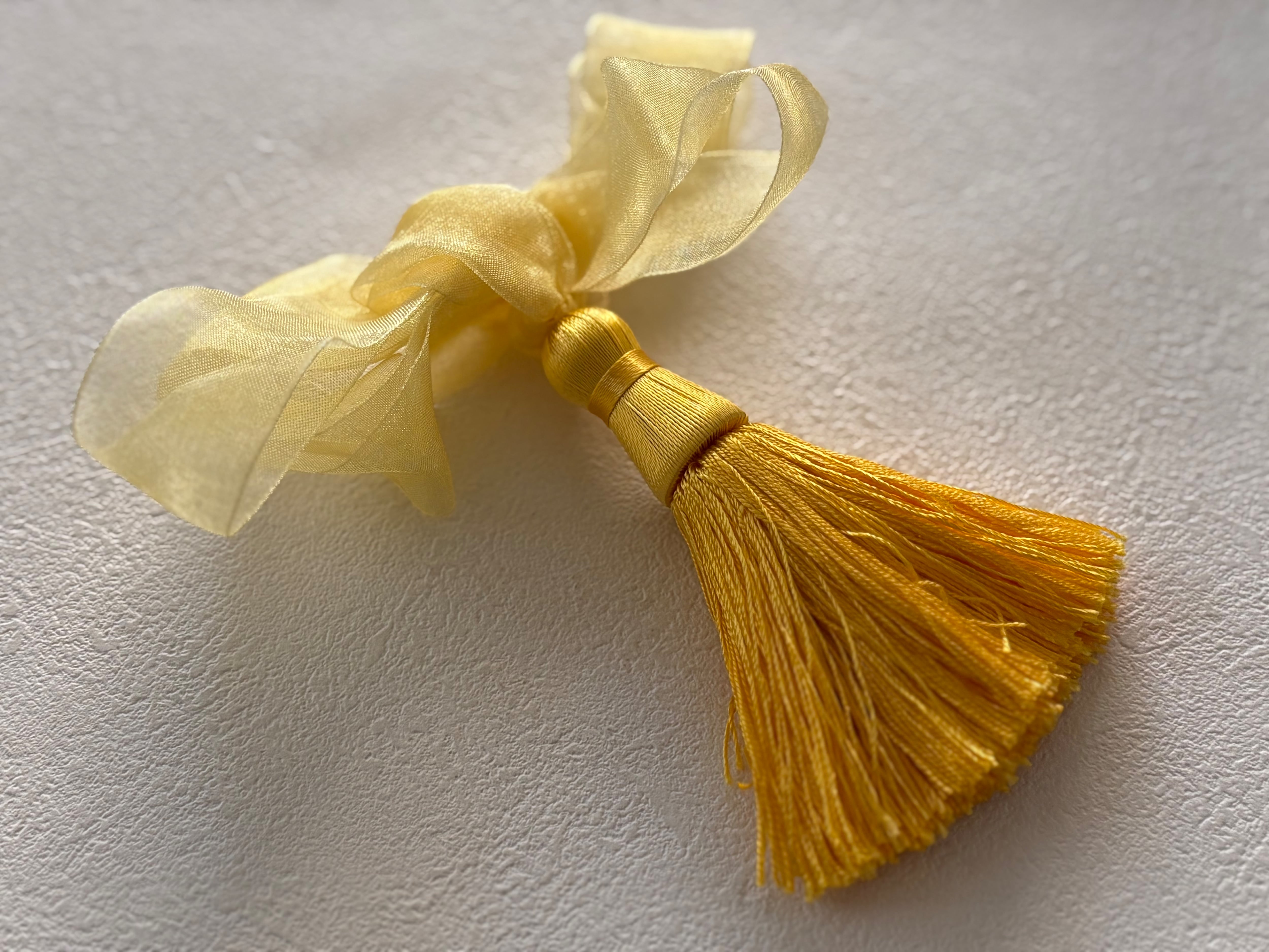 イエローカラーのオーガンジーのリボン、艶やかで美しいインテリアタッセルです。