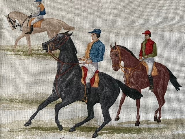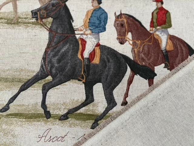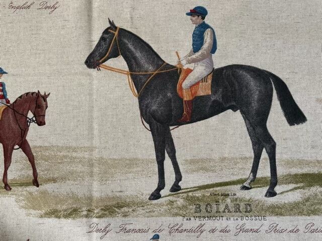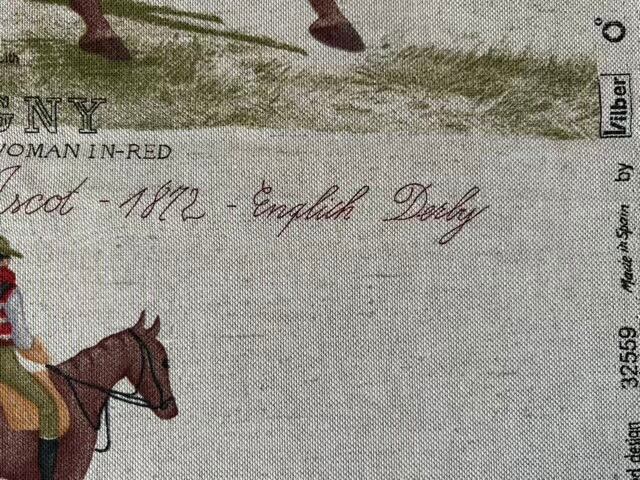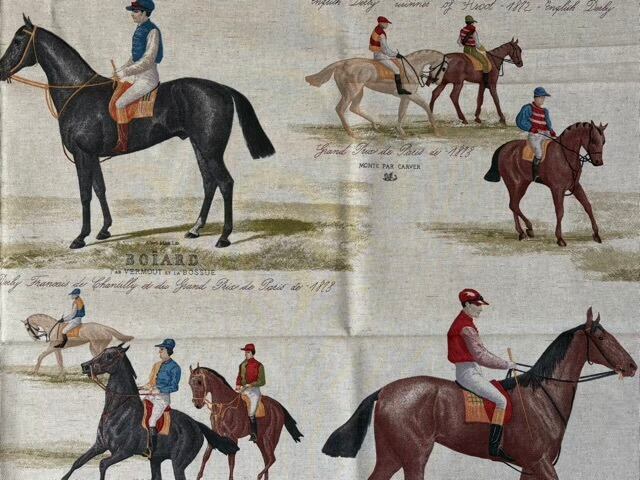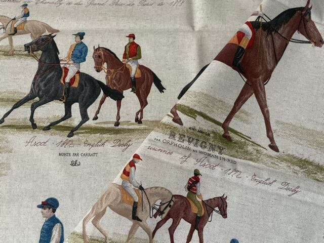 一面に英国、フランスで行われた1872年、1873年に行われたダービーのデザインがプリントされたファブリックです。