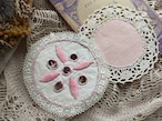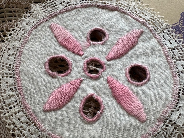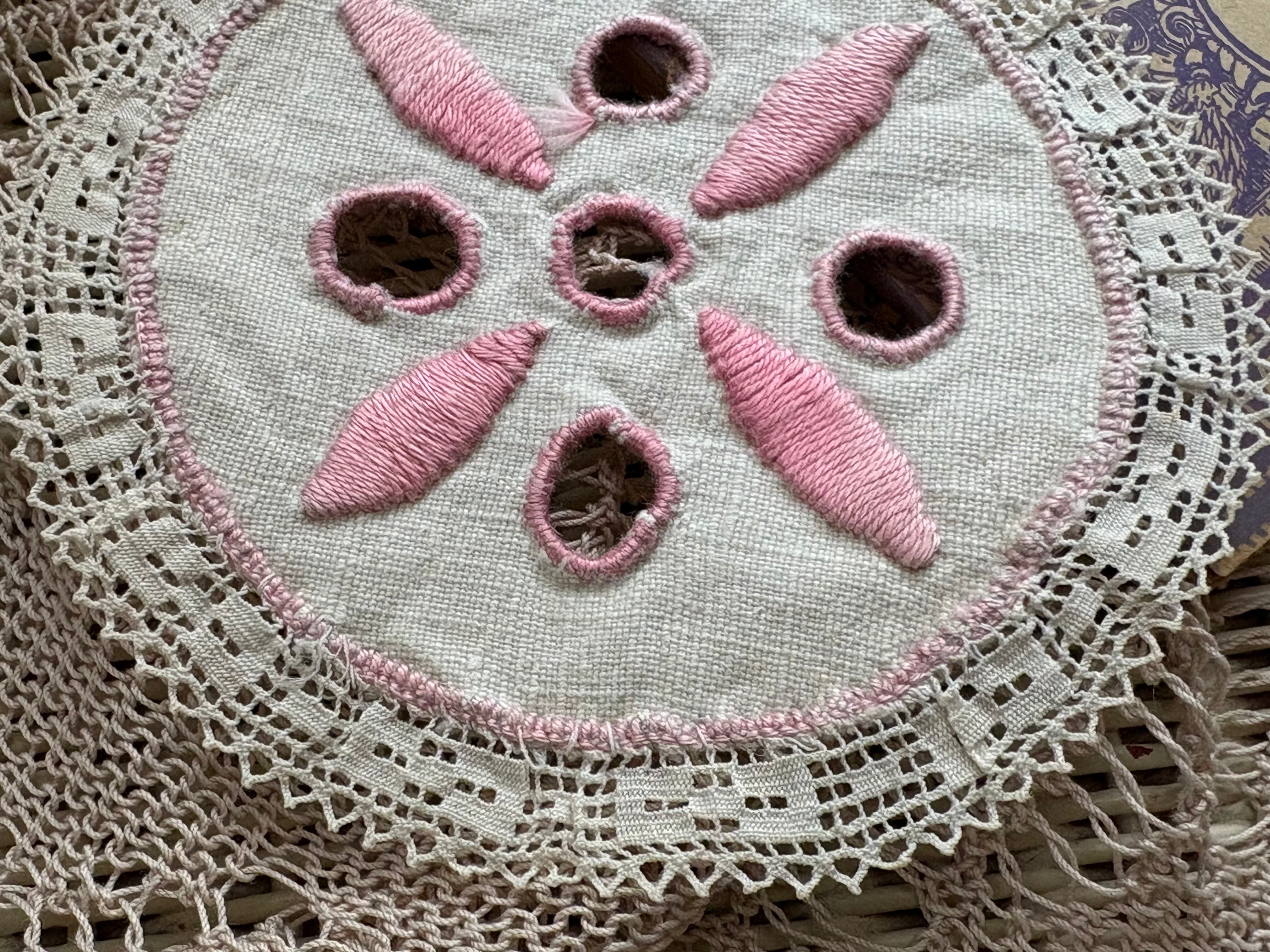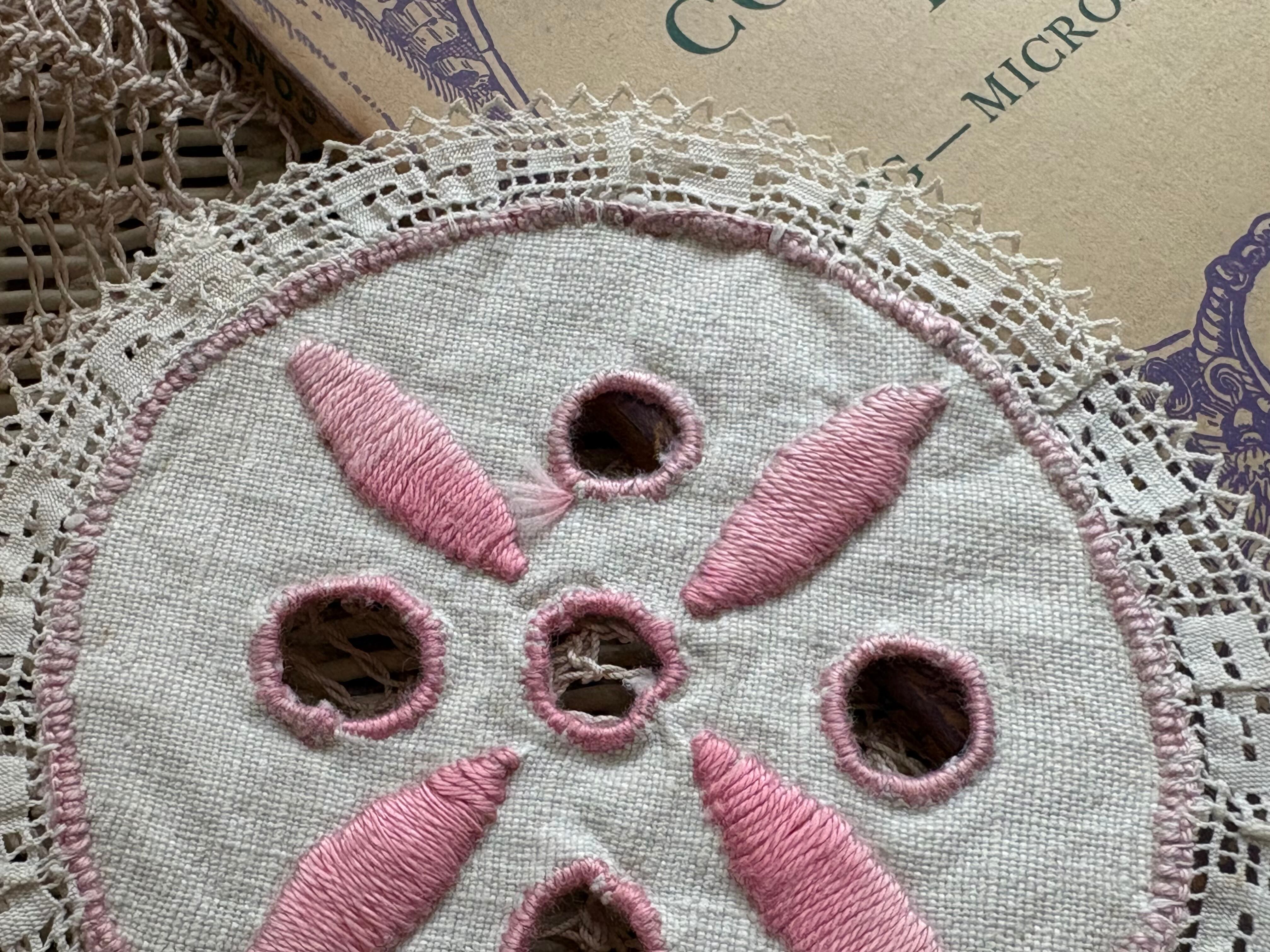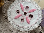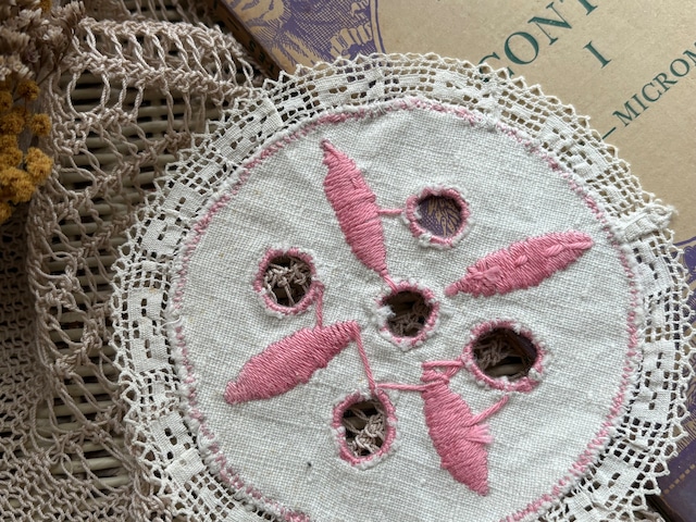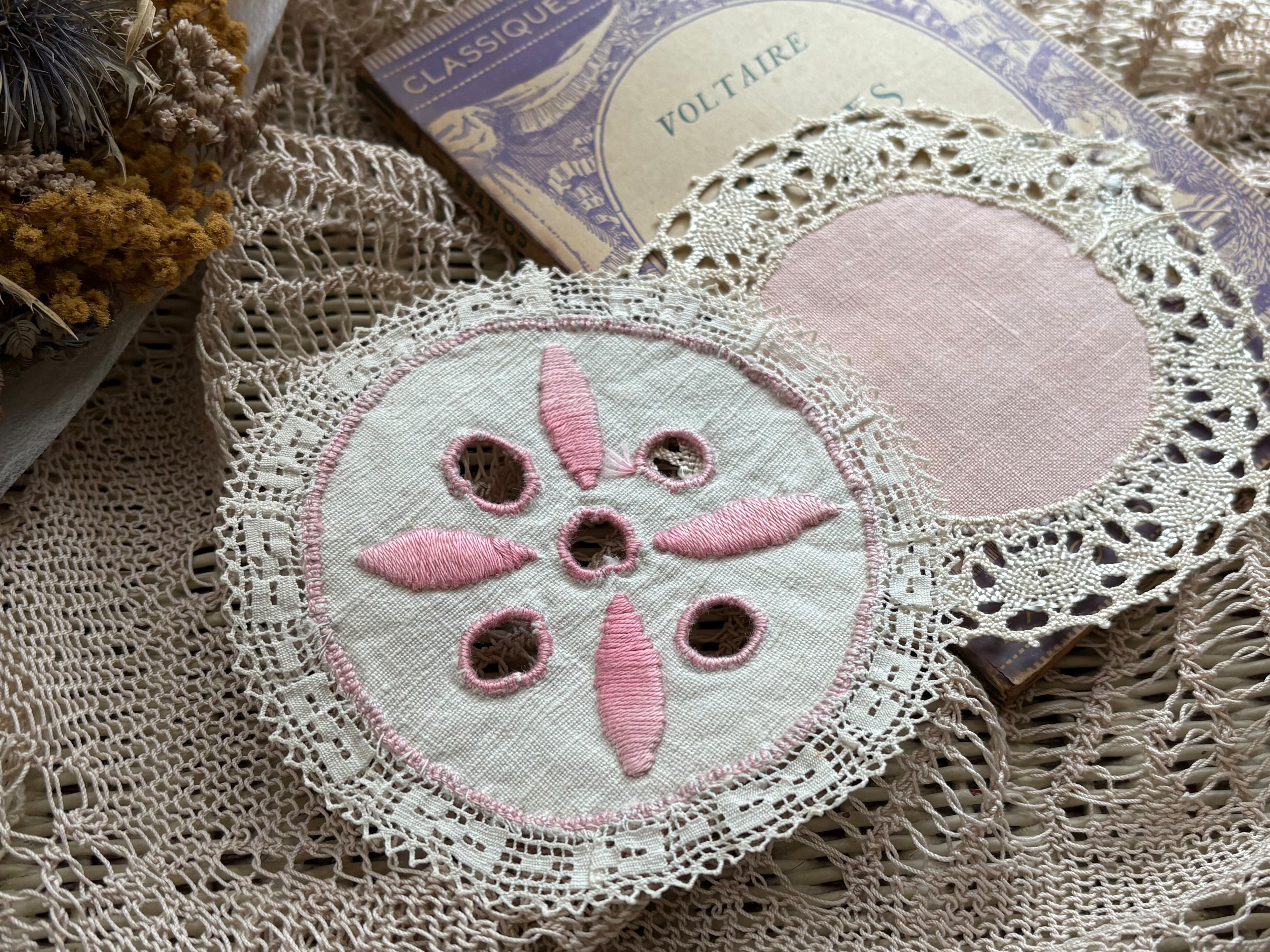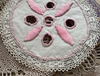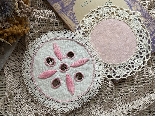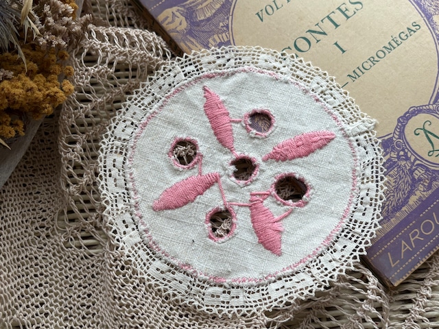 フランスアンティーク ミニドイリー 手刺繍 ピンク カットワーク 敷物 ハンドメイドパーツ インテリア小物 額装