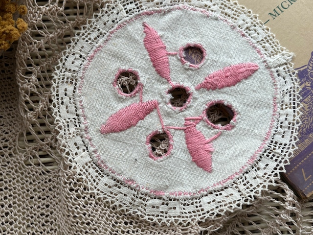 ピンクの手刺繍、カットワークが小さなサイズですが目をひくデザイン。