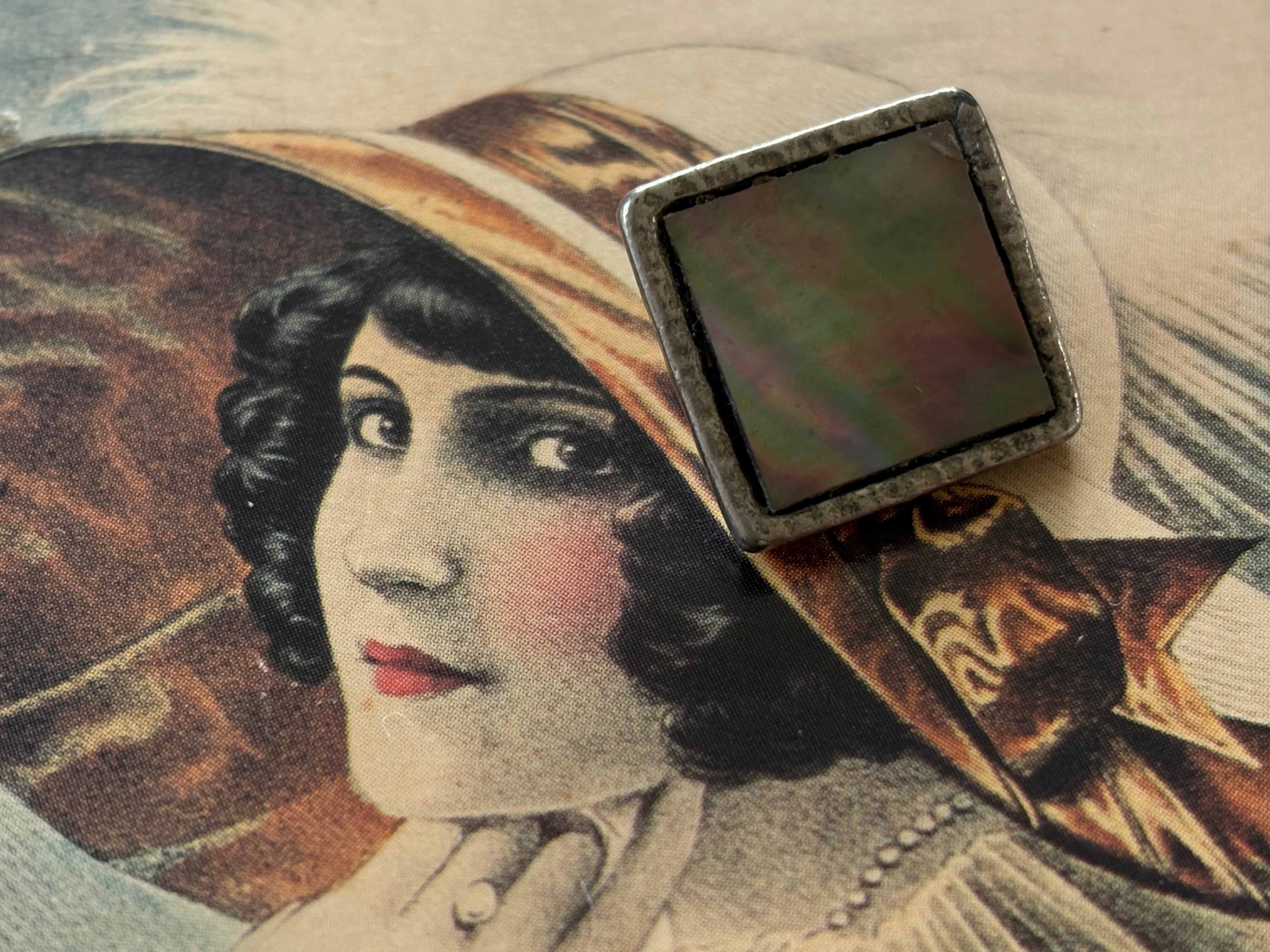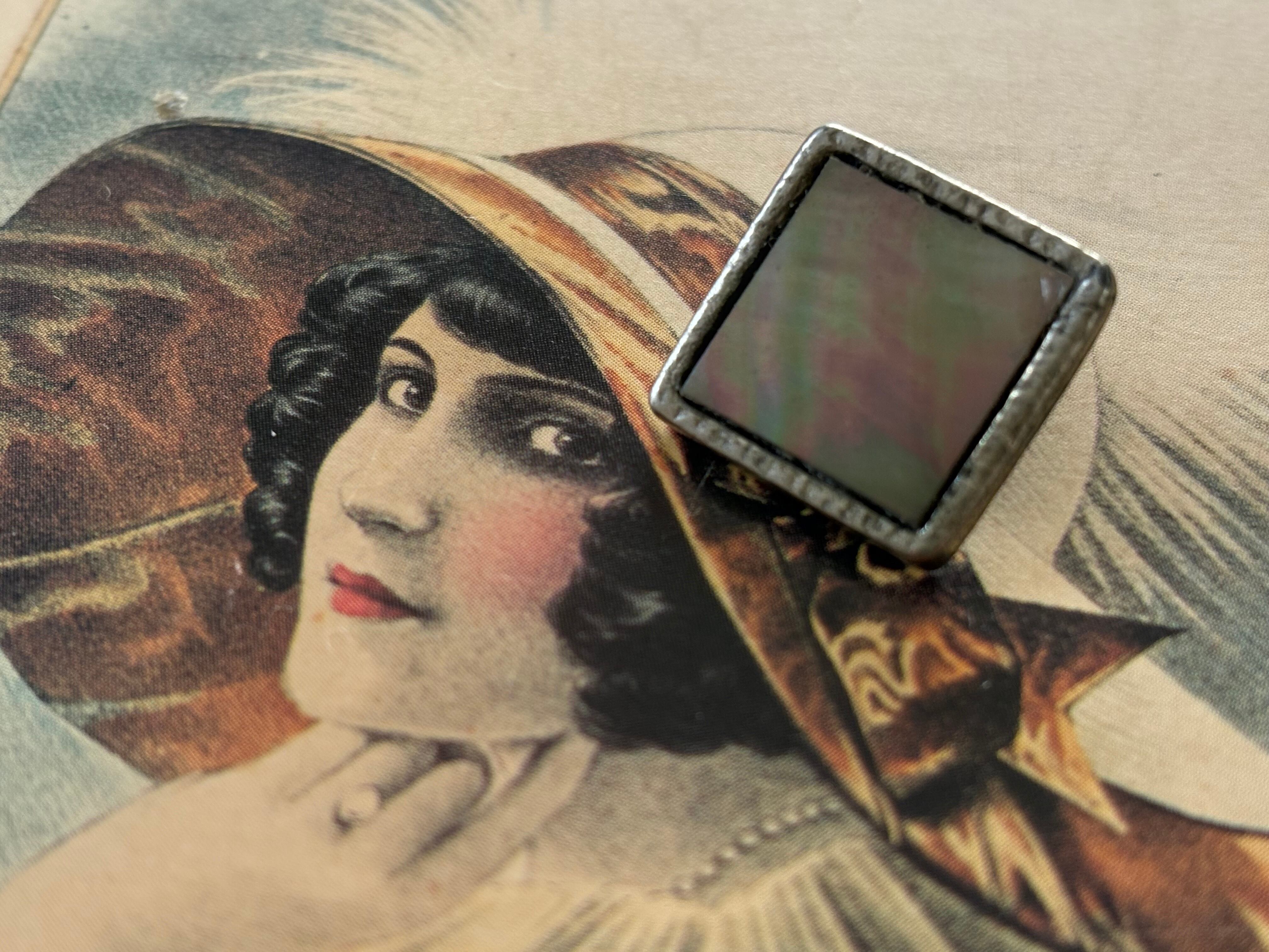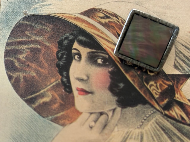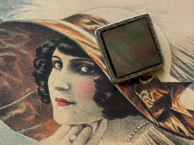 スクウェア型のシルバーカラーの台座にシェルのカボション。