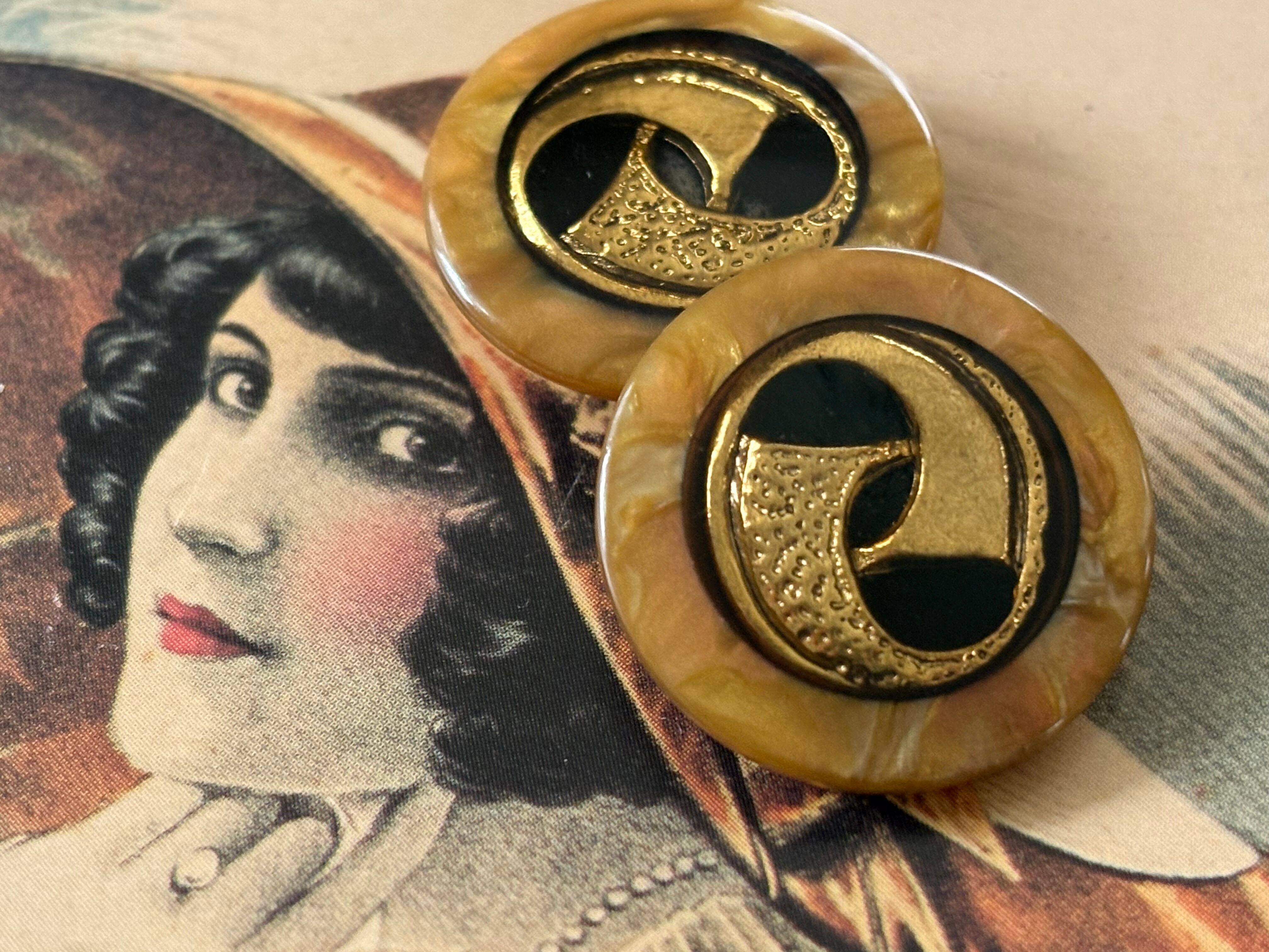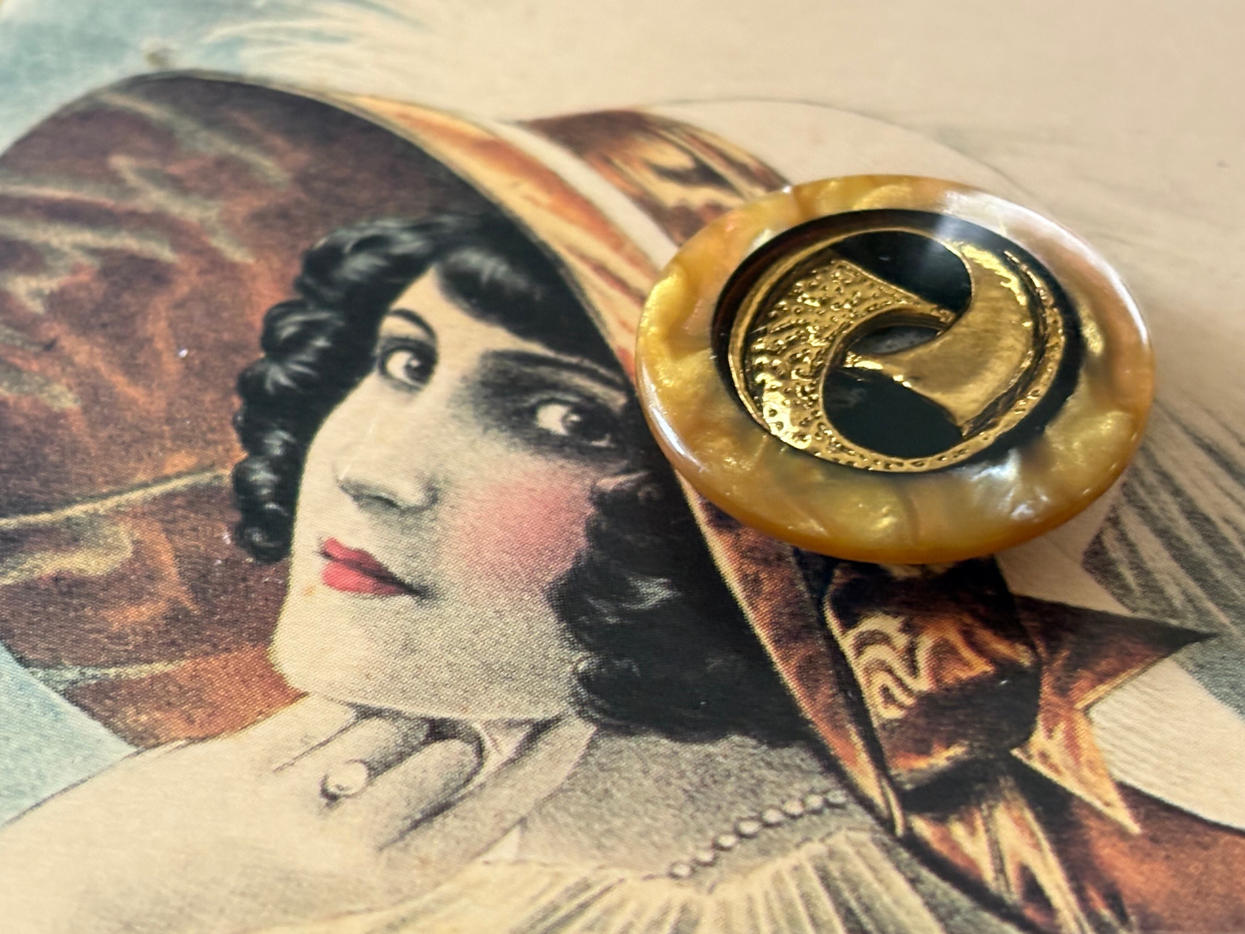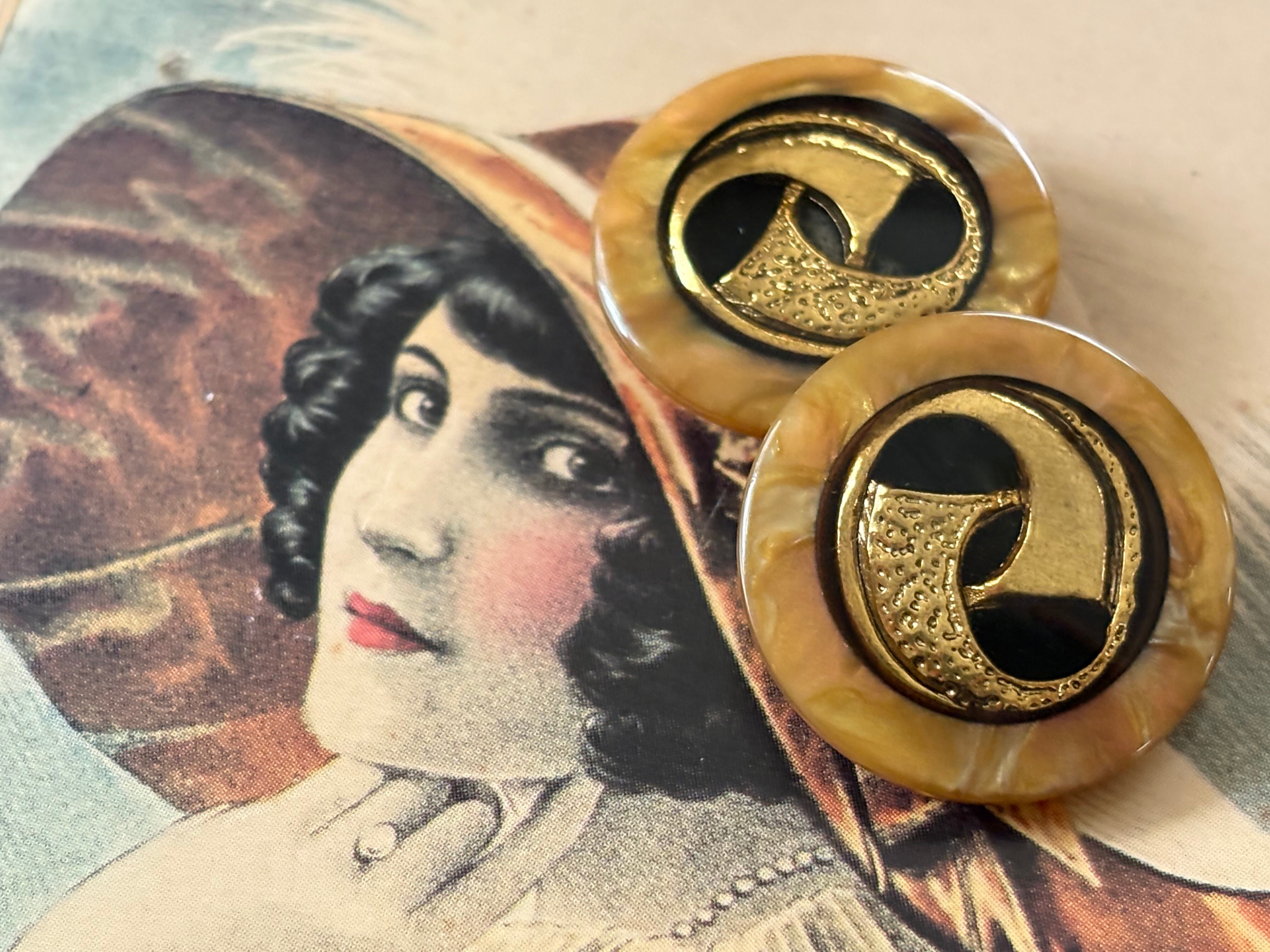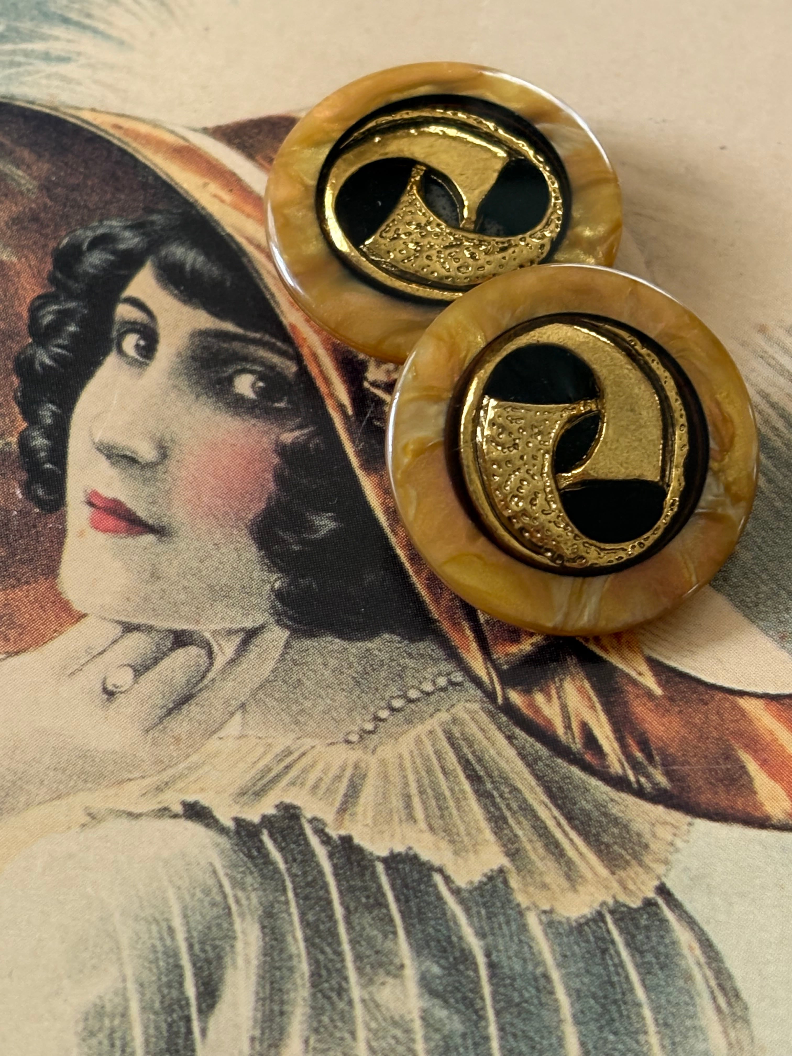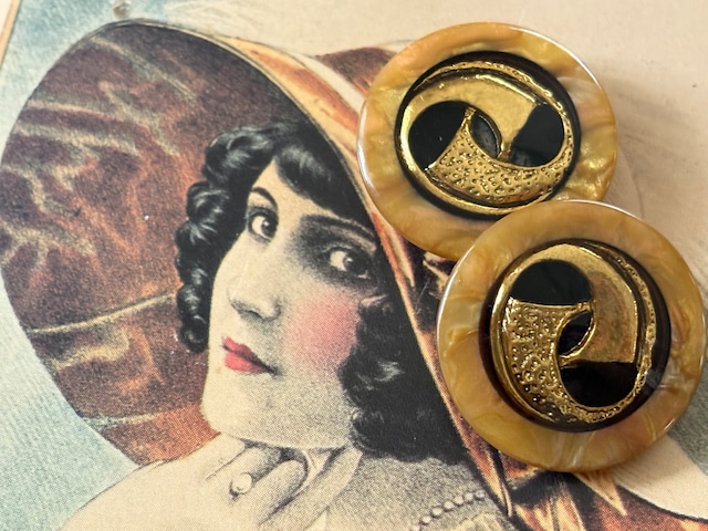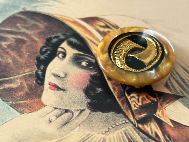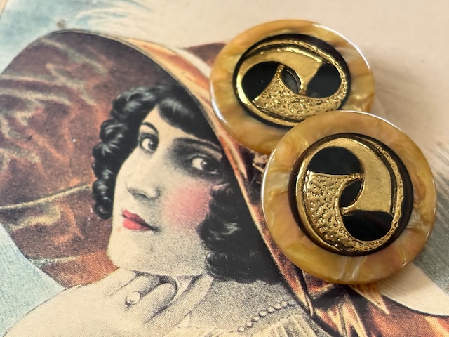 23mm Japanese ヴィンテージボタン イエロー系×ゴールド マーブル調 レトロ アクセサリーパーツ 装飾材 カルトナージュ