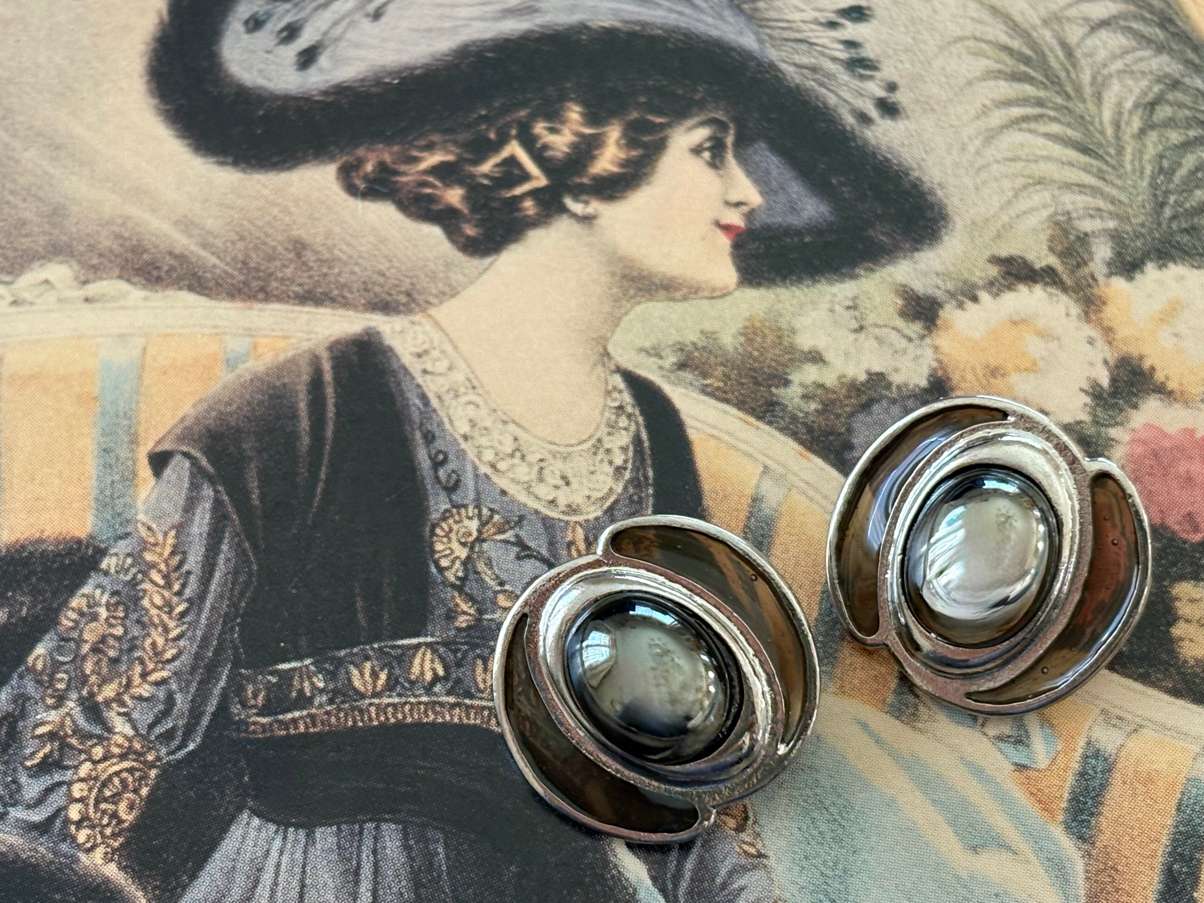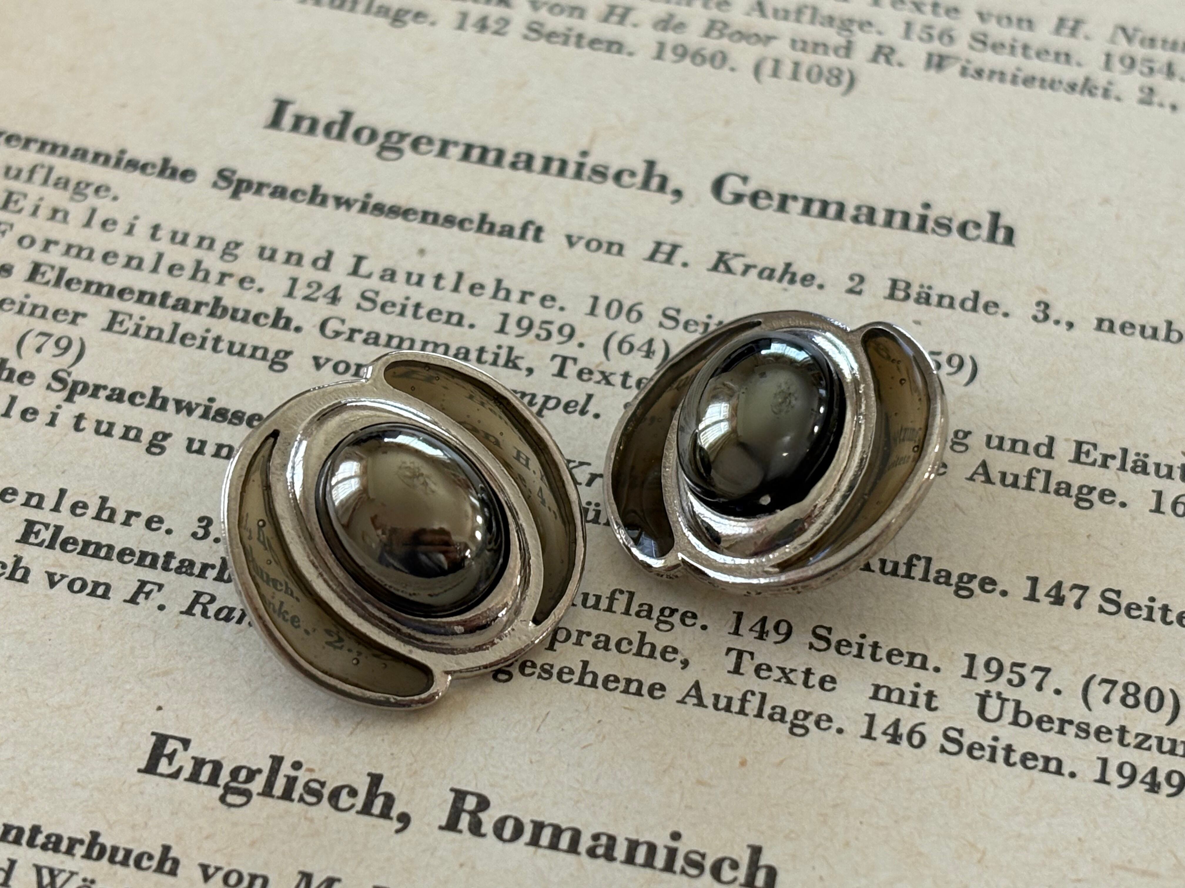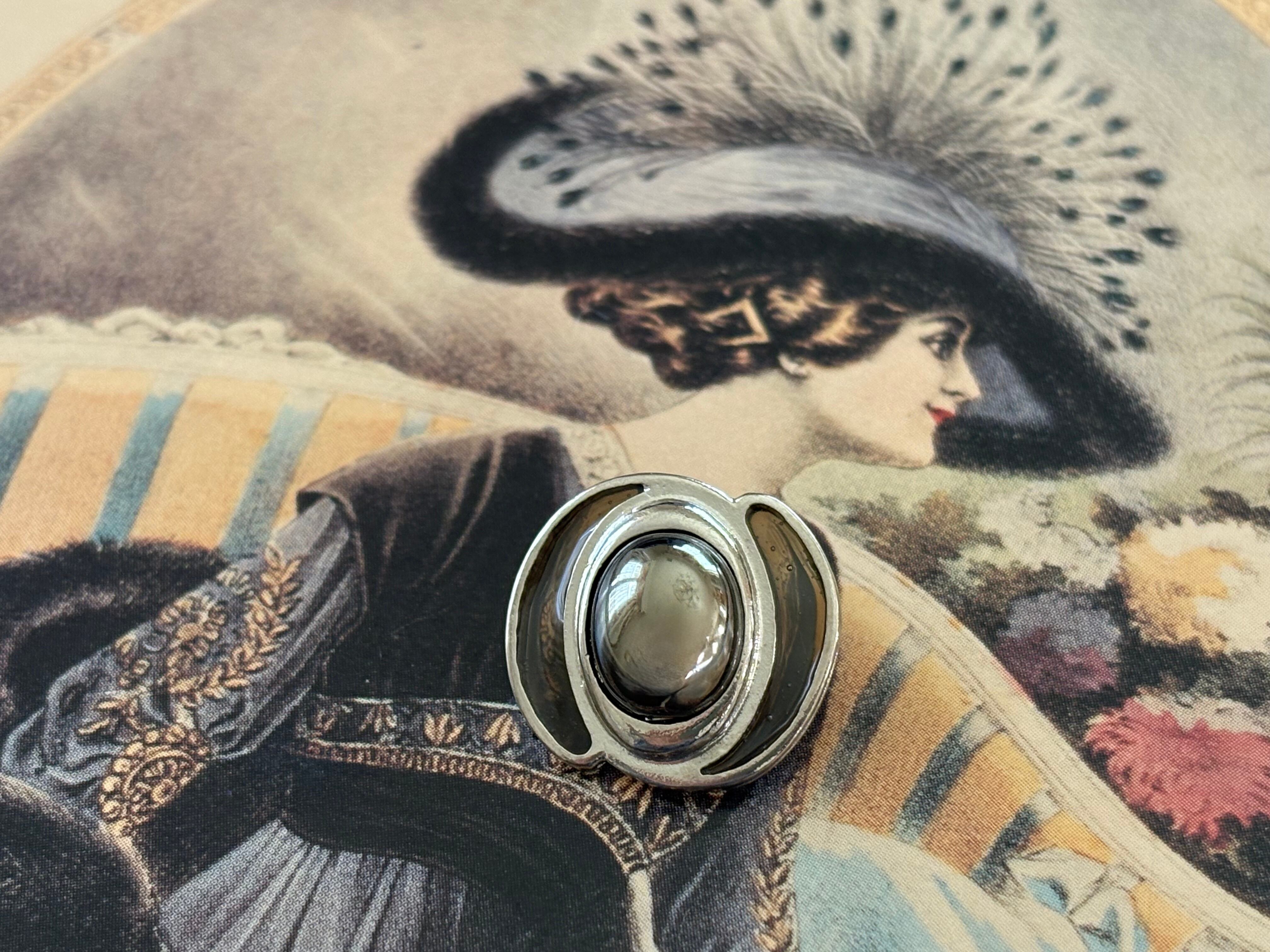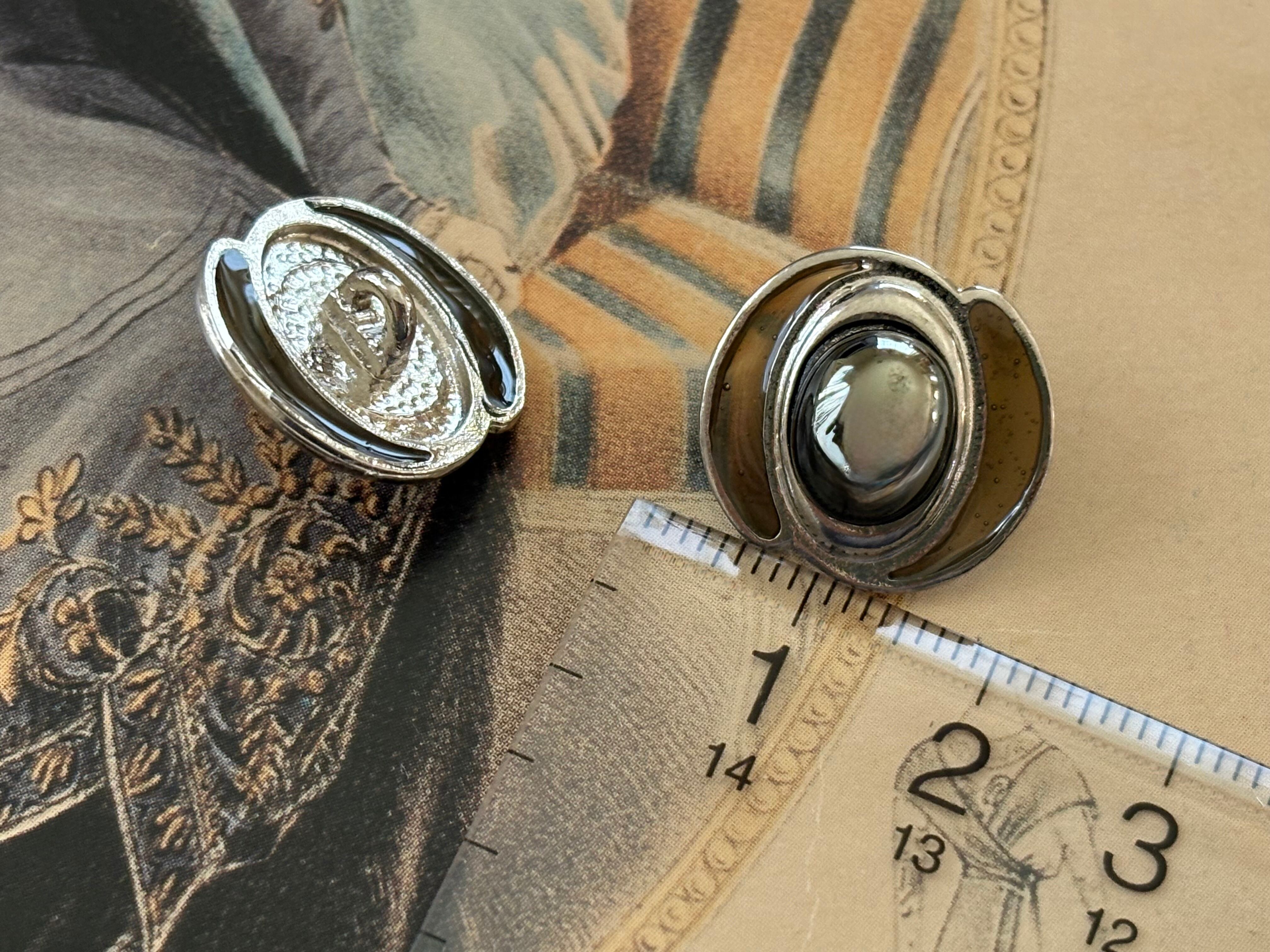 シルバーのメタル製ボタンの中央にオーバル型の艶やかメタリックなカボションが設置されています。