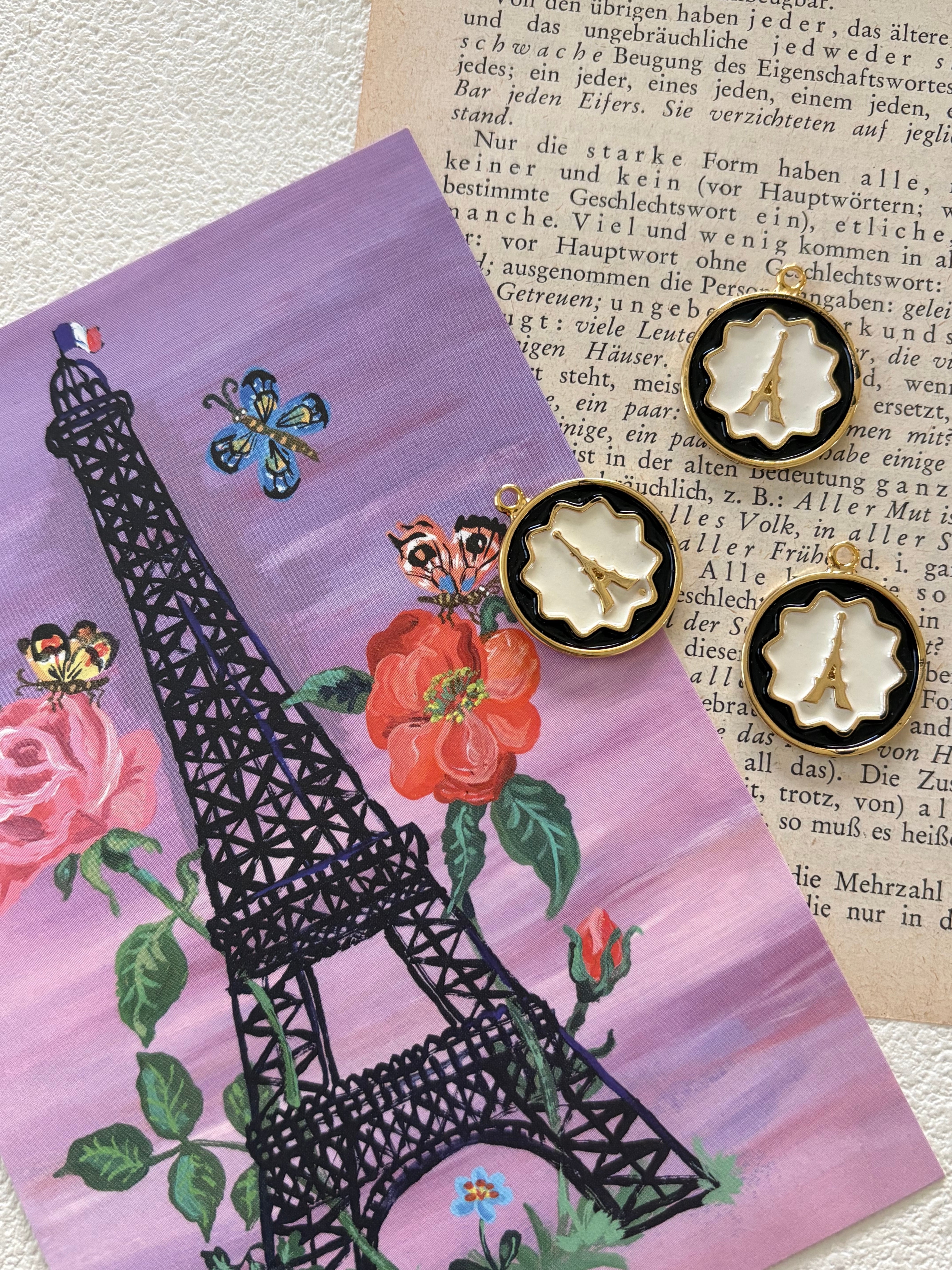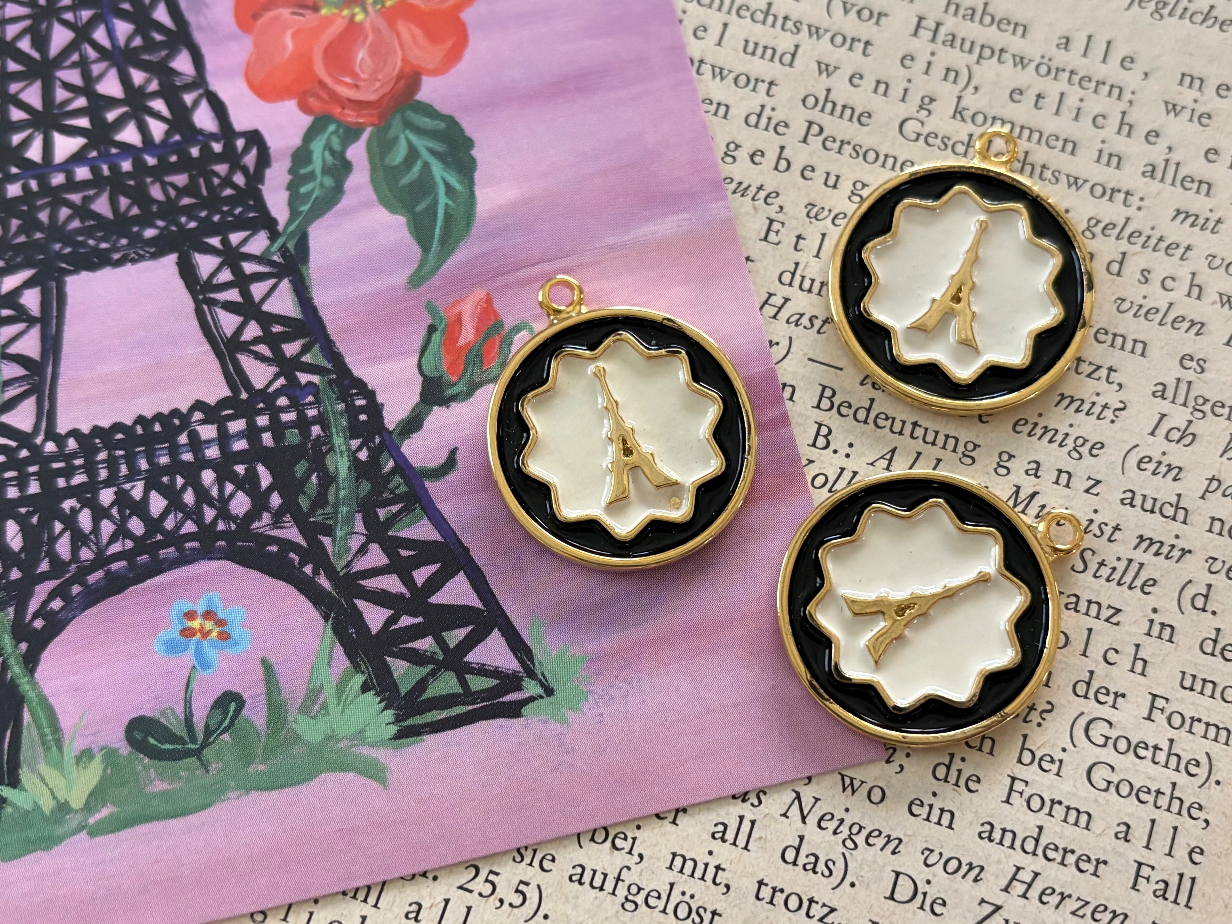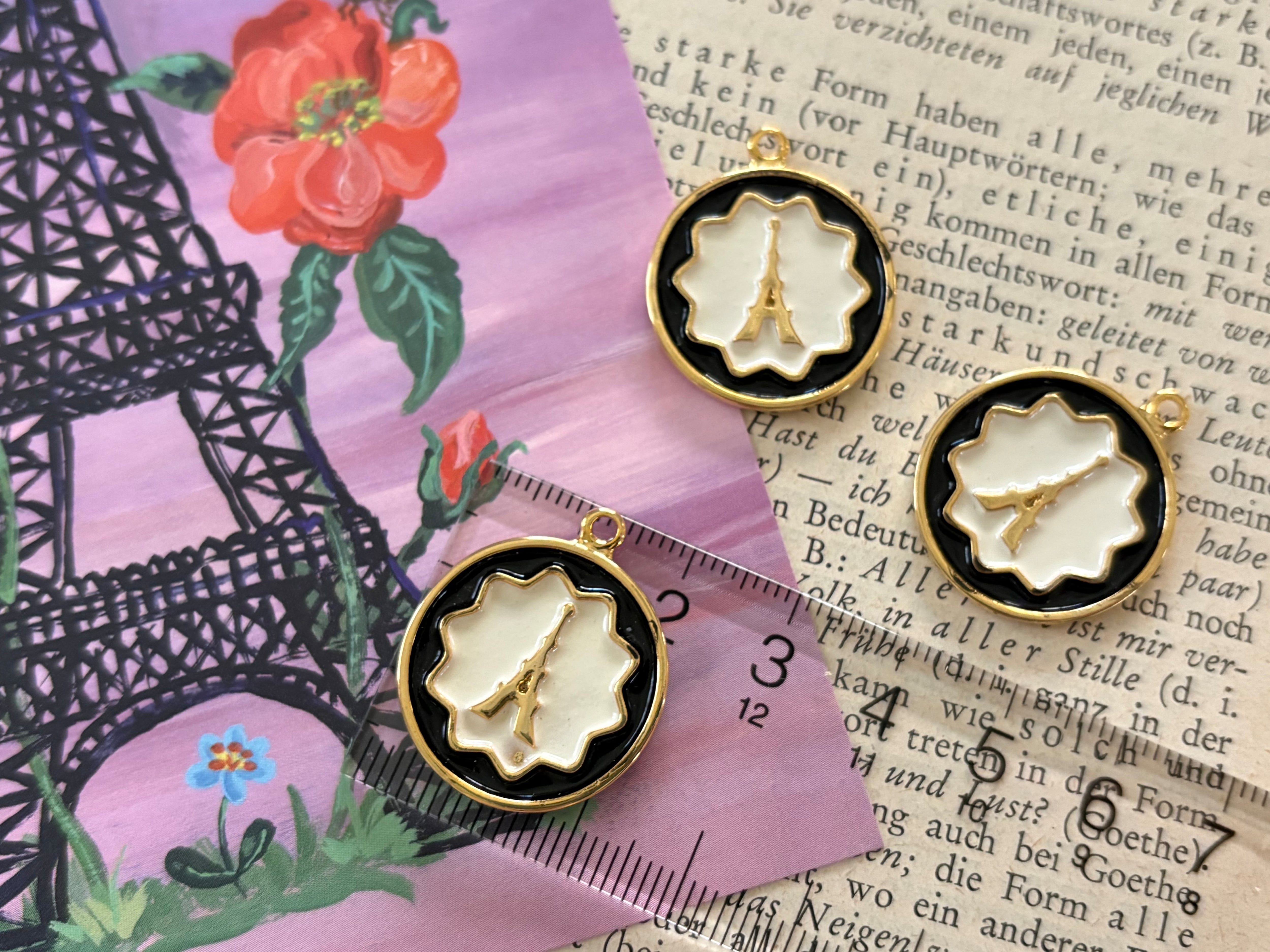 輸入デザインパーツ ラベル型チャーム エッフェル塔 モノトーン ホワイト×ブラック×ゴールド 22mm アクセサリーパーツ デコレーション材