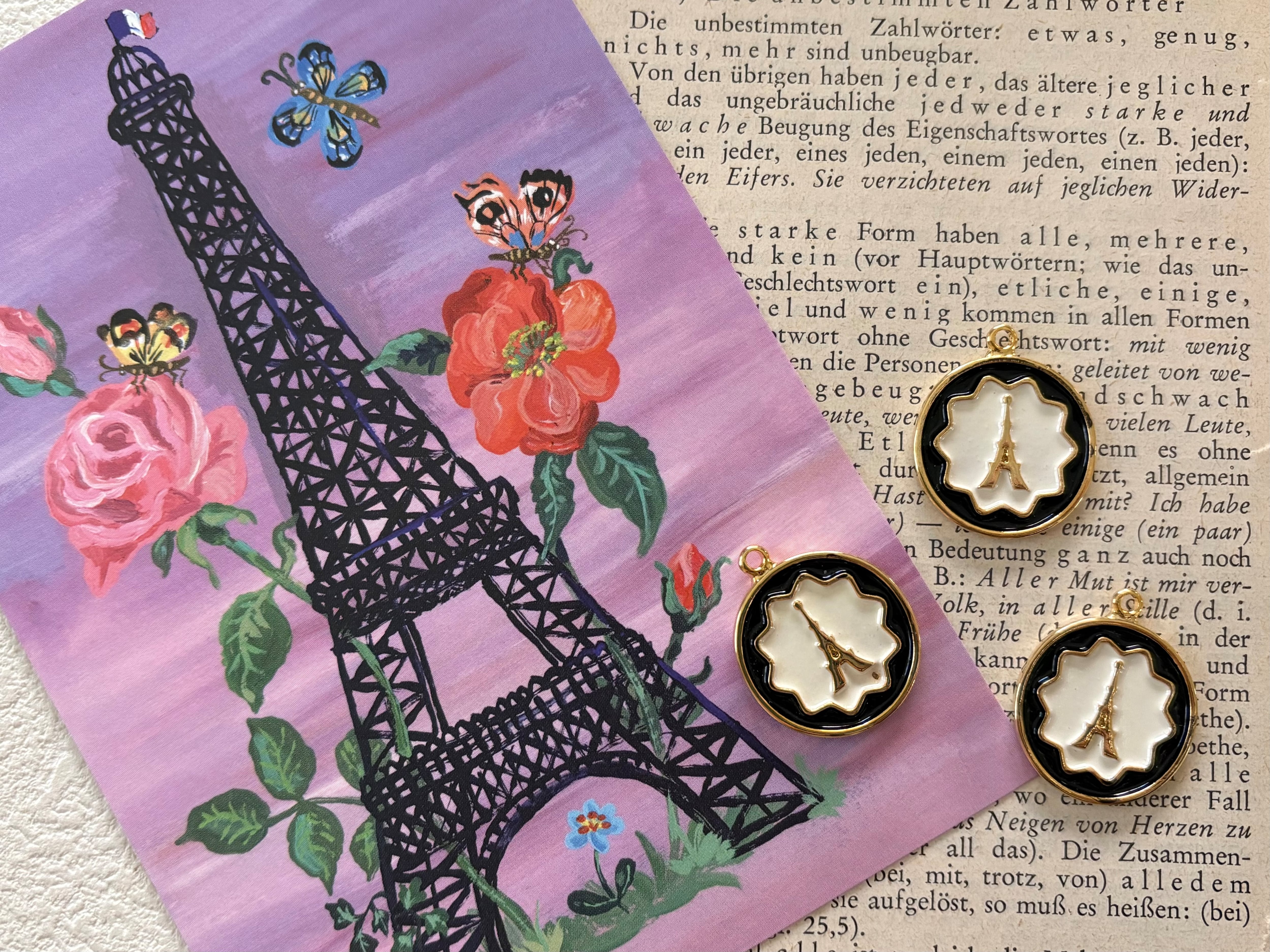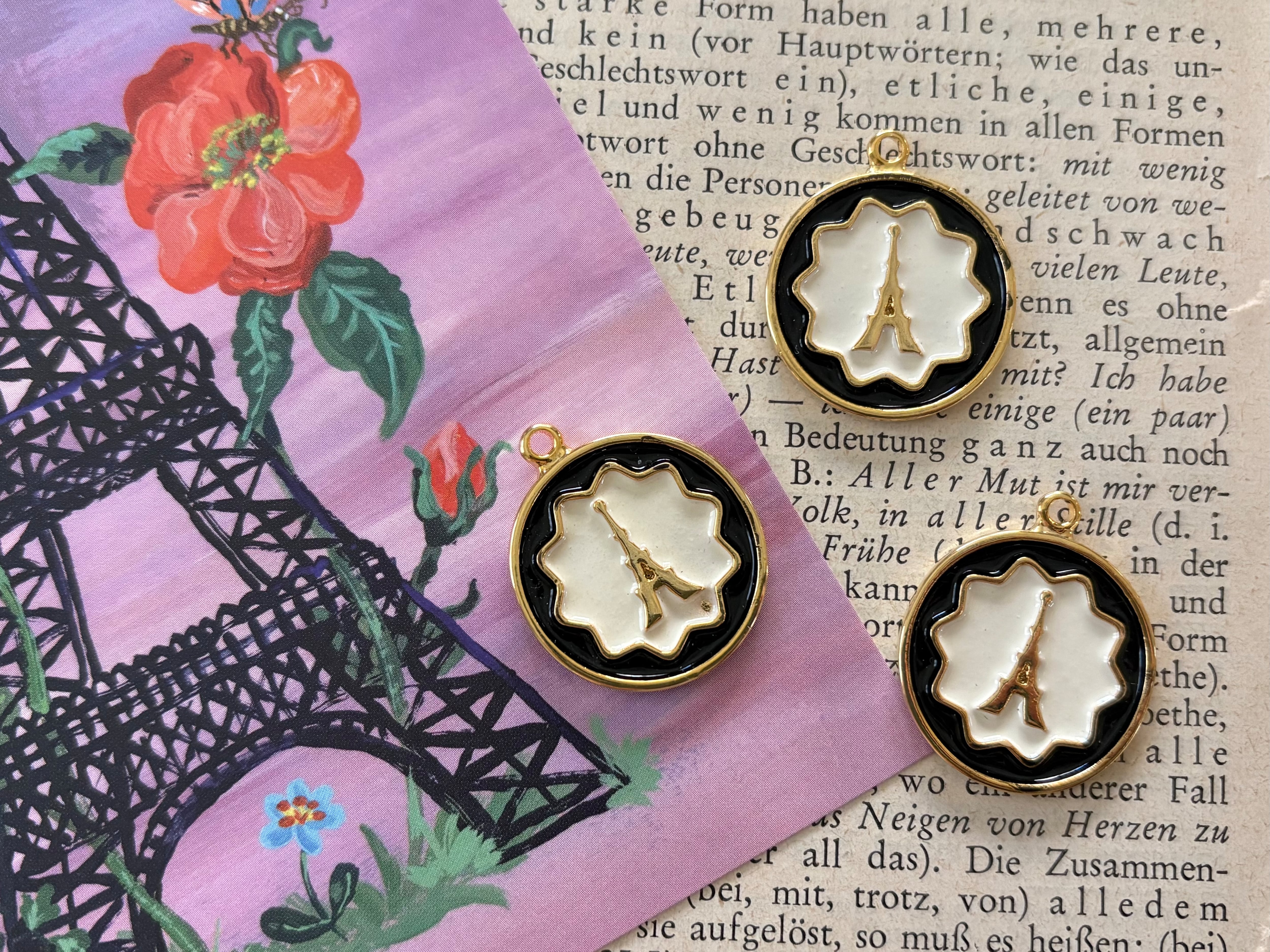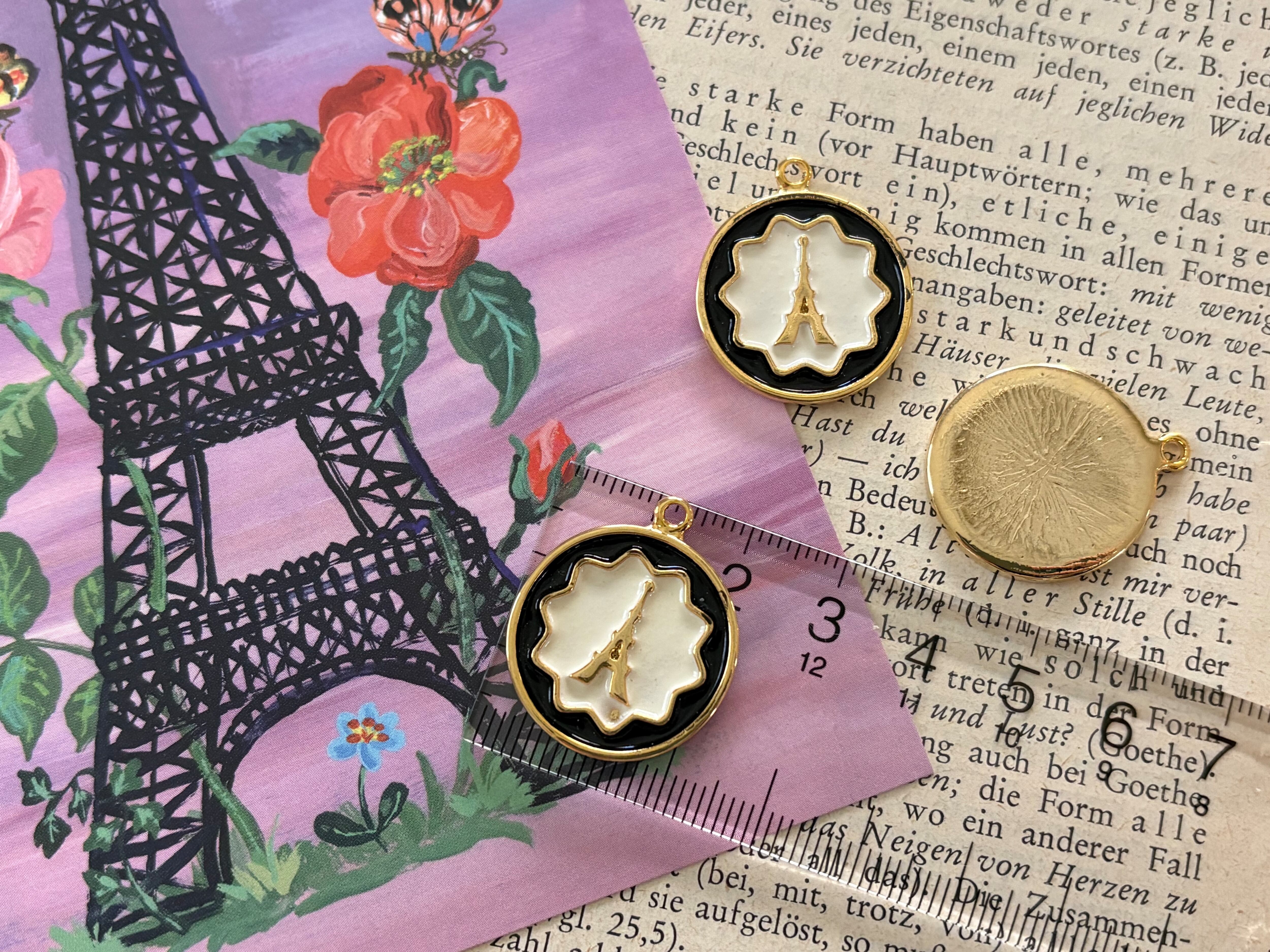 輸入デザインパーツ ラベル型チャーム エッフェル塔 モノトーン ホワイト×ブラック×ゴールド 22mm アクセサリーパーツ デコレーション材