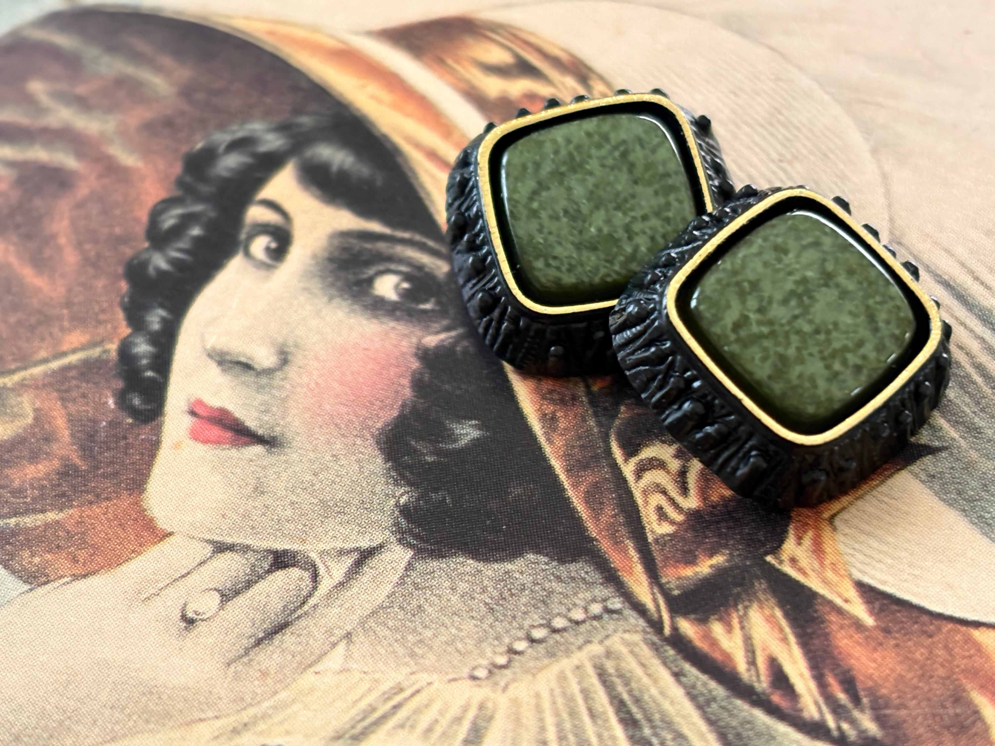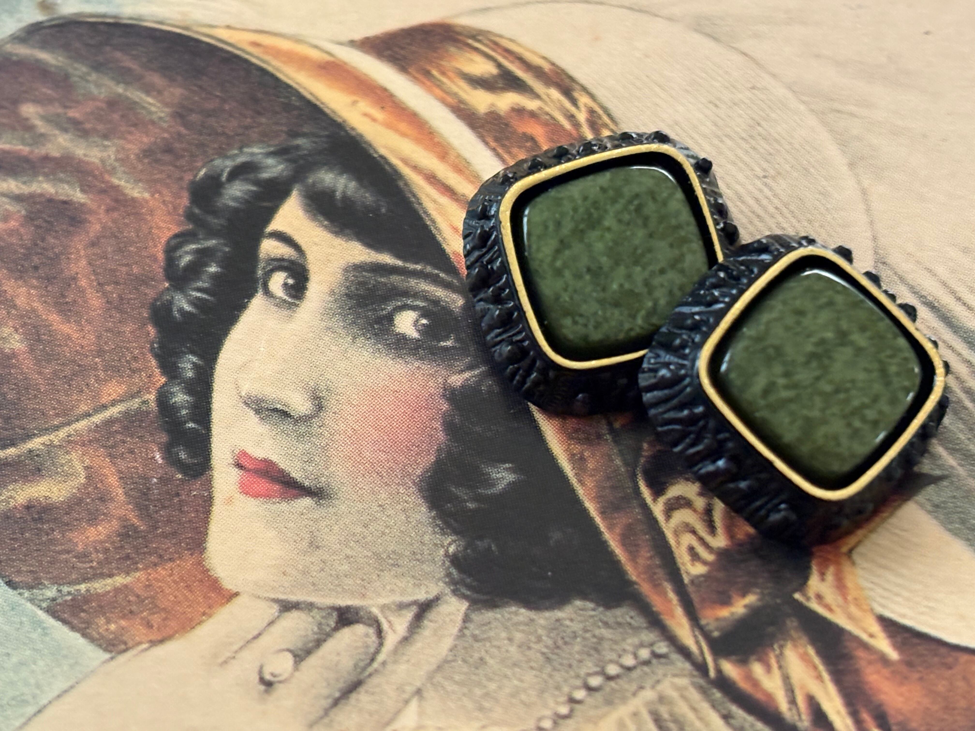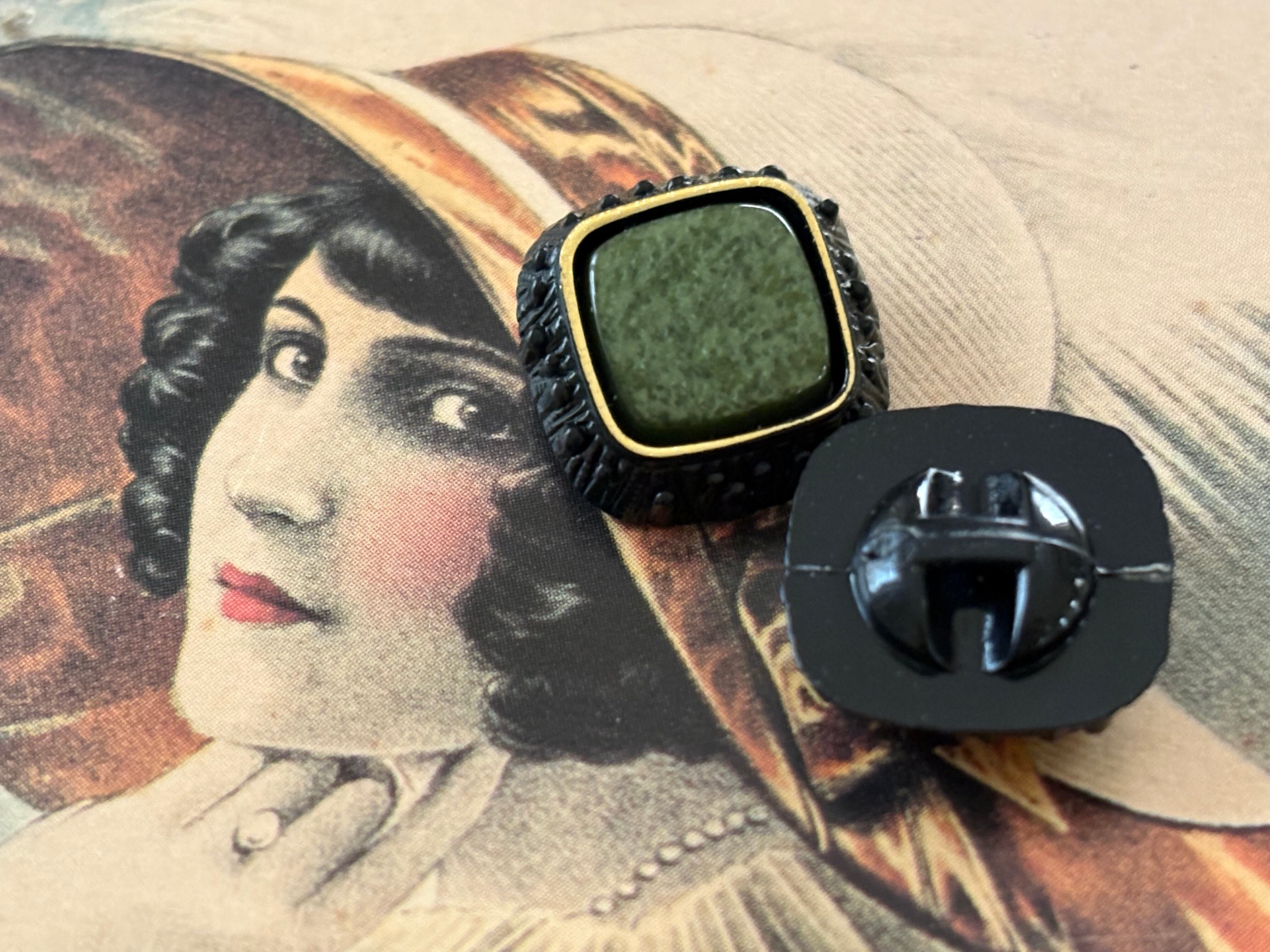15mm Japanese ヴィンテージボタン カボション グリーン系×ブラック スクウェア アクセサリーパーツ デコレーション材 カルトナージュ
