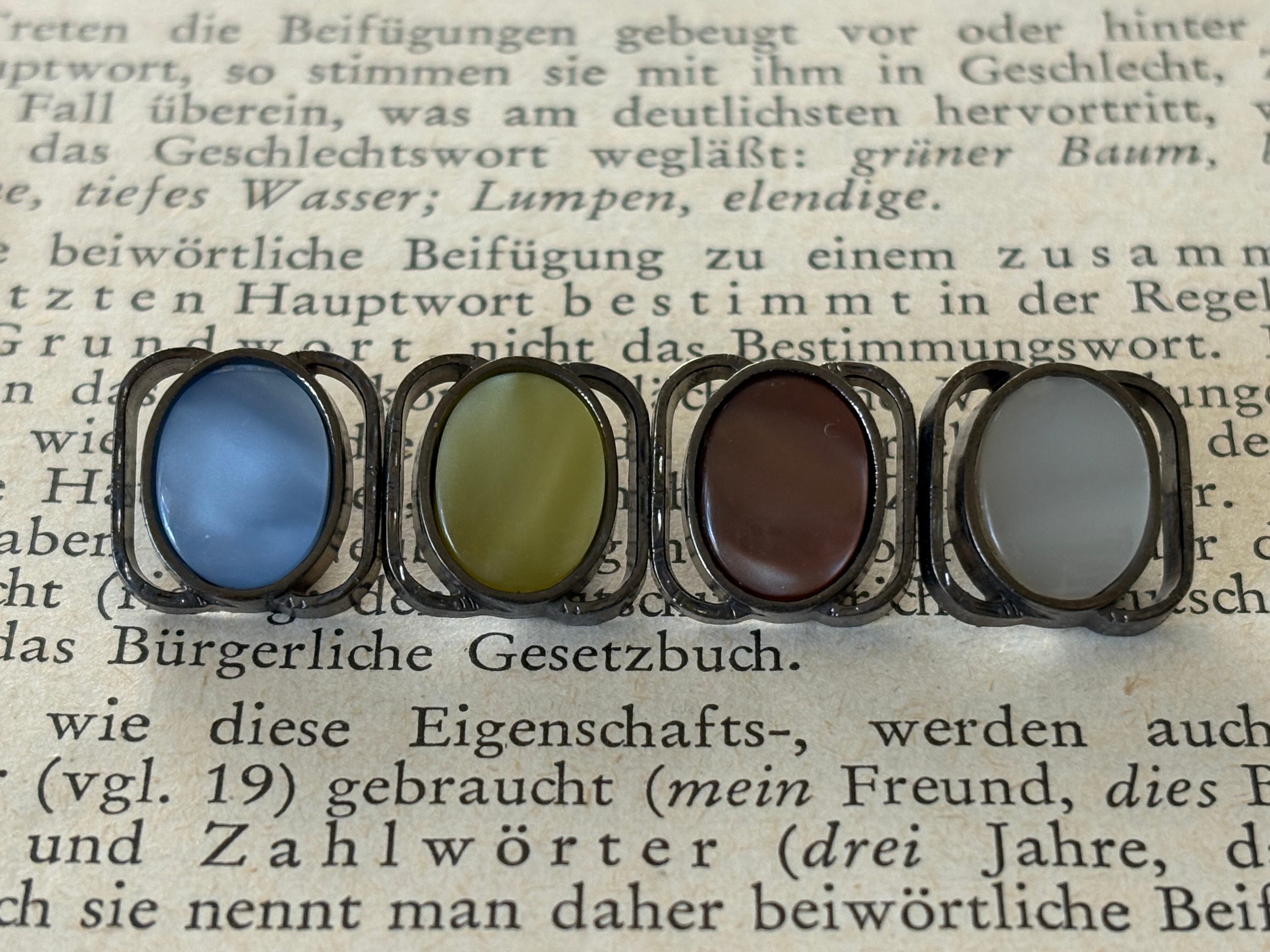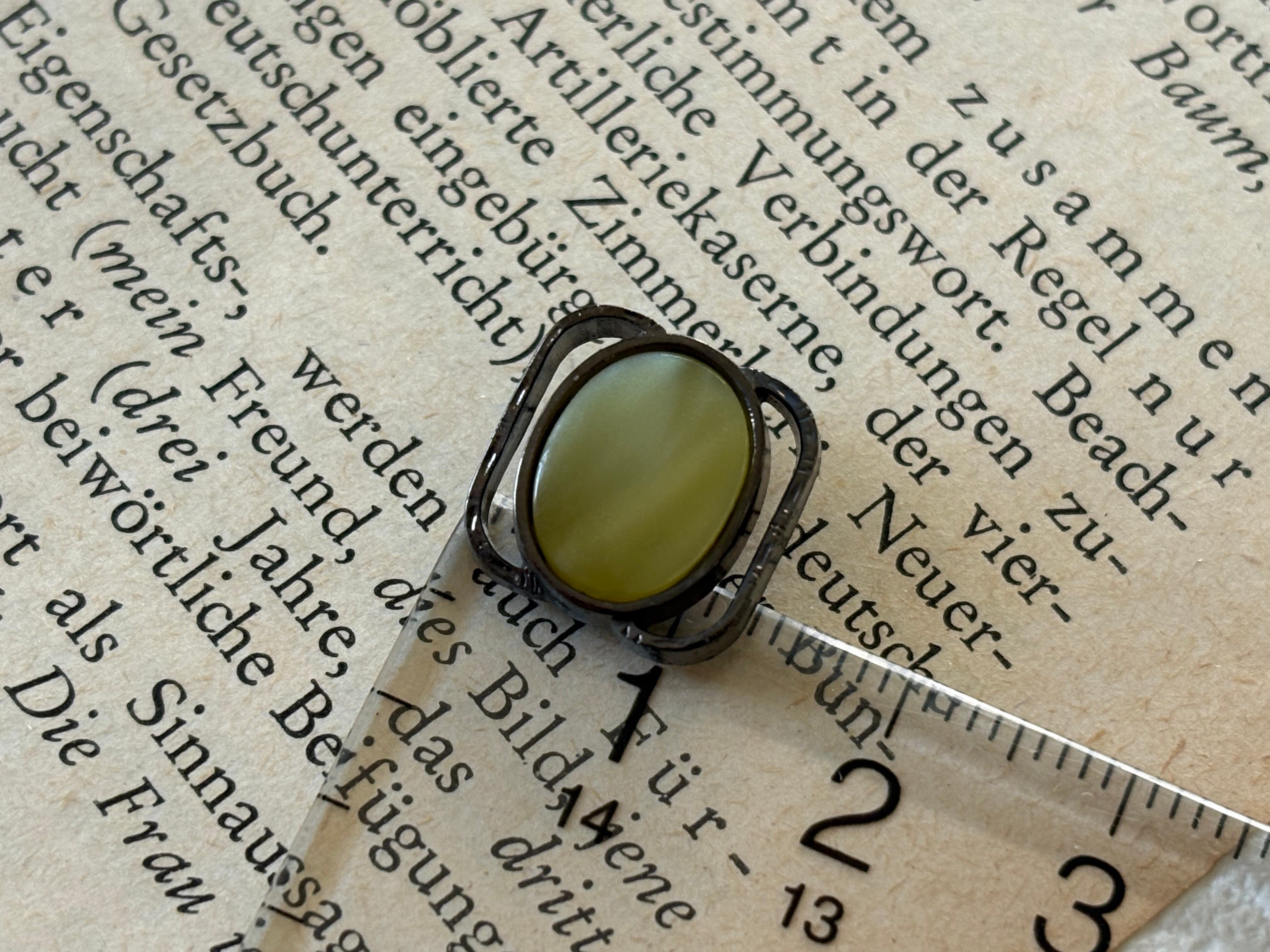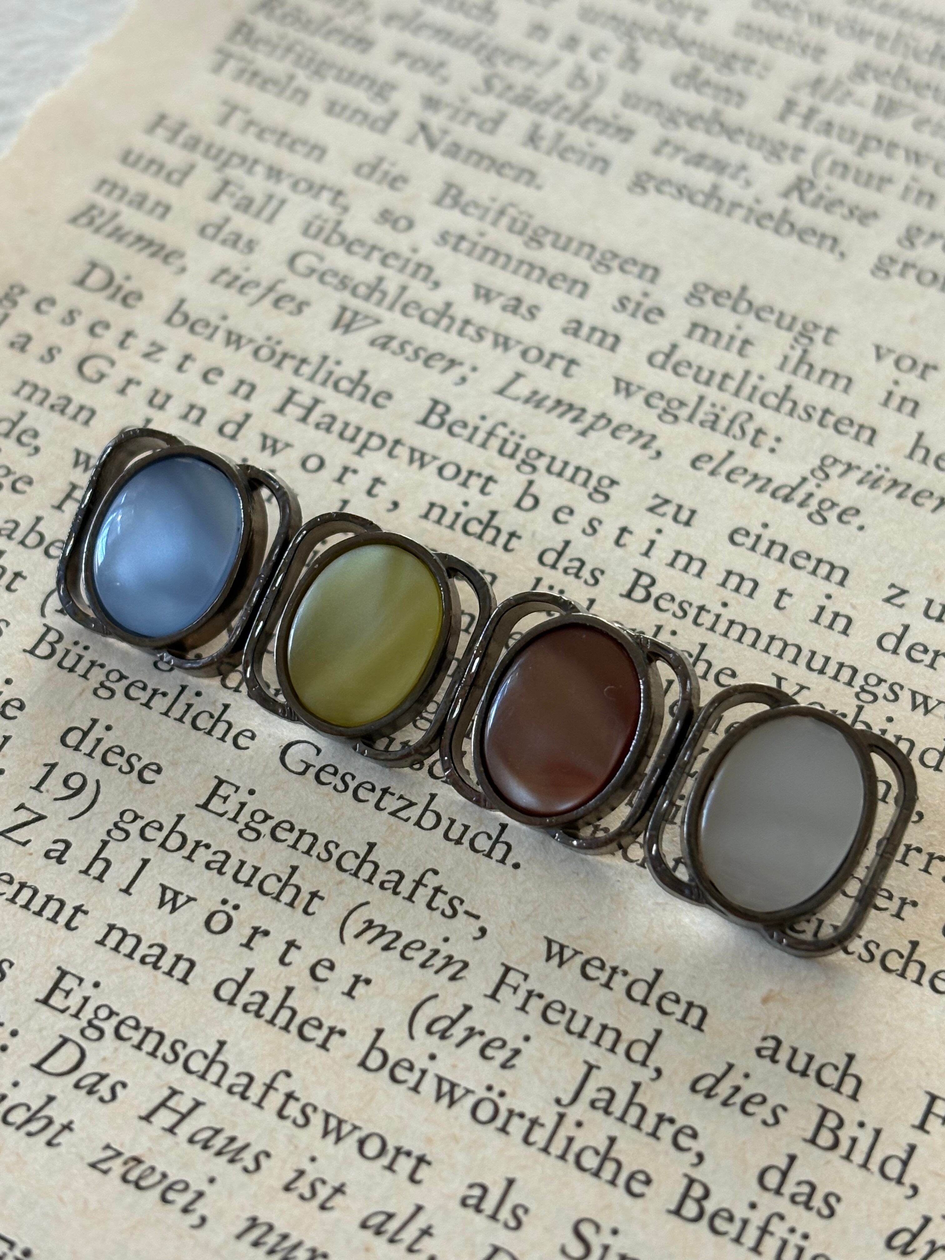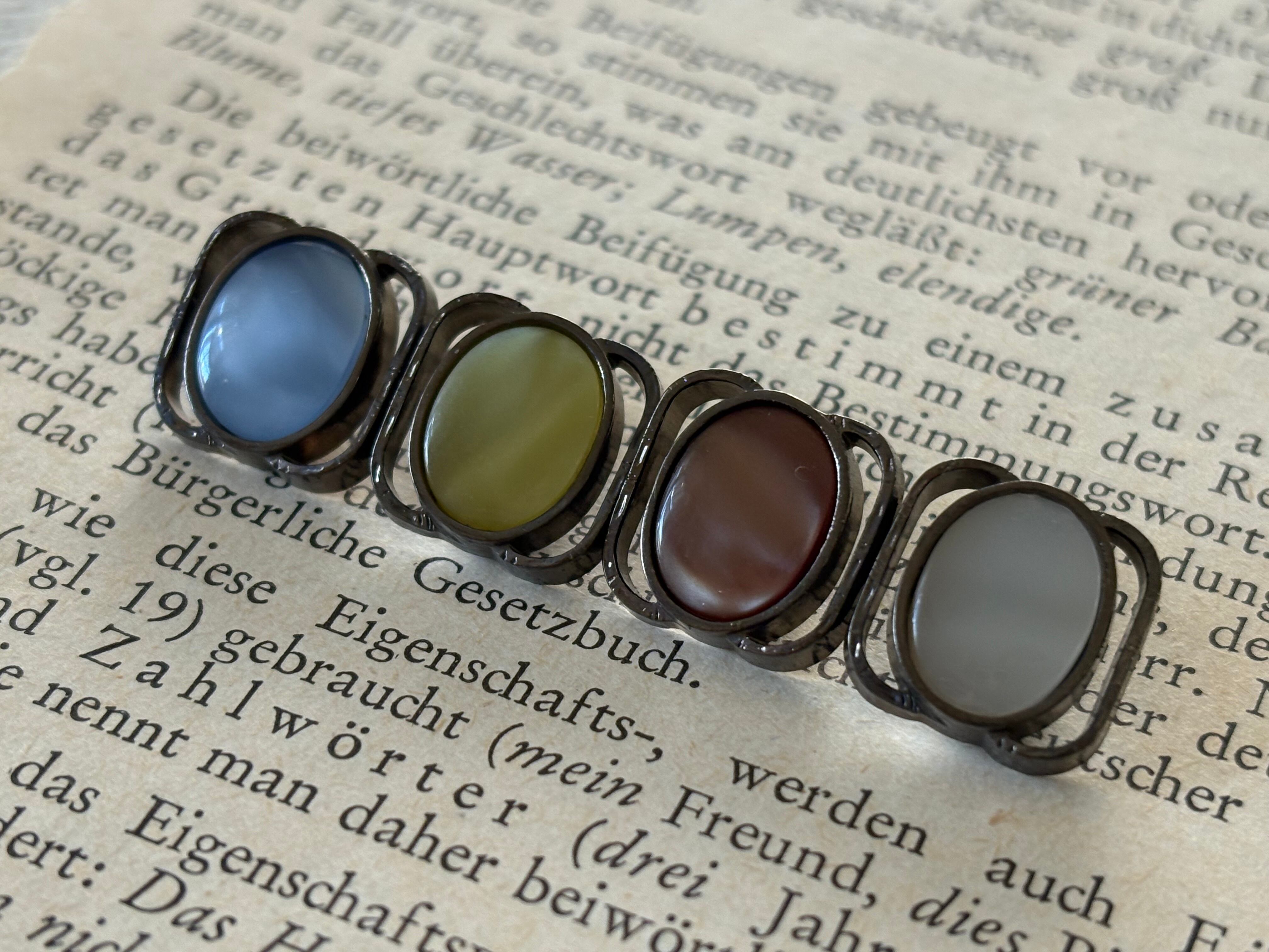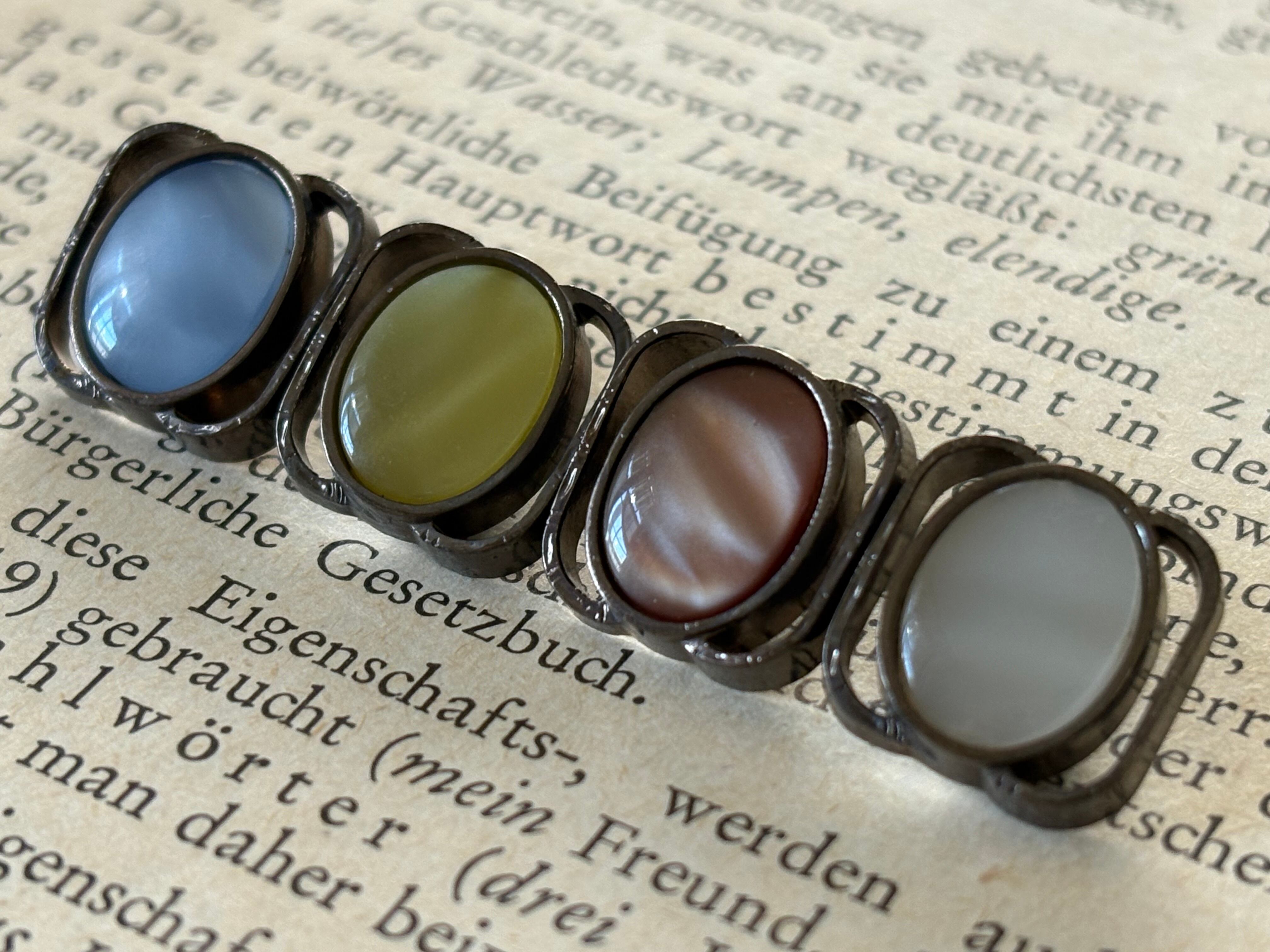 ダークシルバーカラーの台座の中央に艶やかで発色の良いオーバル型のカボションが設置されています。どのお色も奥行きのある雰囲気ある色合いです。