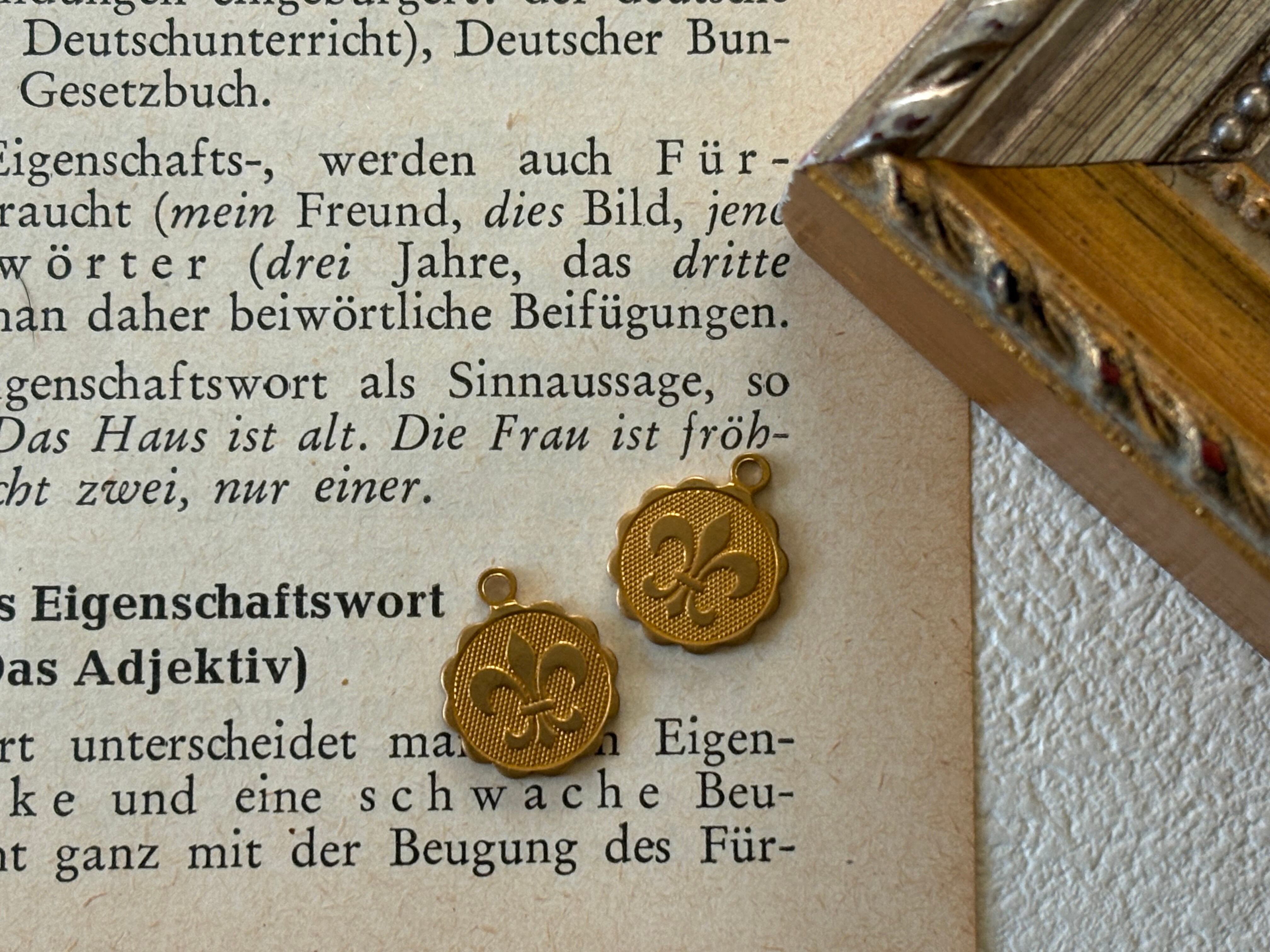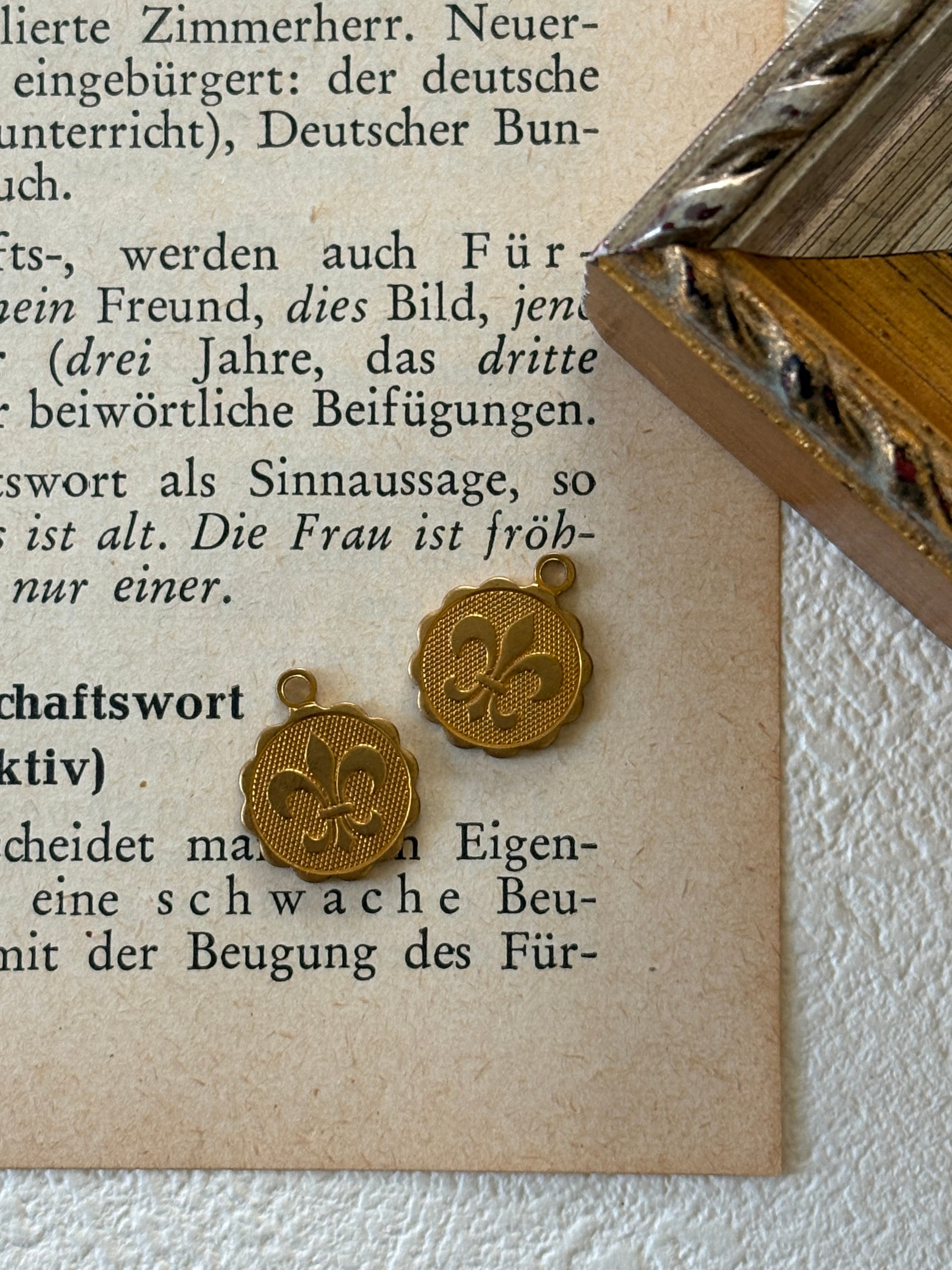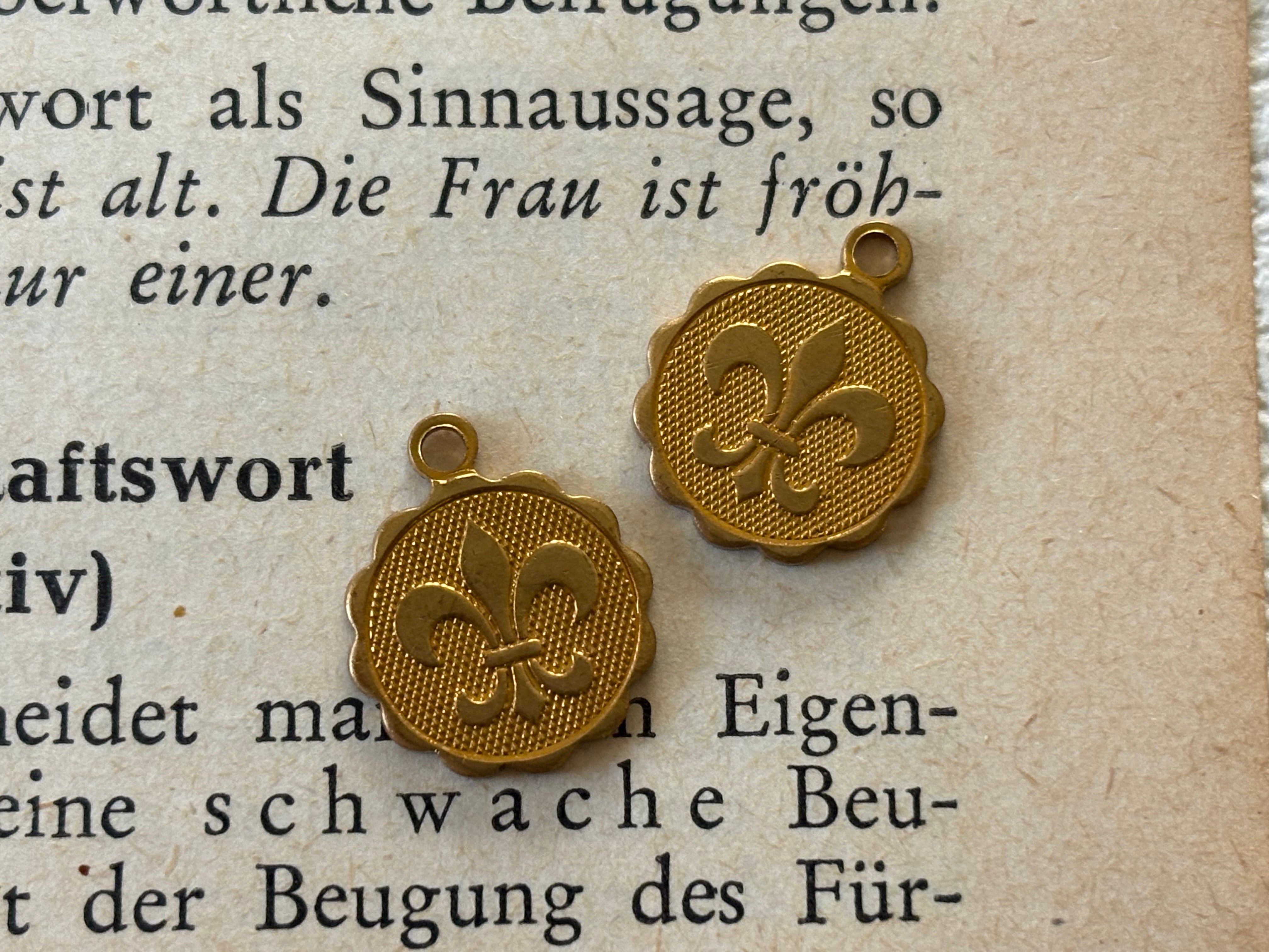 真鍮製のクラシカルで格好良いフルールドリスのラベル型チャーム、2個セットになります。