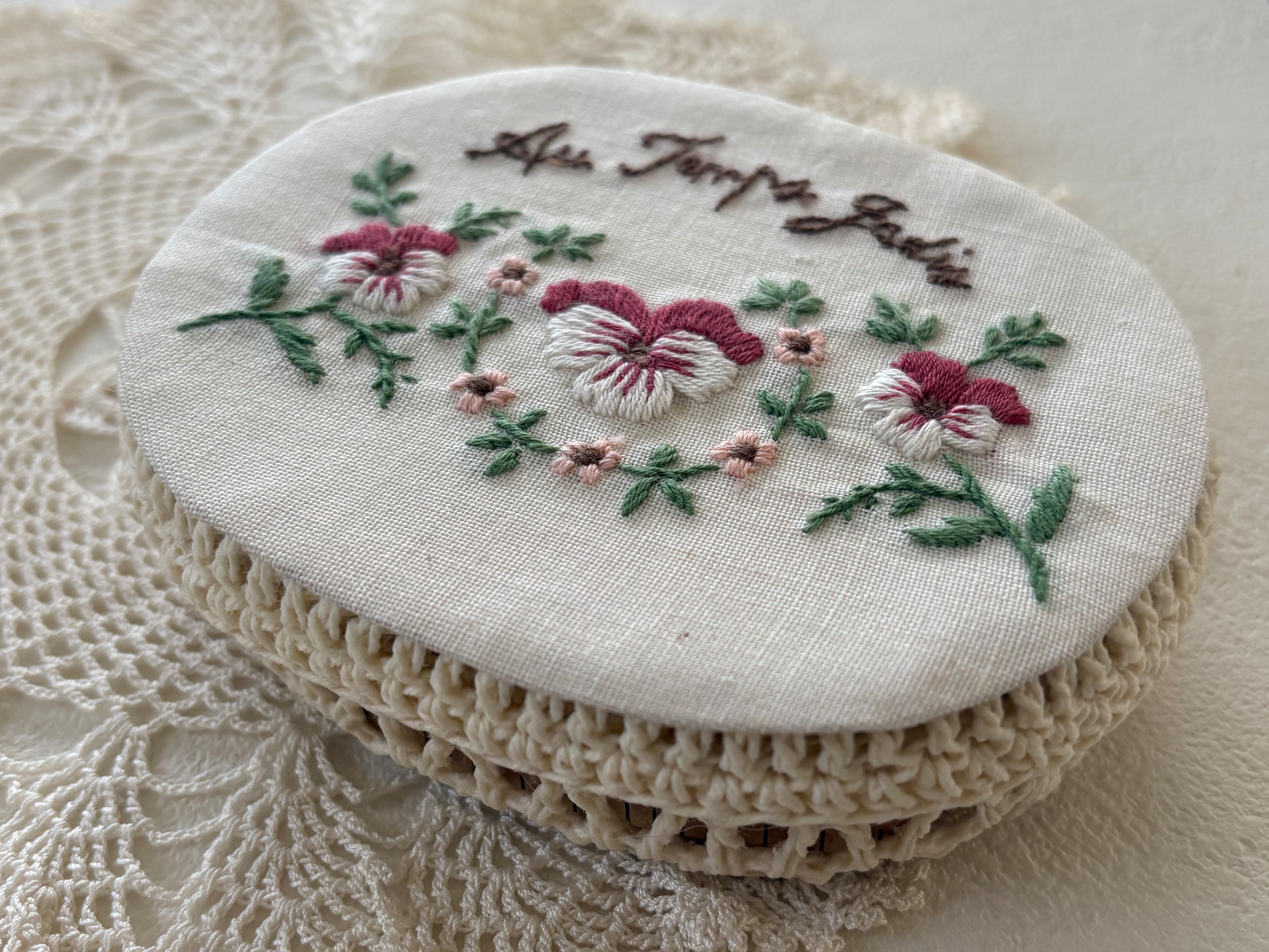 パンジーの刺繍のデザインが可愛く素敵なソーイングボックスです。