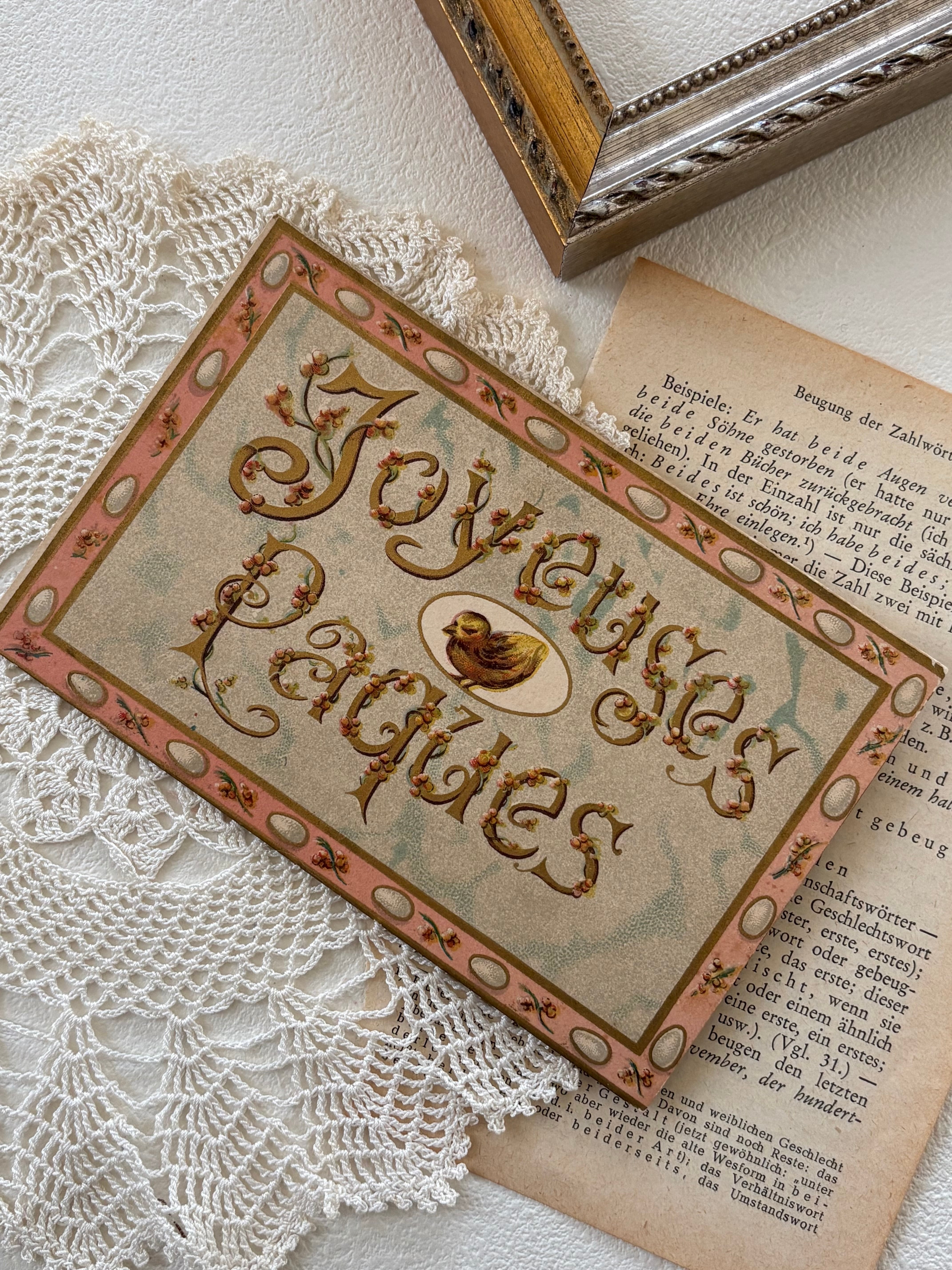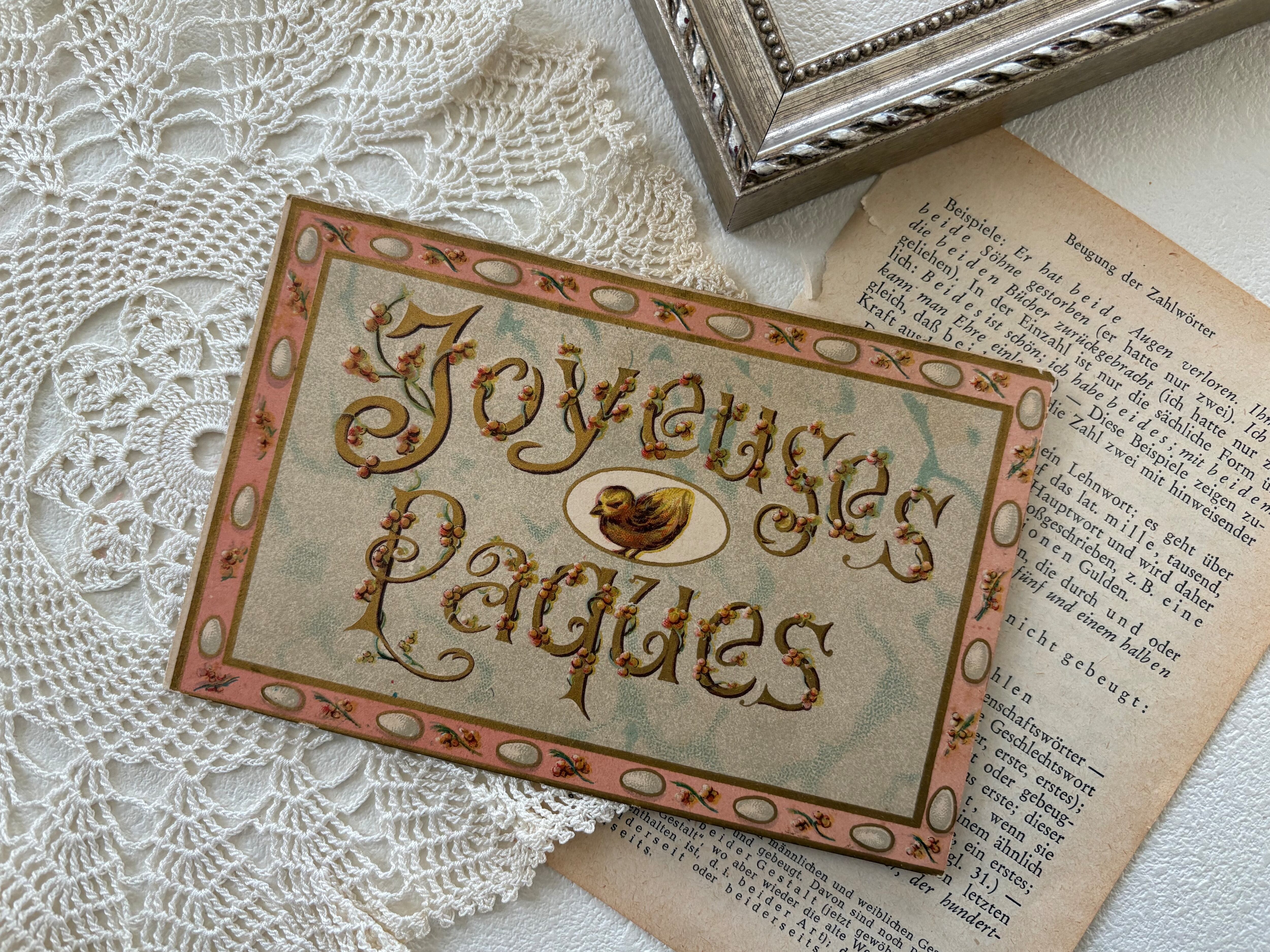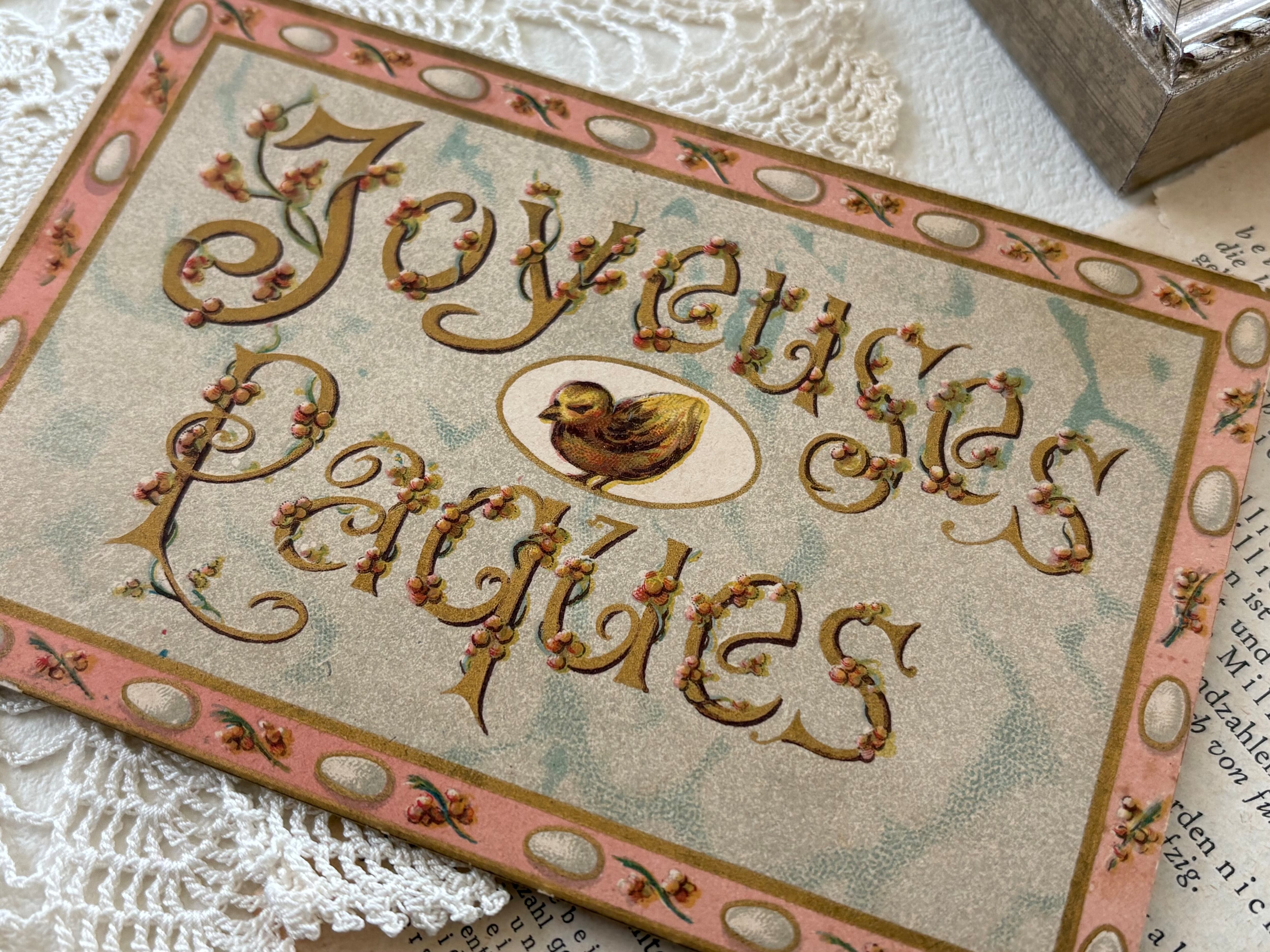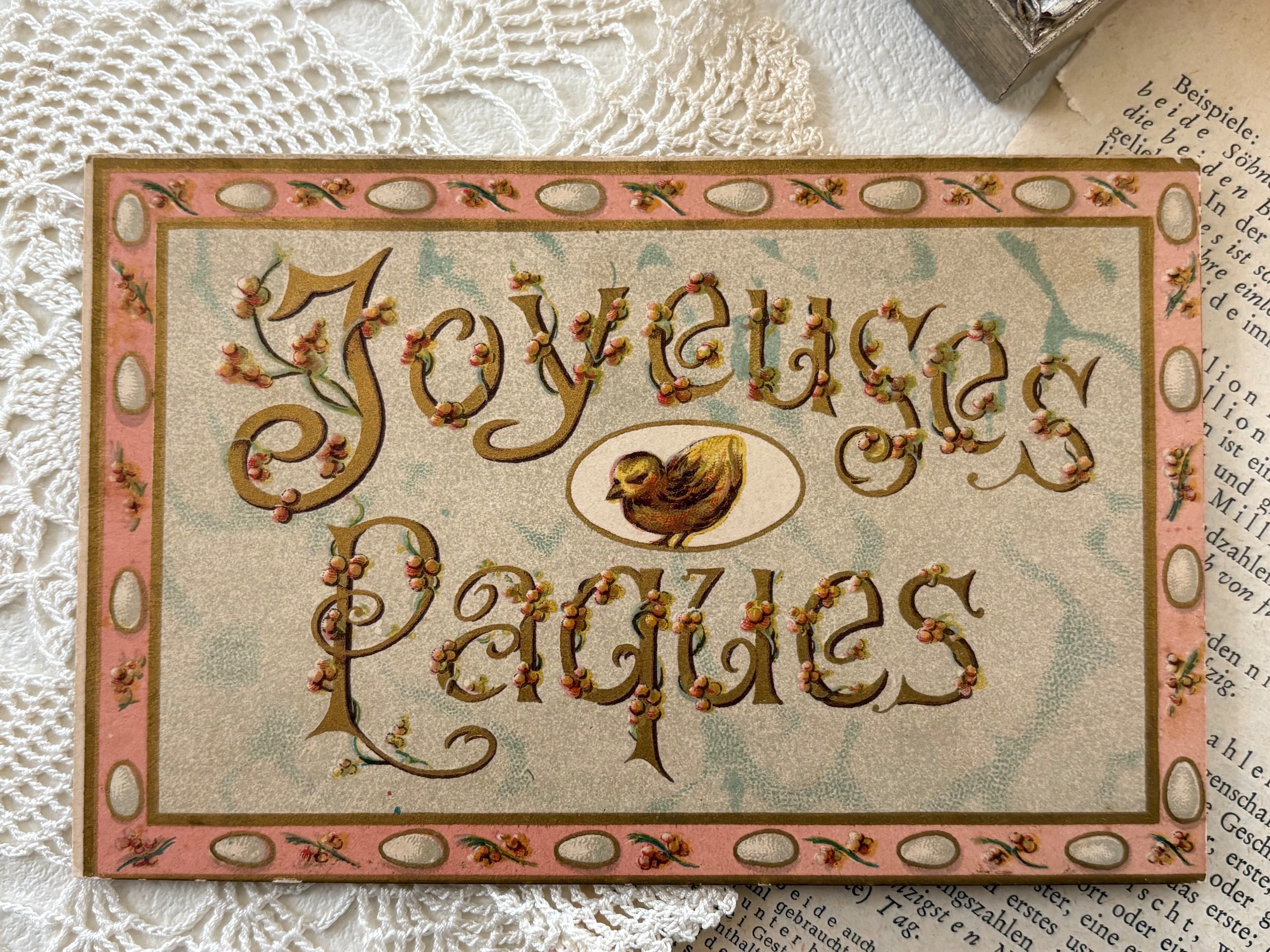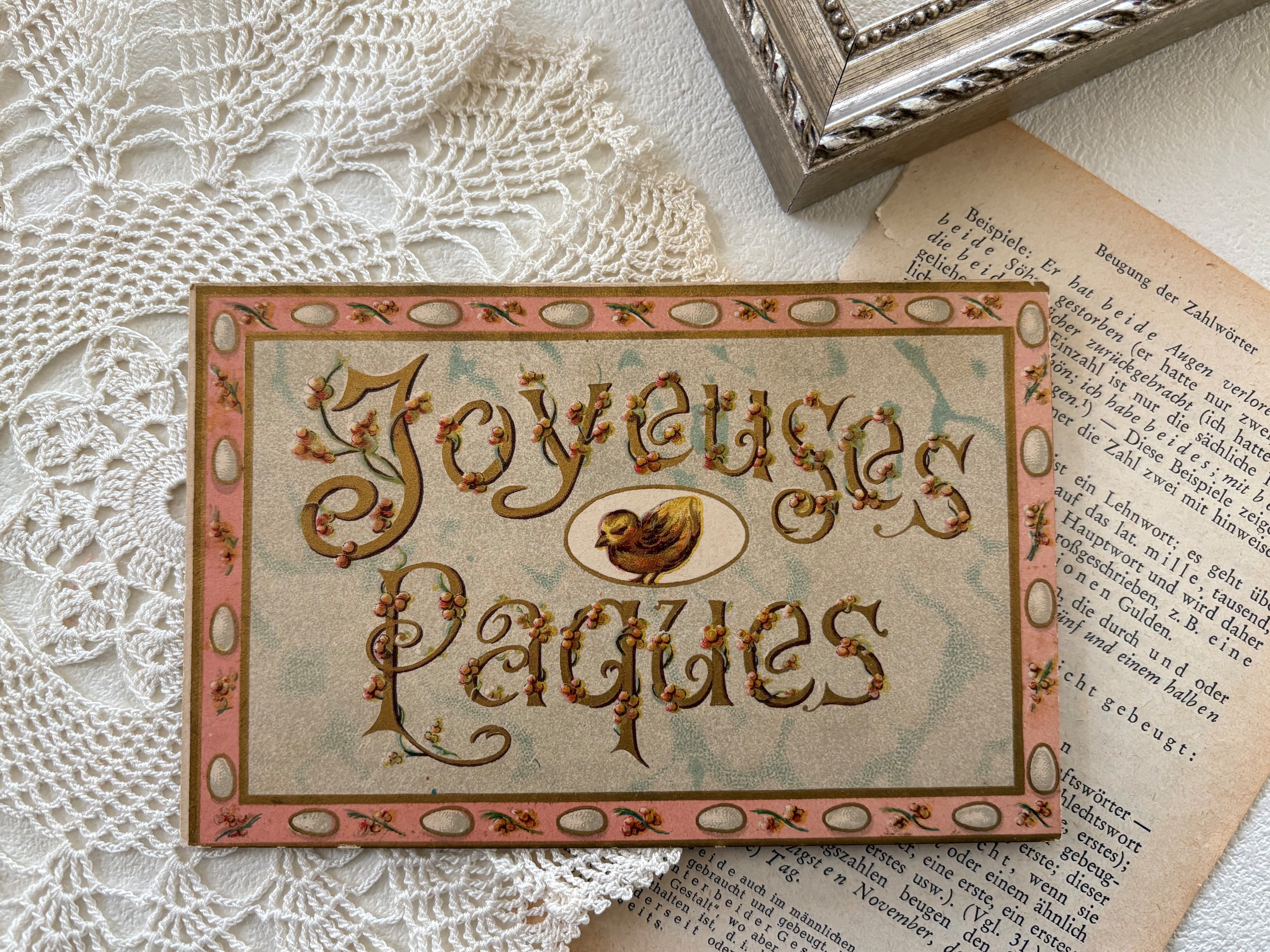 アンティークポストカード フランス イースター Joyeuses Paques ピンク 額装 インテリア小物 コレクション