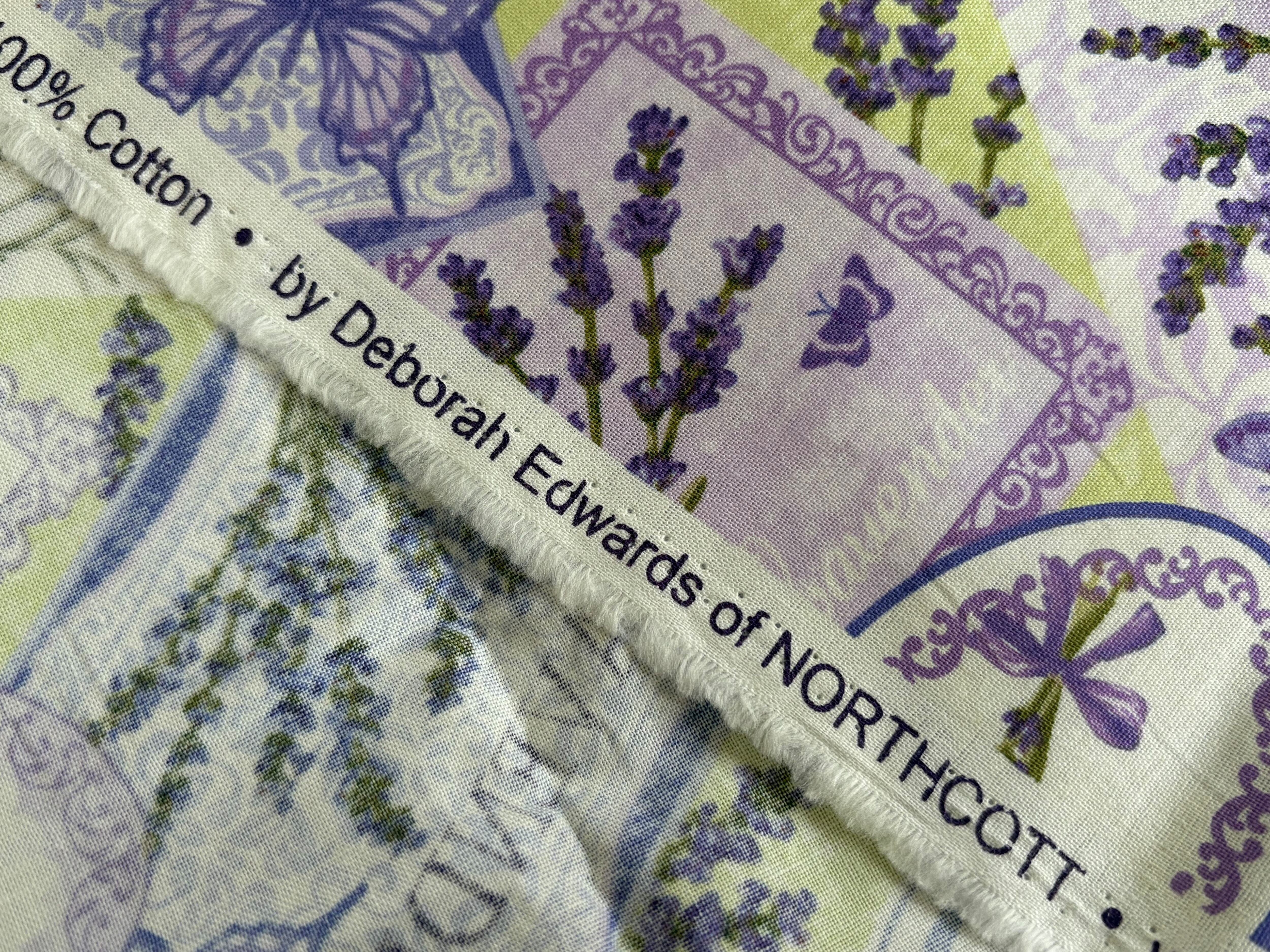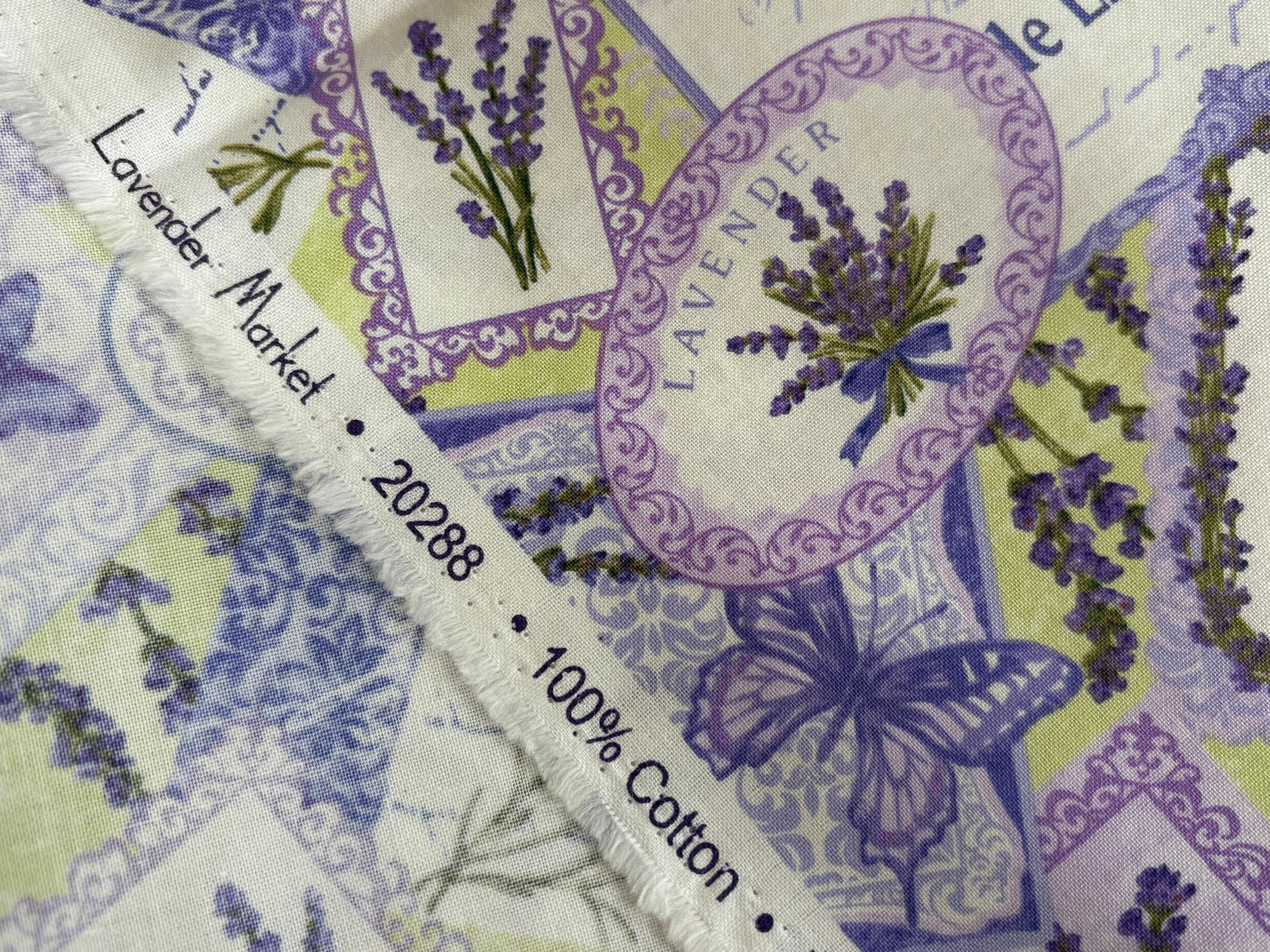 Lavender Market 、一面にラベンダー、ラベンダーカラーのパピヨンなどがプリントされたファブリックです。
