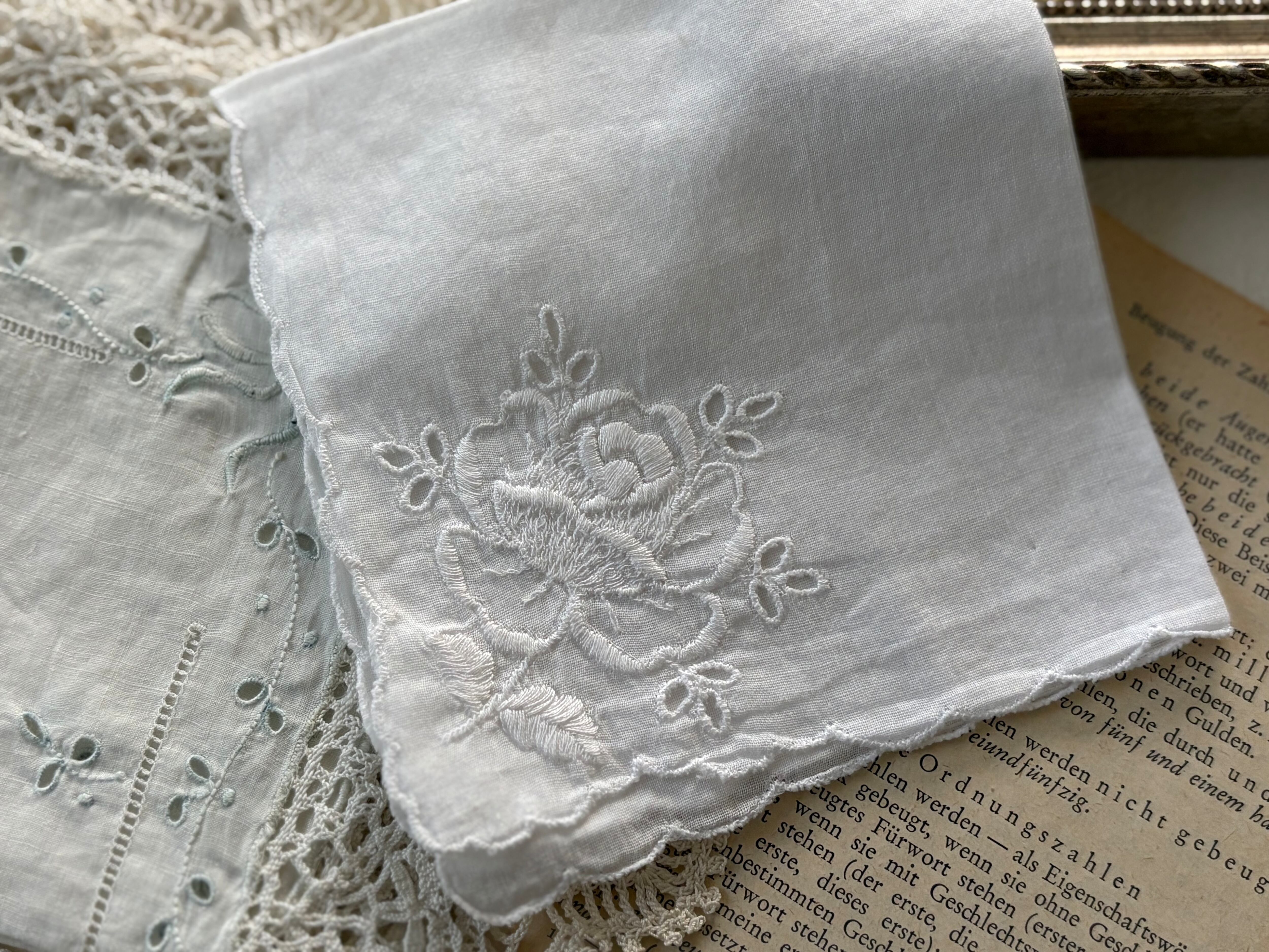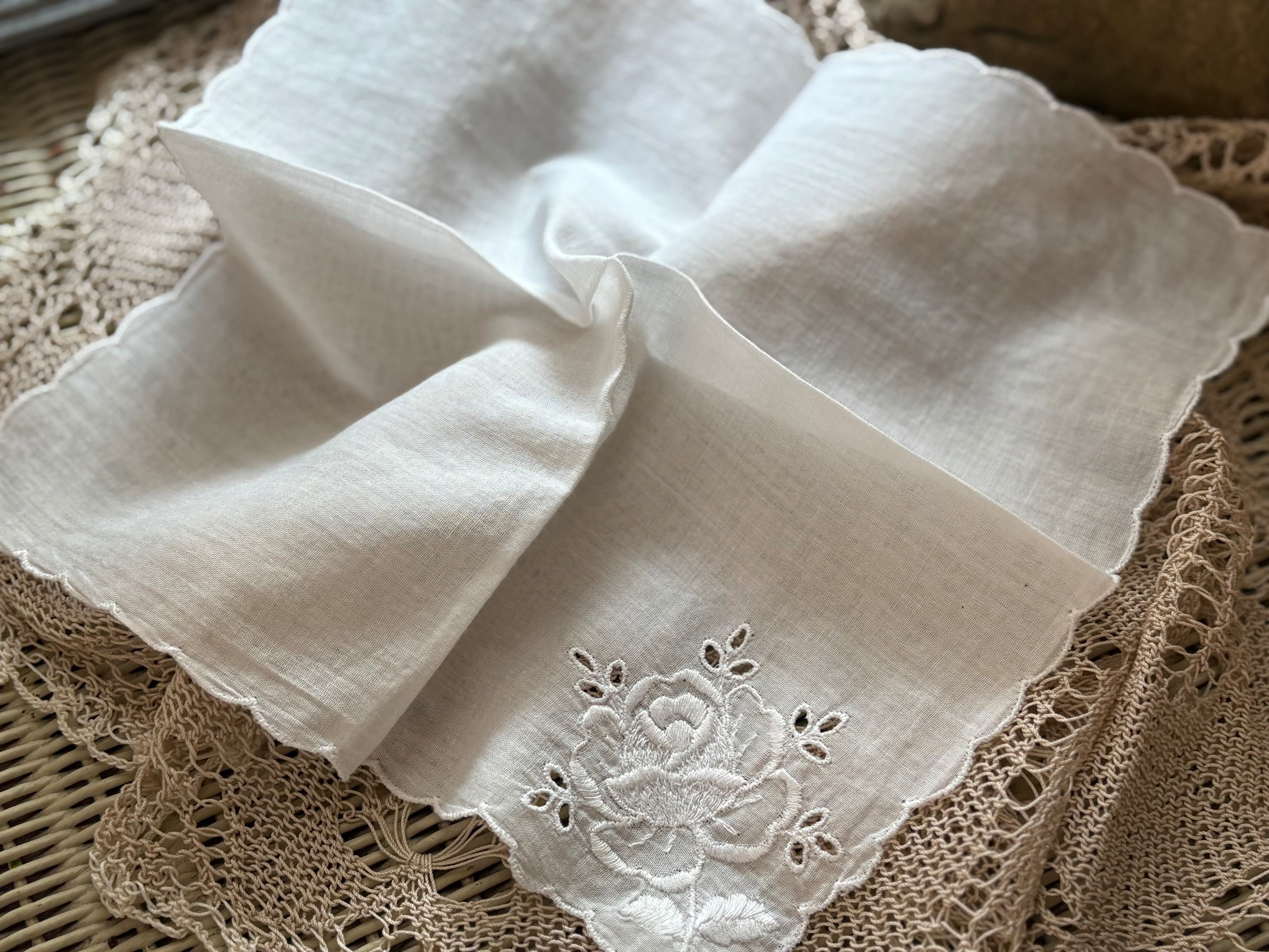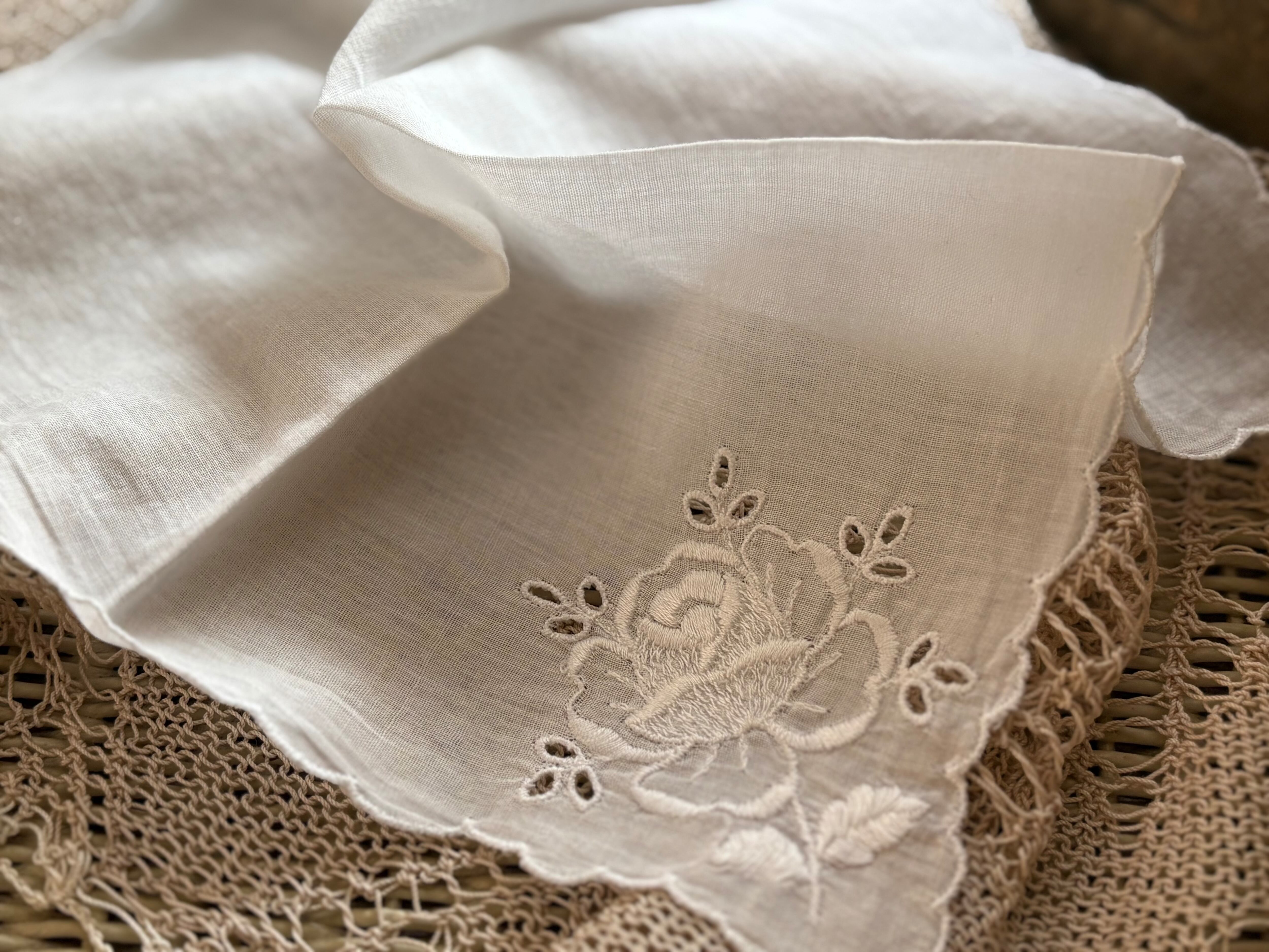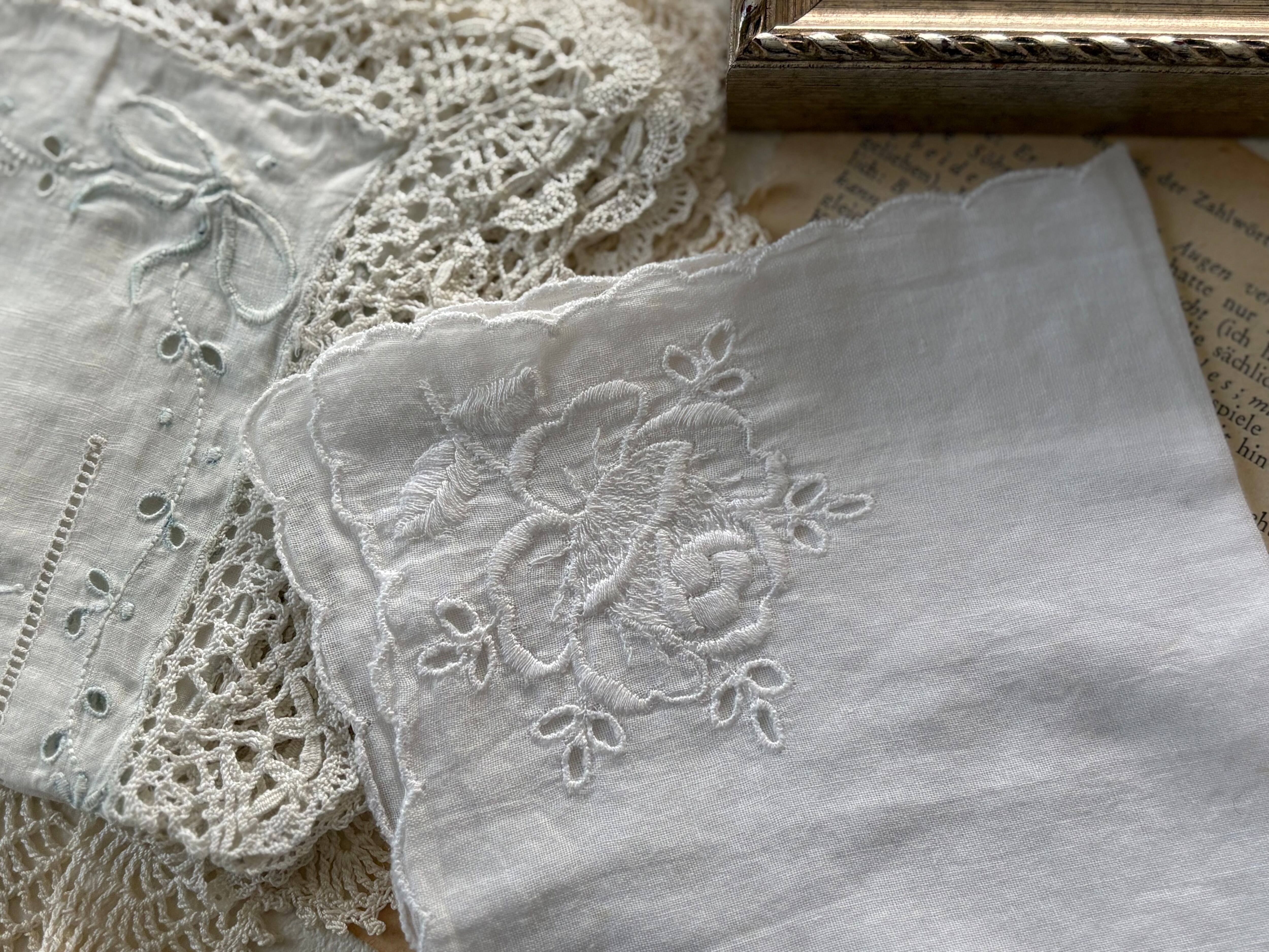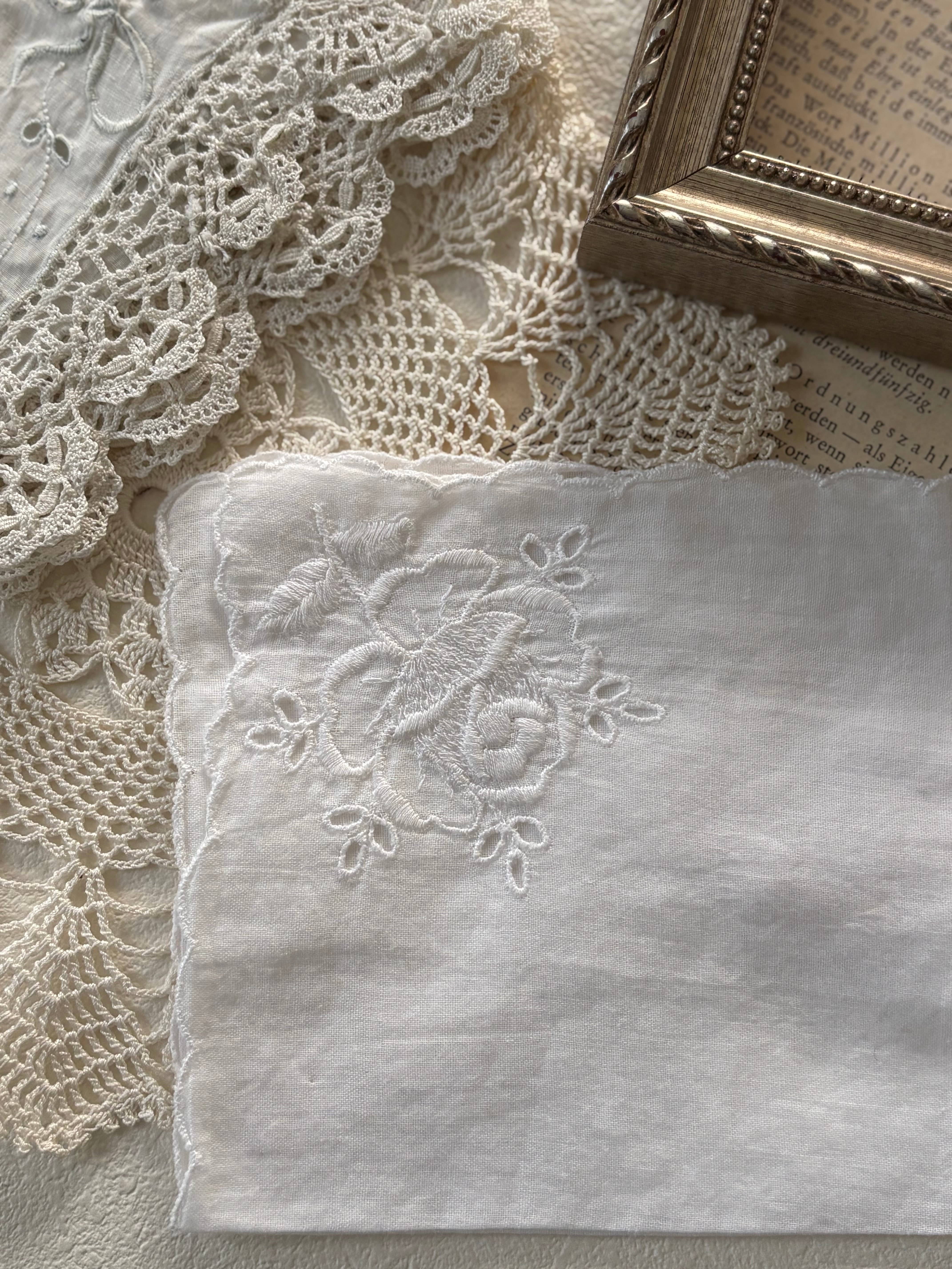 フランスVintage Rose 薔薇 刺繍 カットワーク スカラップ ハンカチーフ 刺繍柄 ハンドメイド素材 インテリア小物 撮影小物