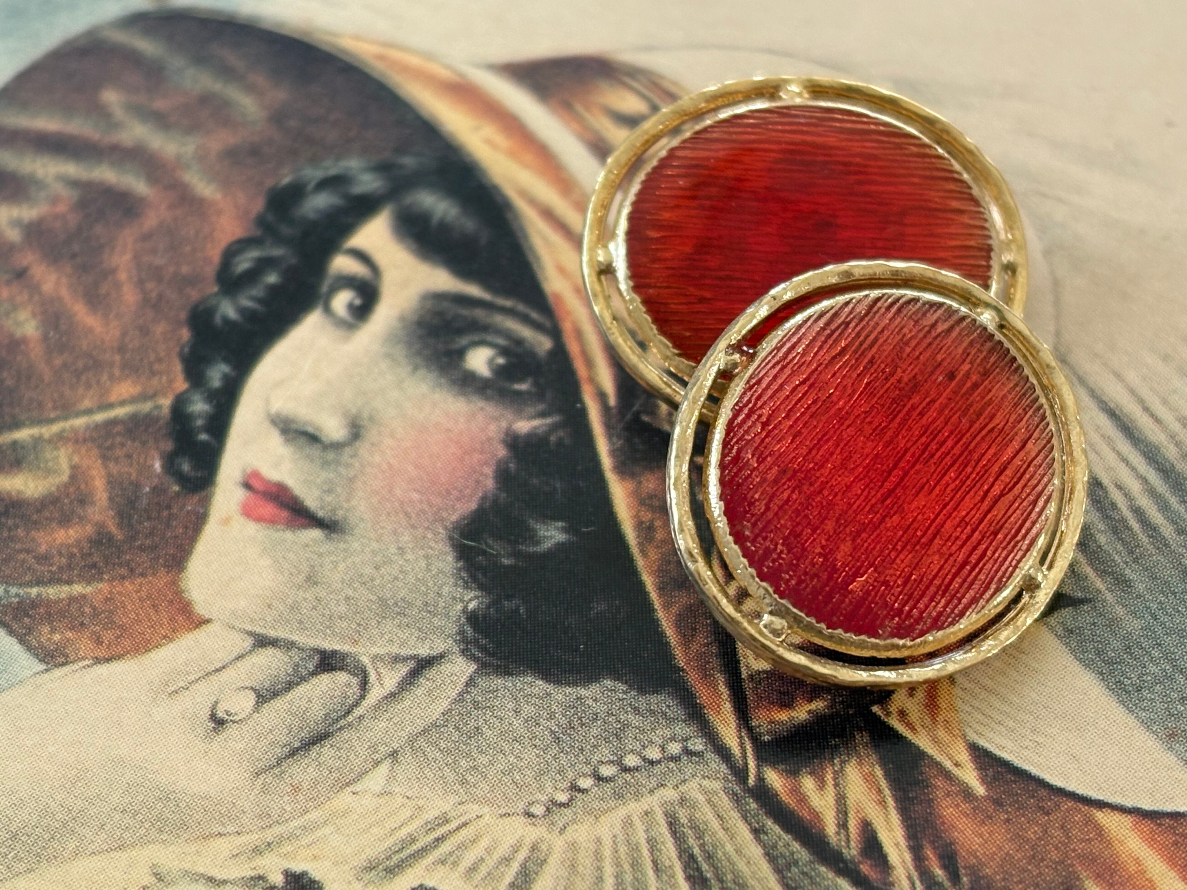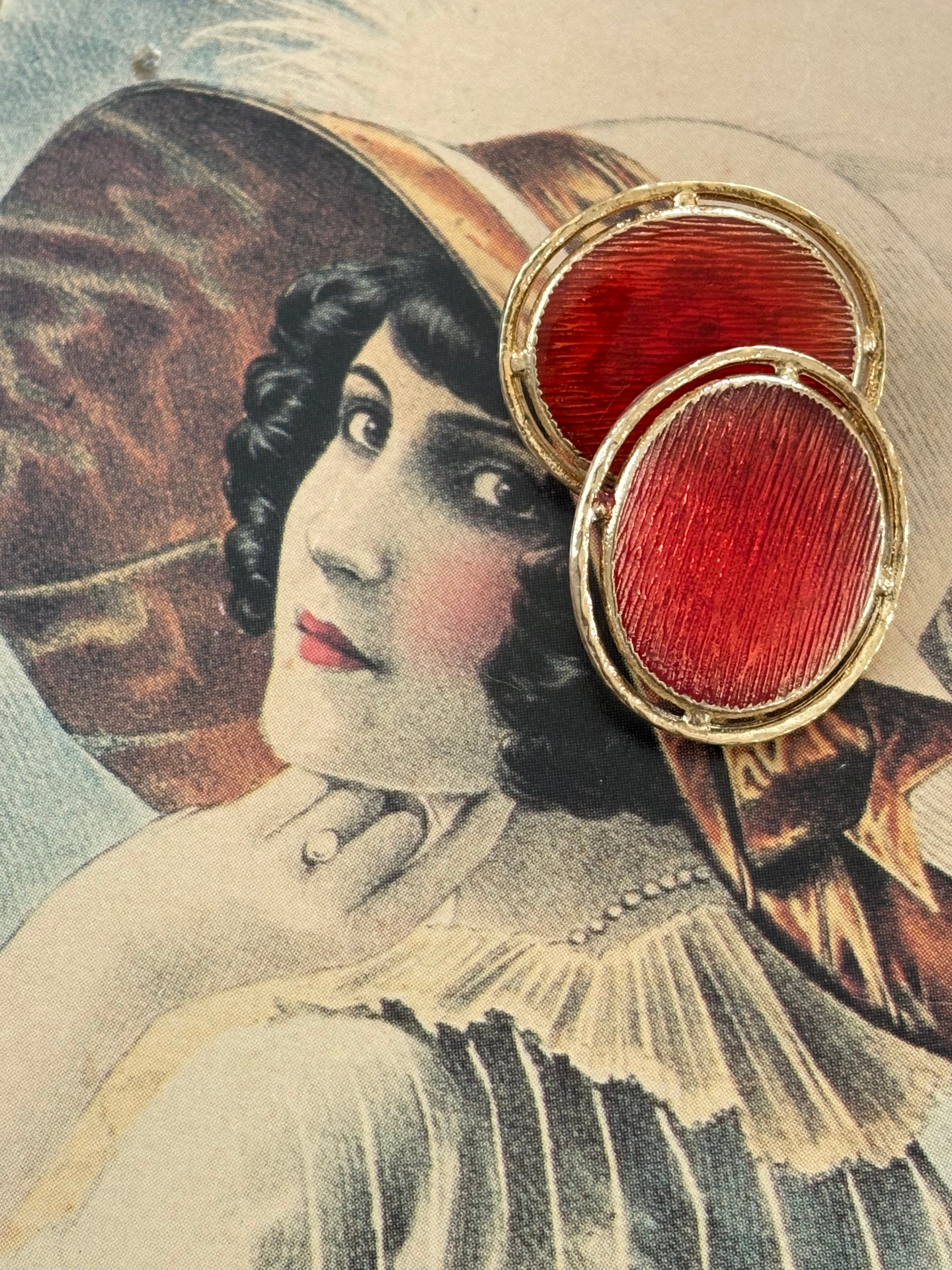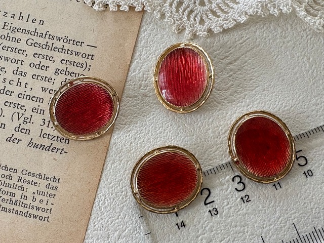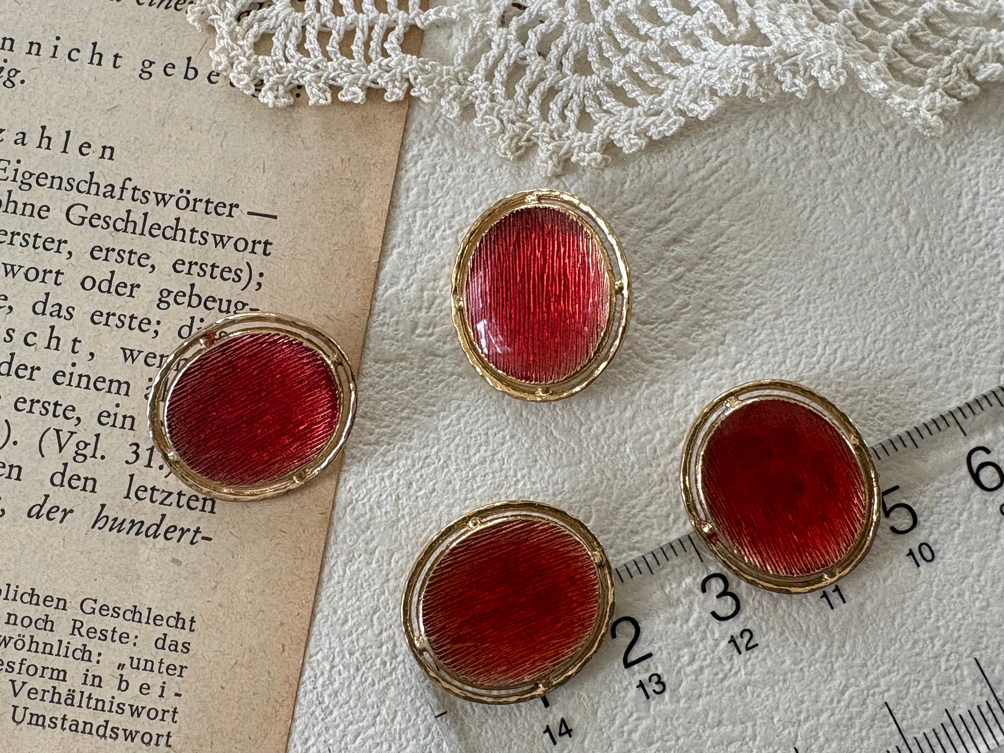21mm×19mm Japanese ヴィンテージボタン メタル オーバル型 レッド×ゴールド 透かし アクセサリーパーツ デコレーション材