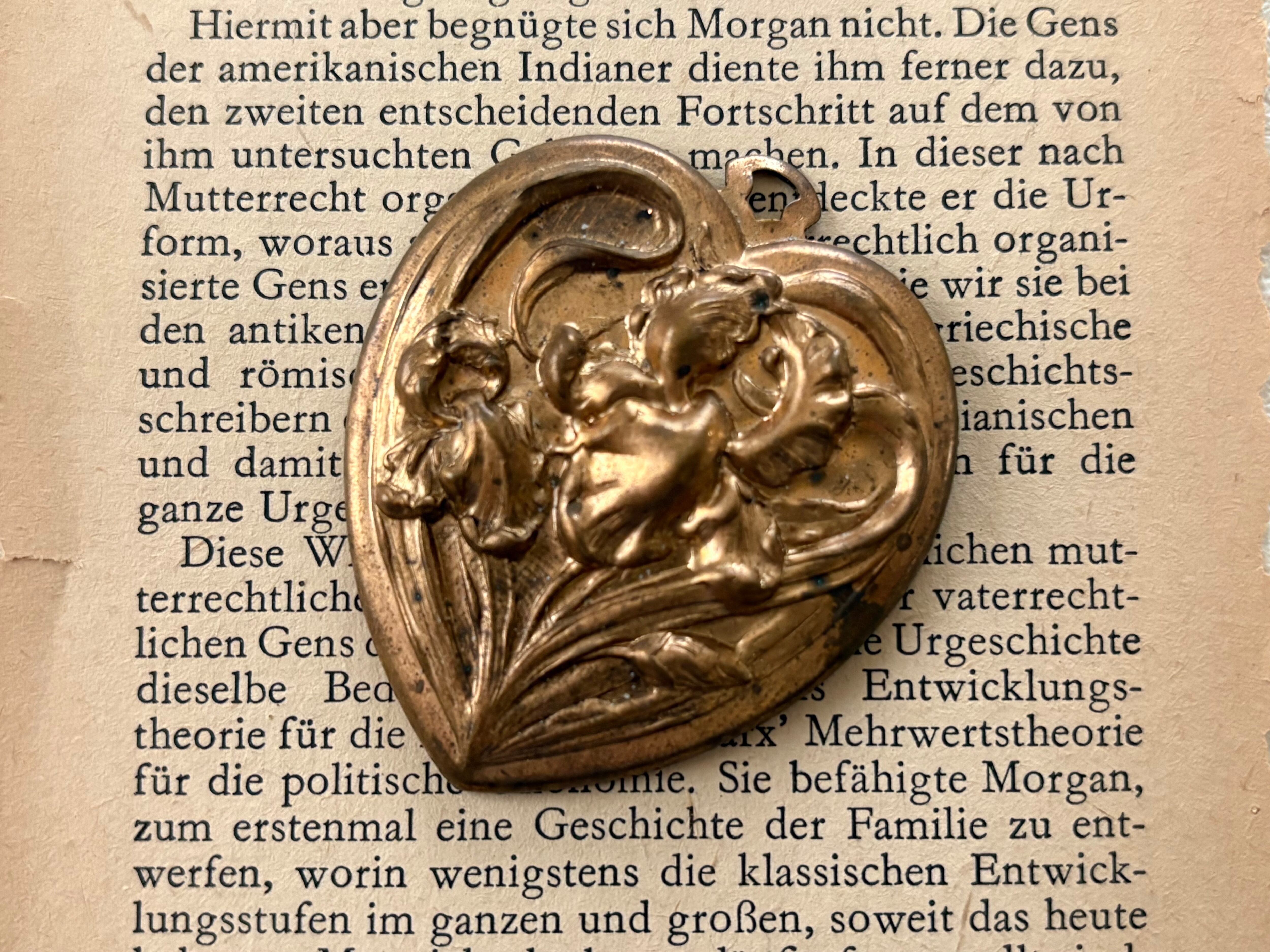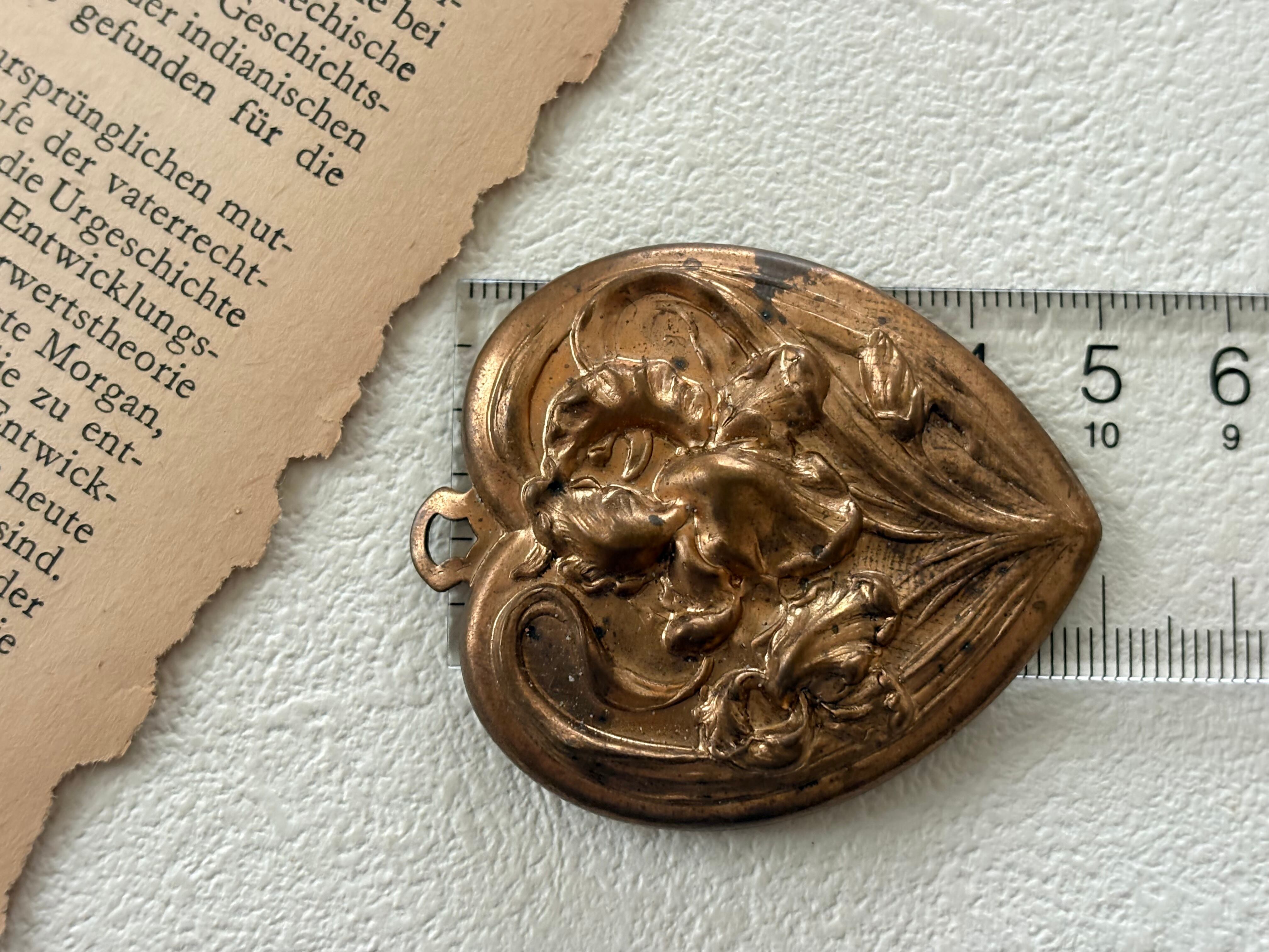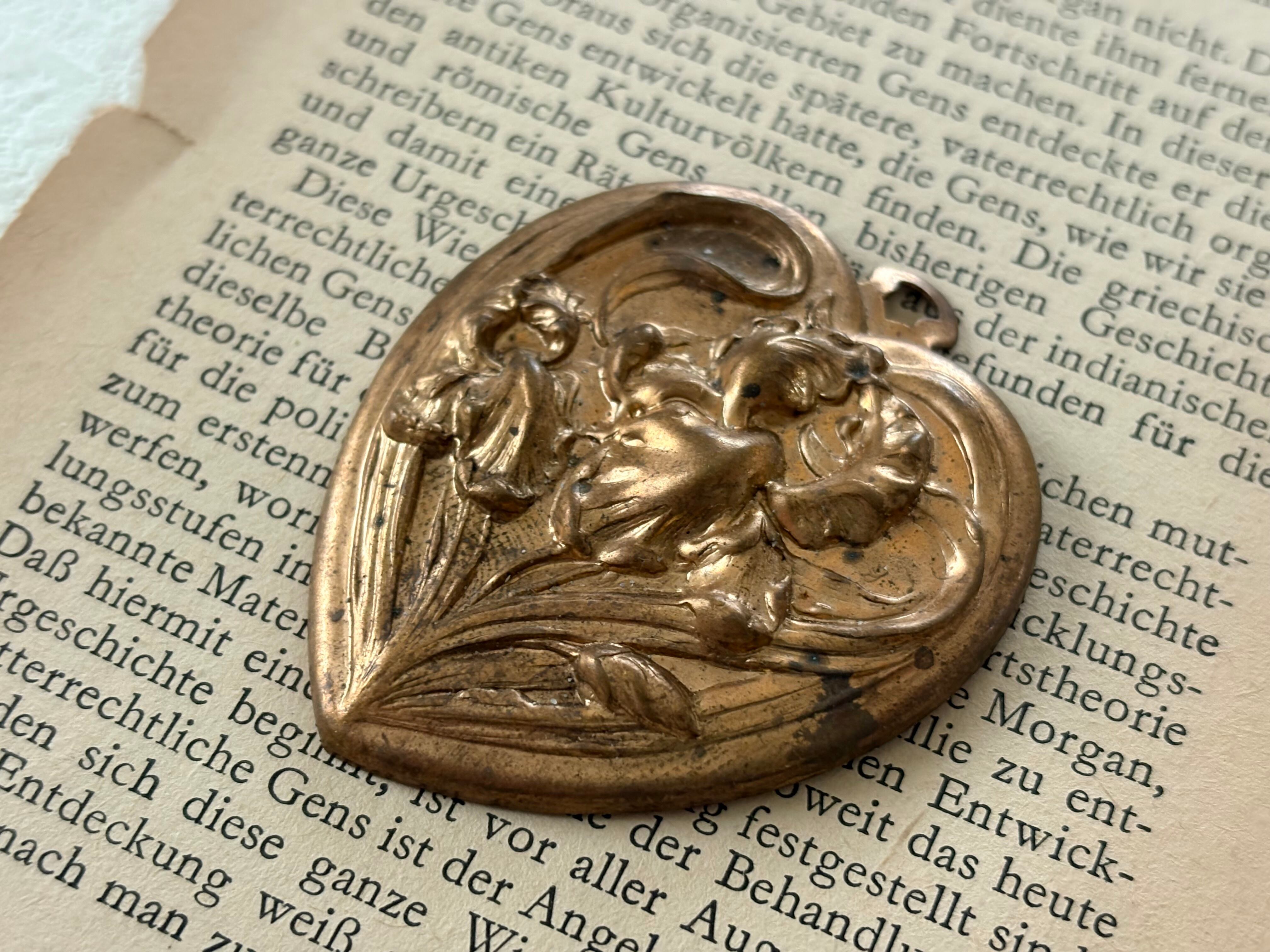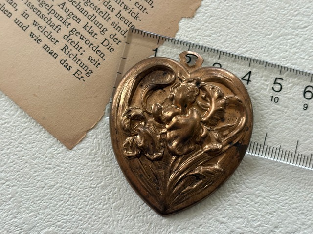 表面のアイリスのレリーフが上品で美しいハート型のブラス製チャームです。