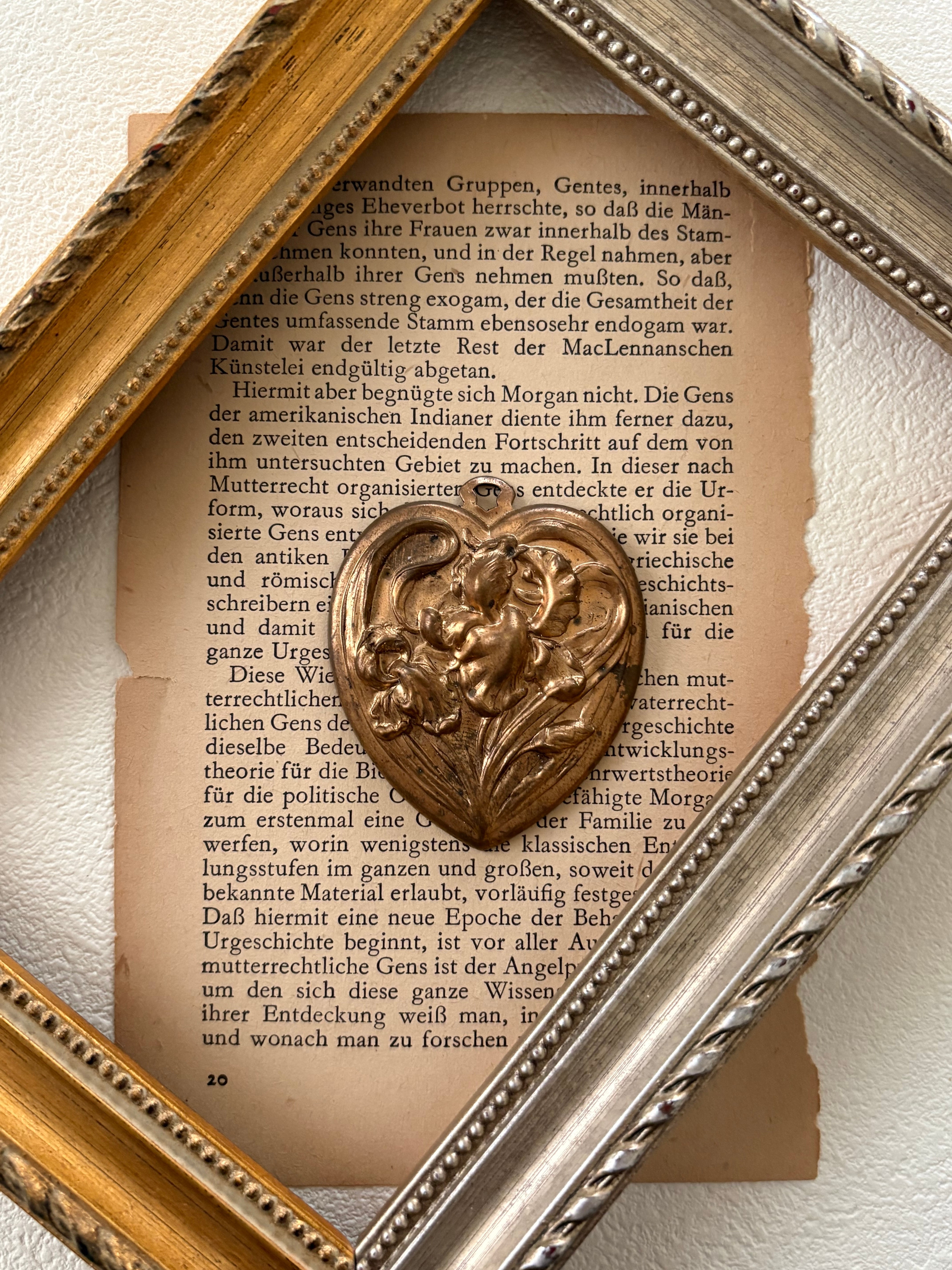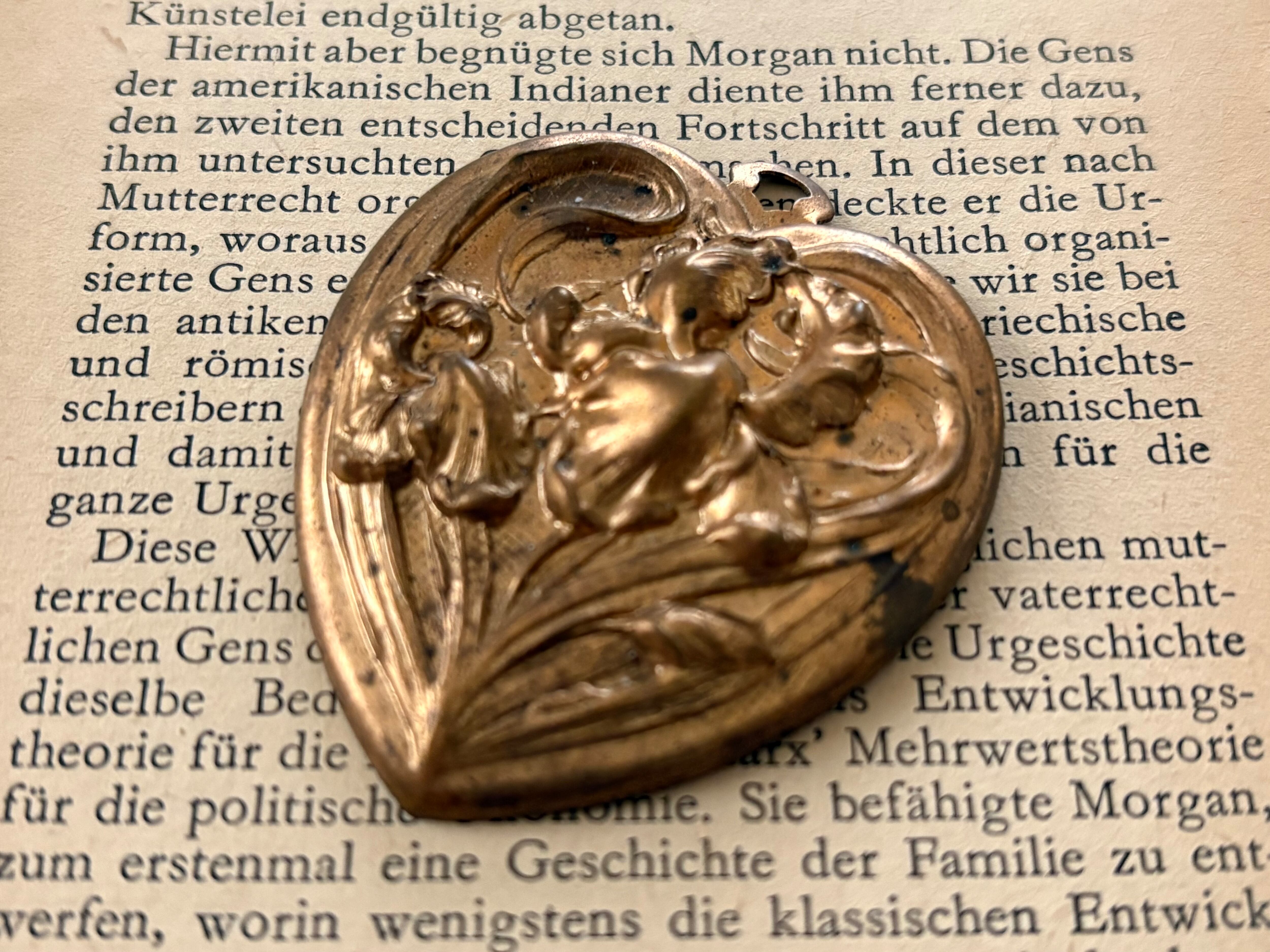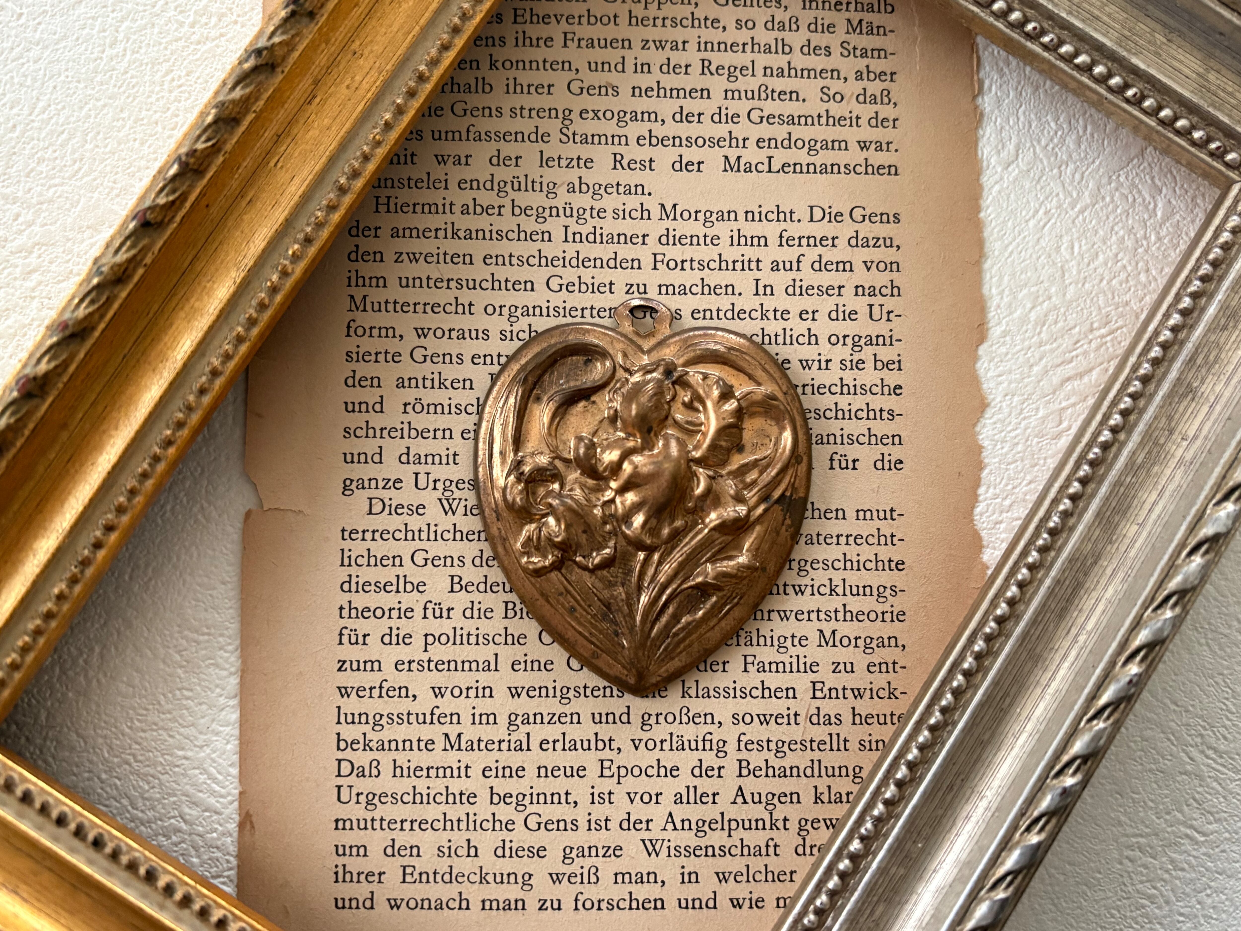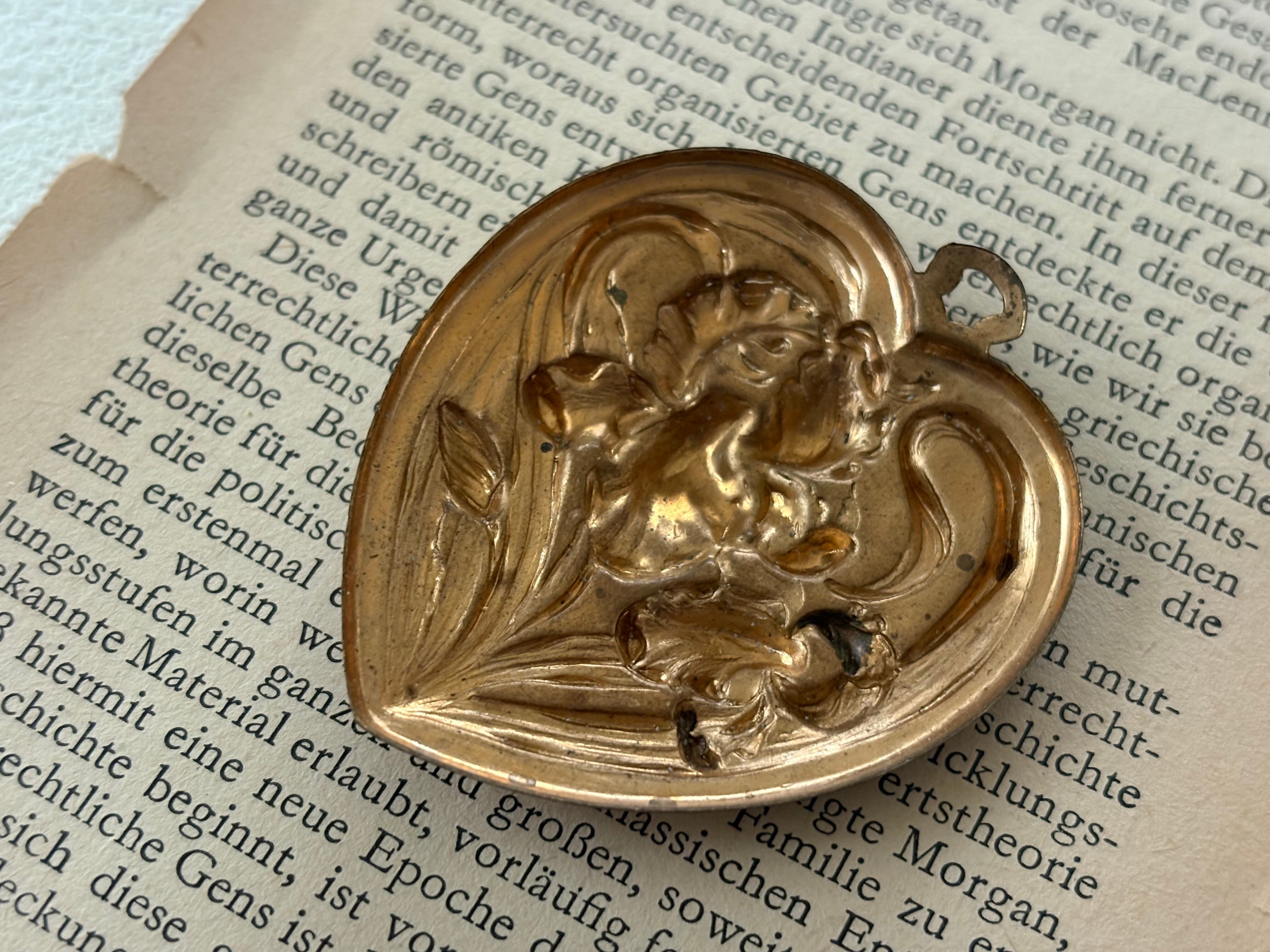 表面のアイリスのレリーフが上品で美しいハート型のブラス製チャームです。