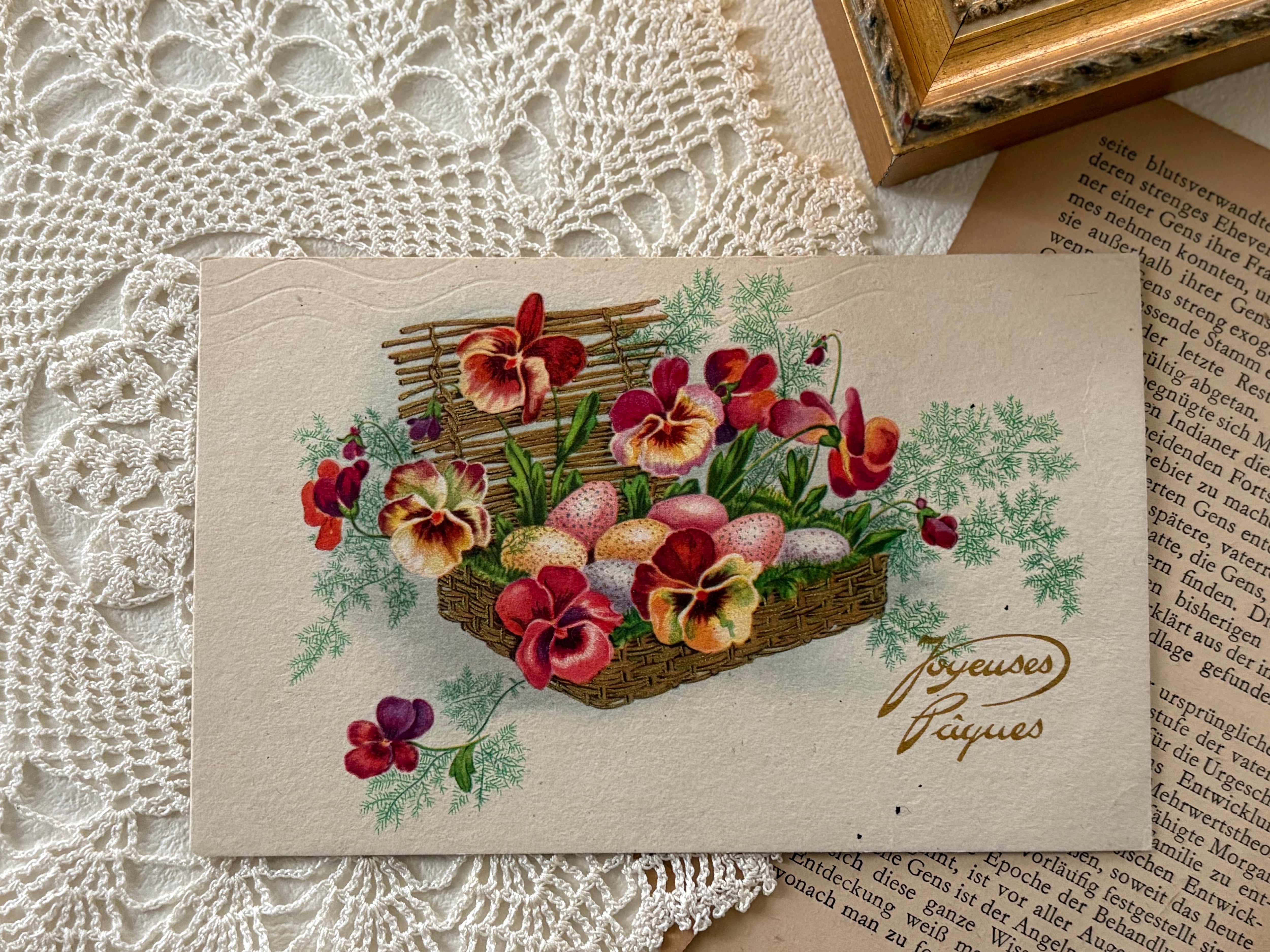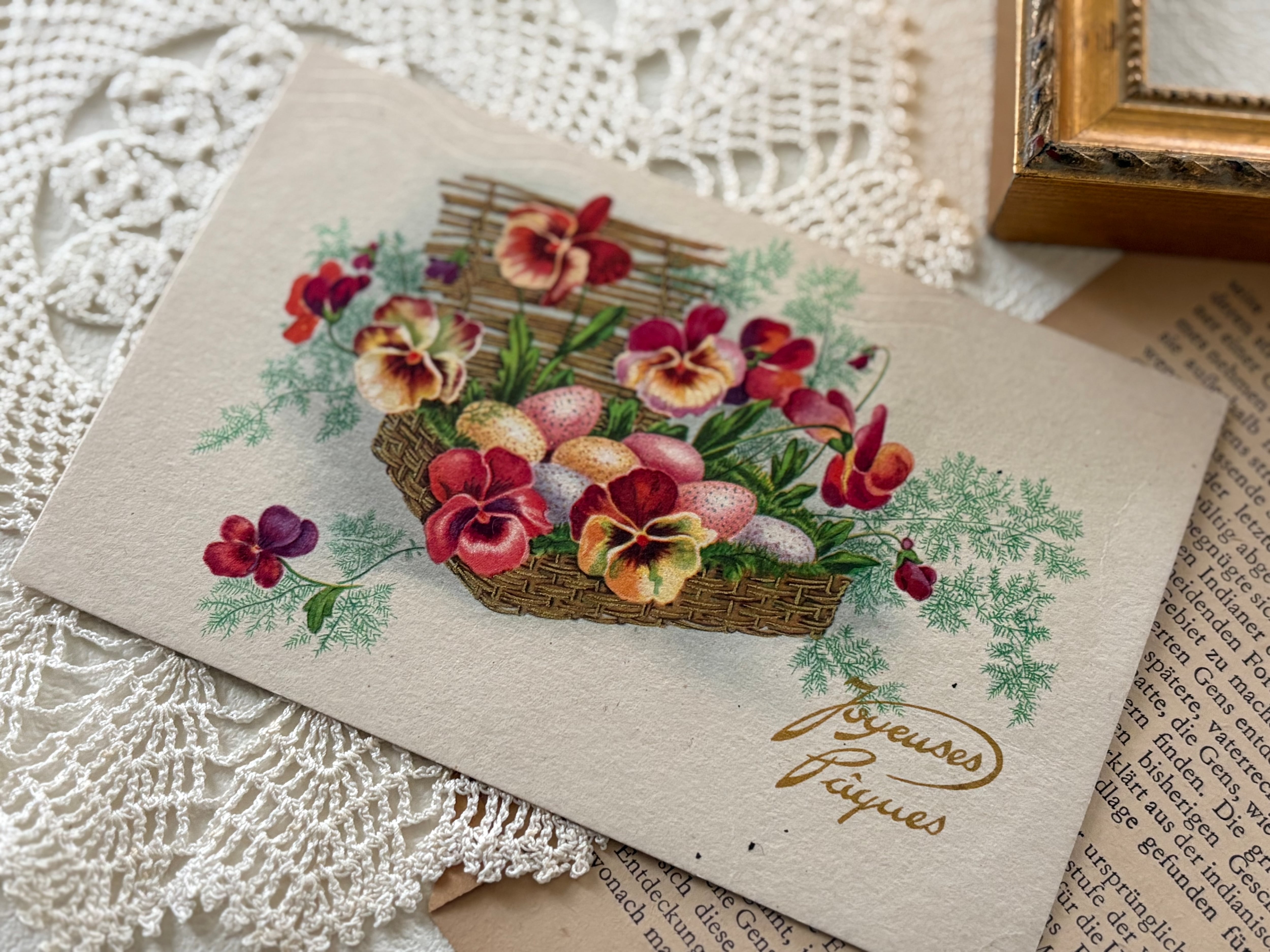 ヴィンテージポストカード フランス イースター パンジー パニエ 1951年 額装 インテリア小物 コレクション