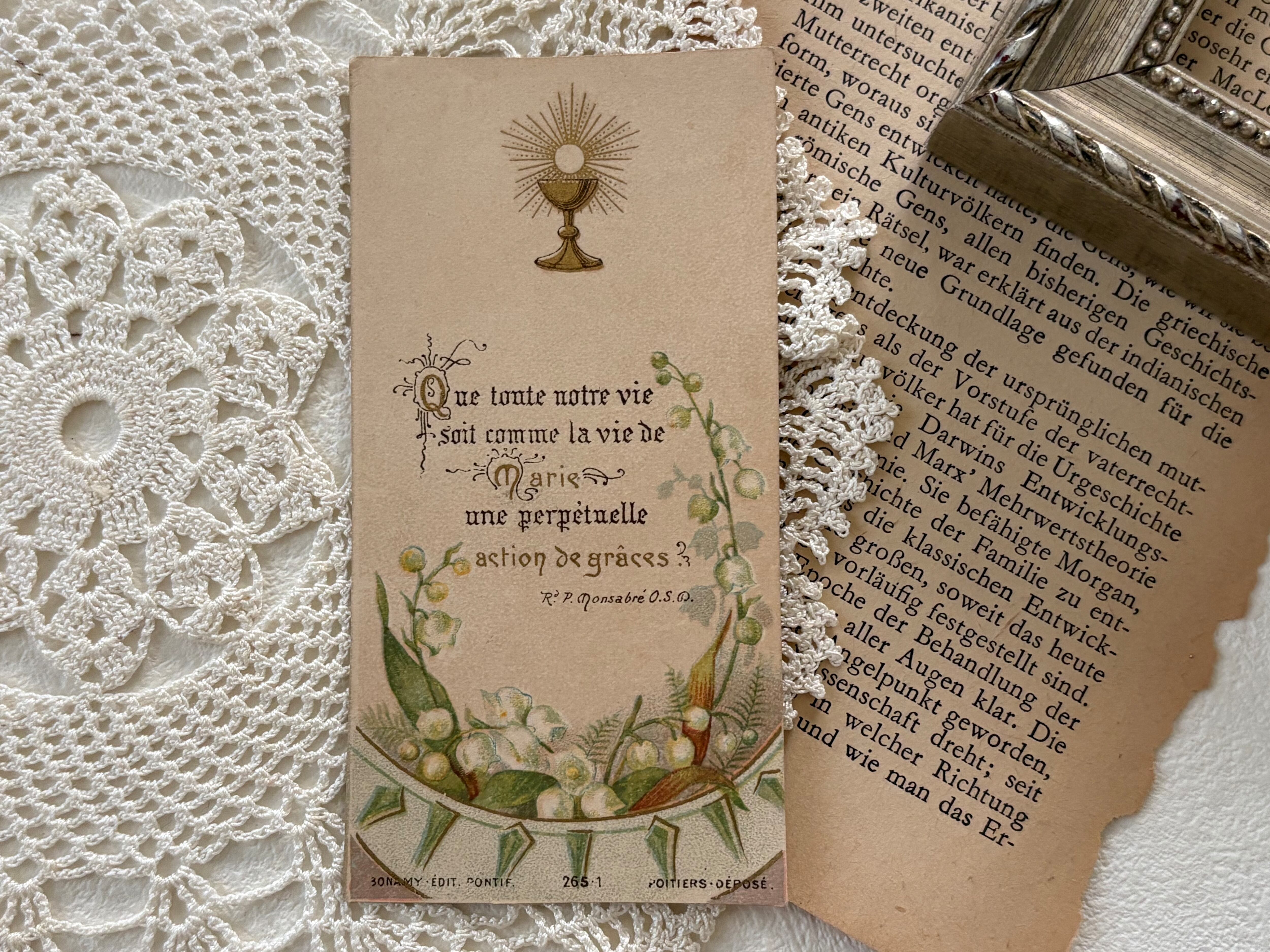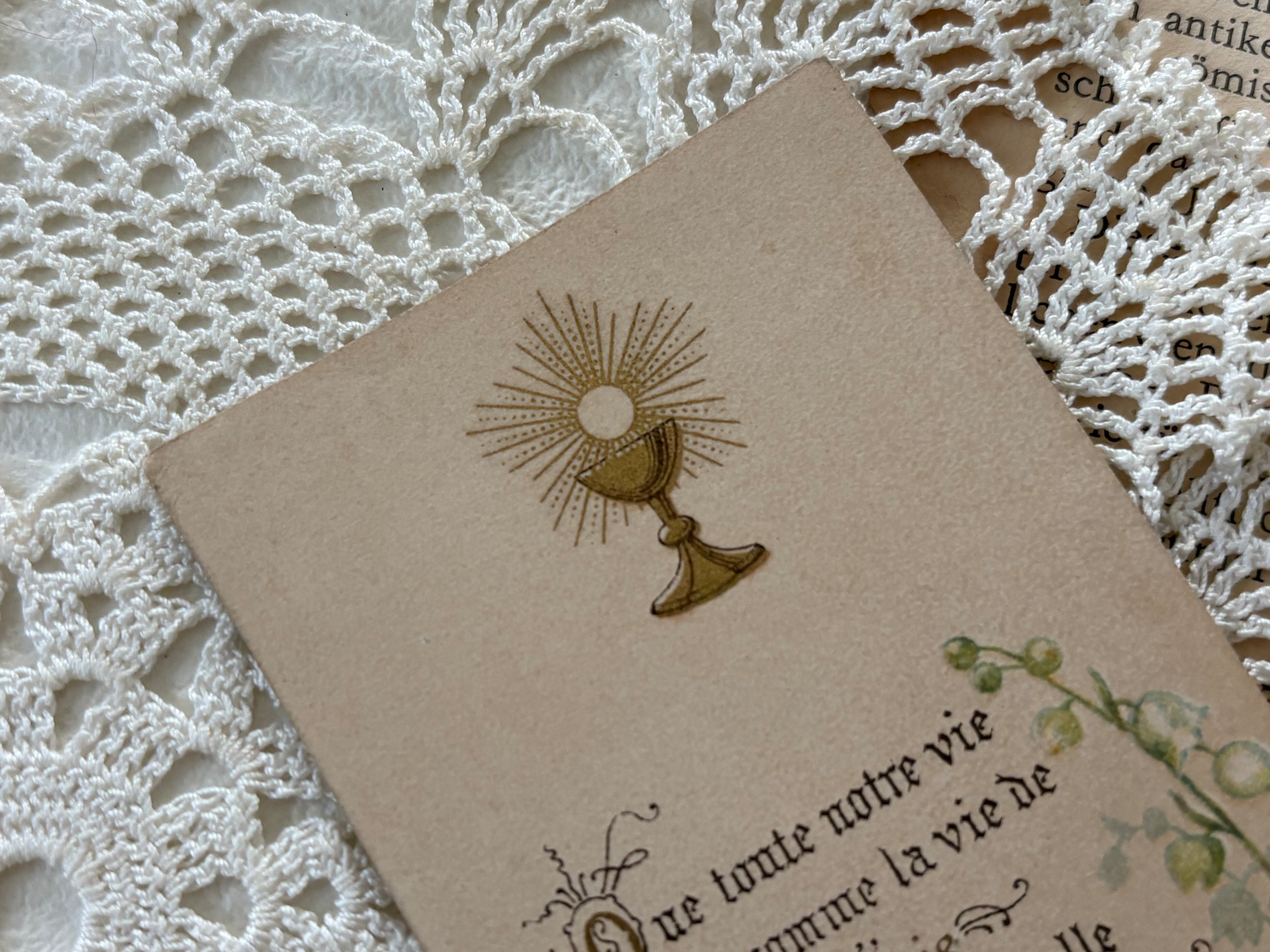 フランスアンティーク Holy Card ホーリーカード プルミエール コミュニオン すずらん 聖杯 Muguet 1902年 額装 コレクション 撮影小物