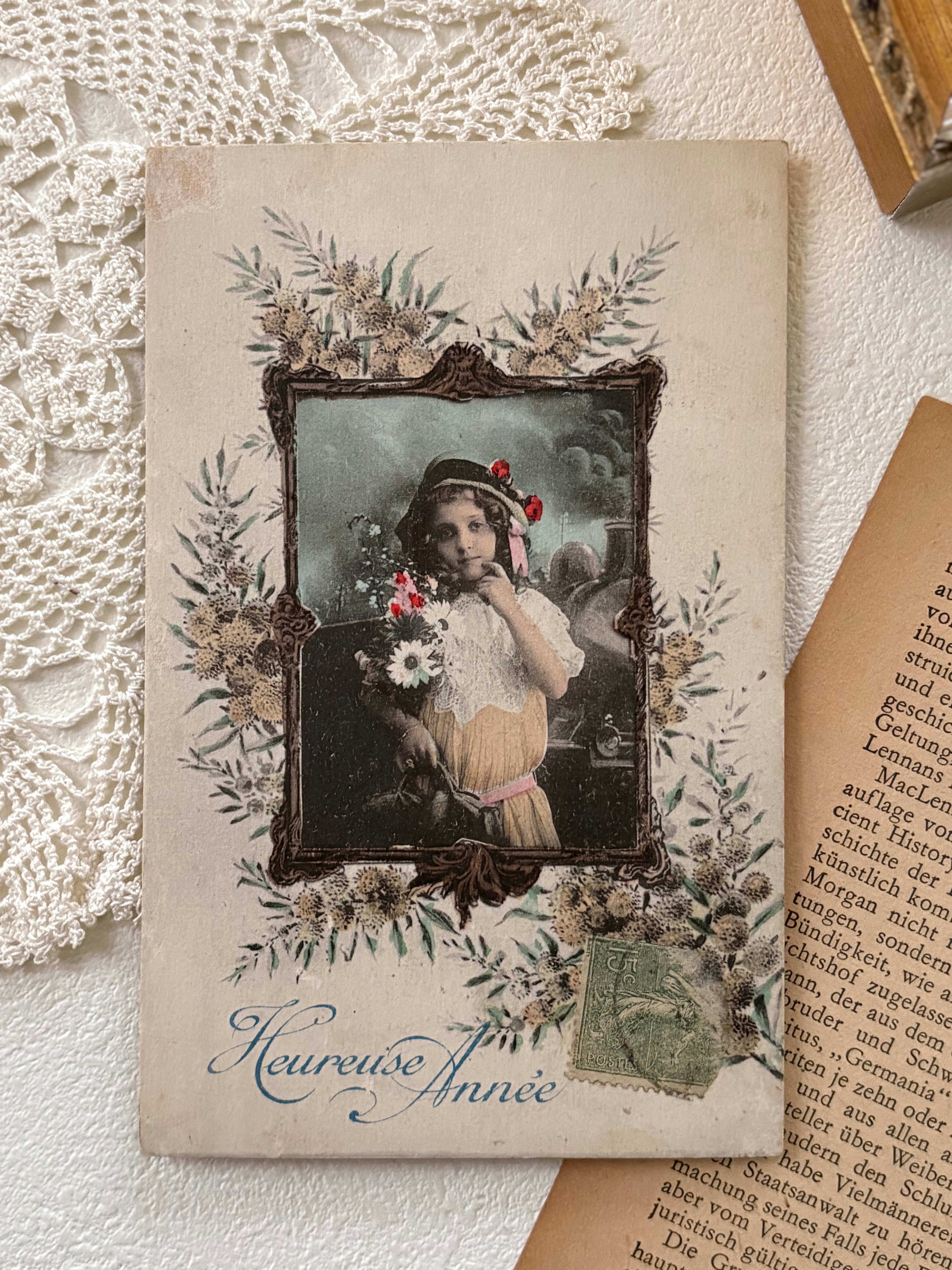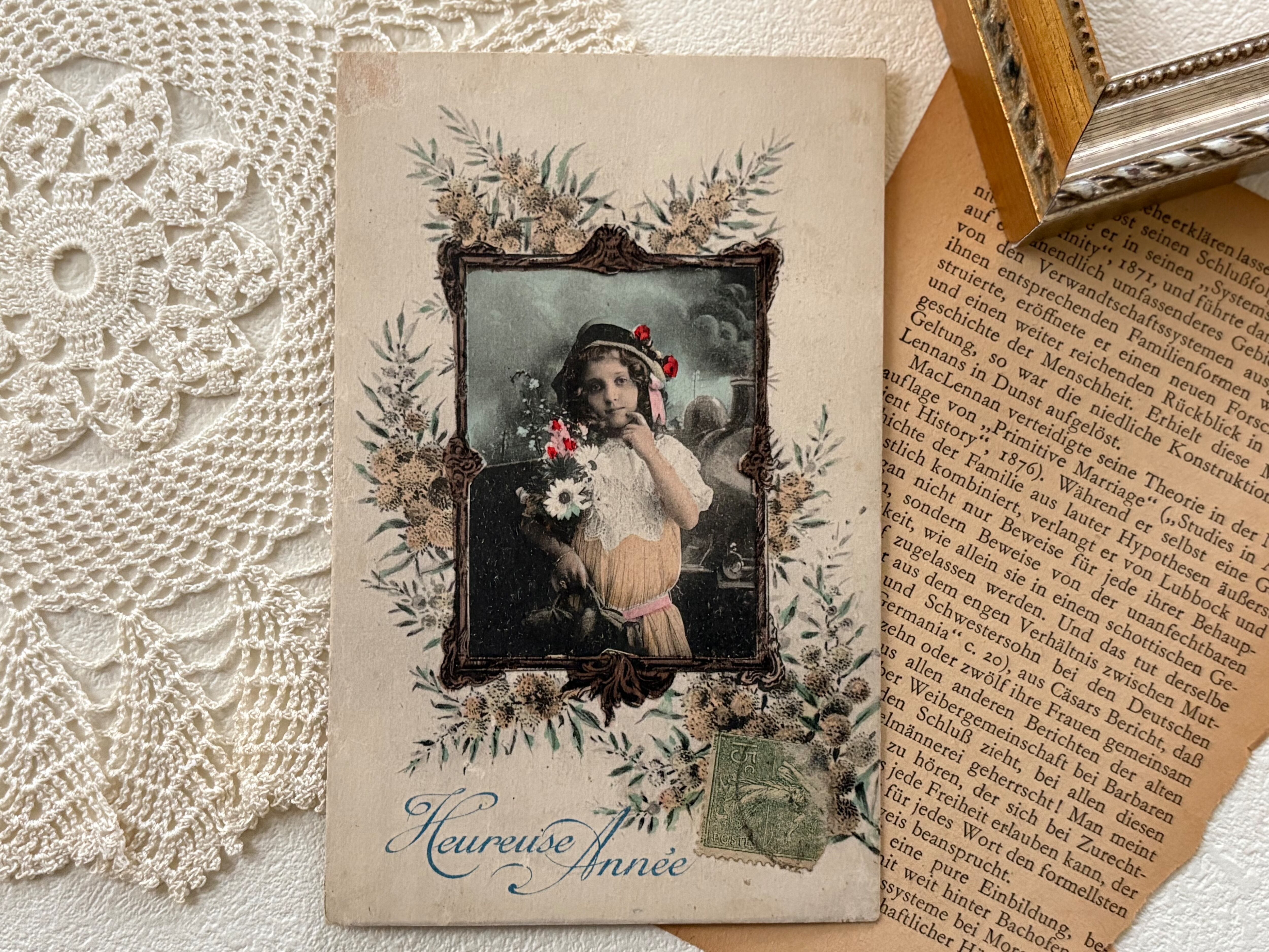 アンティークポストカード Heureuse Année ウール―ザネ ミモザと少女 1919年 額装 コレクション 新年 クリスマス